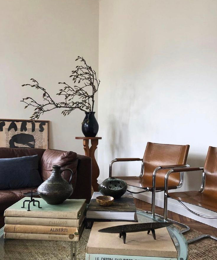 Velg solide møbler i tre, lær eller naturmaterialer. Se etter runde, skulpturelle former eller klassiske designikoner. Gjerne brukt, patina er en del av sjarmen.