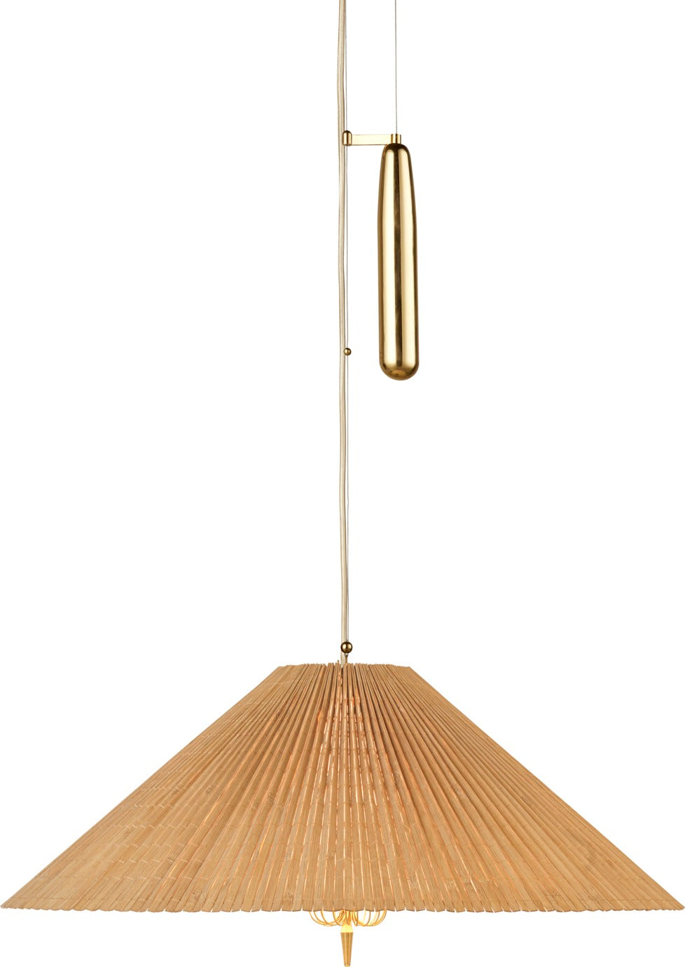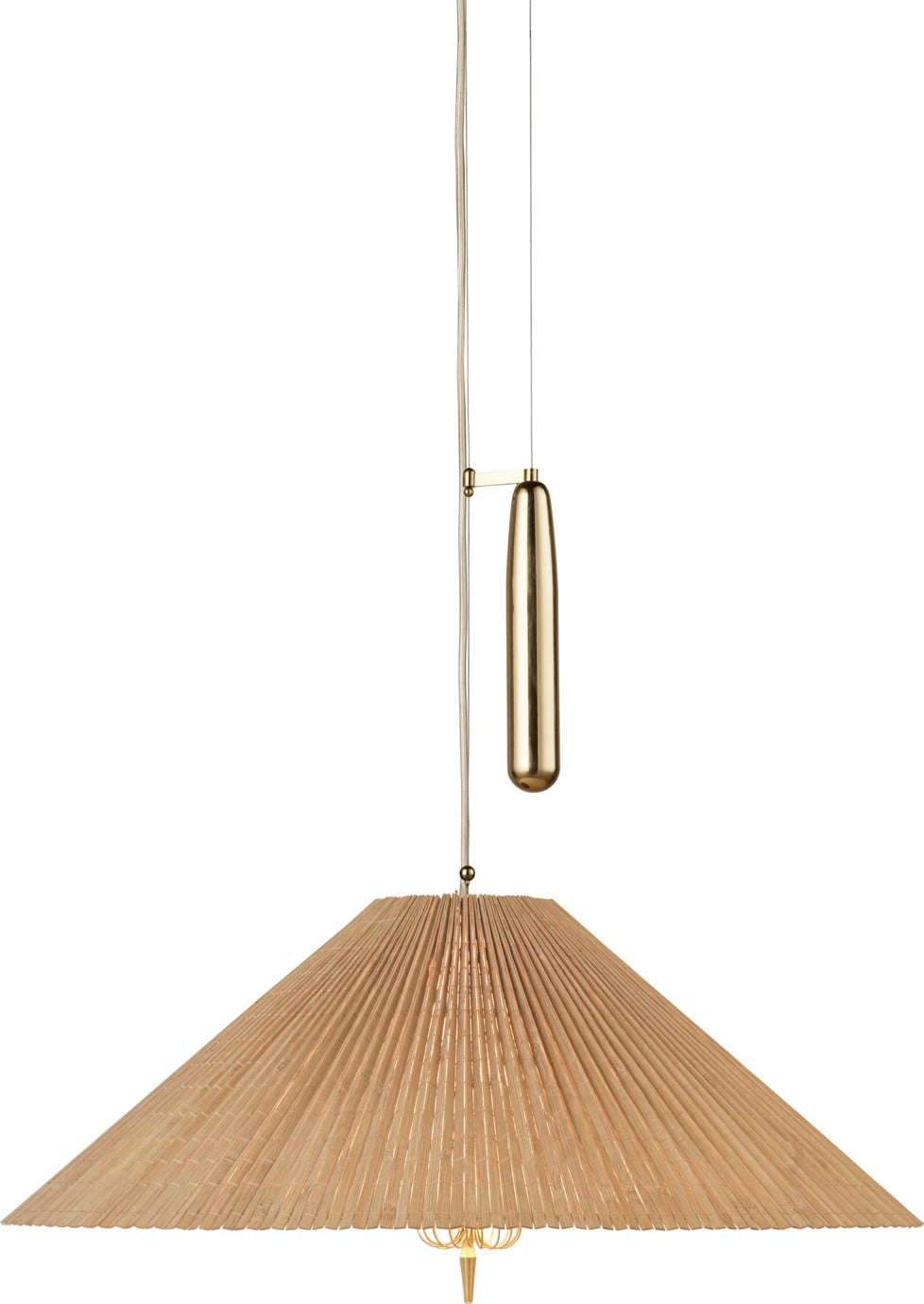 Designet av den legendariske Paavo Tynell, anhenget fra 1972 har en konisk nyanse i bambus, laget av dyktige håndverkere. Skjermen er består av håndsydde bambuslammeler og kommer i to ulike størrelser. Lampen finnes også i en justerbar variant hvor den kan justeres med en pendel i polert messing.