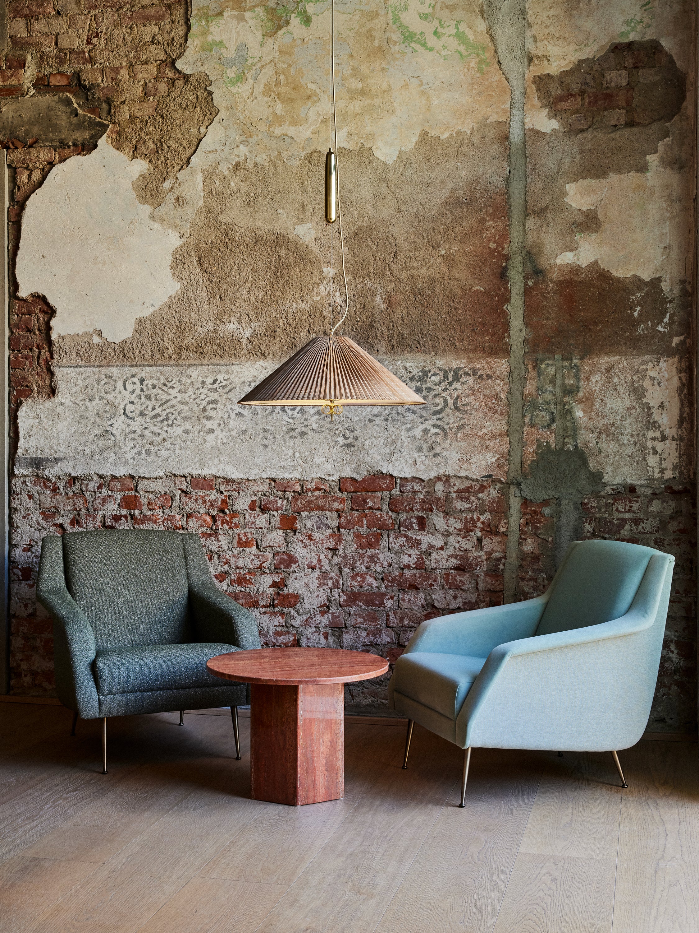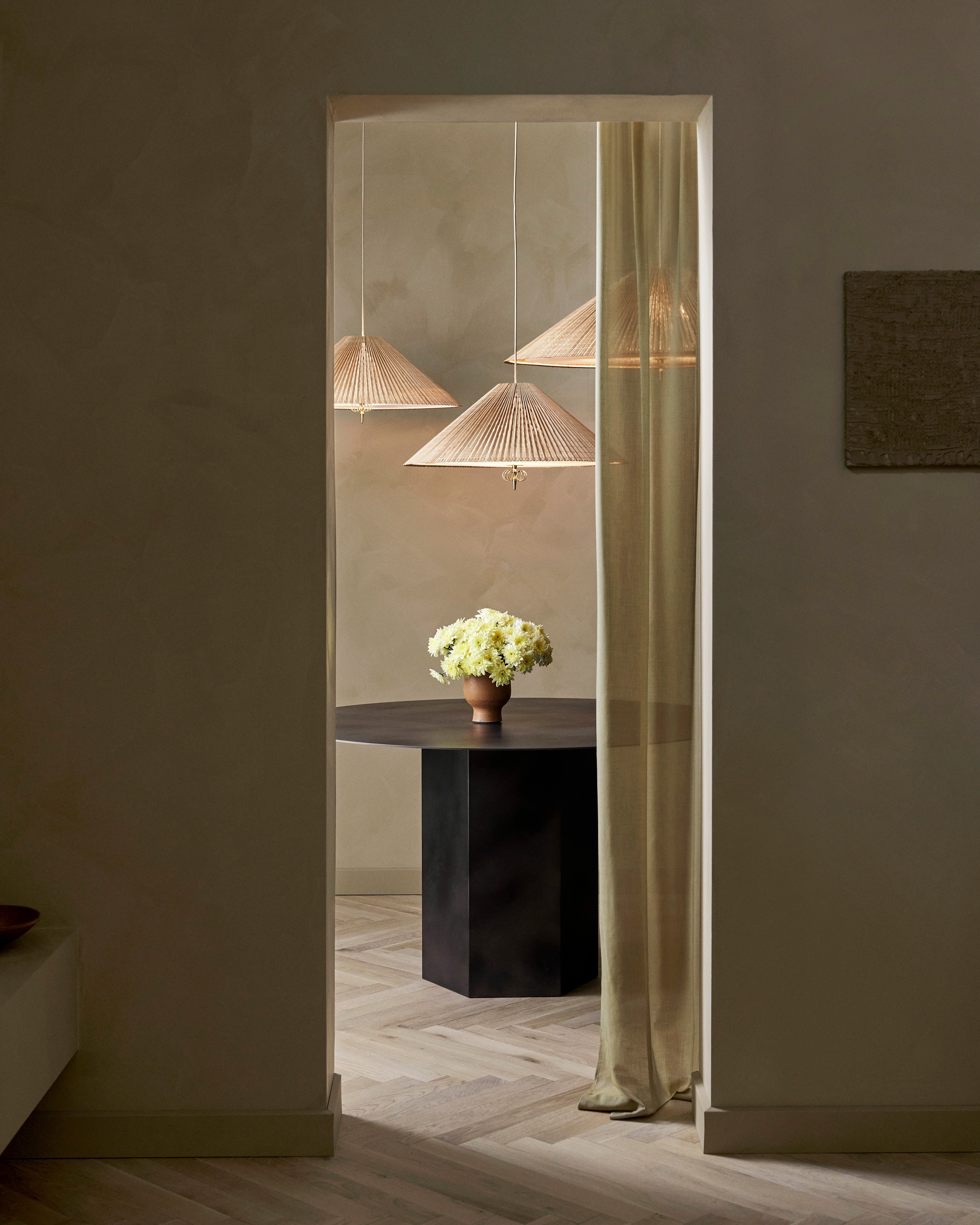 Tynells messingdetaljer er også tilstede på lampen, og tilfører en følelse av tidløshet og komplementerer den varme tonen i treet og lyset perfekt.