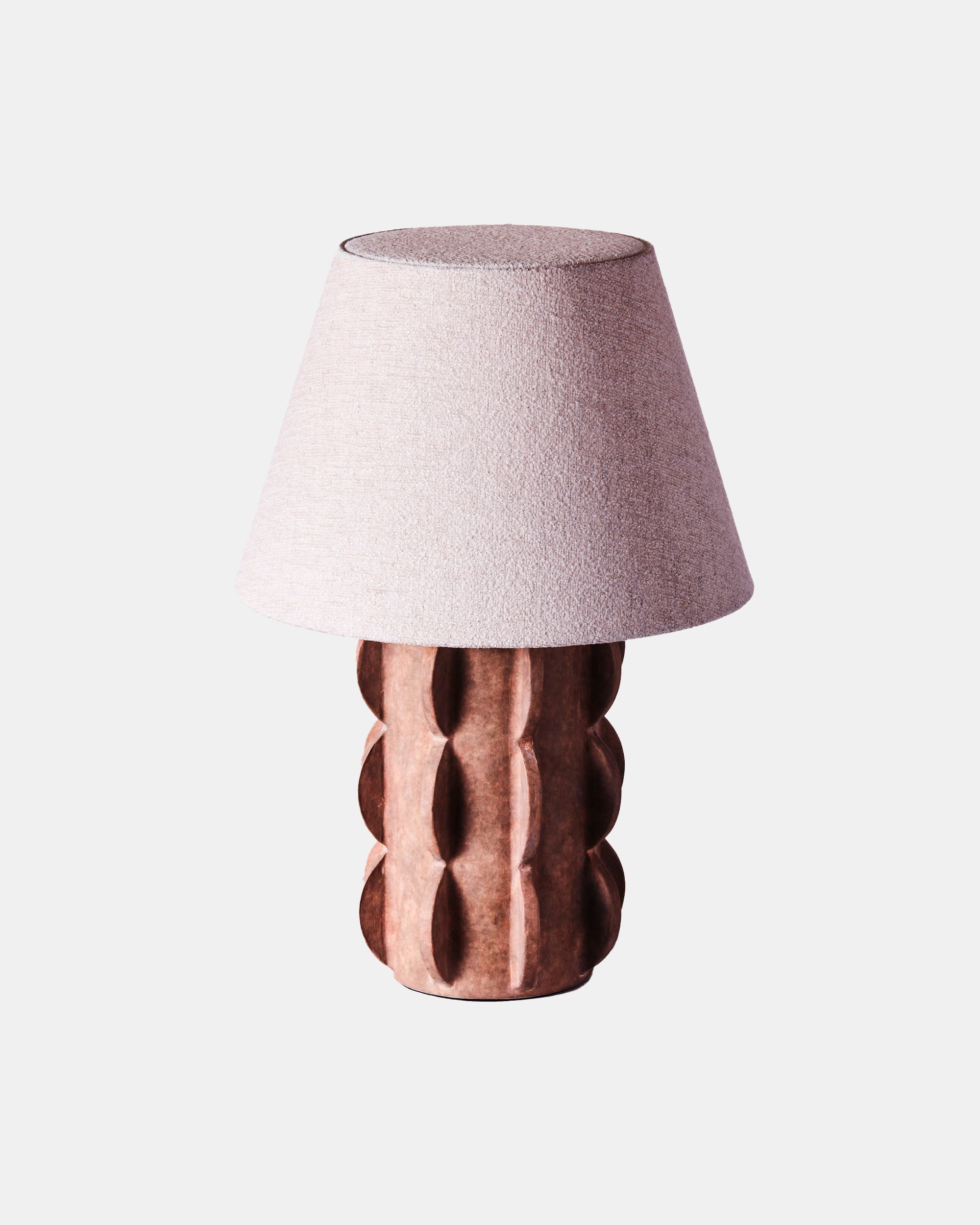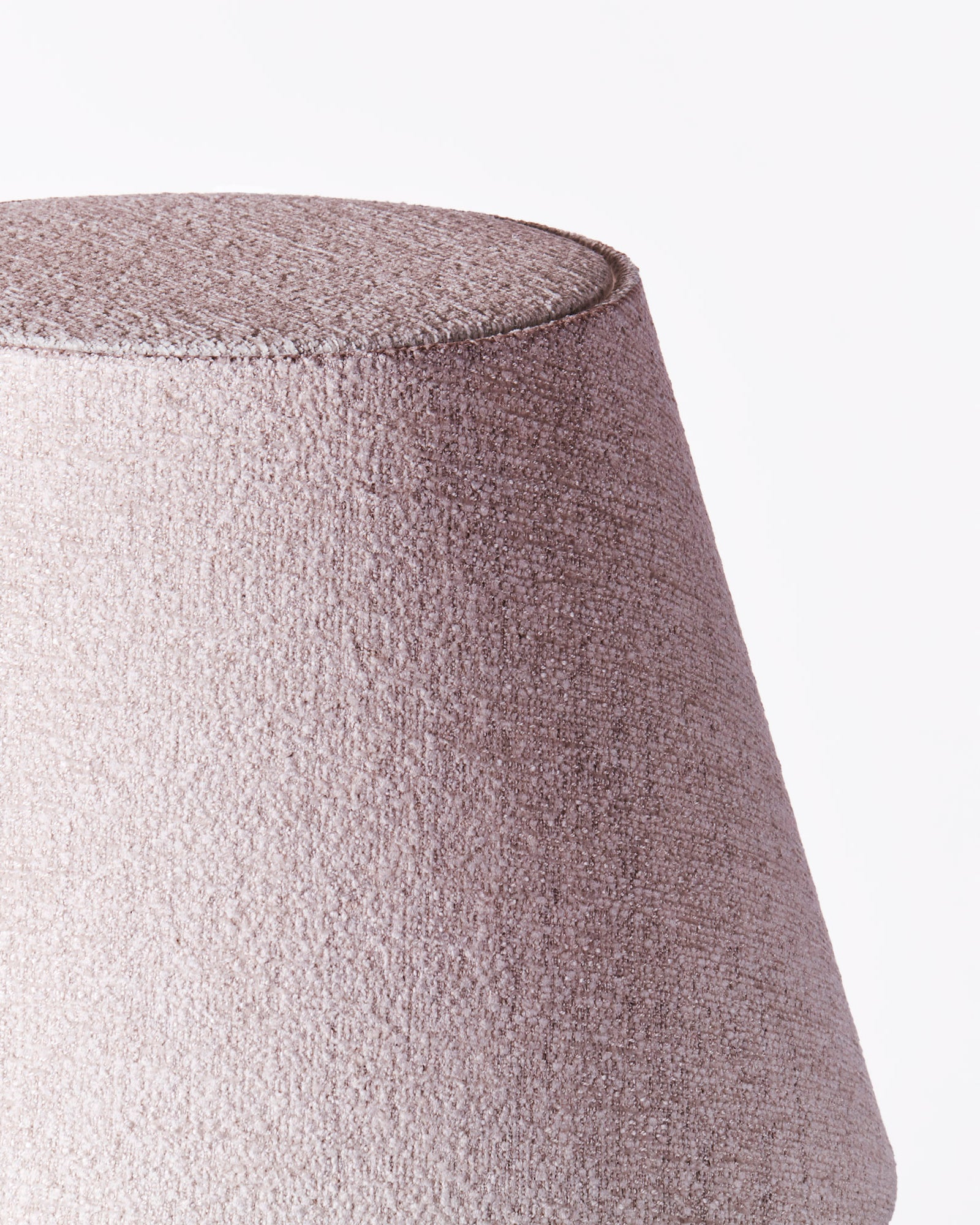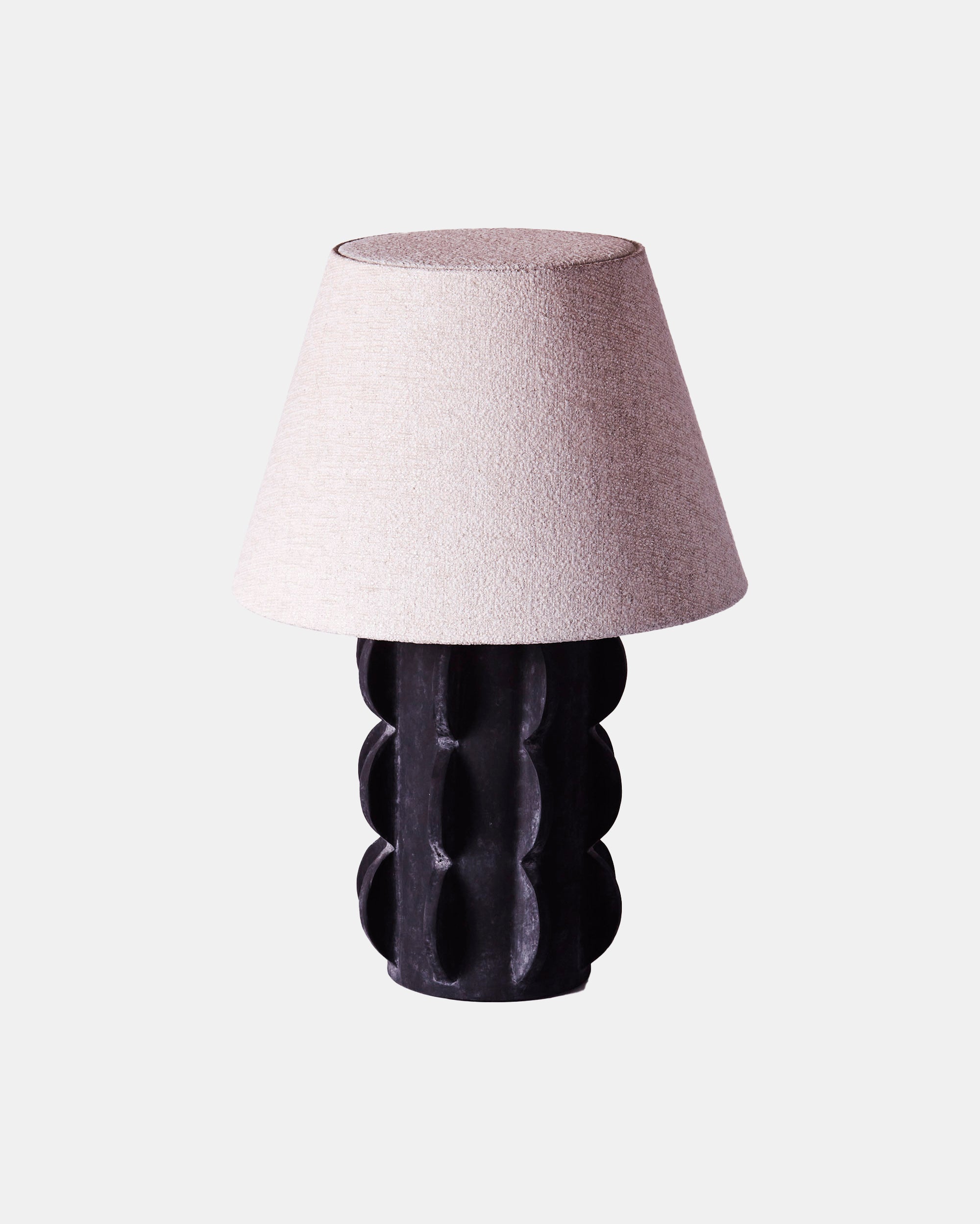 Den ikoniske buede basen er et gjentakende designelement blant Dusty Decos produkter og er laget av keramikk med en matt, vanntett finish. Tekstilskjermen tilfører varme og tekstur til lampens uttrykk, noe som gjør den til en perfekt kombinasjon av funksjon og estetikk.