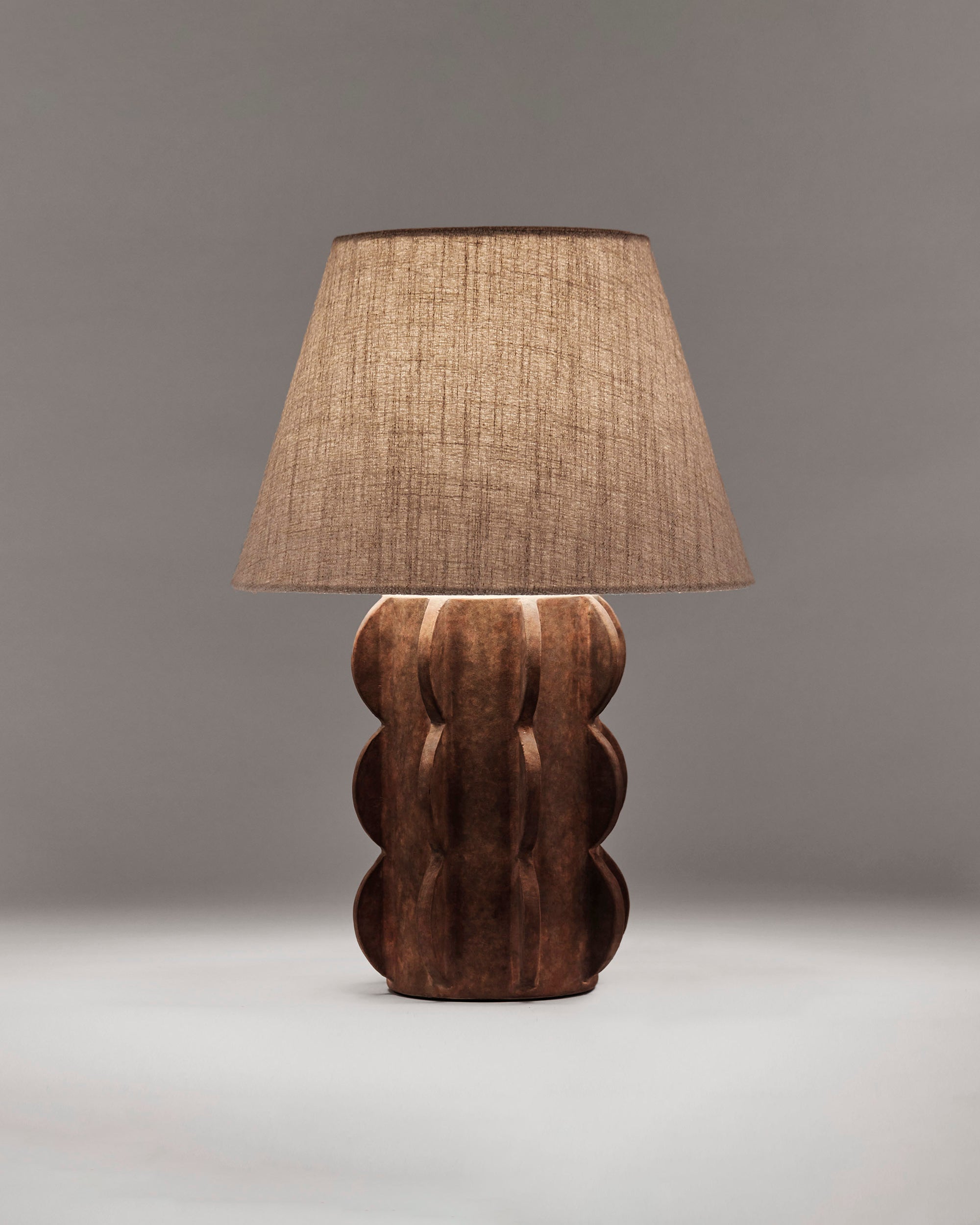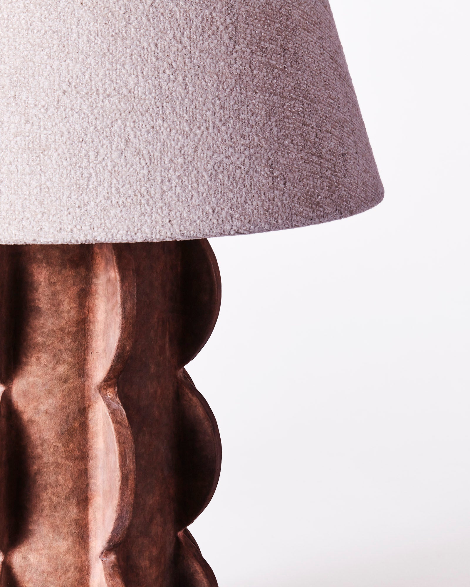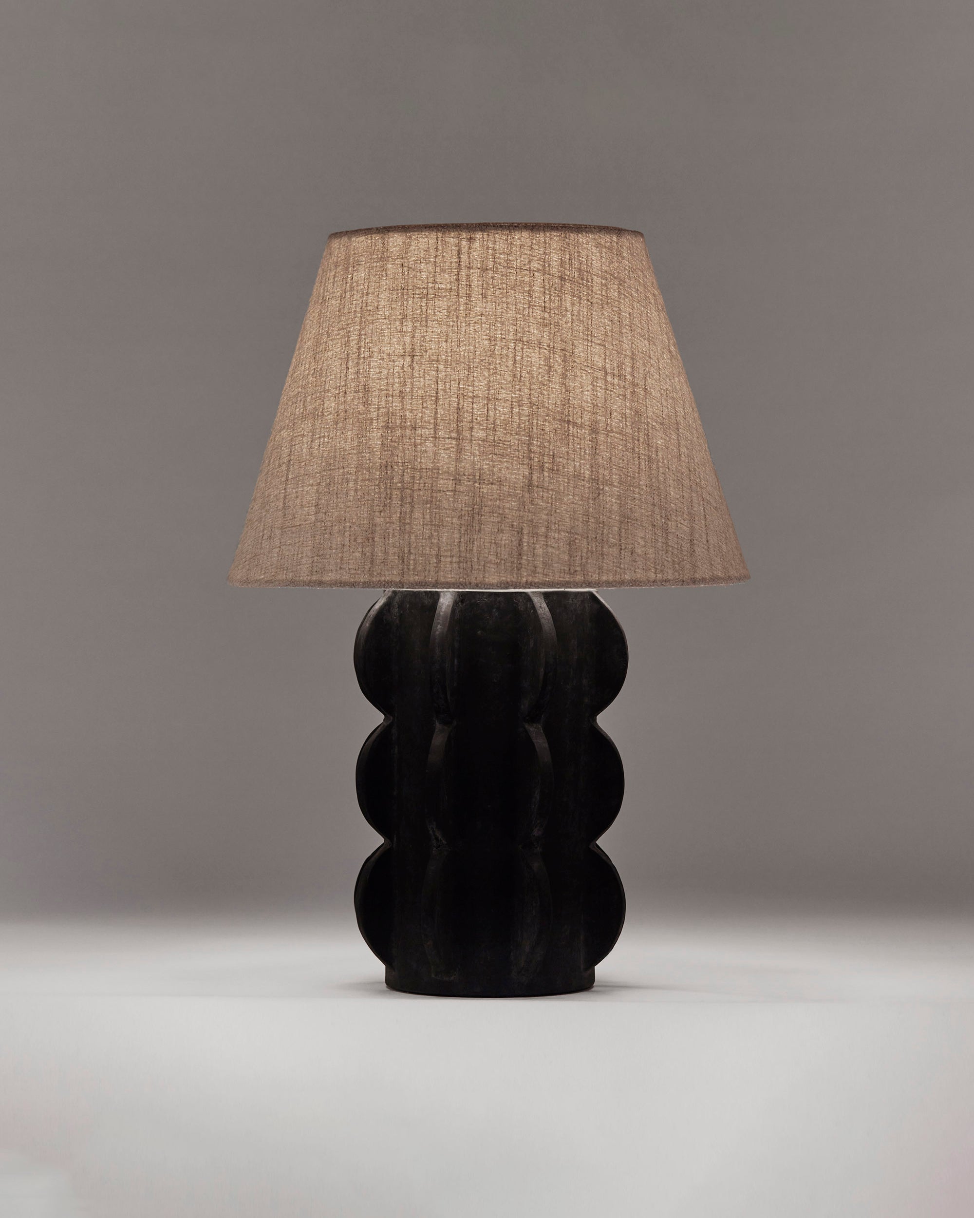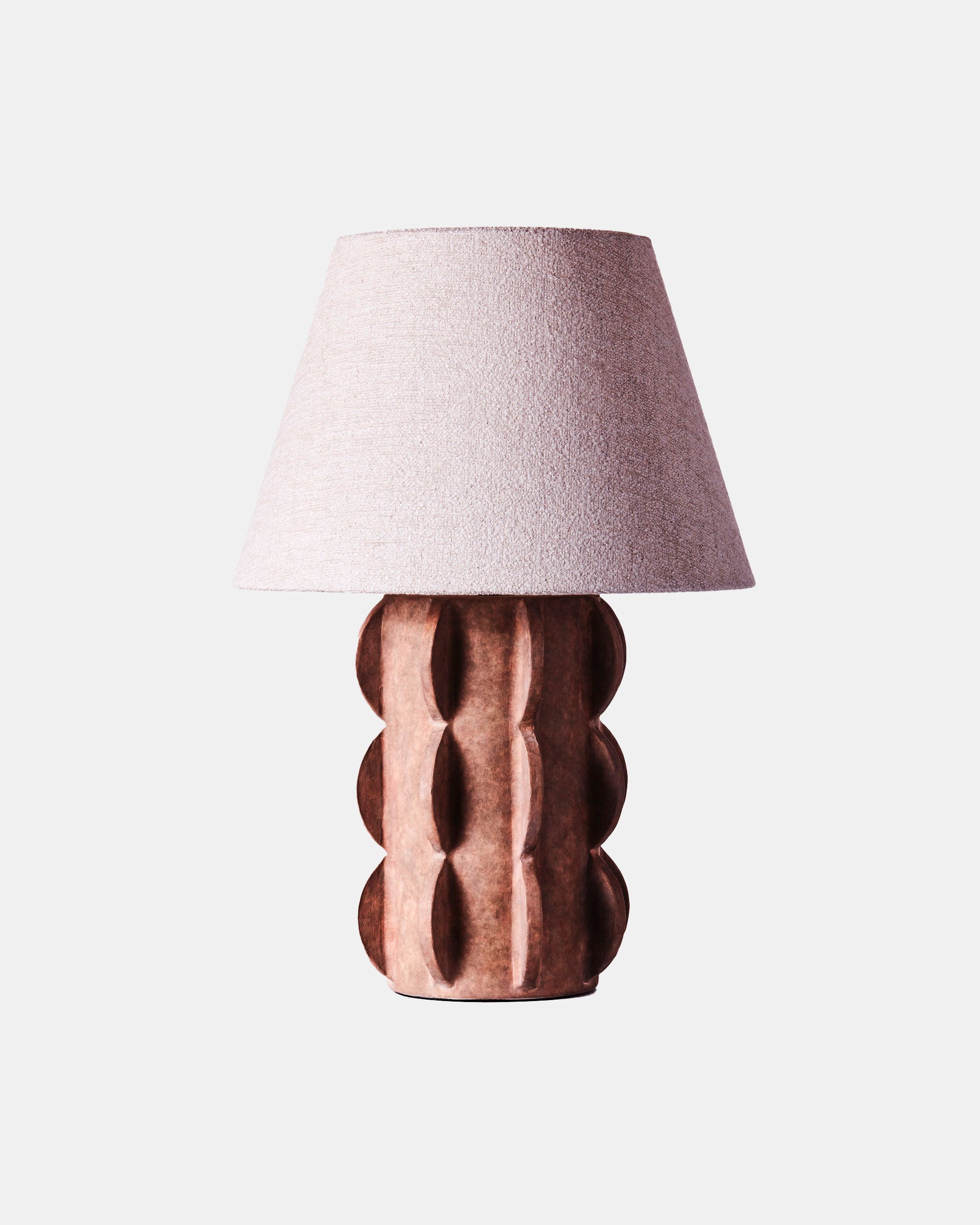 Den ikoniske buede basen er et gjentakende designelement blant Dusty Decos produkter og er laget av keramikk med en matt, vanntett finish. Tekstilskjermen tilfører varme og tekstur til lampens uttrykk, noe som gjør den til en perfekt kombinasjon av funksjon og estetikk.