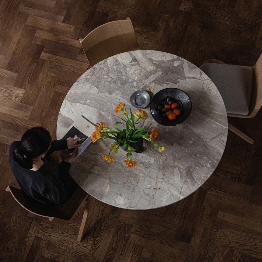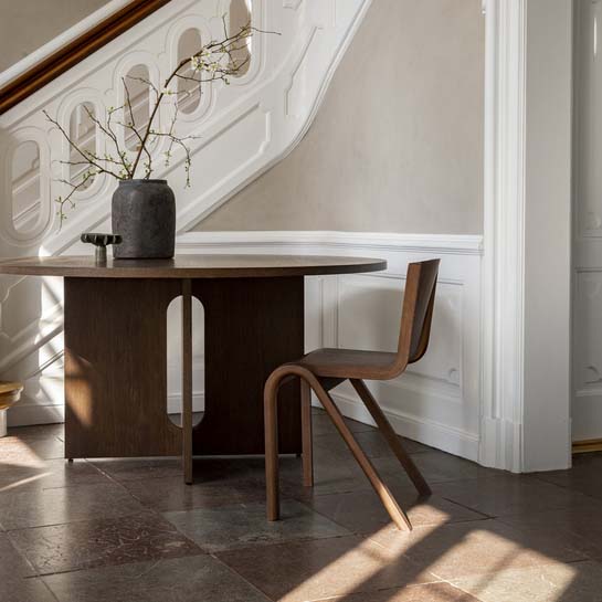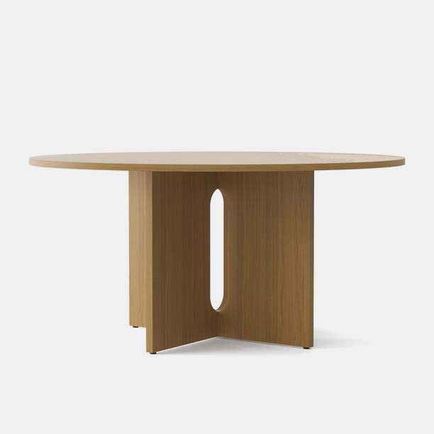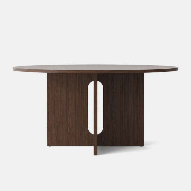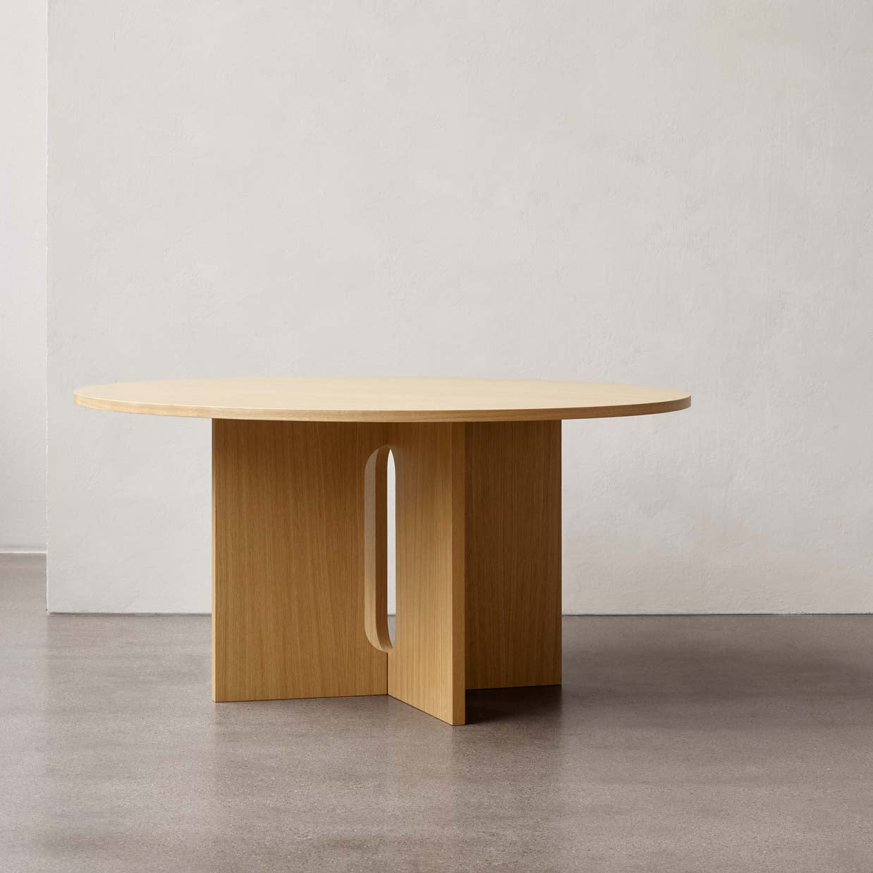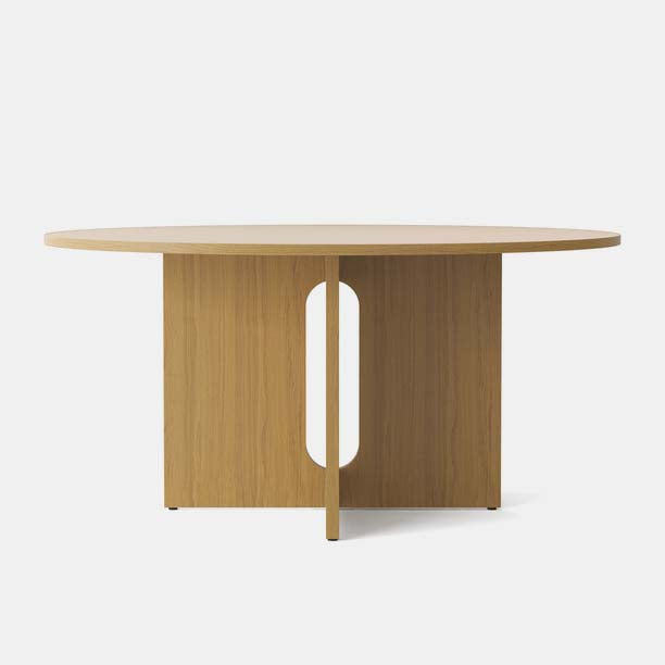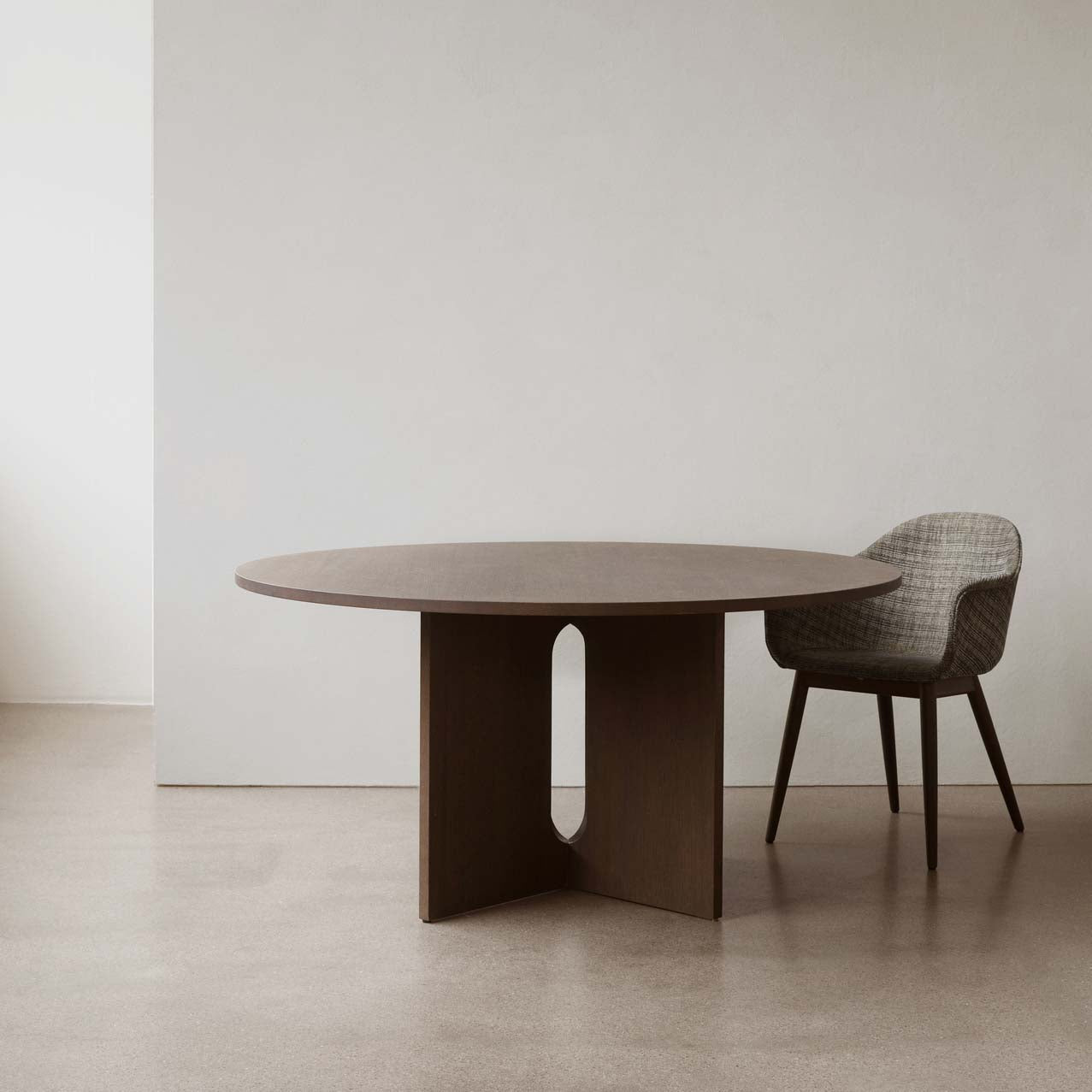 Androgyne Spisebord er et stort, rundt spisebord fra danske Menu, utformet av designeren Danielle Siggerud. Spisebordet ble laget som en videreutvikling av det tidligere sidebordet med samme navn, som også det kan kjøpes i vår nettbutikk. Her har spisebordet imidlertid fått et betydelig mer robust uttrykk, med kraftigere understell for å takle den solide bordplaten. Menus Androgyne Dining Table er tilgjengelig i to forskjellige størrelser, der du kan velge mellom bordplate på enten 120 eller 150 centimeter i diameter. Bordplaten til den større modellen kommer i naturlig eller mørkbeiset eik, mens den mindre modellen også er tilgjengelig i marmor.