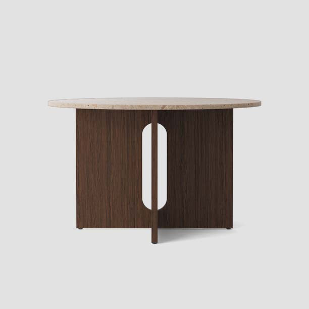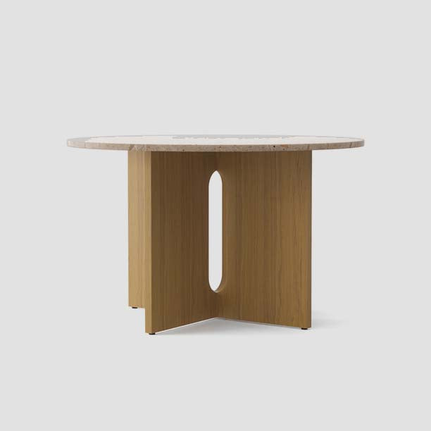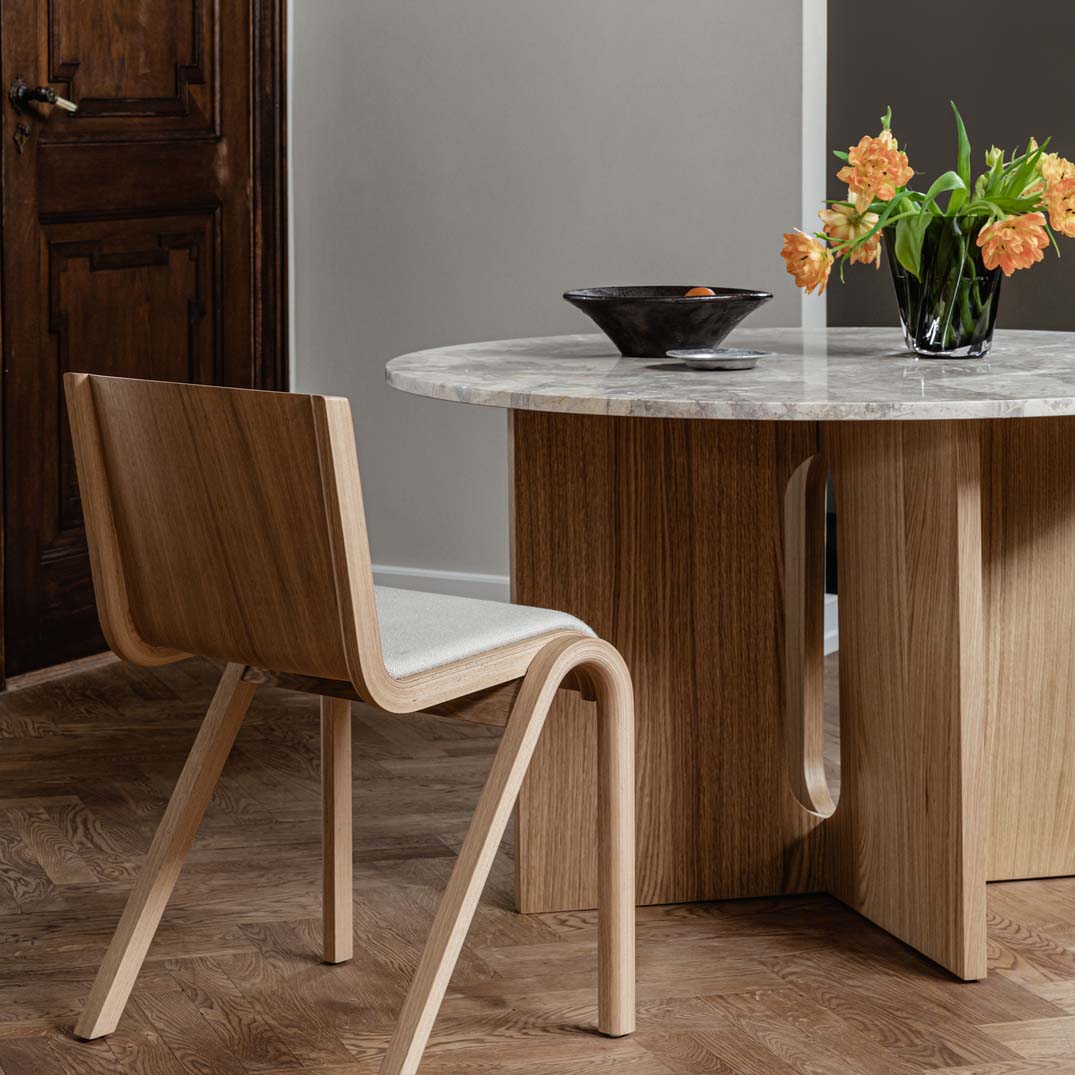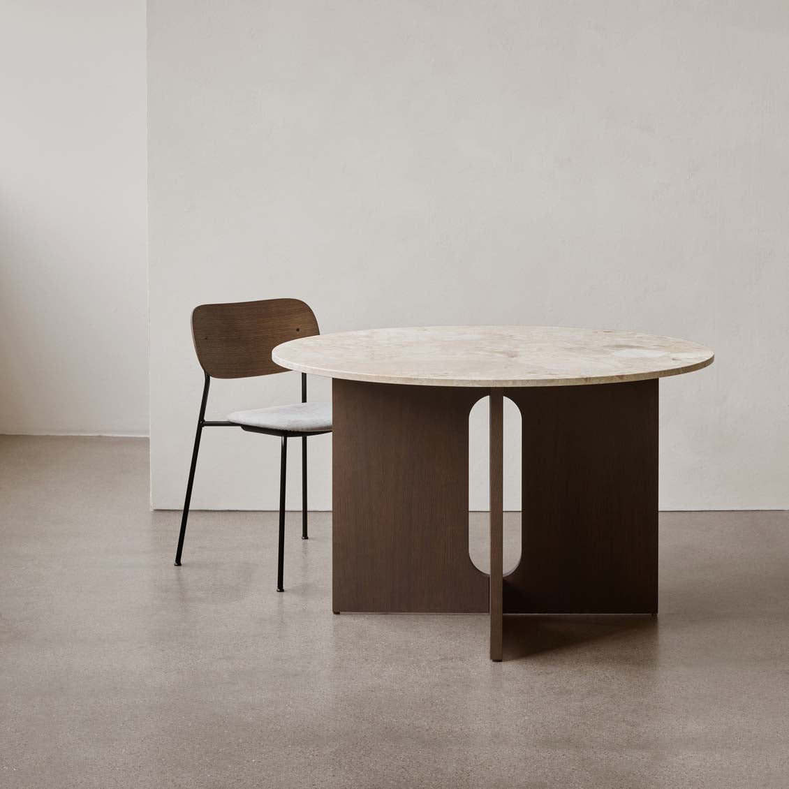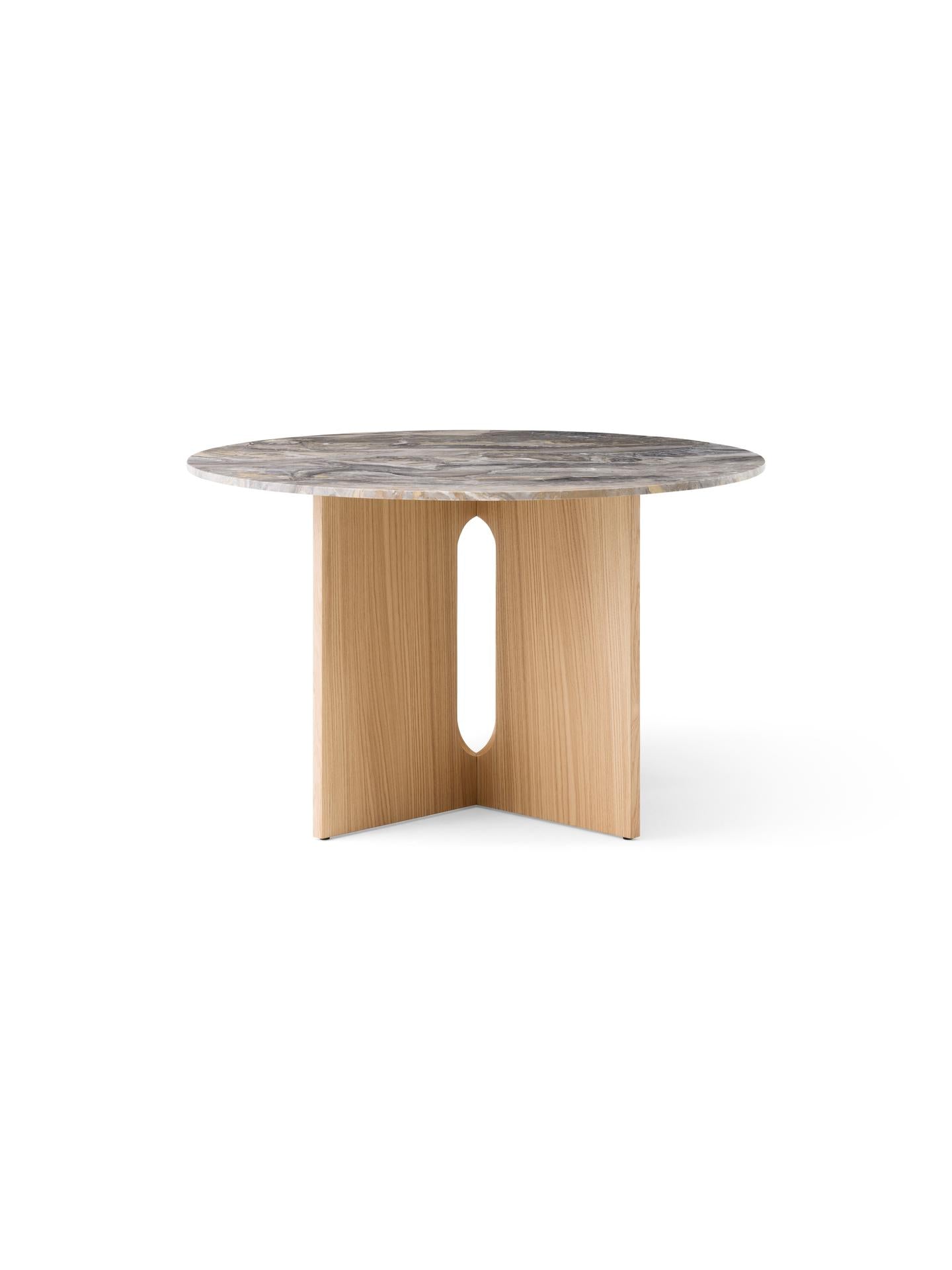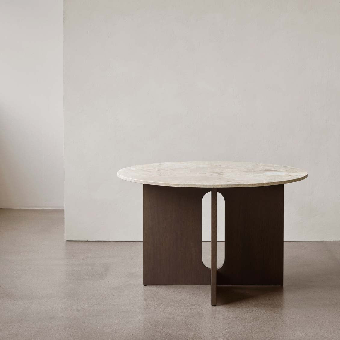 Androgyne Spisebord er et stort, rundt spisebord fra danske Menu, utformet av designeren Danielle Siggerud. Spisebordet ble laget som en videreutvikling av det tidligere sidebordet med samme navn, som også det kan kjøpes i vår nettbutikk. Her har spisebordet imidlertid fått et betydelig mer robust uttrykk, med kraftigere understell for å takle den solide bordplaten. Menus Androgyne Dining Table er tilgjengelig i to forskjellige størrelser, der du kan velge mellom bordplate på enten 120 eller 150 centimeter i diameter. Bordplaten til den større modellen kommer i naturlig eller mørkbeiset eik, mens den mindre modellen også er tilgjengelig i marmor.
