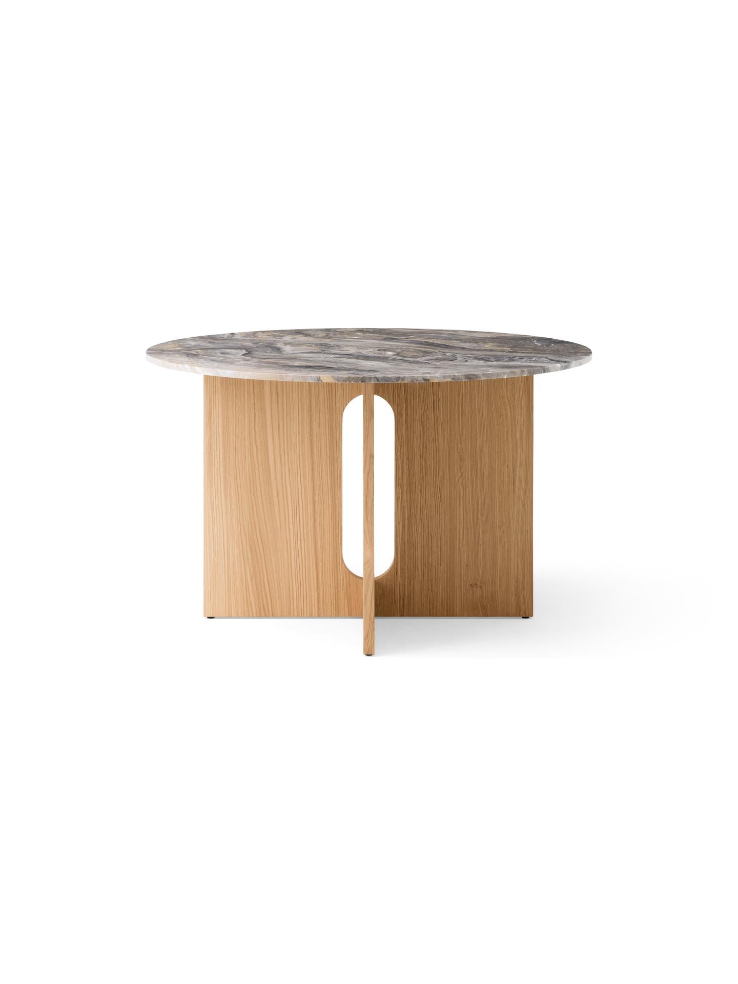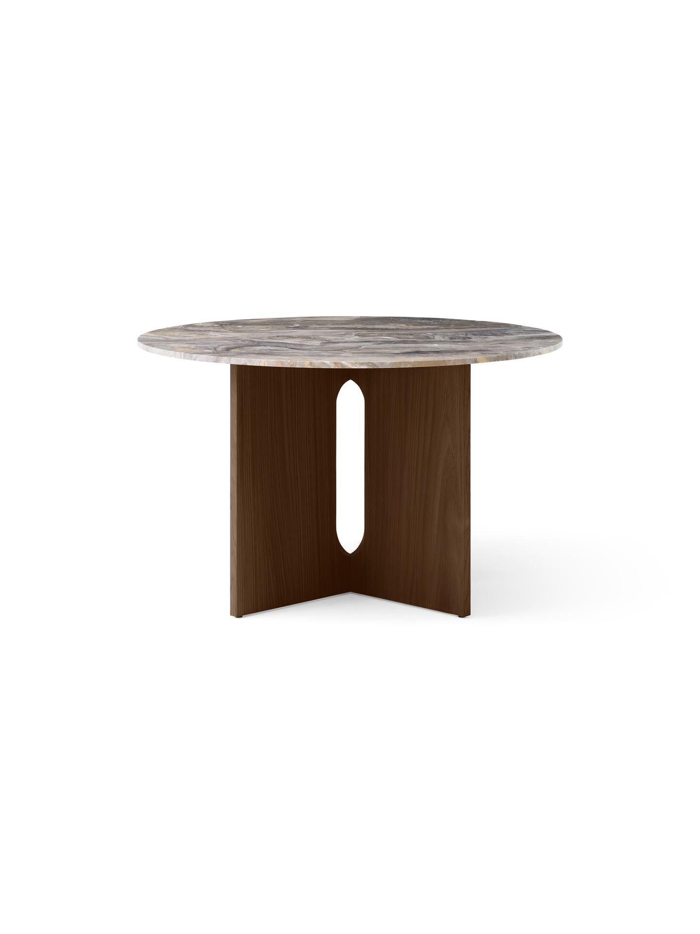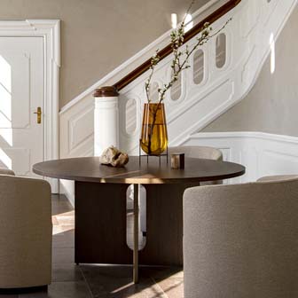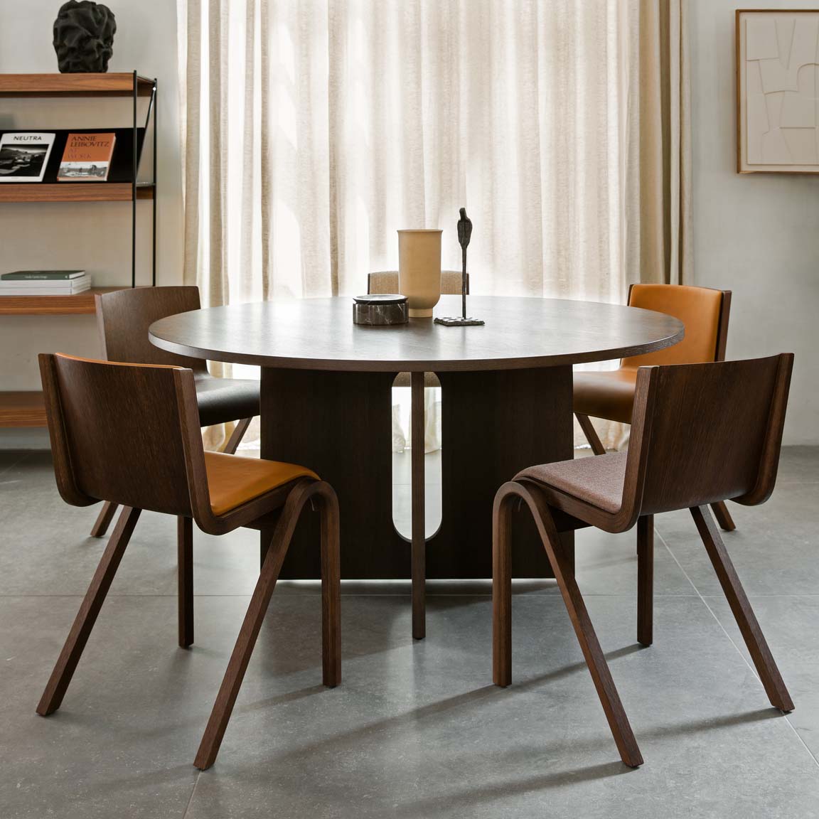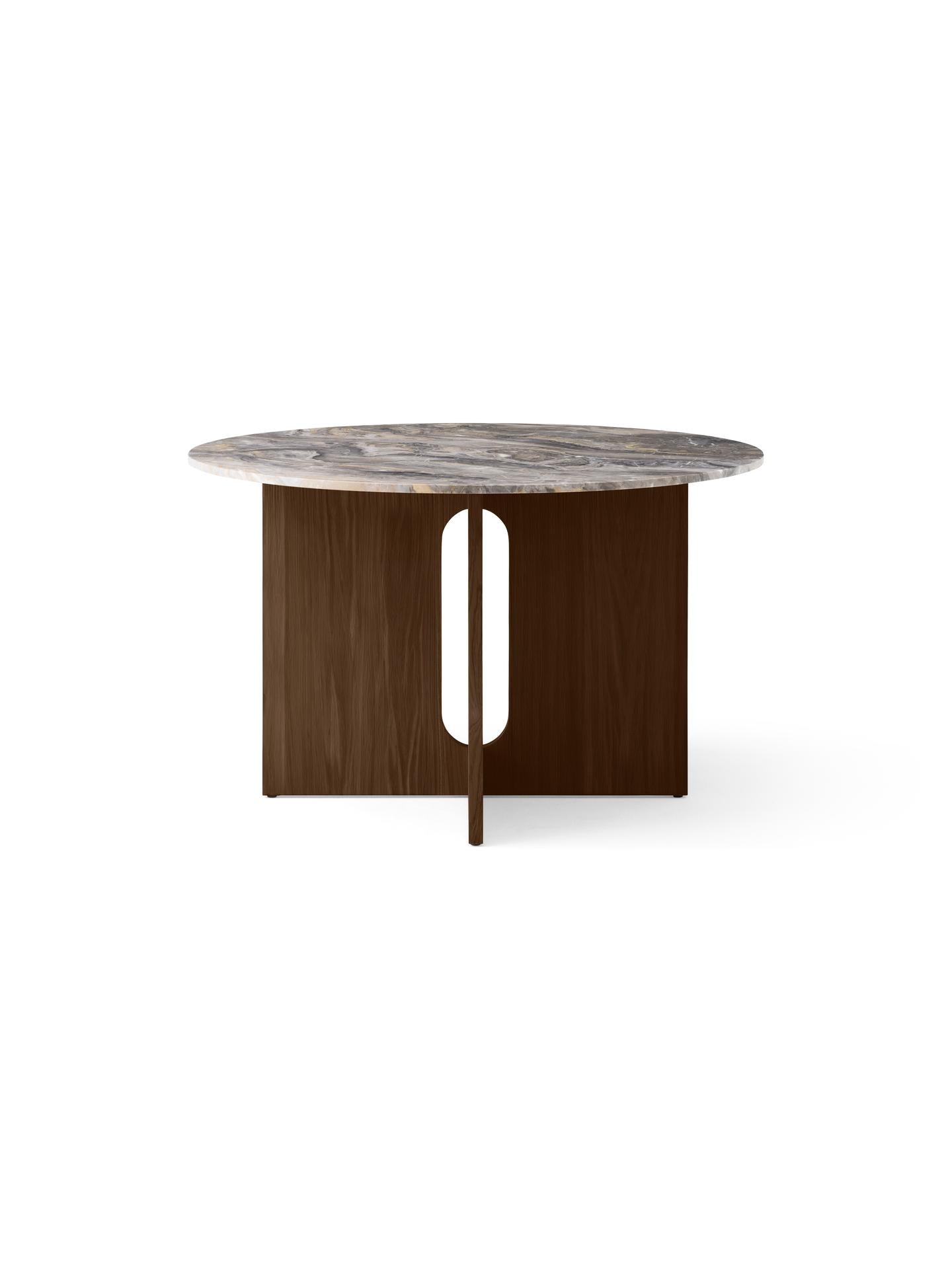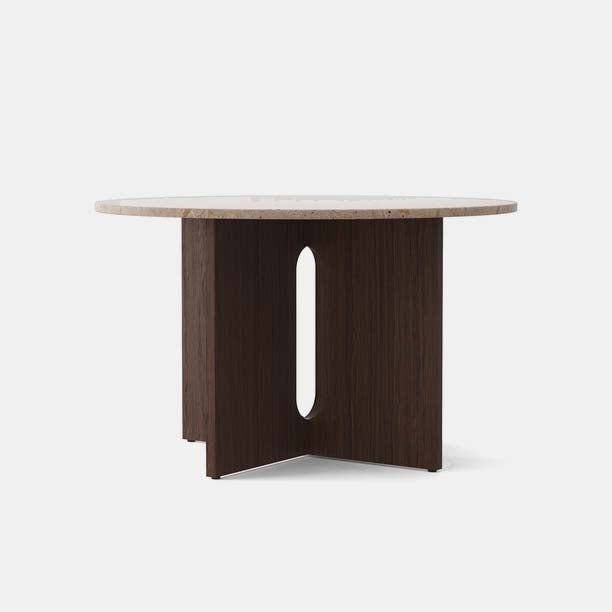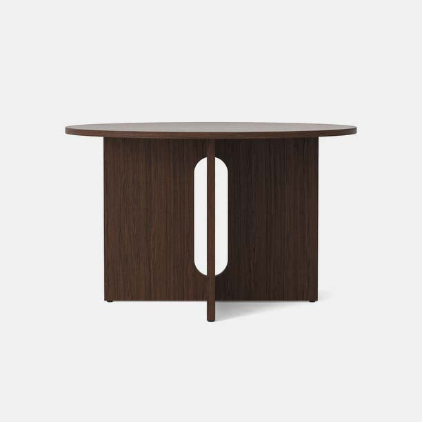 Androgyne Spisebord er et stort, rundt spisebord fra danske Menu, utformet av designeren Danielle Siggerud. Spisebordet ble laget som en videreutvikling av det tidligere sidebordet med samme navn, som også det kan kjøpes i vår nettbutikk. Her har spisebordet imidlertid fått et betydelig mer robust uttrykk, med kraftigere understell for å takle den solide bordplaten. Menus Androgyne Dining Table er tilgjengelig i to forskjellige størrelser, der du kan velge mellom bordplate på enten 120 eller 150 centimeter i diameter. Bordplaten til den større modellen kommer i naturlig eller mørkbeiset eik, mens den mindre modellen også er tilgjengelig i marmor.