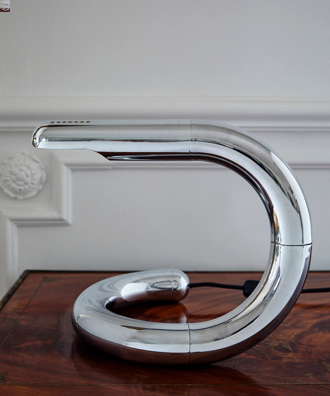 Serpentin i form, vakkert balansert og skinnende som en juvel! Aspide bordlampe av Gianfranco Frattini er både et strålende praktisk stykke industridesign og en uimotståelig leken designerklæring. Aspide ble designet som en allsidig arbeidslampe som kan justeres manuelt for å skape enten direkte lys for arbeid eller lesing, eller vendes mot veggen for å skape en mykere, omgivende glød; lampens kropp kan dreies manuelt 350º i både nakken og hodet.