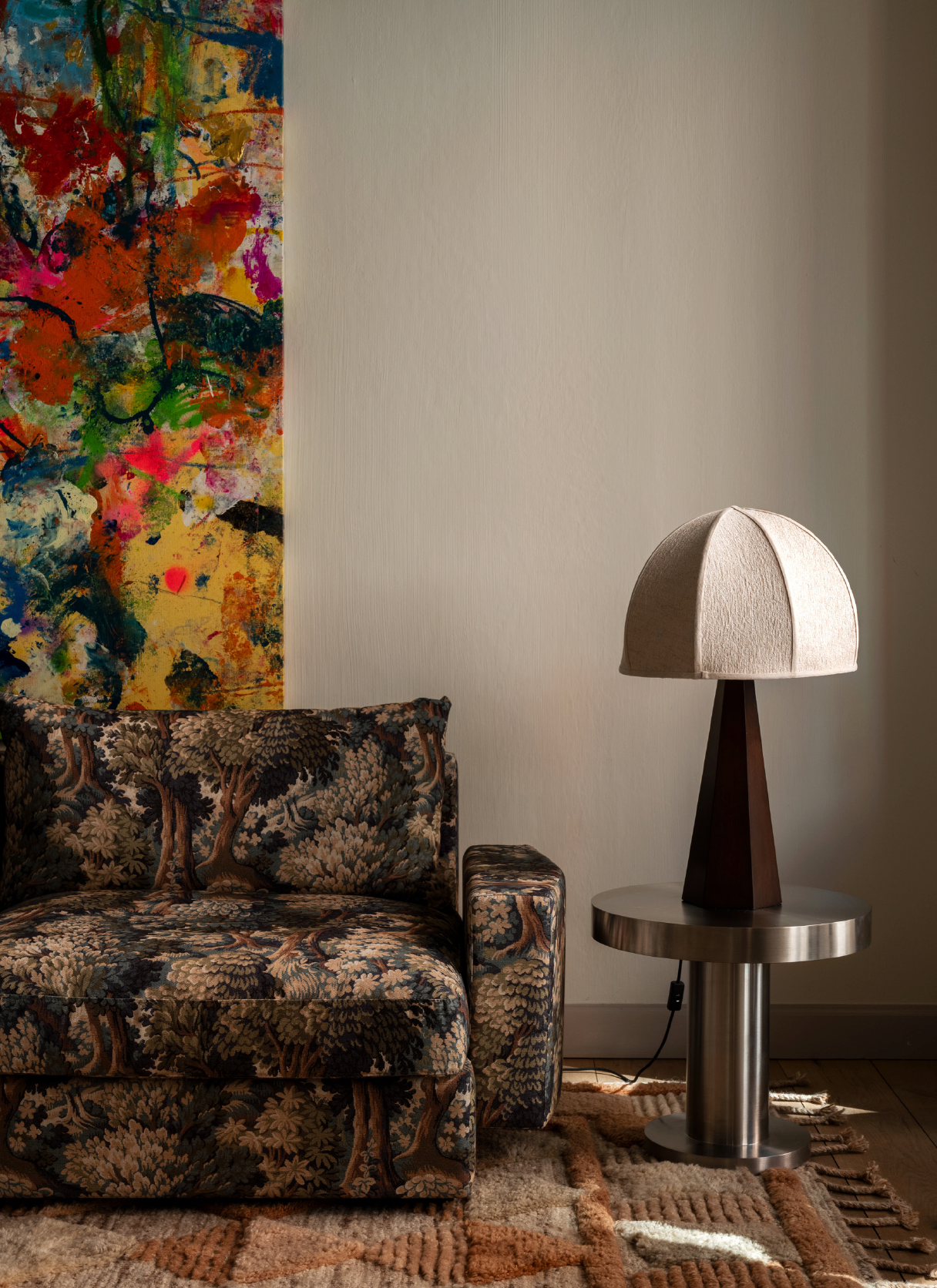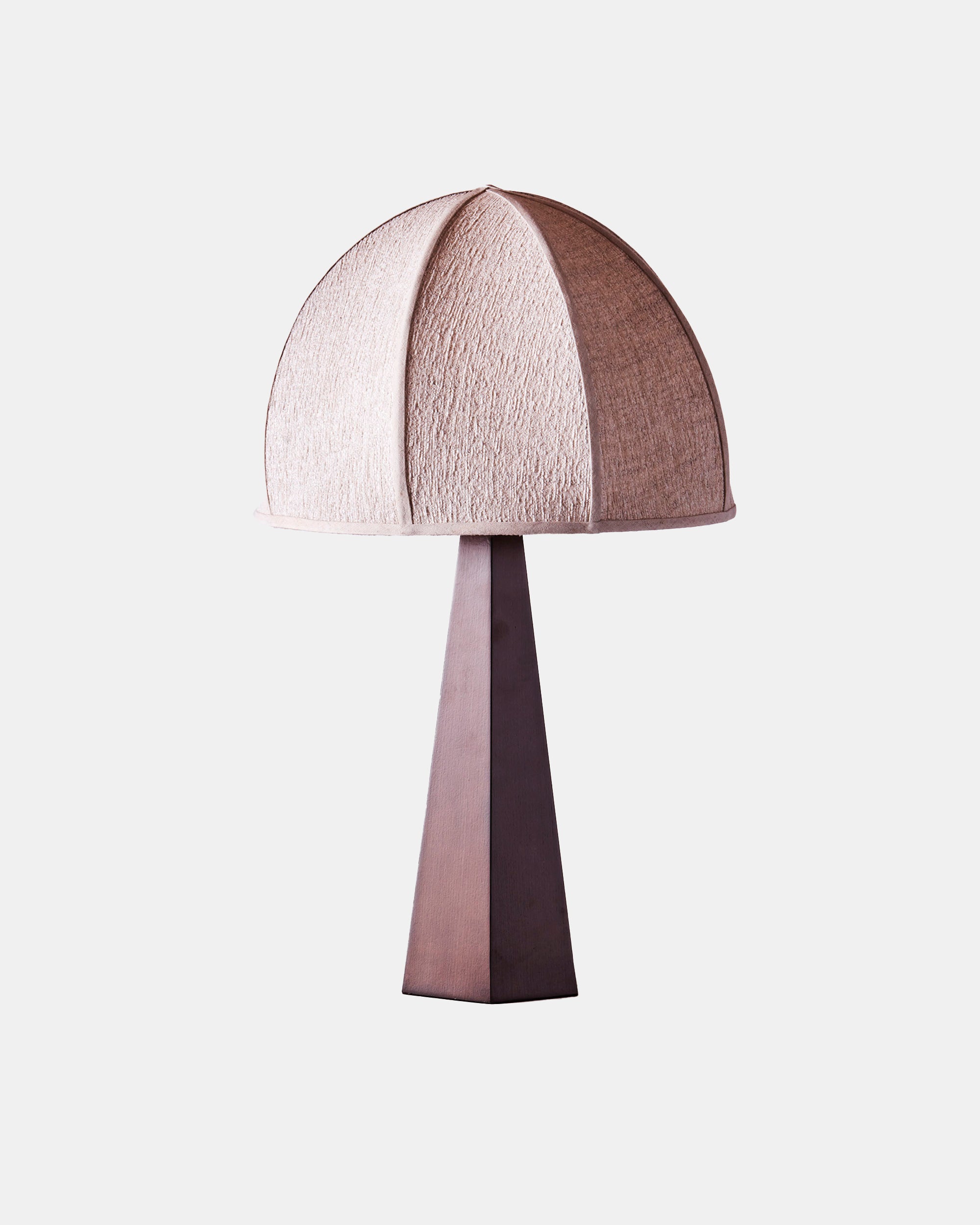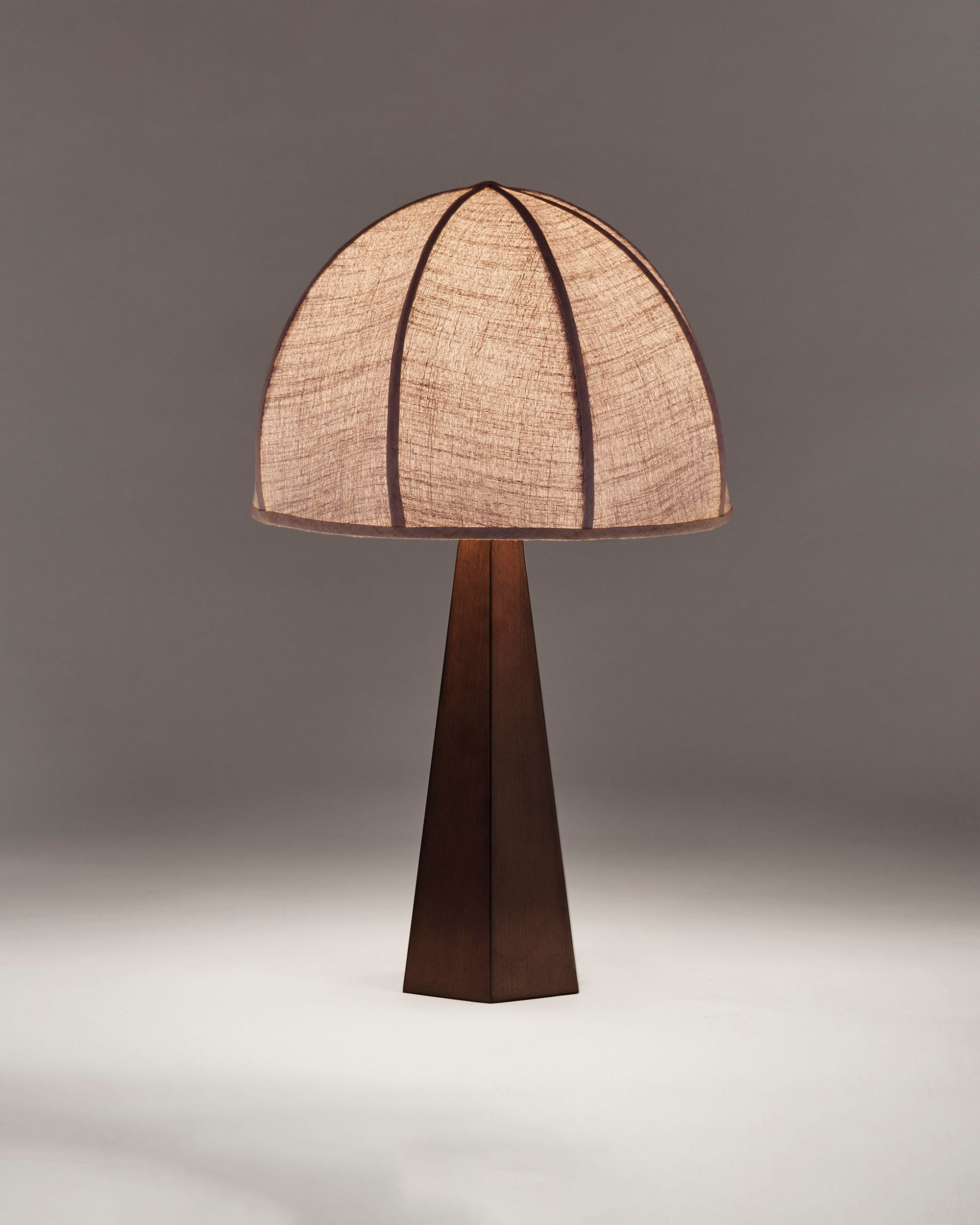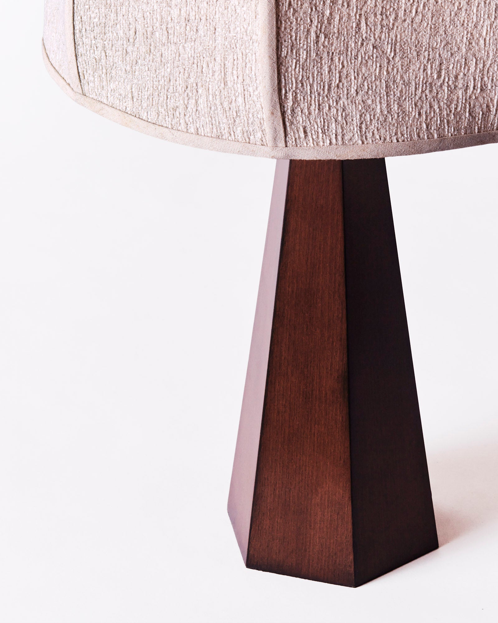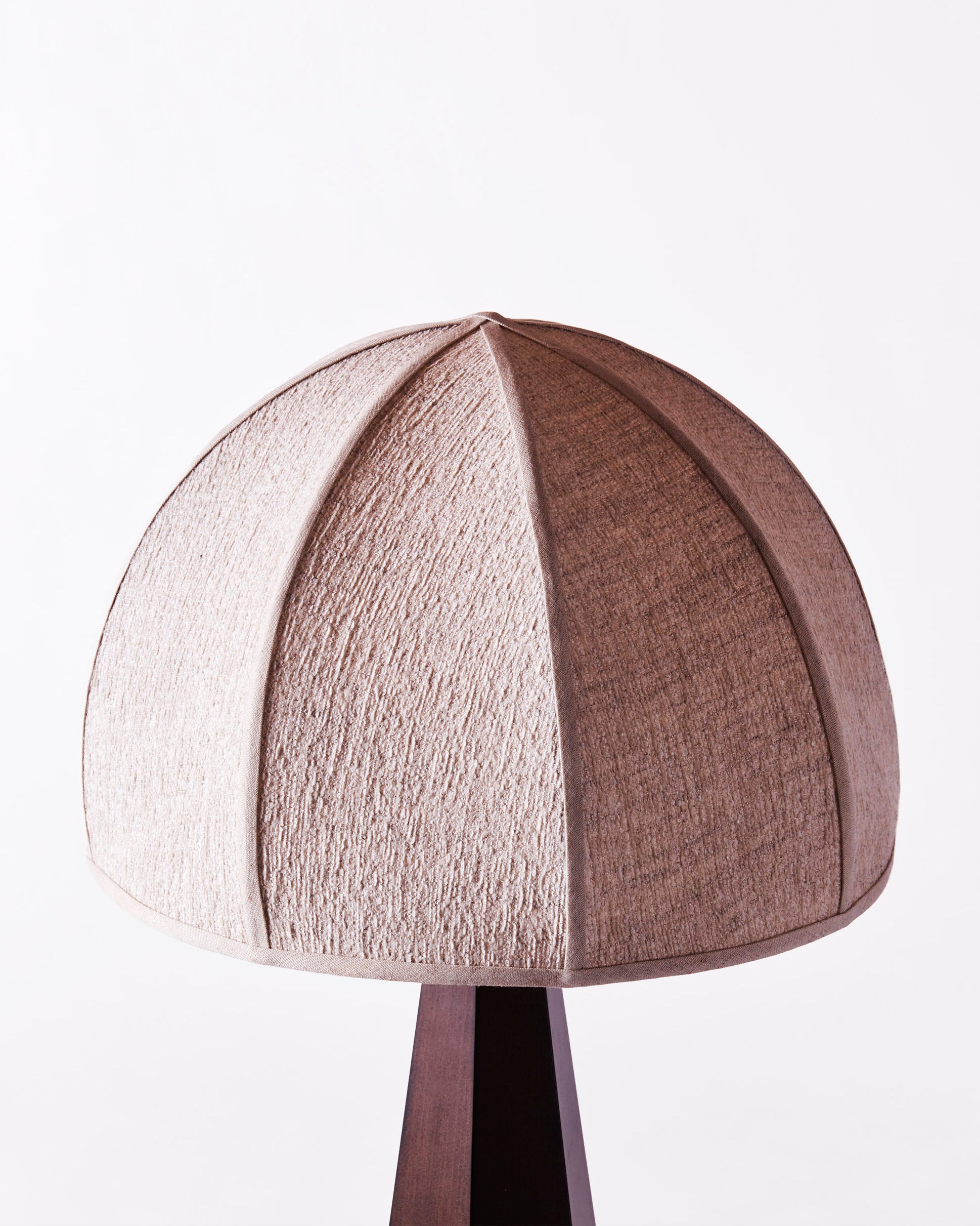 Sekskanten er en vanlig form i Dusty Decos design, inkludert denne bordlampen. Hexagon bordlampe har en base laget av dyrket mahogni. En stor skjerm i tekstil sitter på toppen av trebasen. Hexagon bordlampe er like god i stuen som den er på soverommet. Uansett hvor du plasserer den, vil du legge til et snev av 1970-tallsstemningen til hjemmet ditt.
