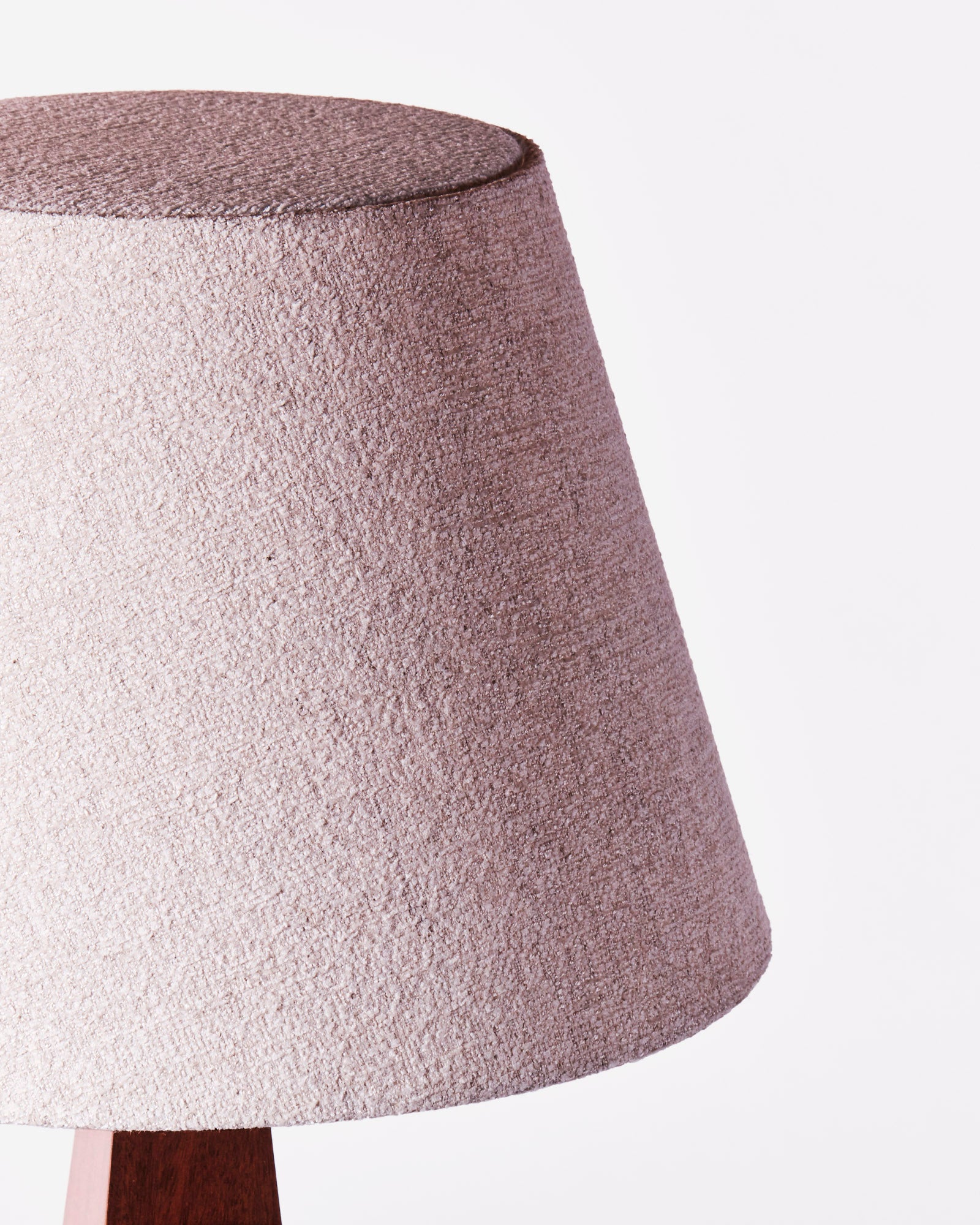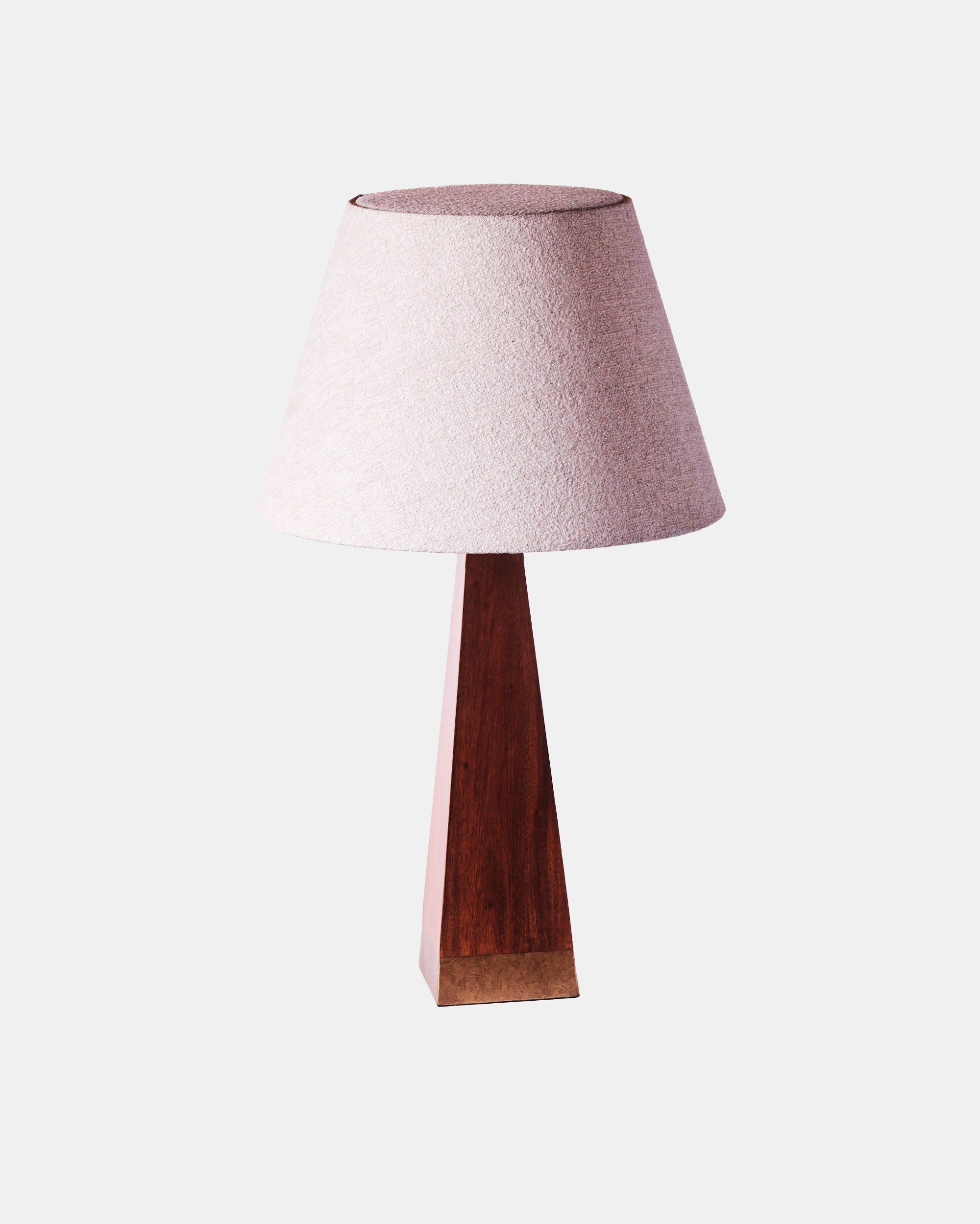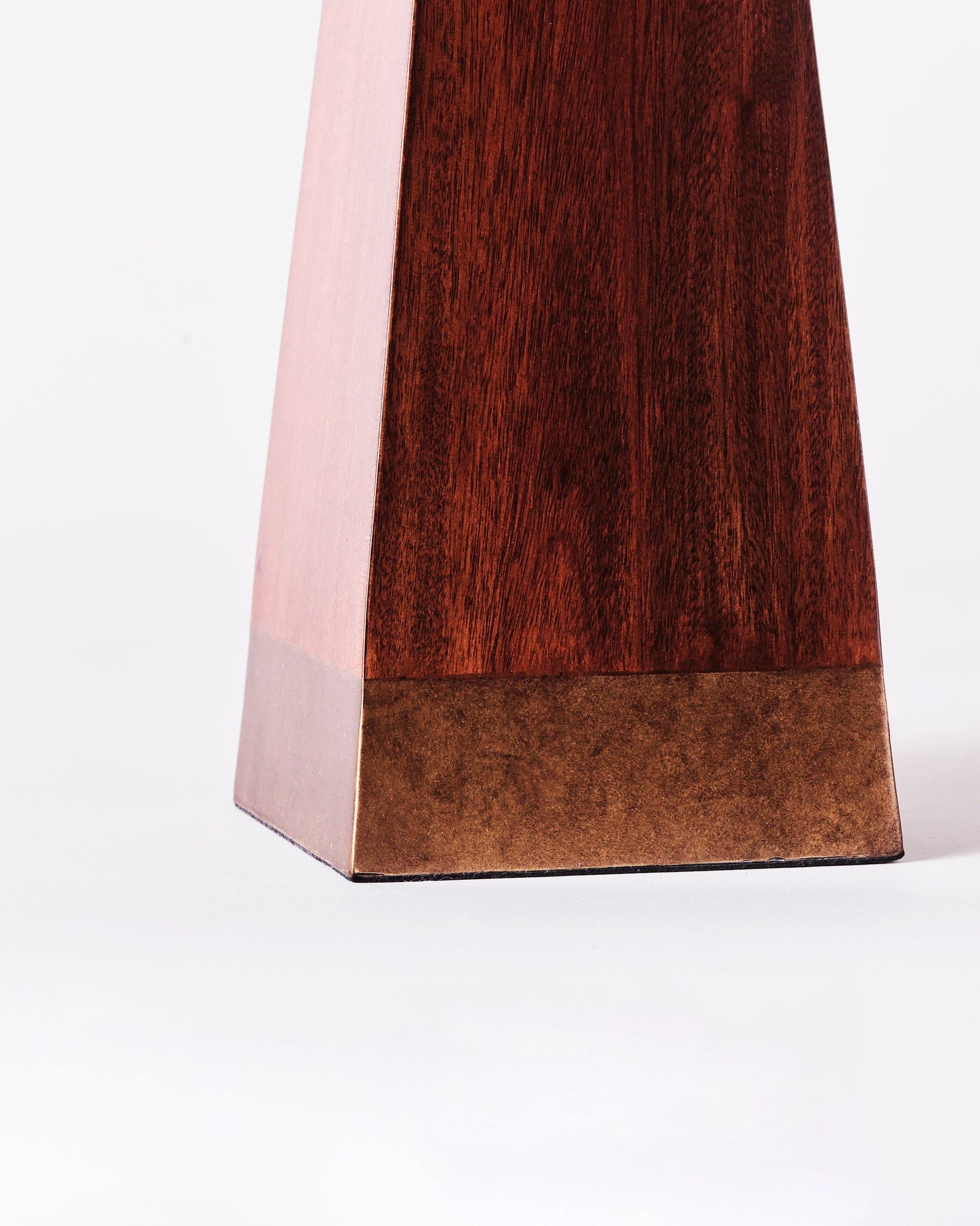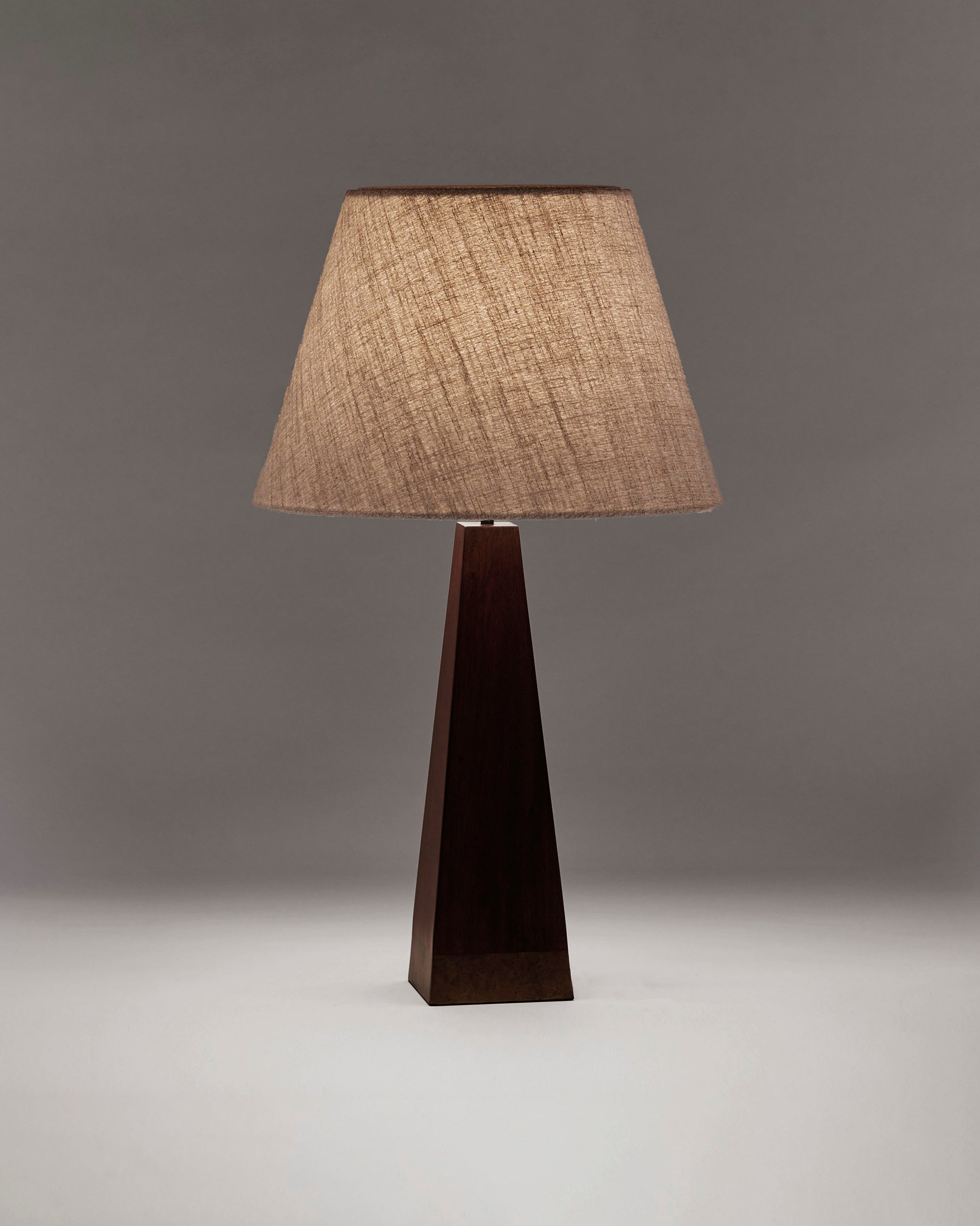 Pyramid bordlampe er en lampe laget av dyrket mahogni med messingdetaljer i bunnen. Basen laget av messing er patinert for en vintage-look. En kubisk skjerm laget av tekstil sprer et mykt lys rundt omgivelsene. Pyramid bordlampe kan plasseres på soverommet på nattbordet, eller i stuen ved siden av en sofa eller lenestol. I tillegg til denne bordlampen inkluderer Pyramid-serien også en gulvlampe og lysestaker laget av marmor.