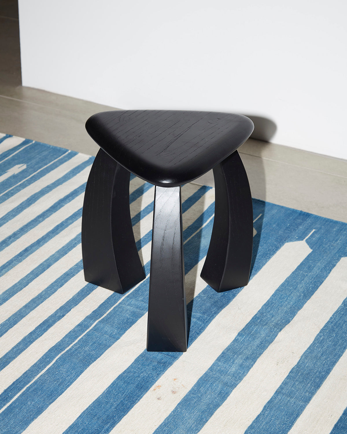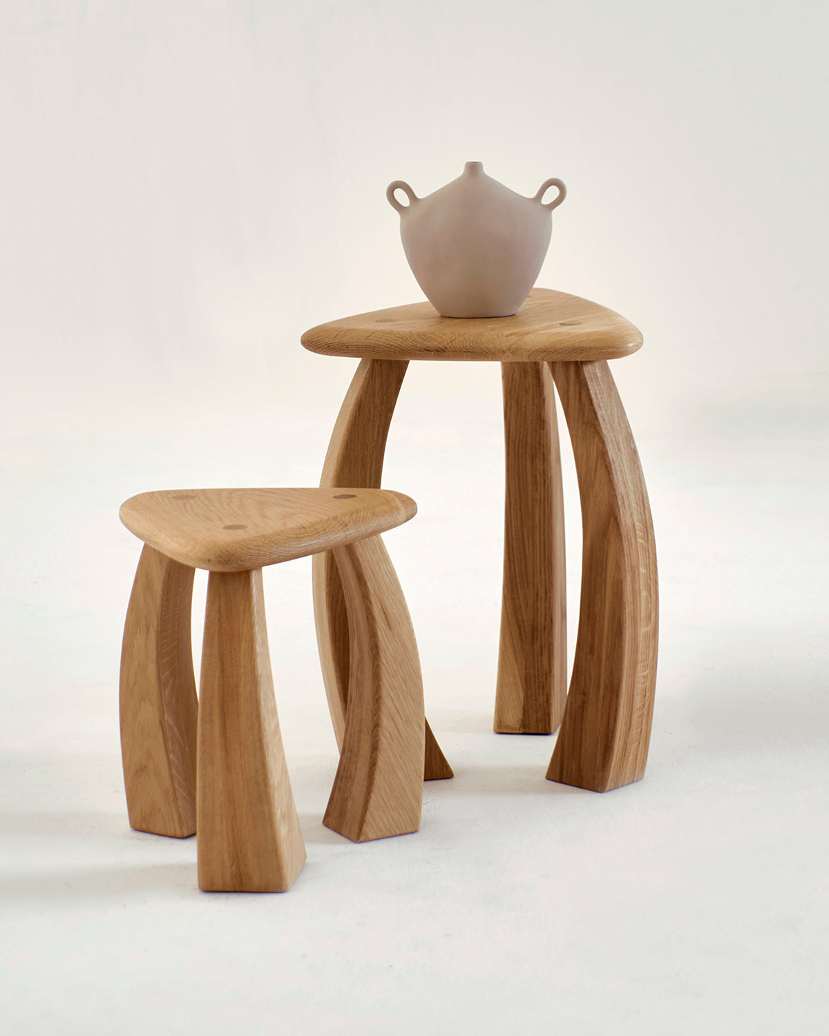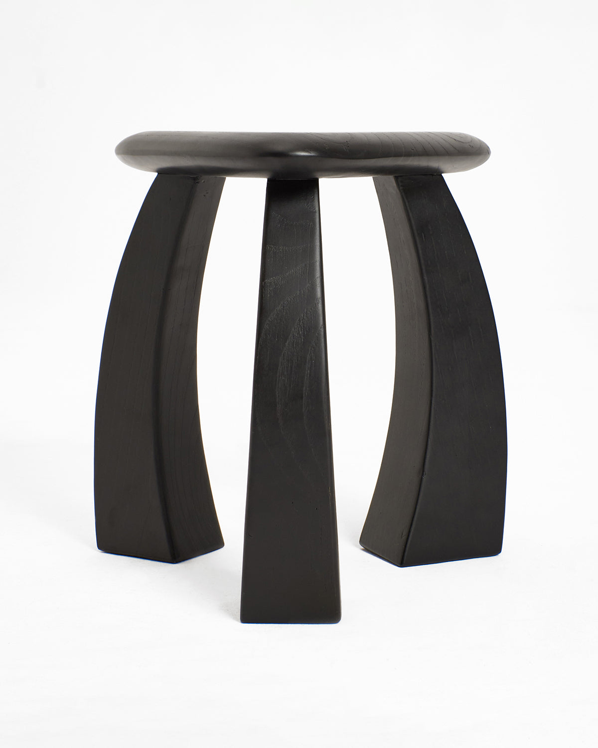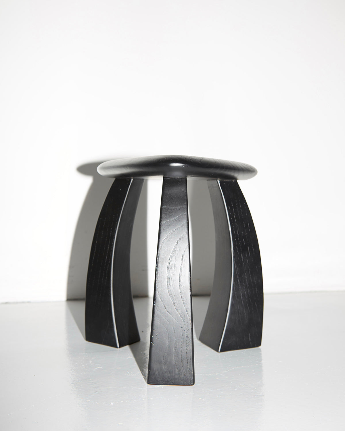 ARC DE STOOL er en serie skulpturelle møbler designet i 2022, håndlaget av dyktige håndverkere i Nord-Portugal. Med sine buede ben og trekantede topp kombinerer disse objektene estetikk og håndverk i en balansert form.