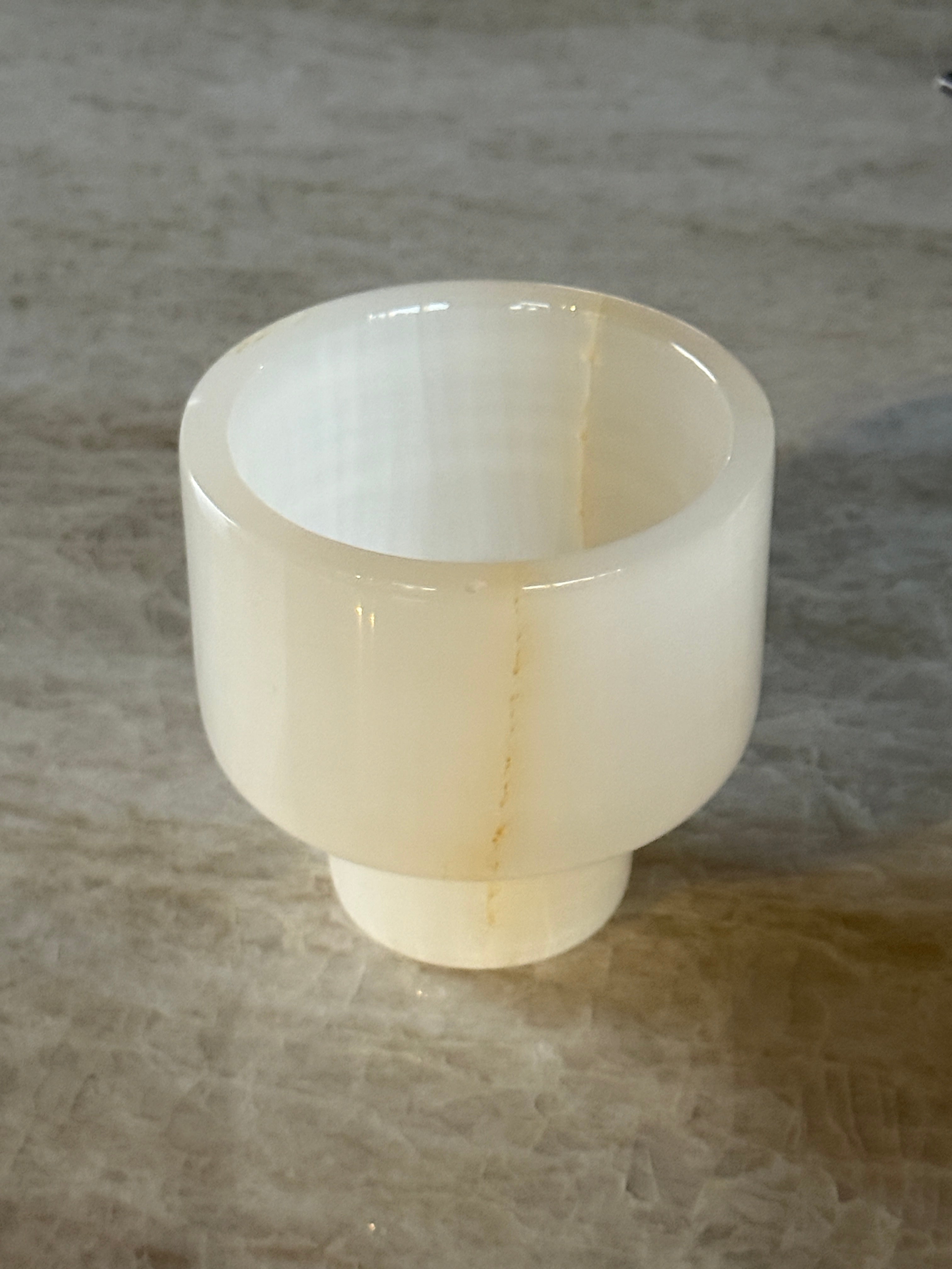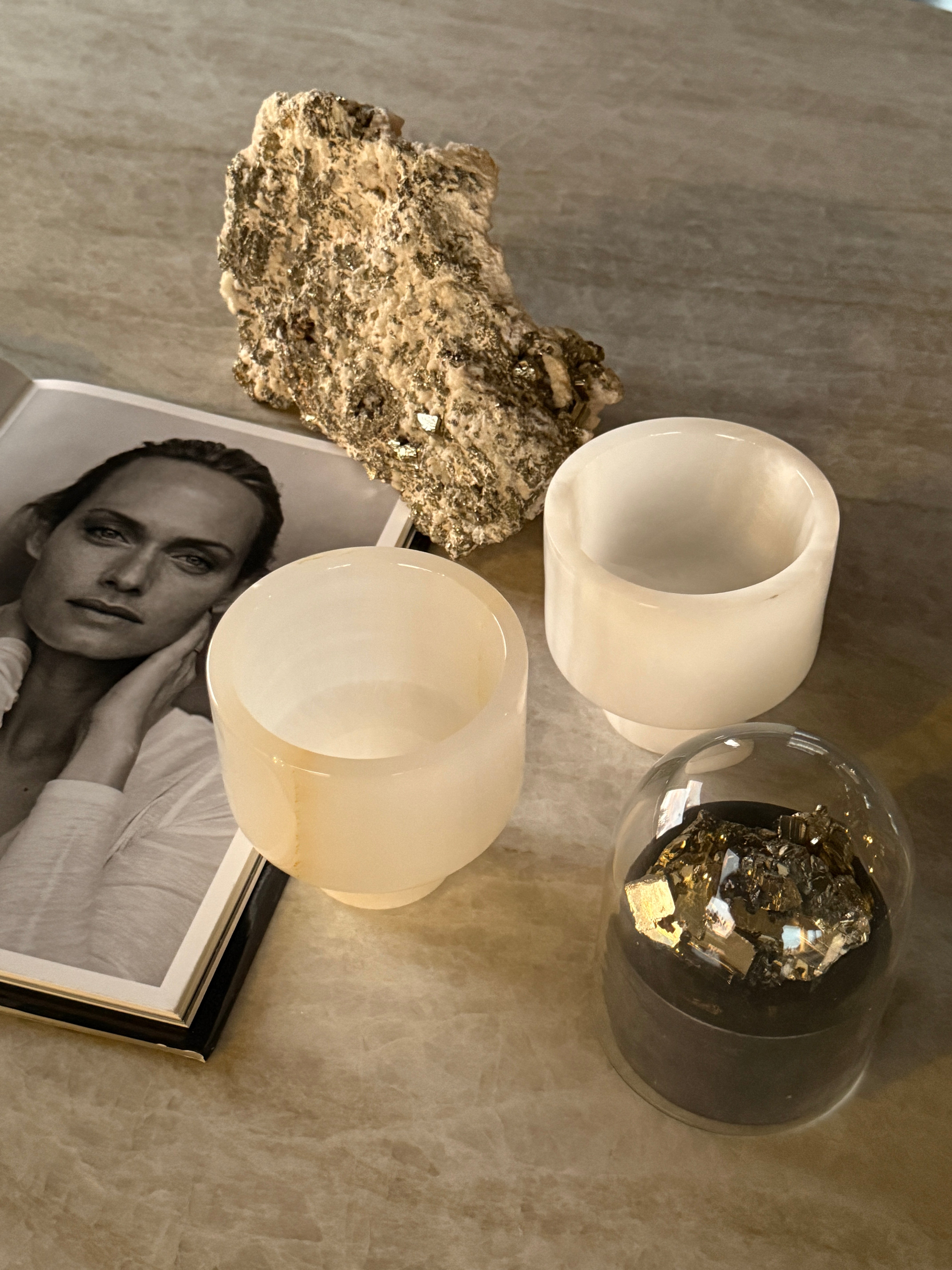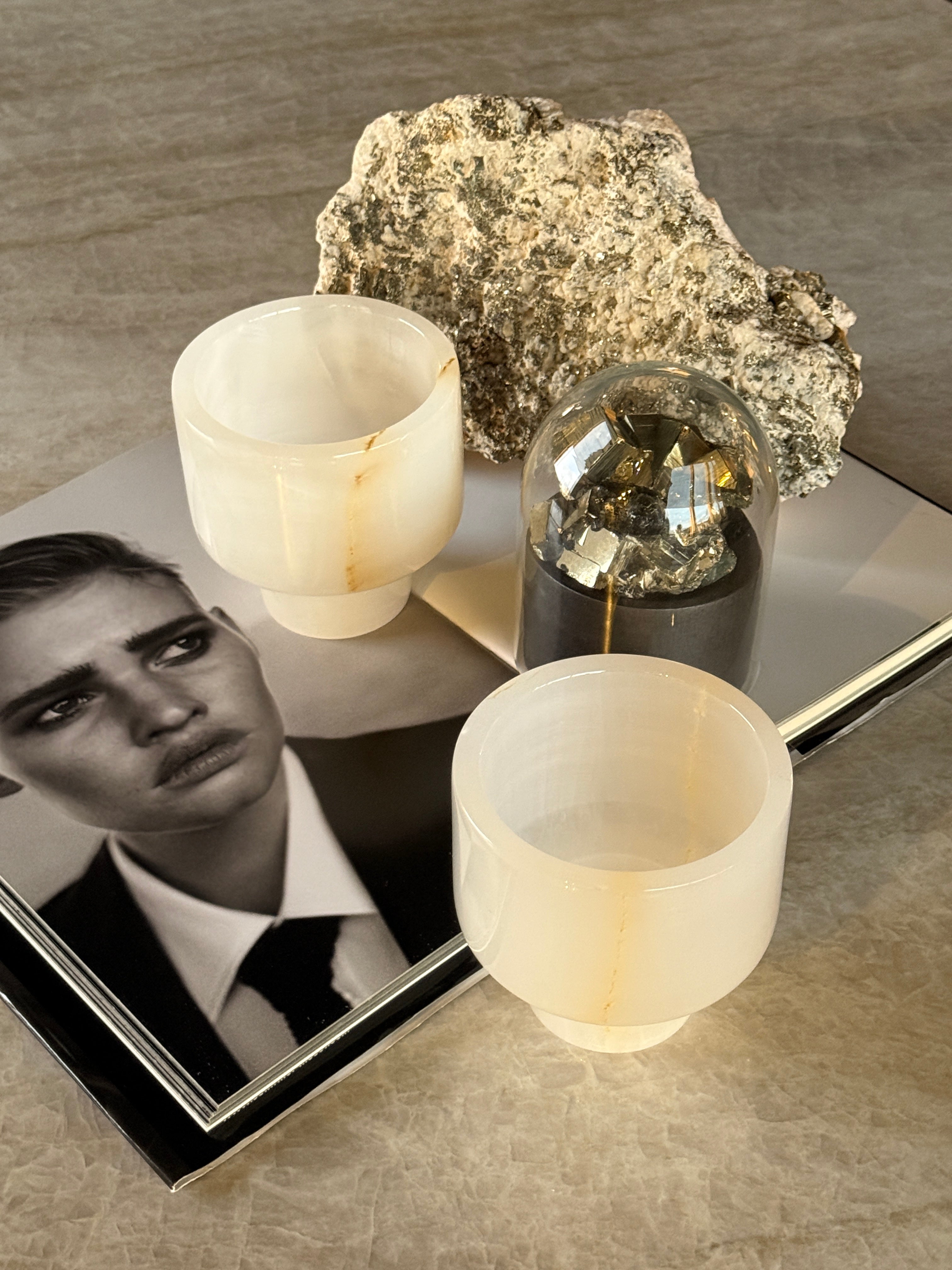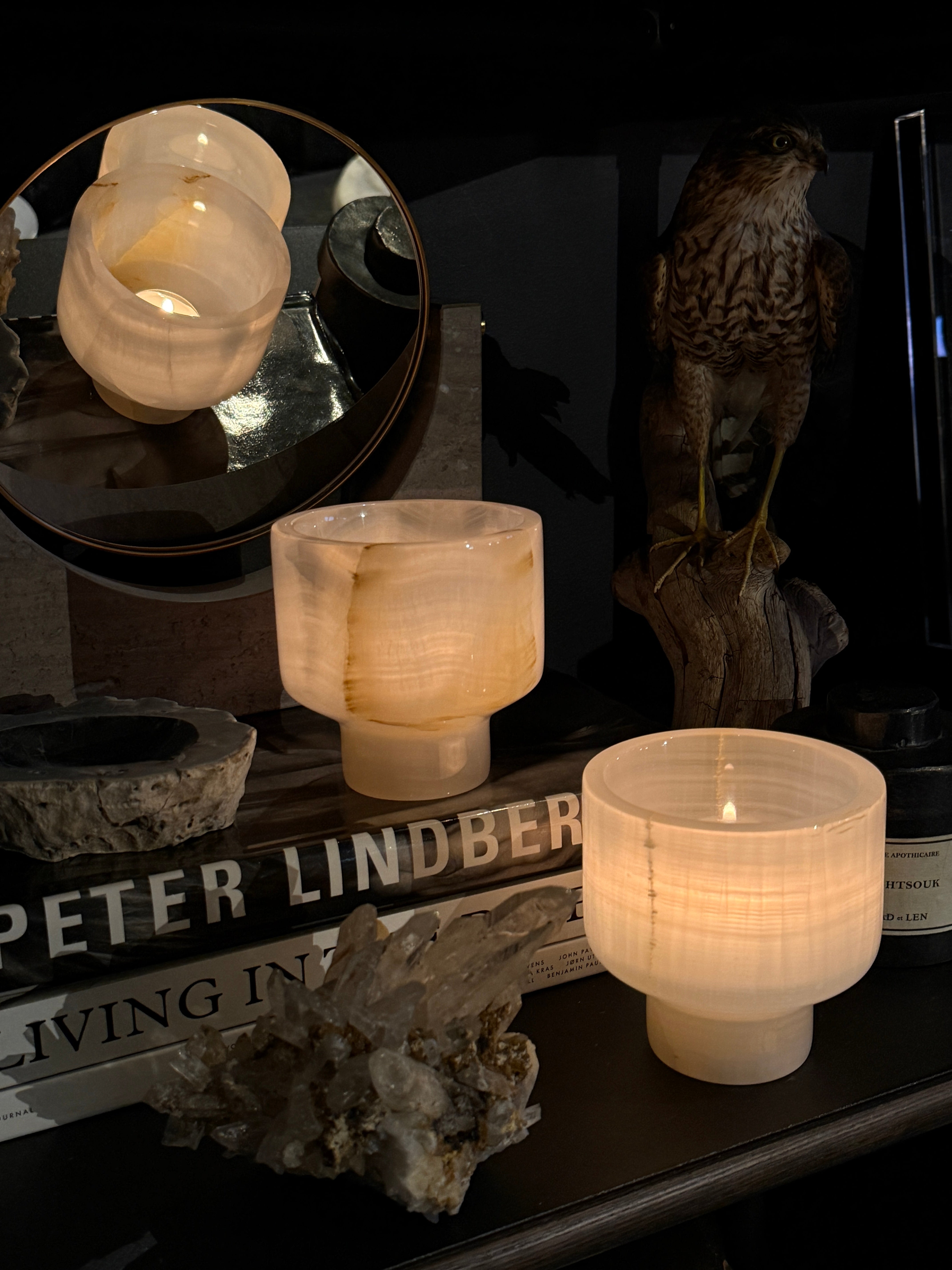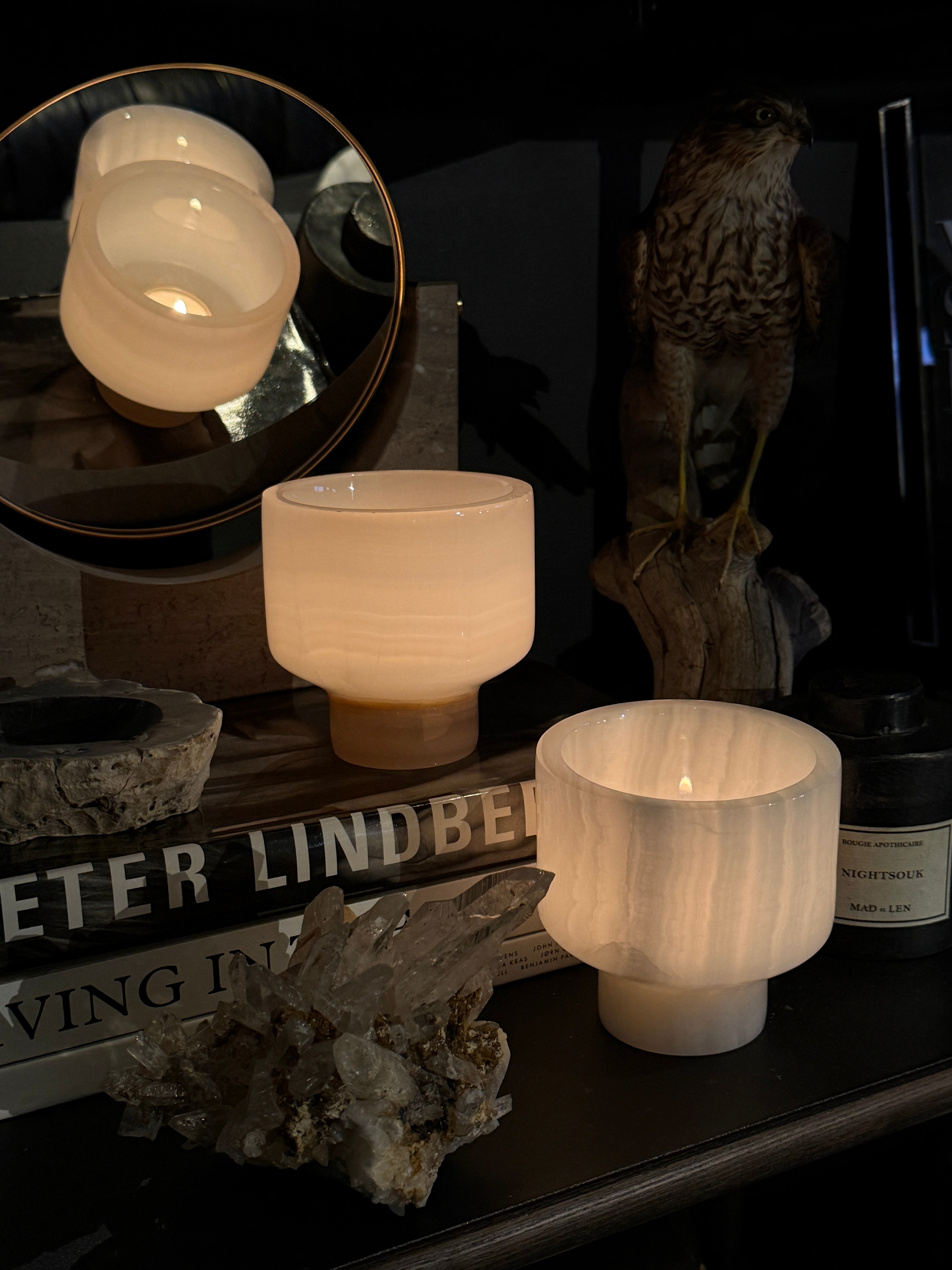 Onyx telysholder laget i ekte, polert onyx – et naturmateriale kjent for sin unike, gjennomskinnelige glød. Den solide, tunge utførelsen gir en følelse av kvalitet og eksklusivitet. Når man tenner lys i den, forvandles steinen og skaper en varm, stemningsfull atmosfære med myke nyanser og naturlige årer i steinen.