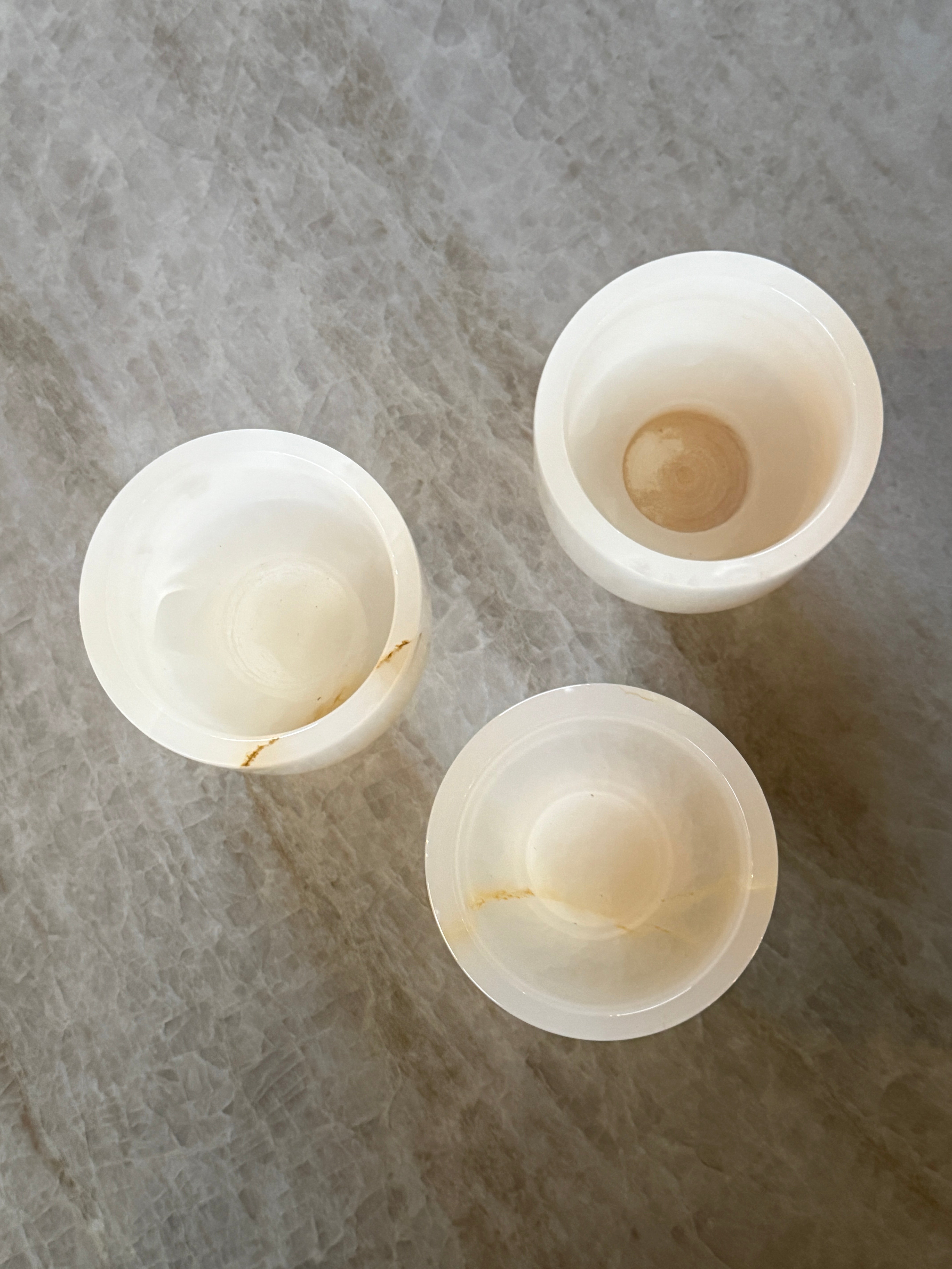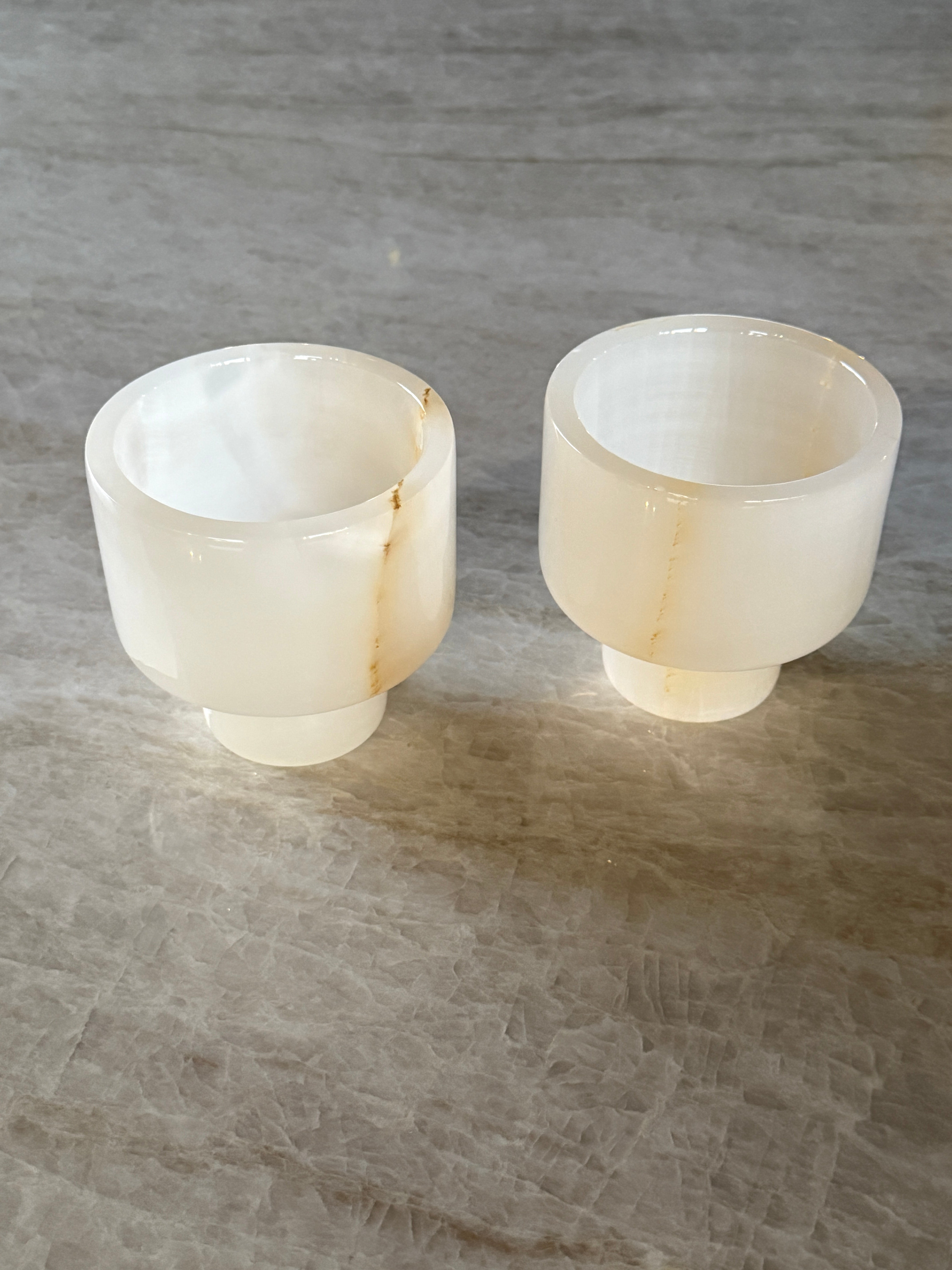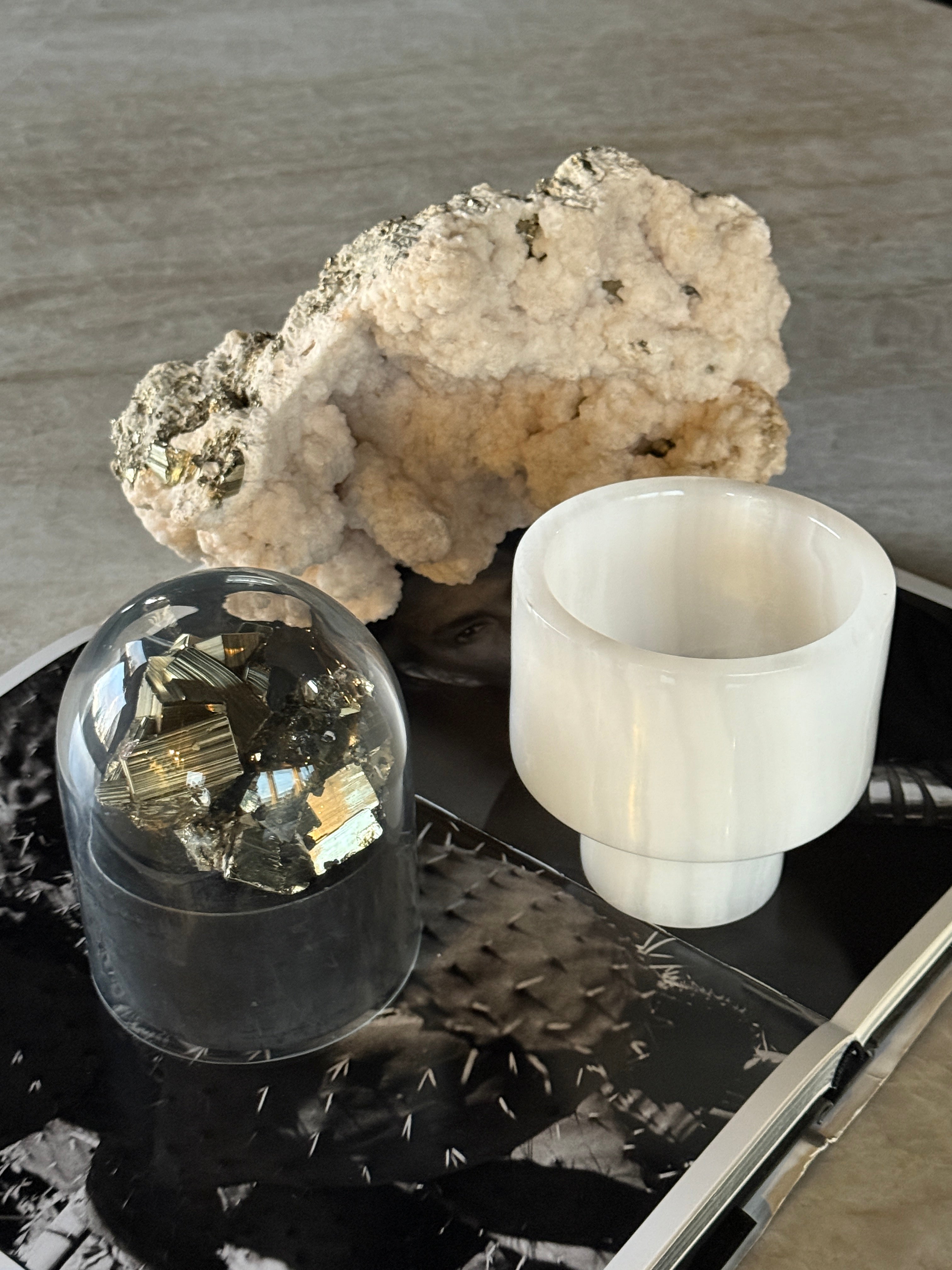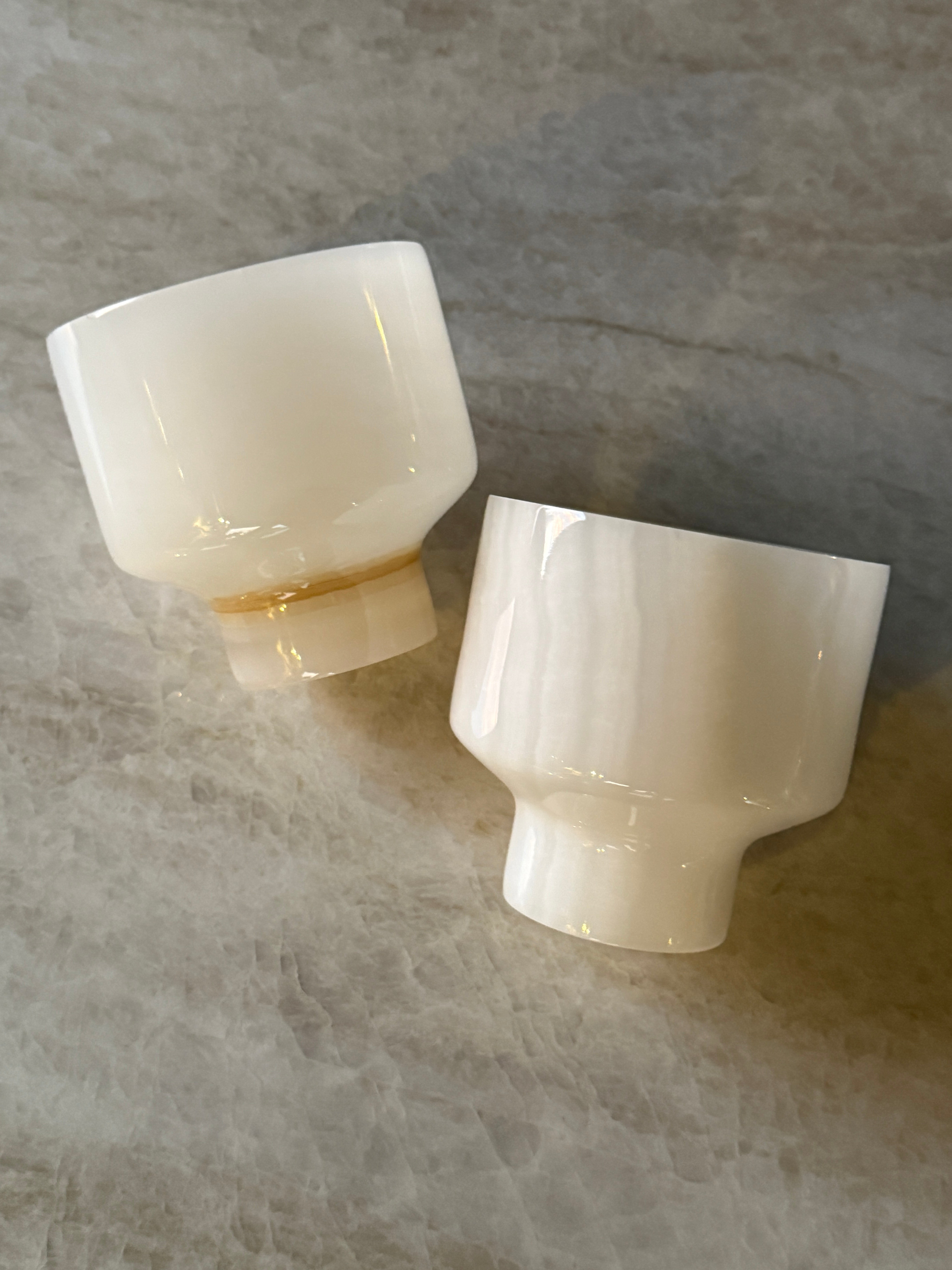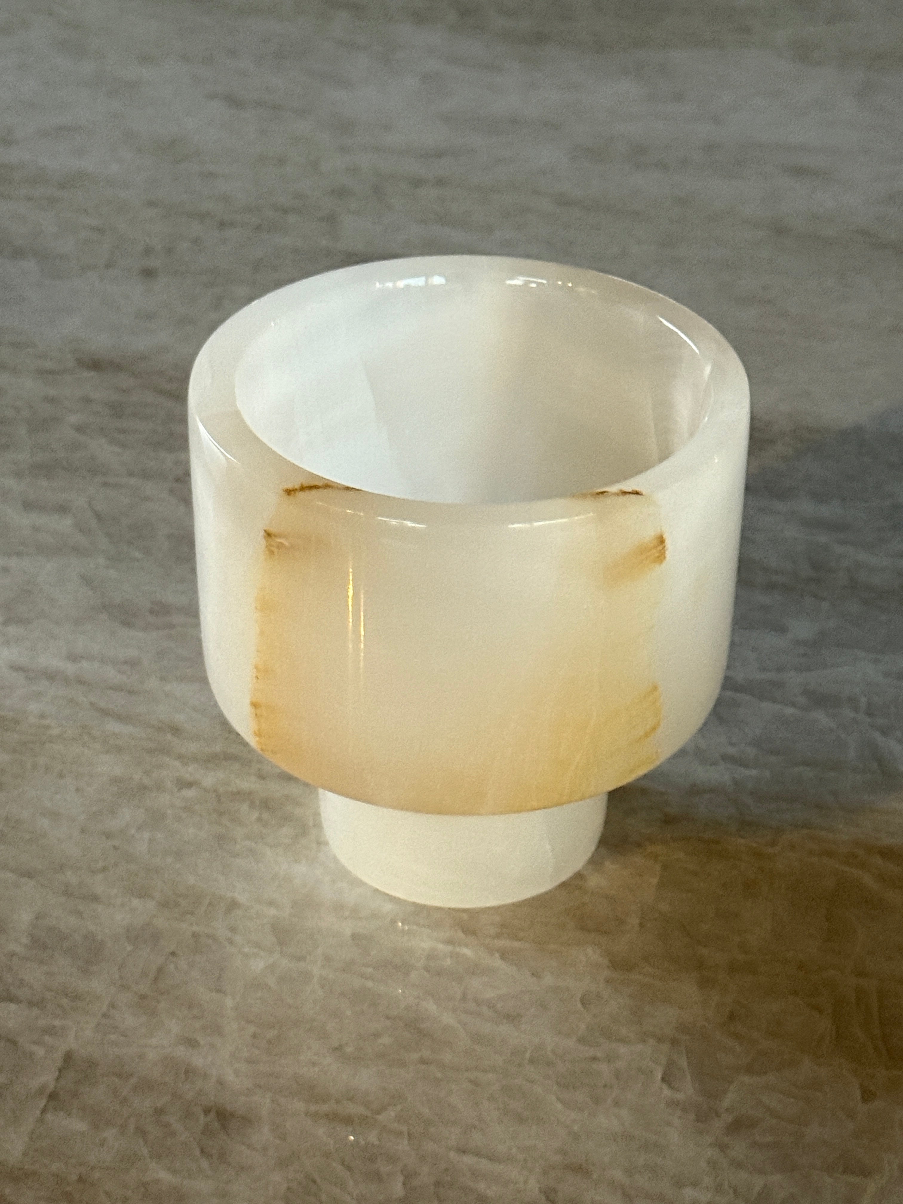 Onyx telysholder laget i ekte, polert onyx – et naturmateriale kjent for sin unike, gjennomskinnelige glød. Den solide, tunge utførelsen gir en følelse av kvalitet og eksklusivitet. Når man tenner lys i den, forvandles steinen og skaper en varm, stemningsfull atmosfære med myke nyanser og naturlige årer i steinen.