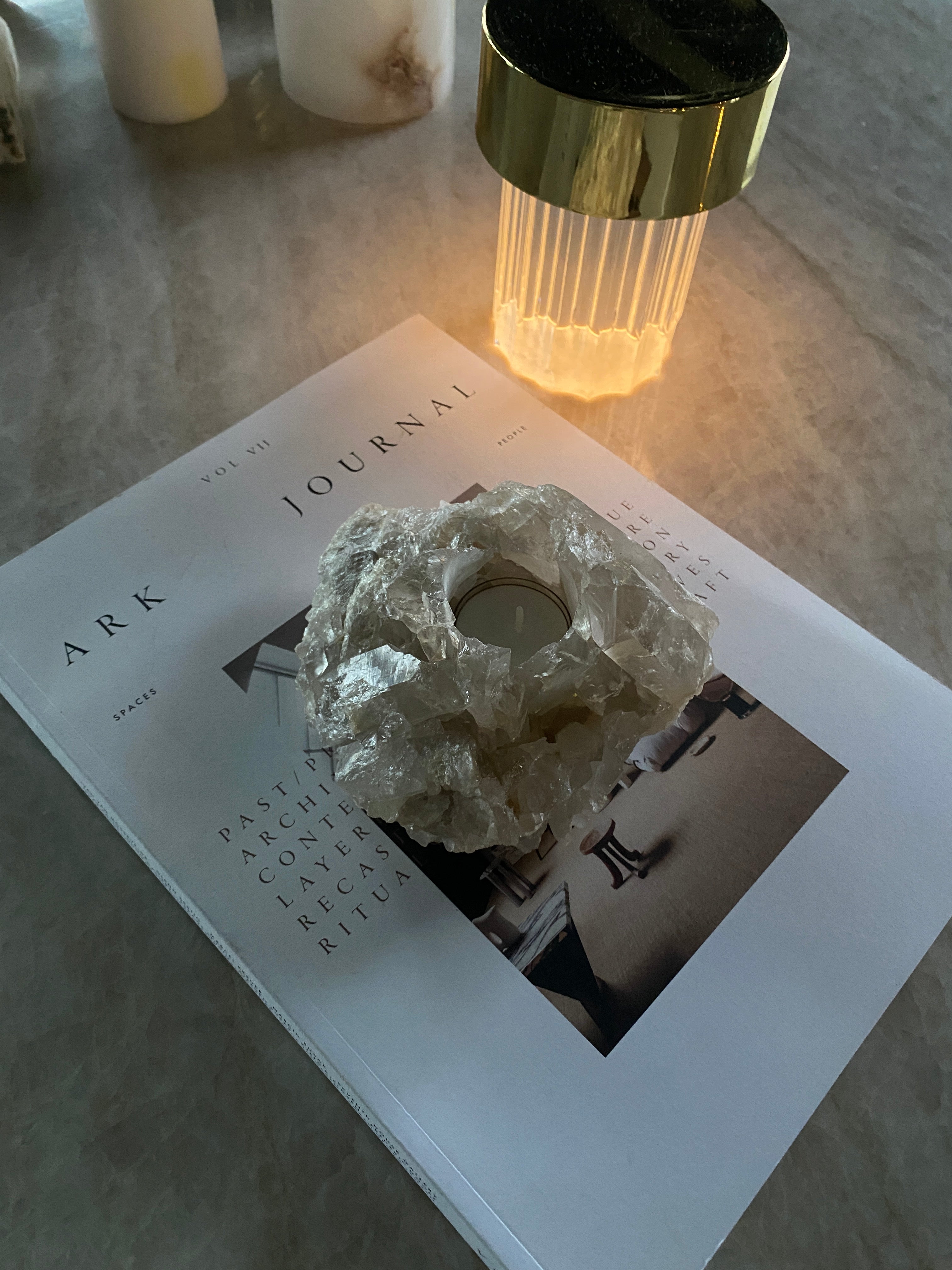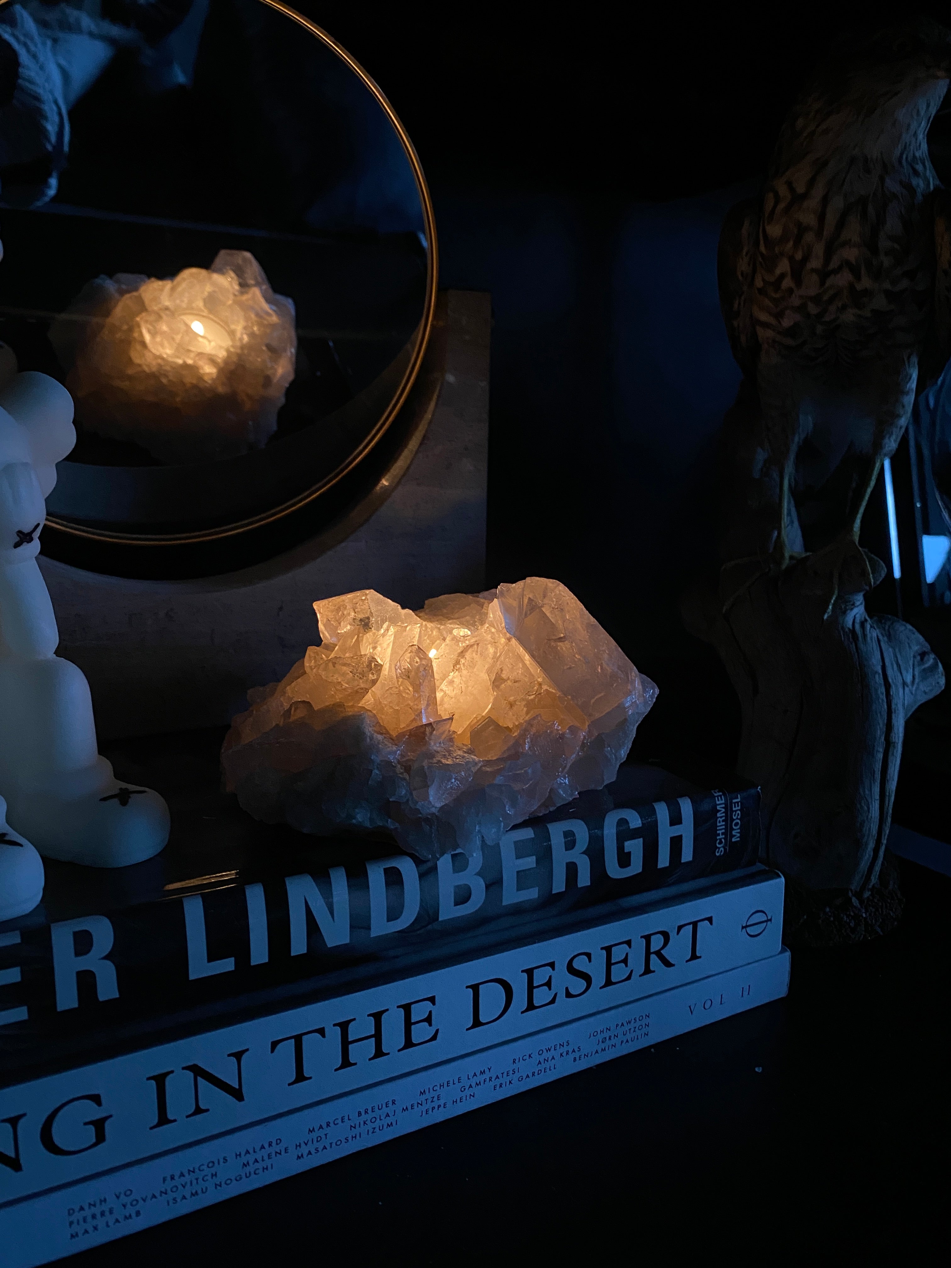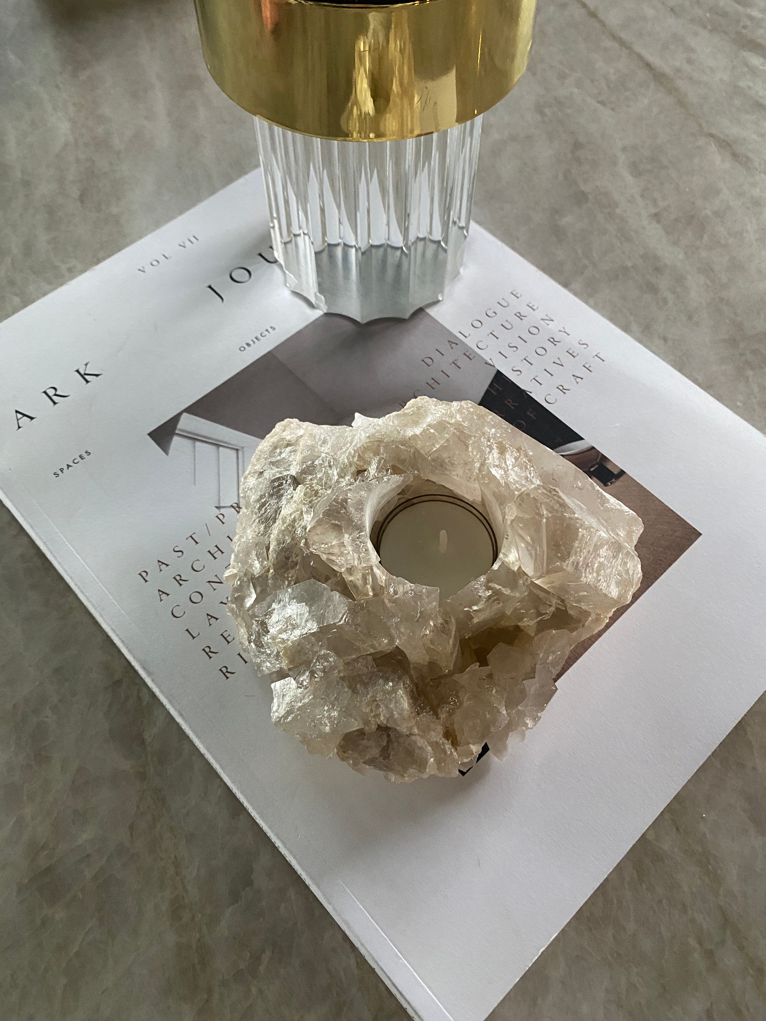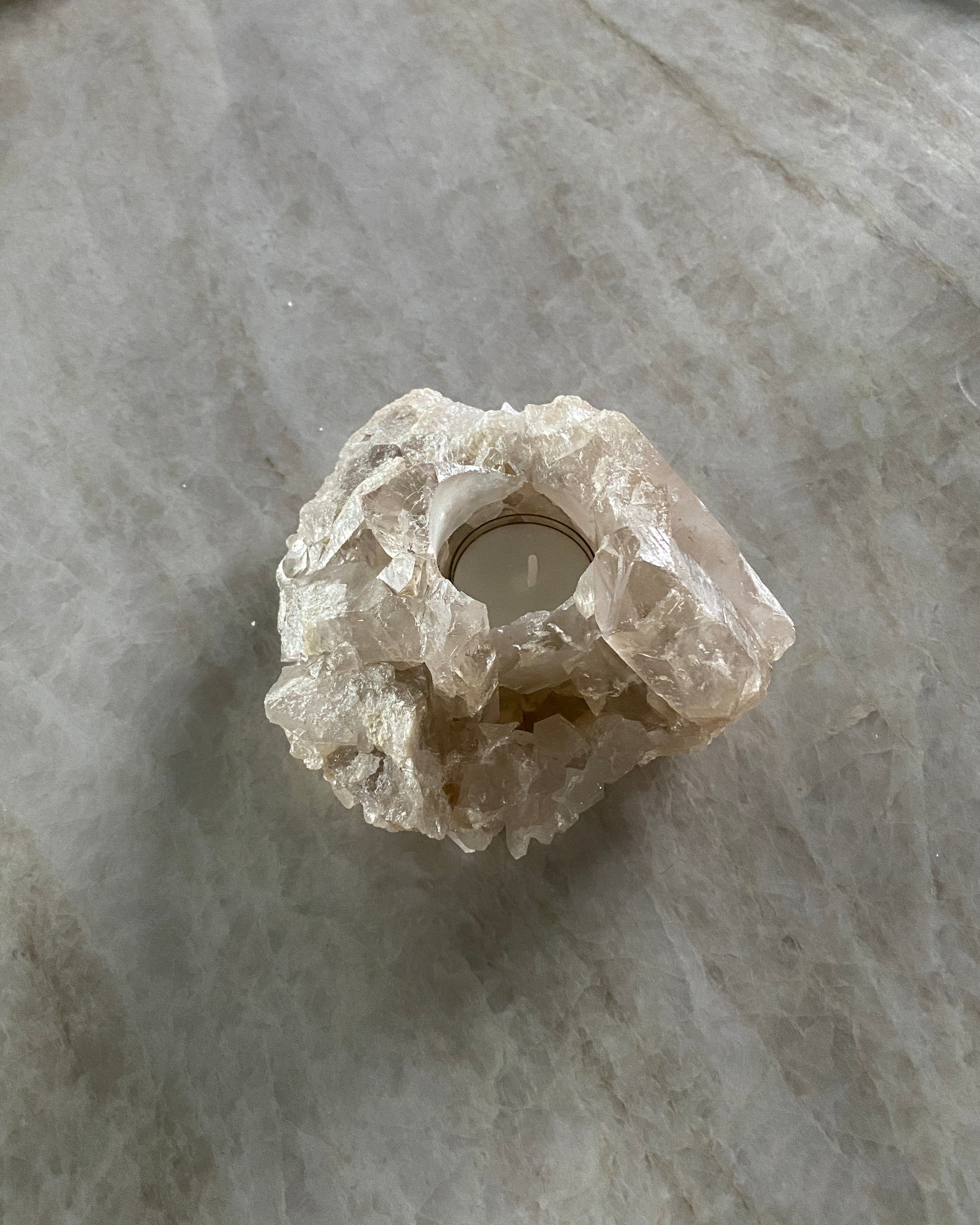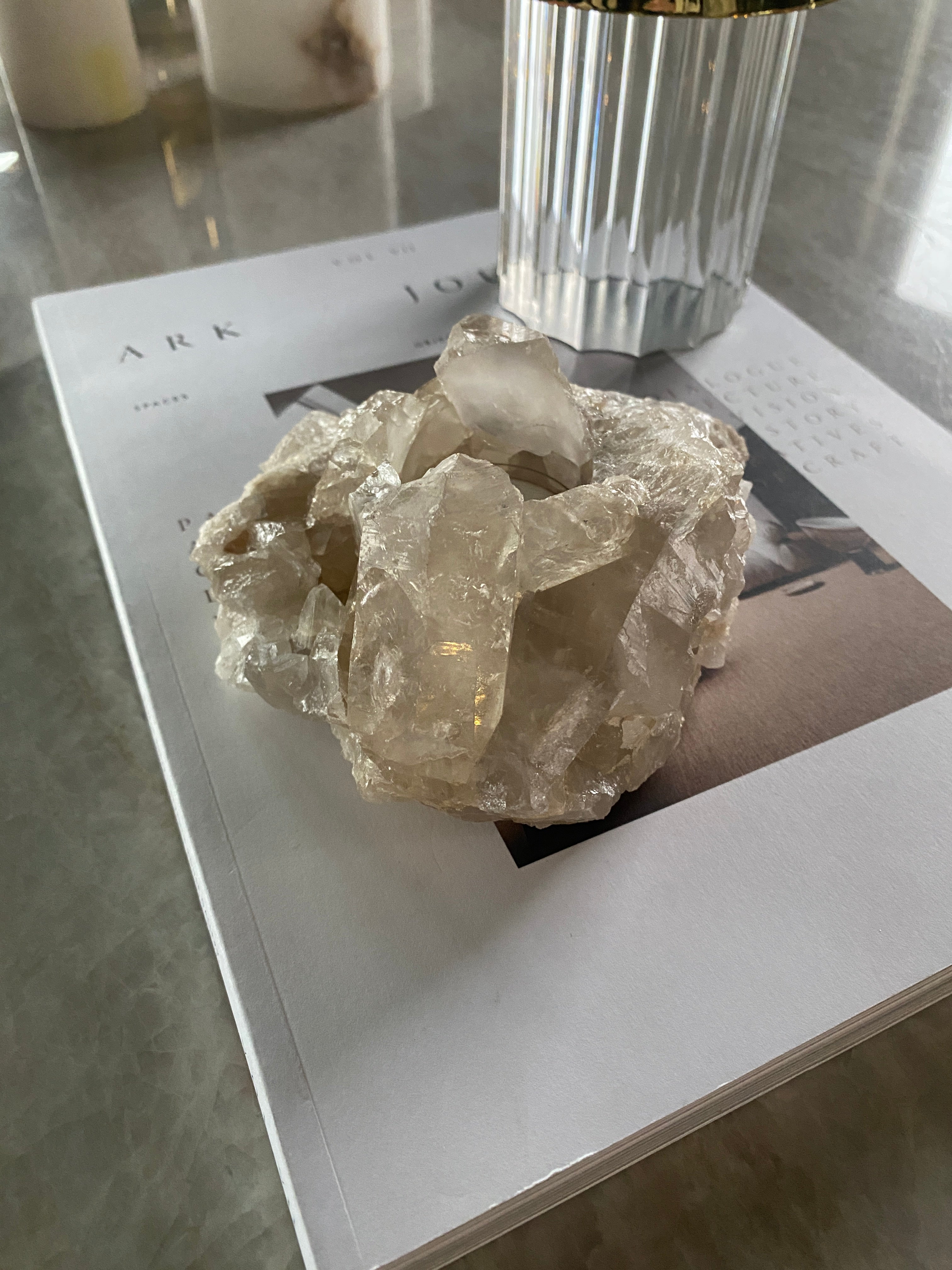 Telysholder i kvarts – et unikt naturstykke som kombinerer rå stein med mykt lys. Hver holder er håndlaget av ekte kvarts, og har sin egen form og struktur. Perfekt som dekorasjon eller som en stemningsfull detalj i hjemmet.