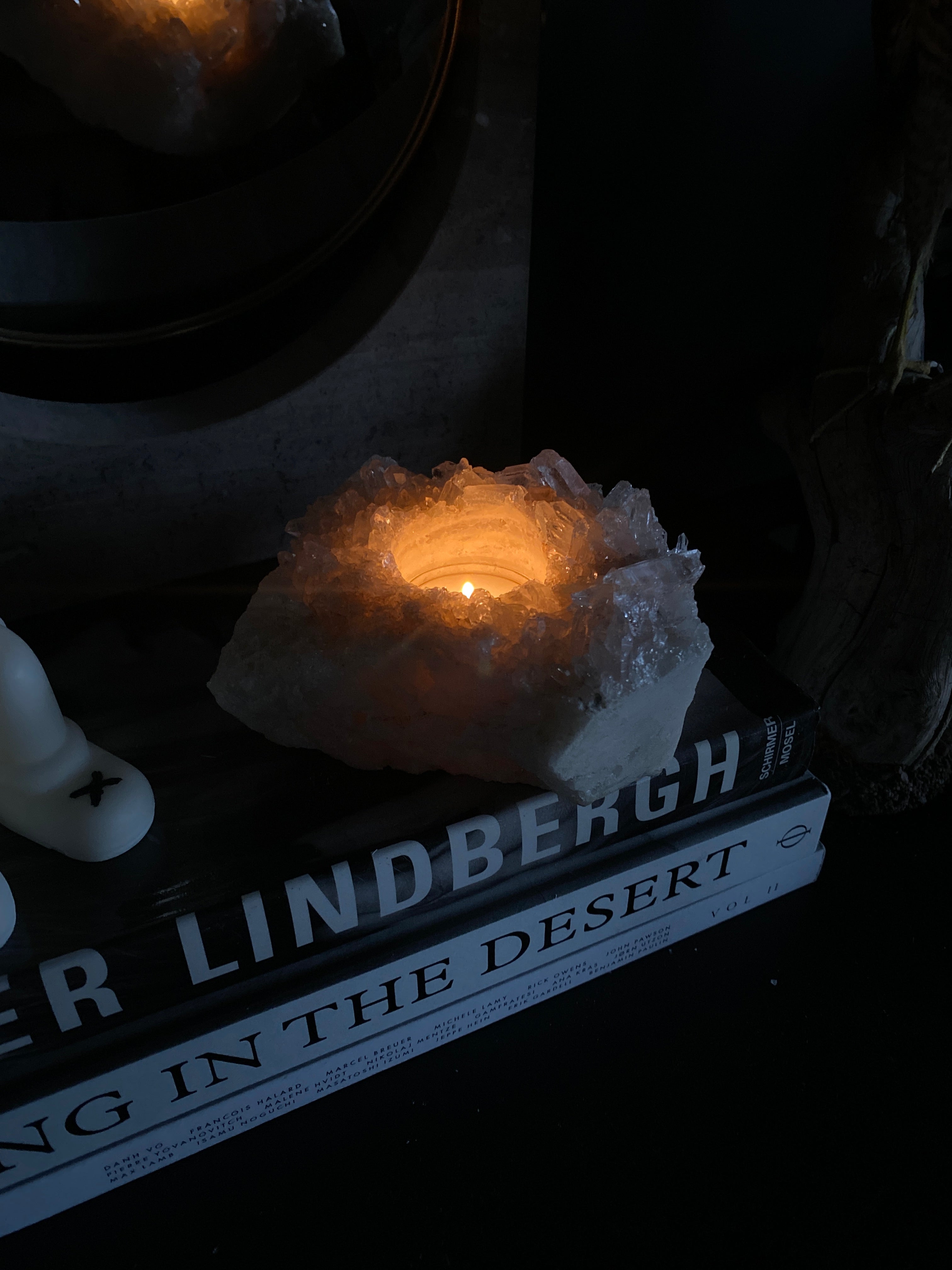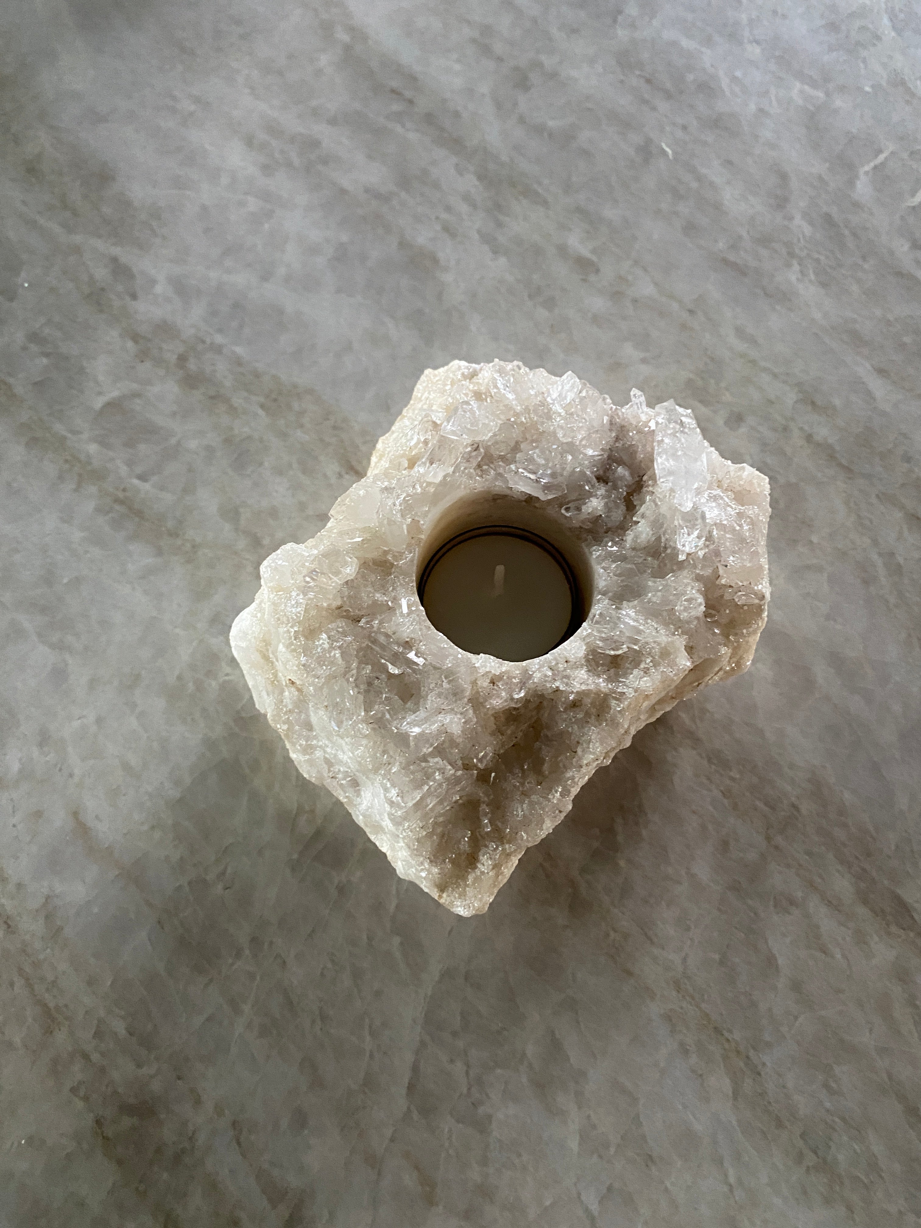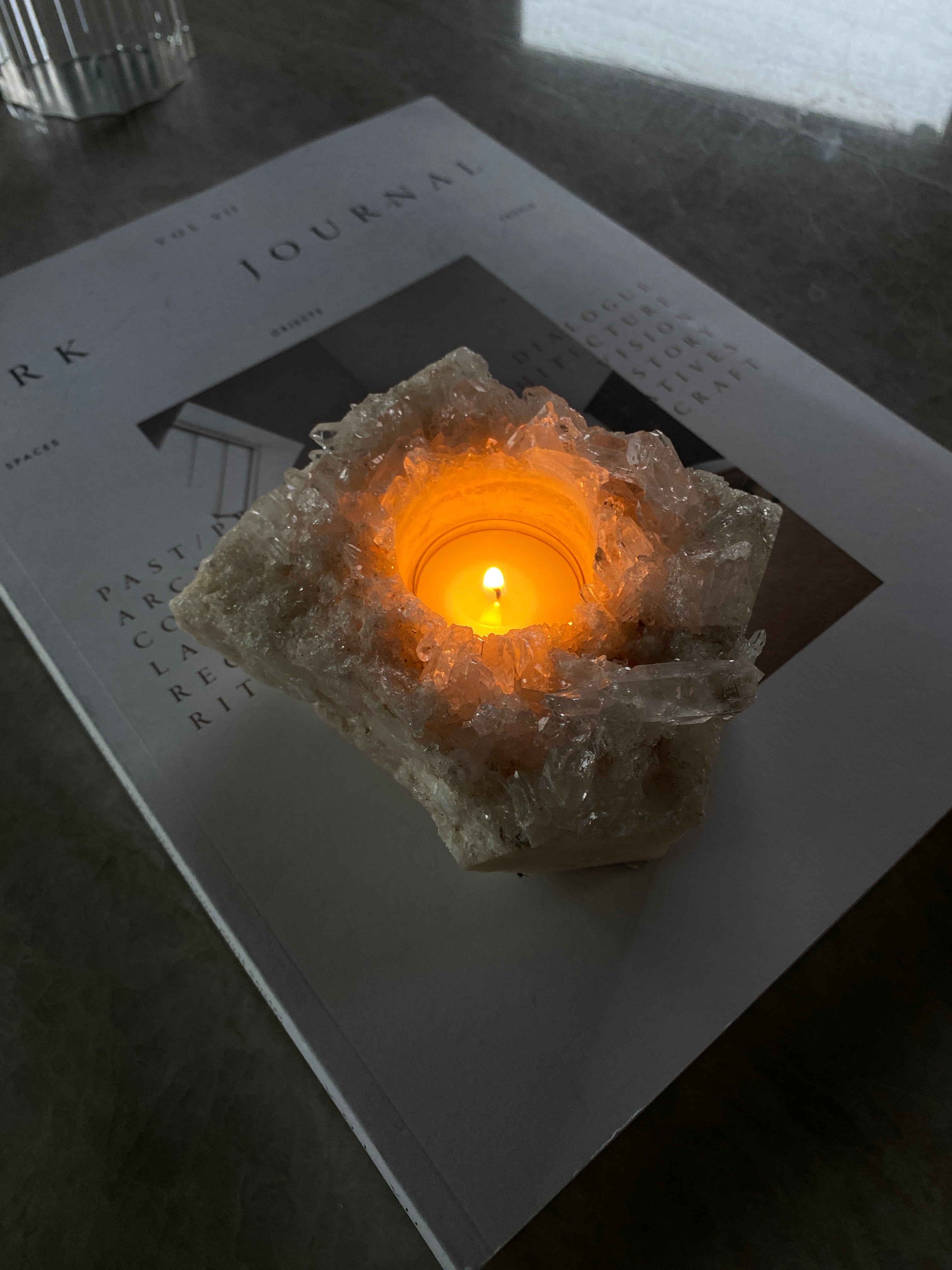 Telysholder i kvarts – et unikt naturstykke som kombinerer rå stein med mykt lys. Hver holder er håndlaget av ekte kvarts, og har sin egen form og struktur. Perfekt som dekorasjon eller som en stemningsfull detalj i hjemmet.