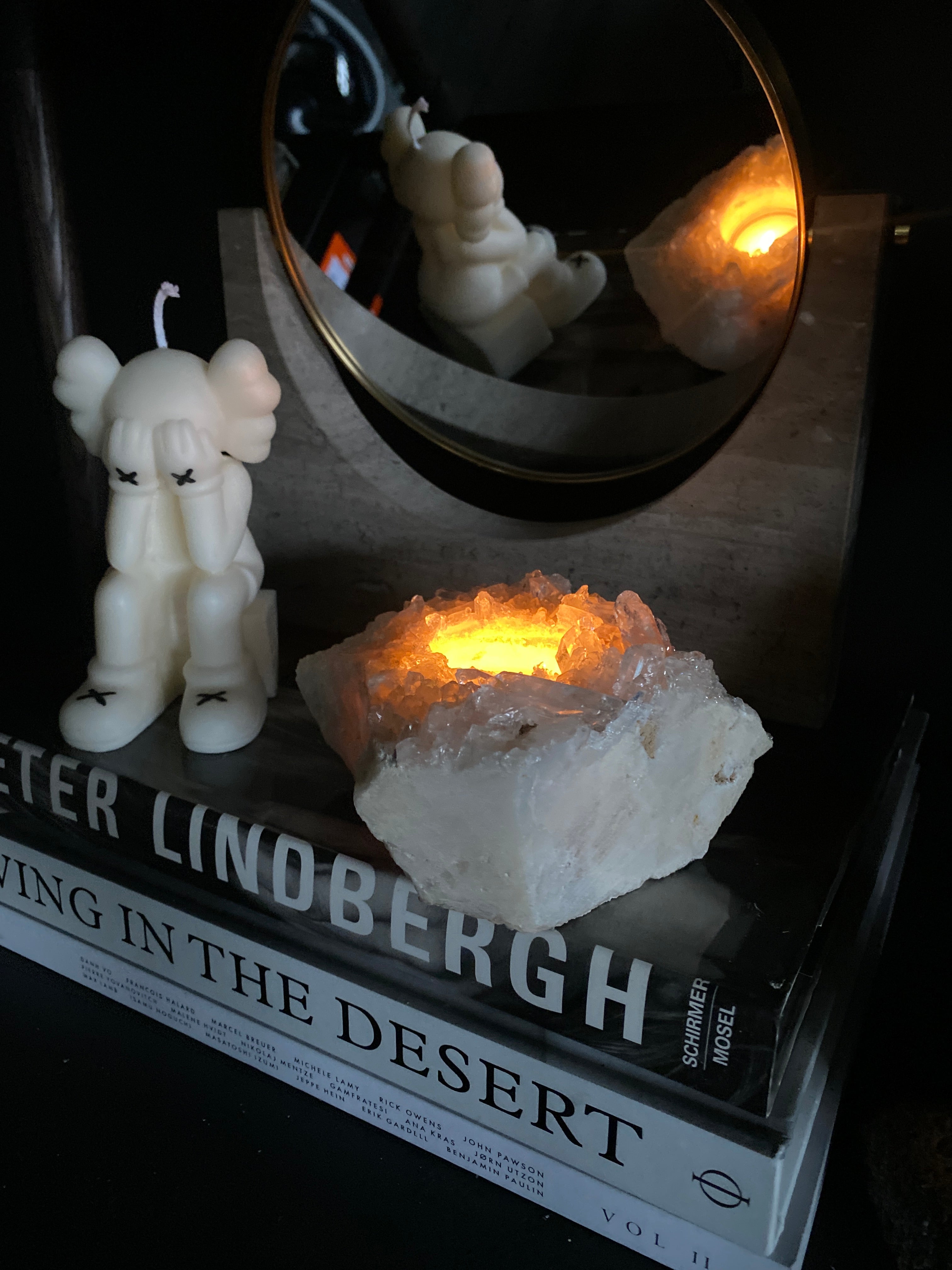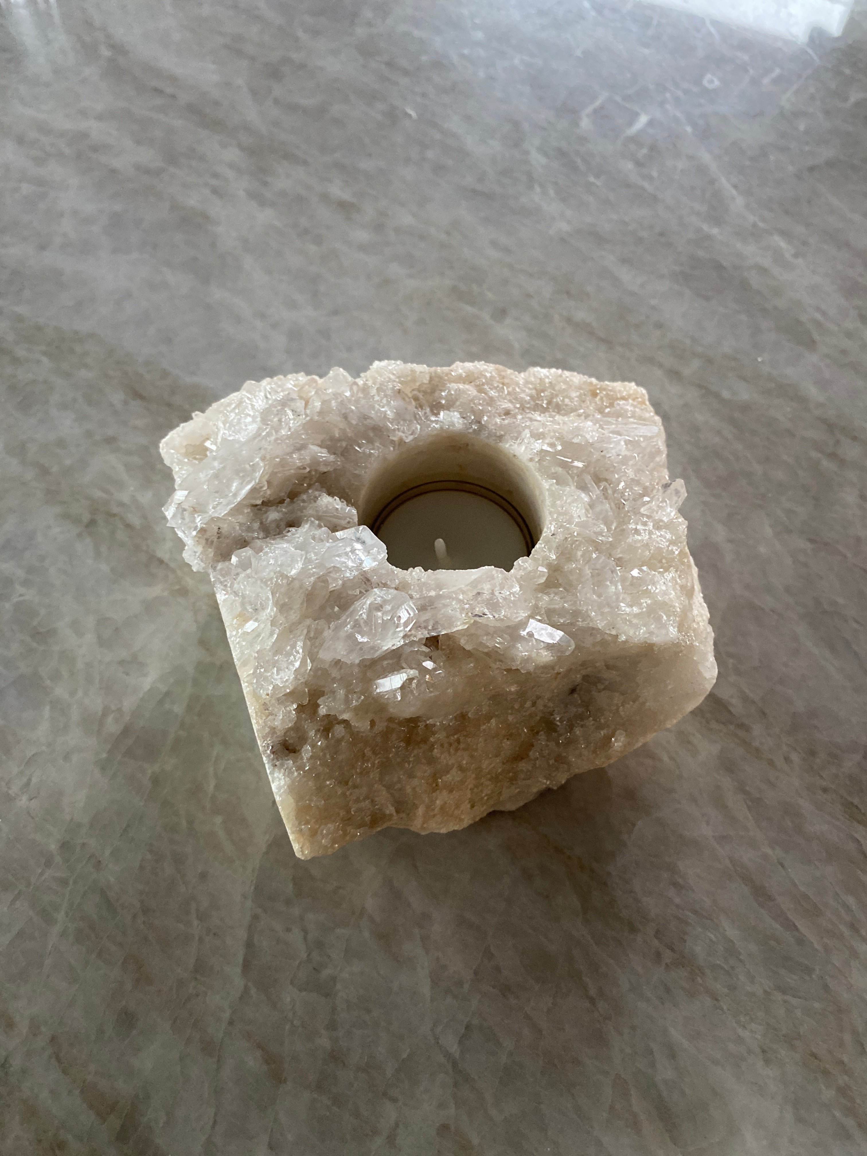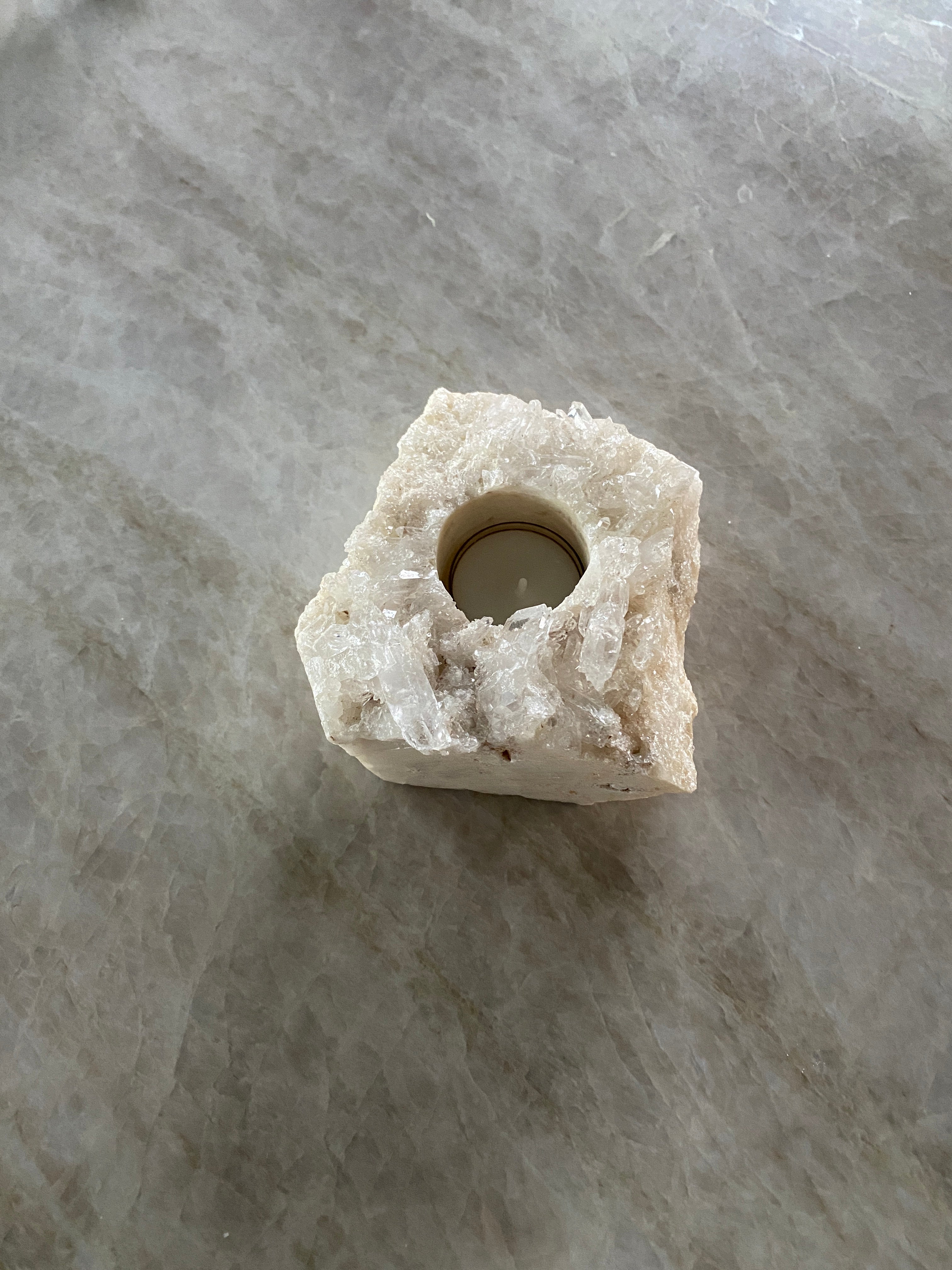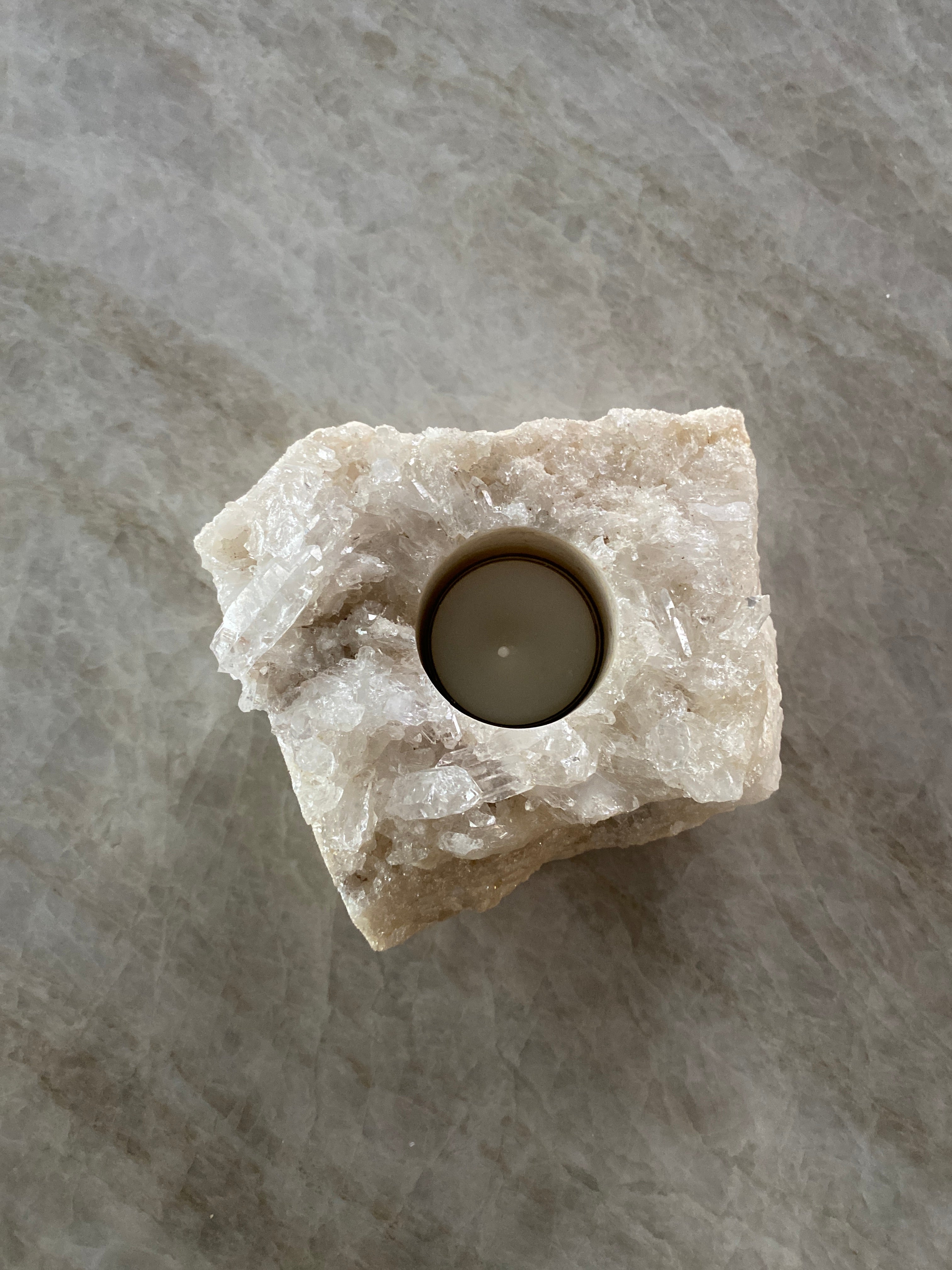 Telysholder i kvarts – et unikt naturstykke som kombinerer rå stein med mykt lys. Hver holder er håndlaget av ekte kvarts, og har sin egen form og struktur. Perfekt som dekorasjon eller som en stemningsfull detalj i hjemmet.