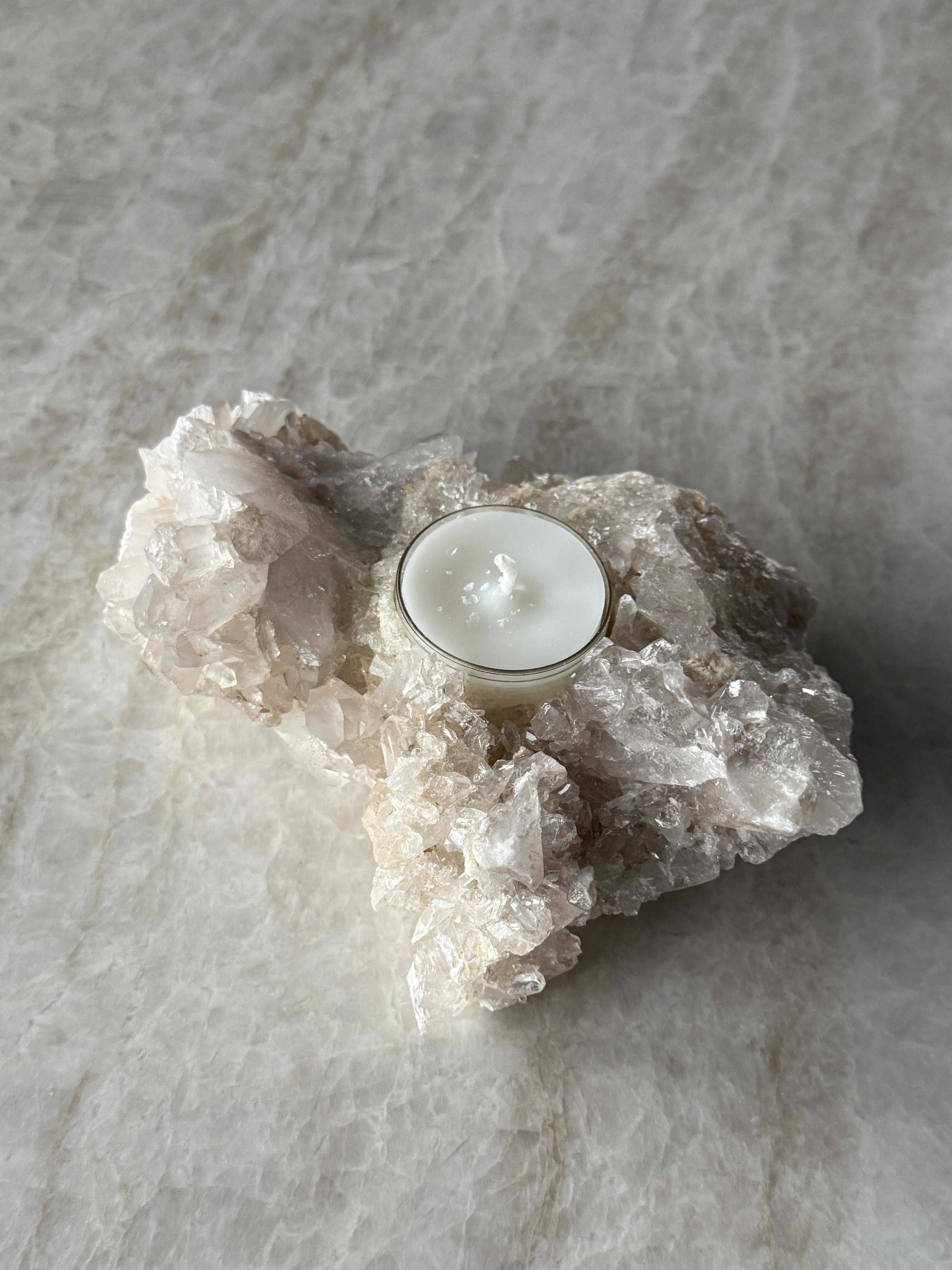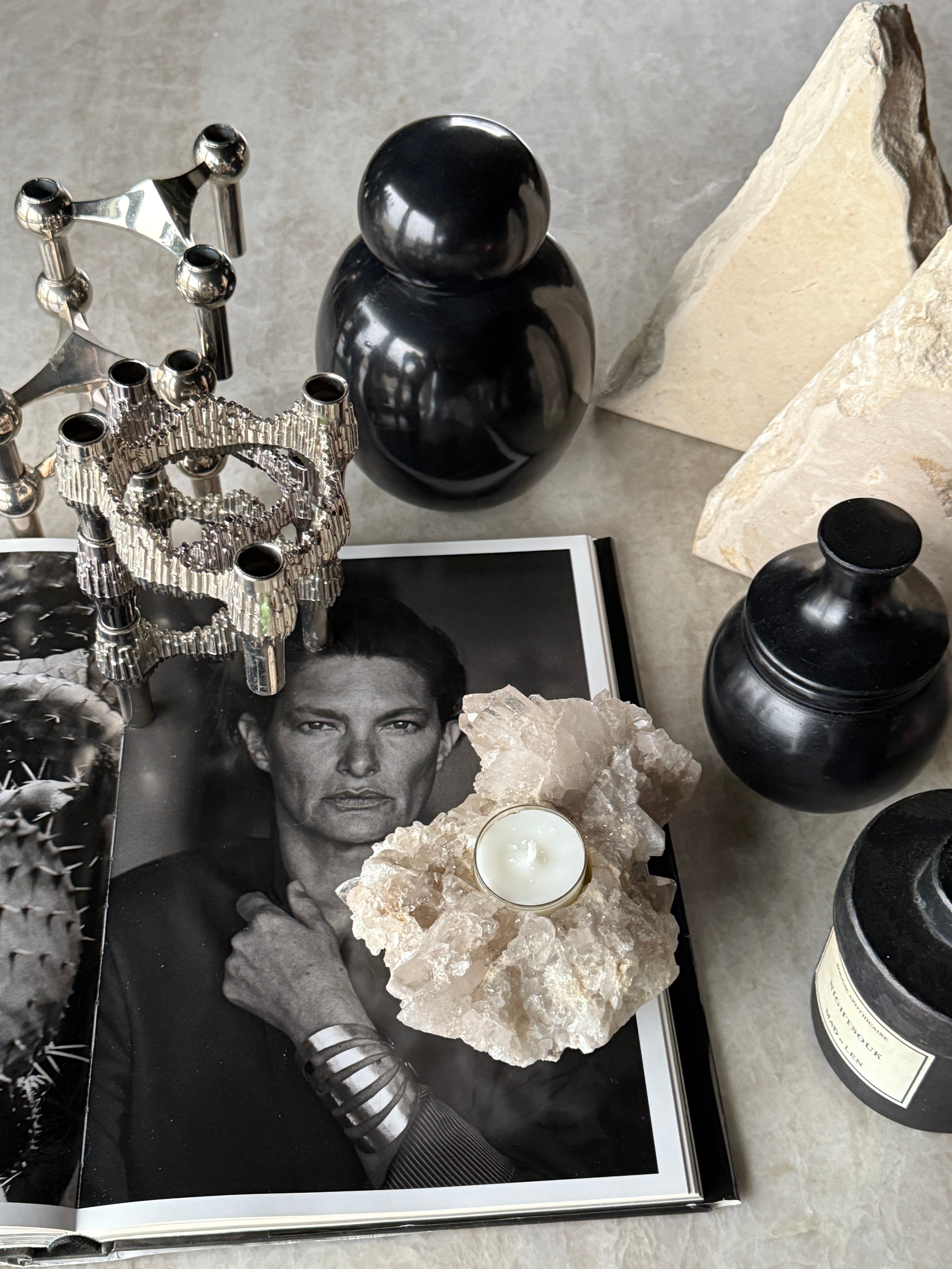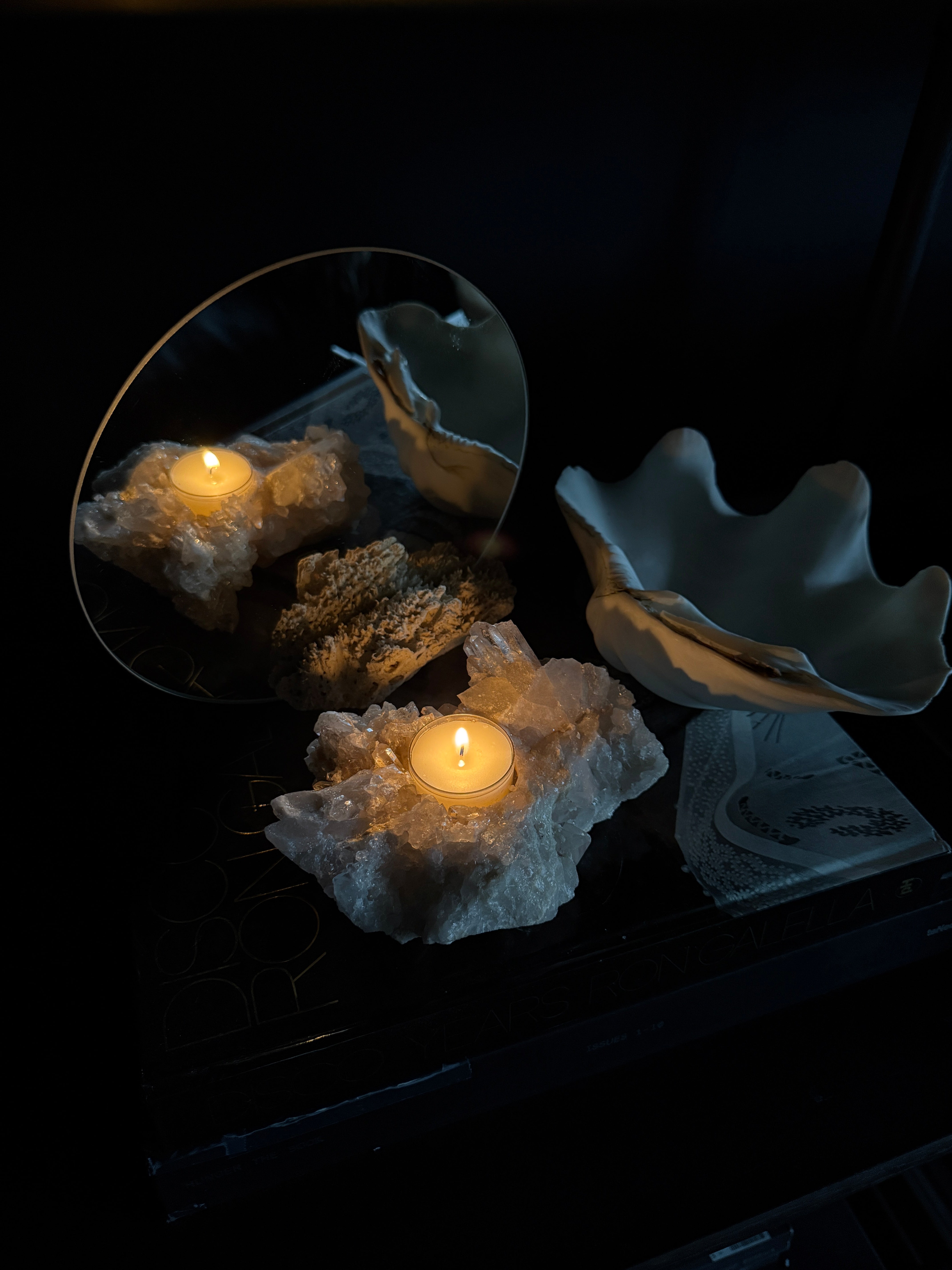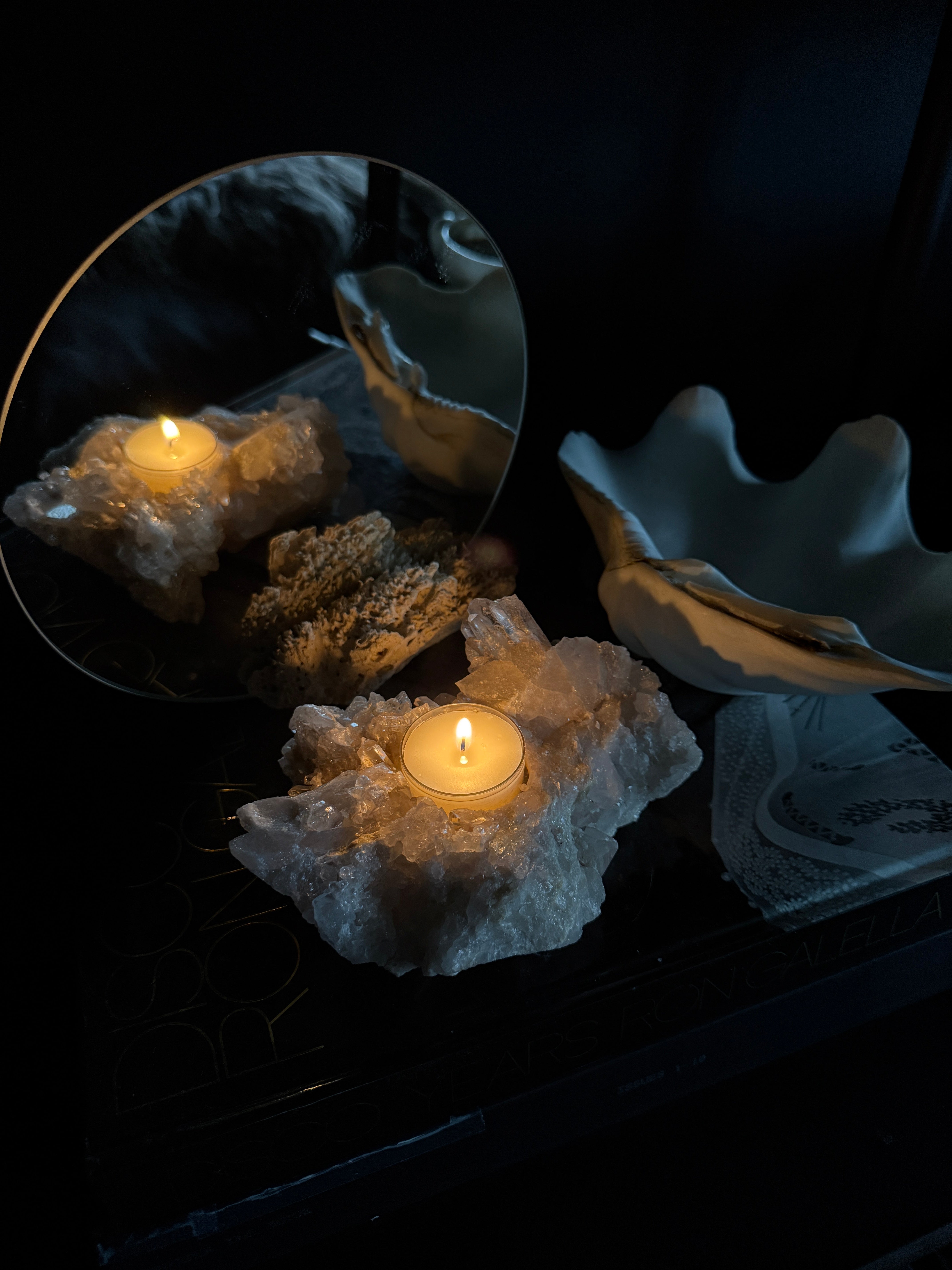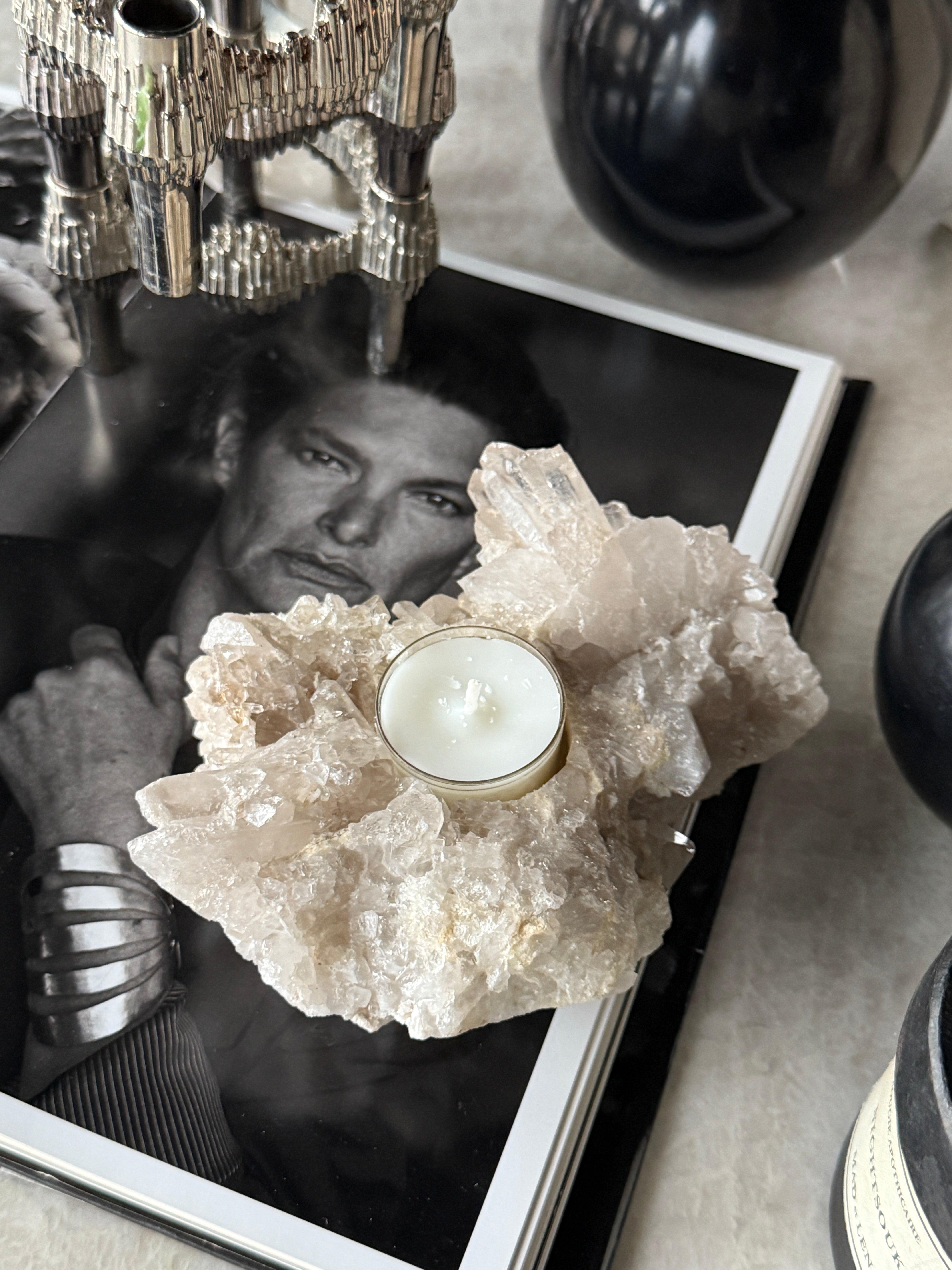 Telysholder i kvarts – et unikt naturstykke som kombinerer rå stein med mykt lys. Hver holder er håndlaget av ekte kvarts, og har sin egen form og struktur. Perfekt som dekorasjon eller som en stemningsfull detalj i hjemmet.