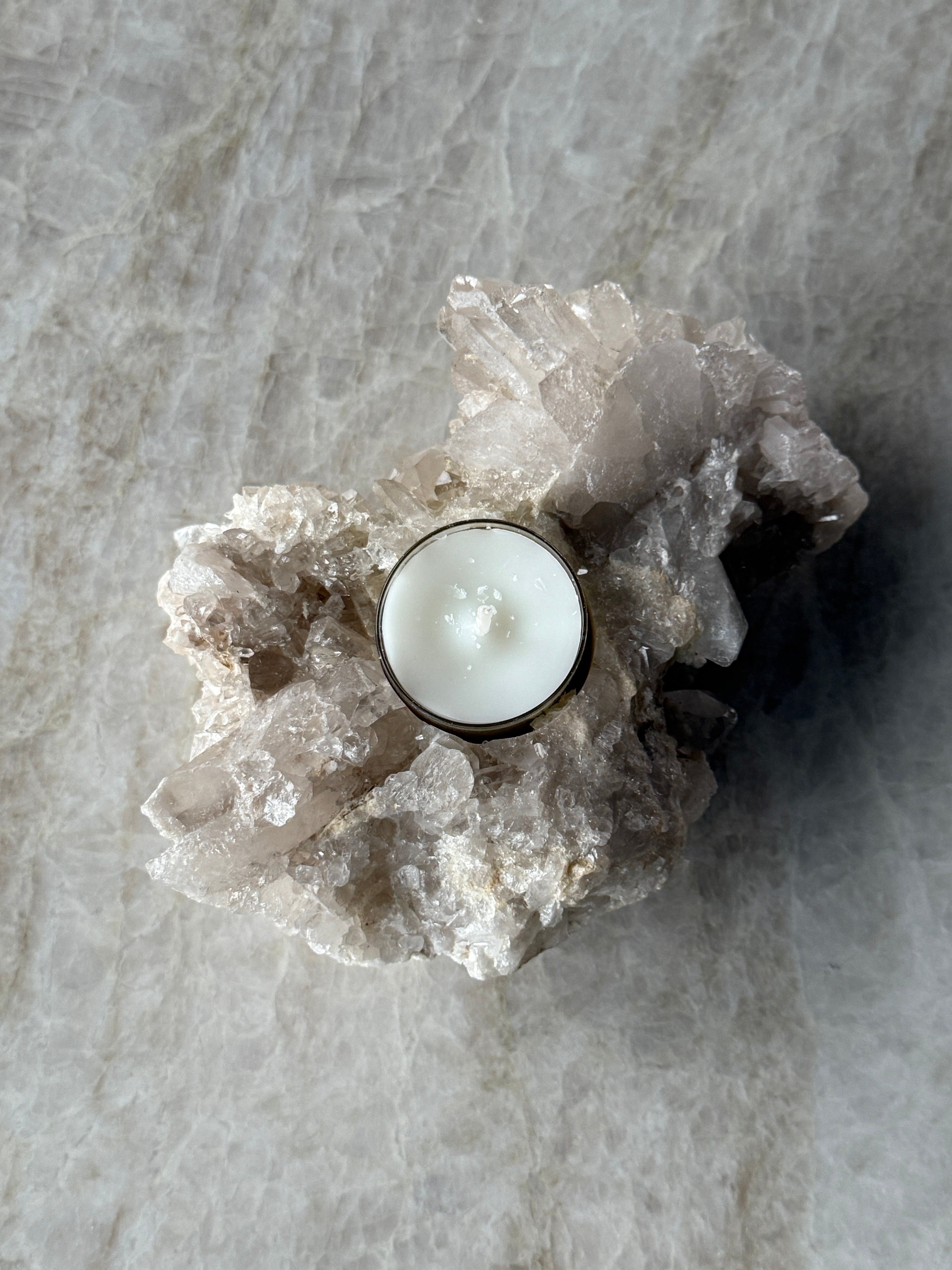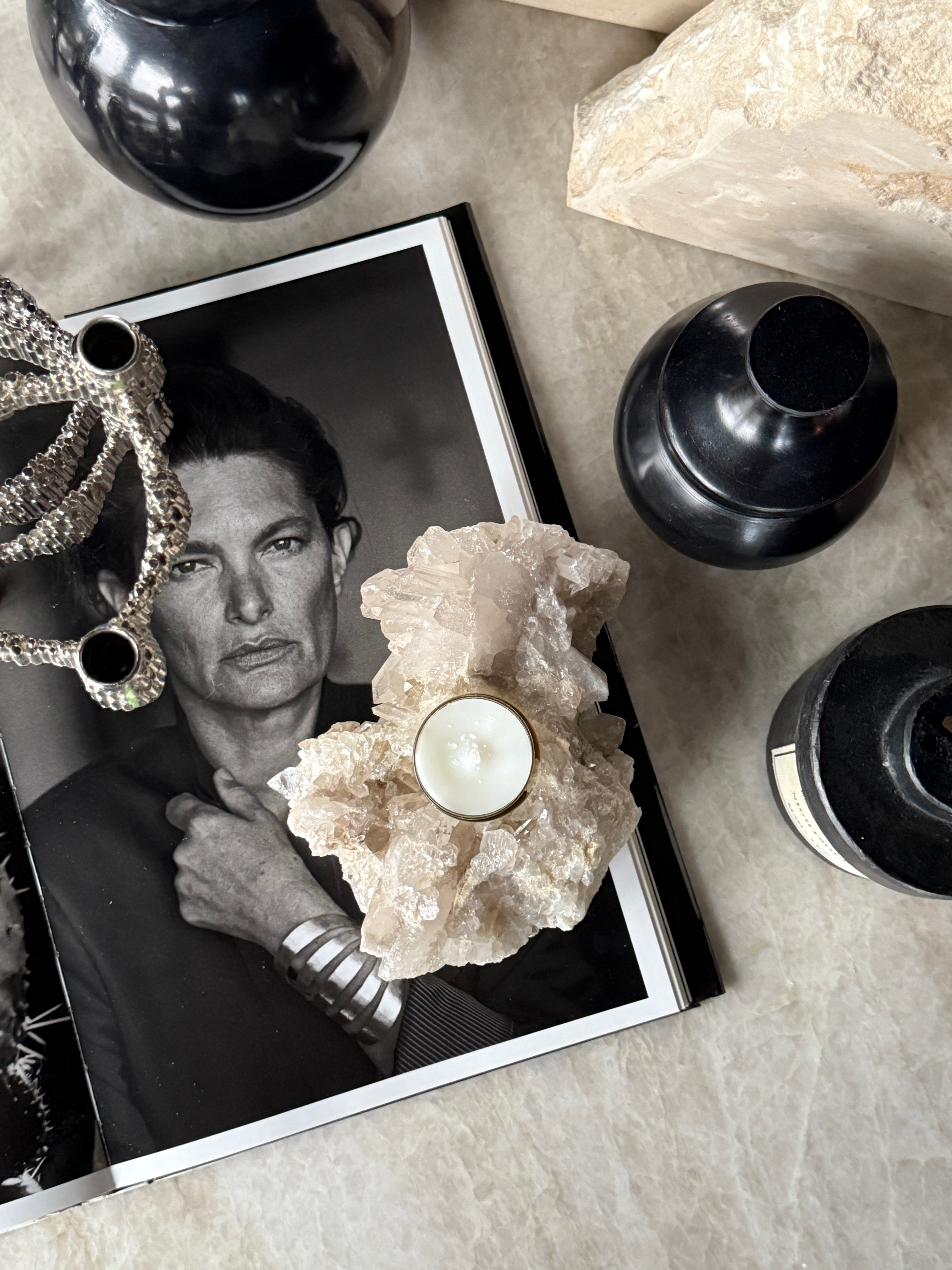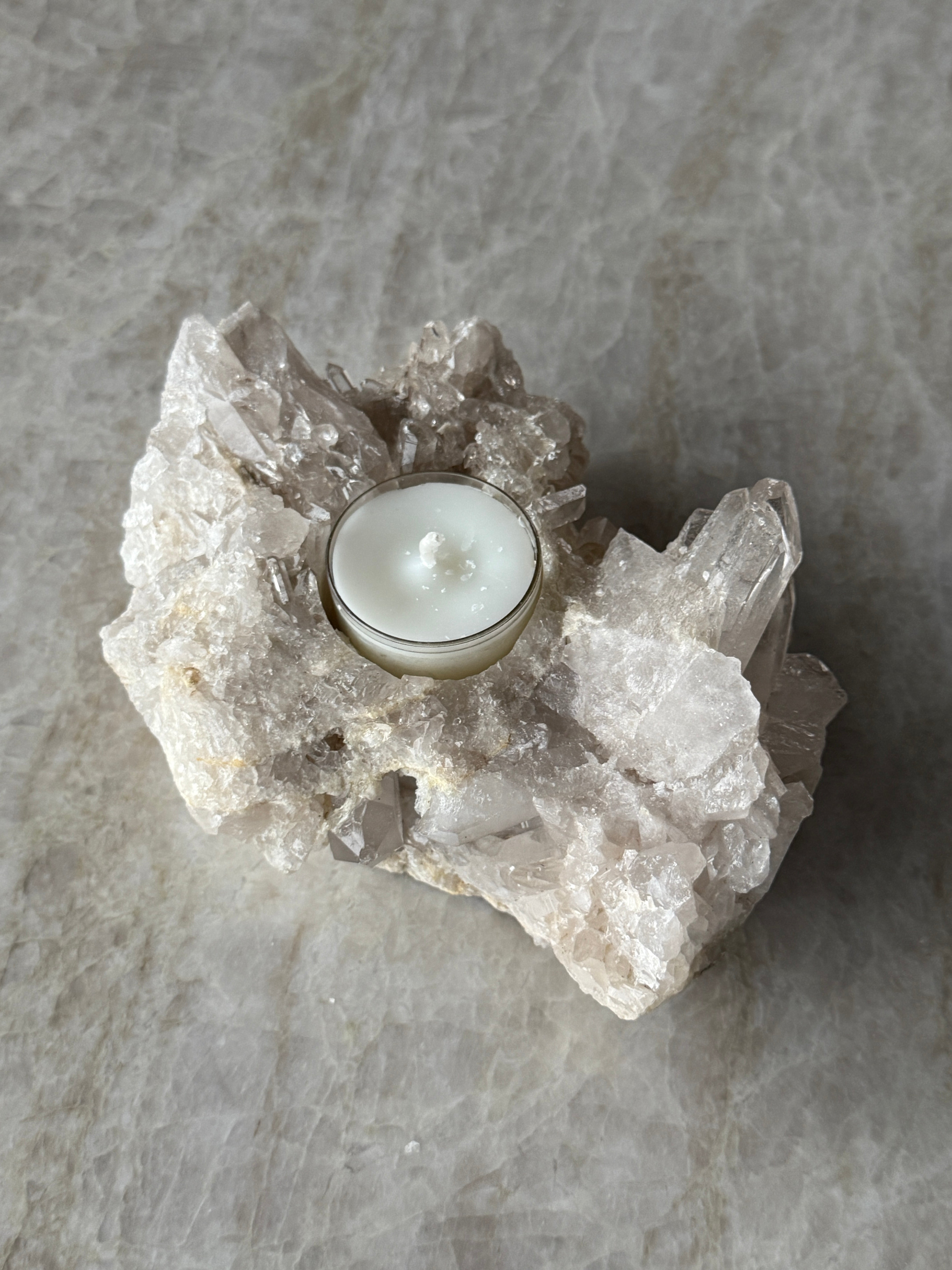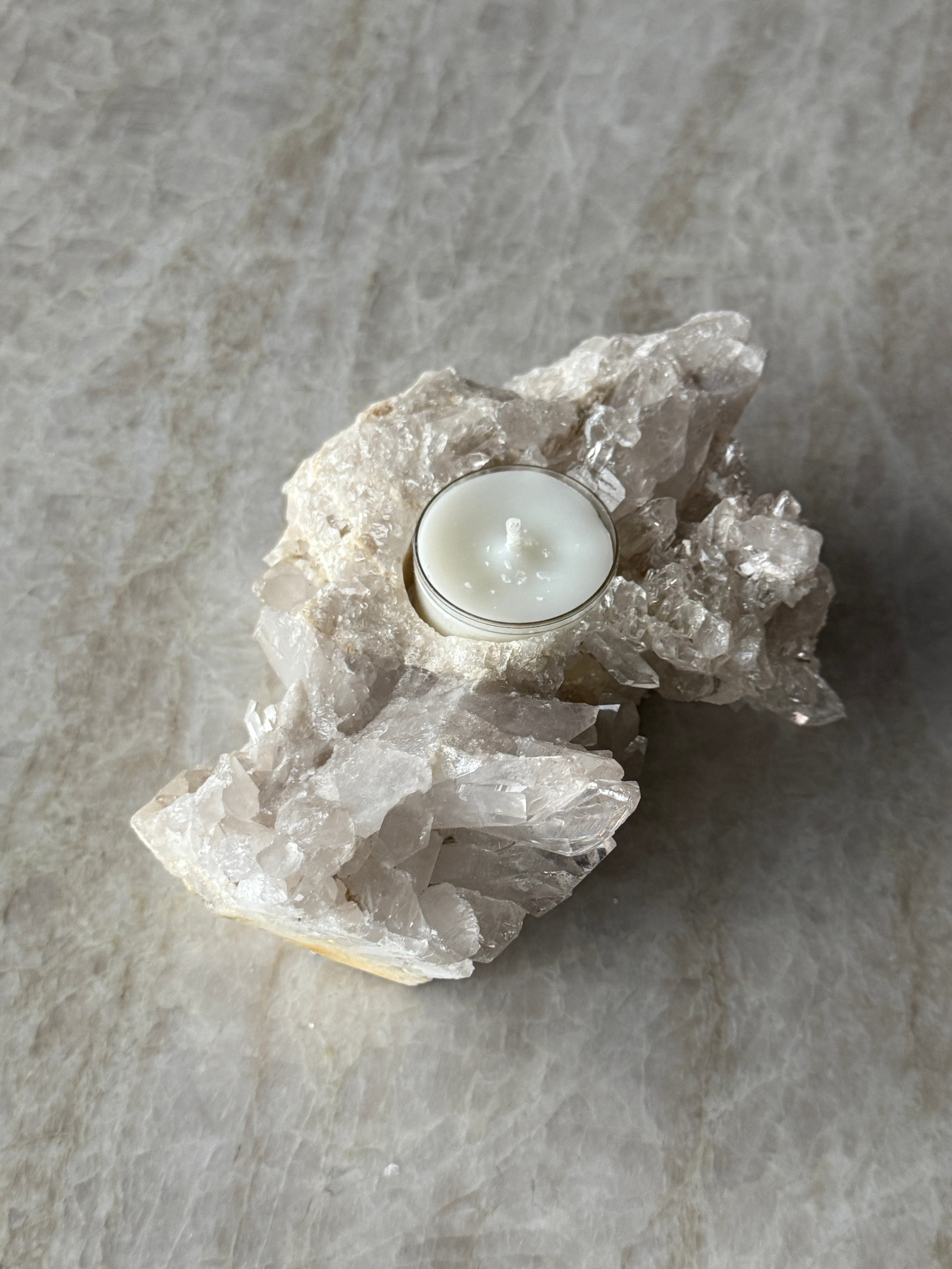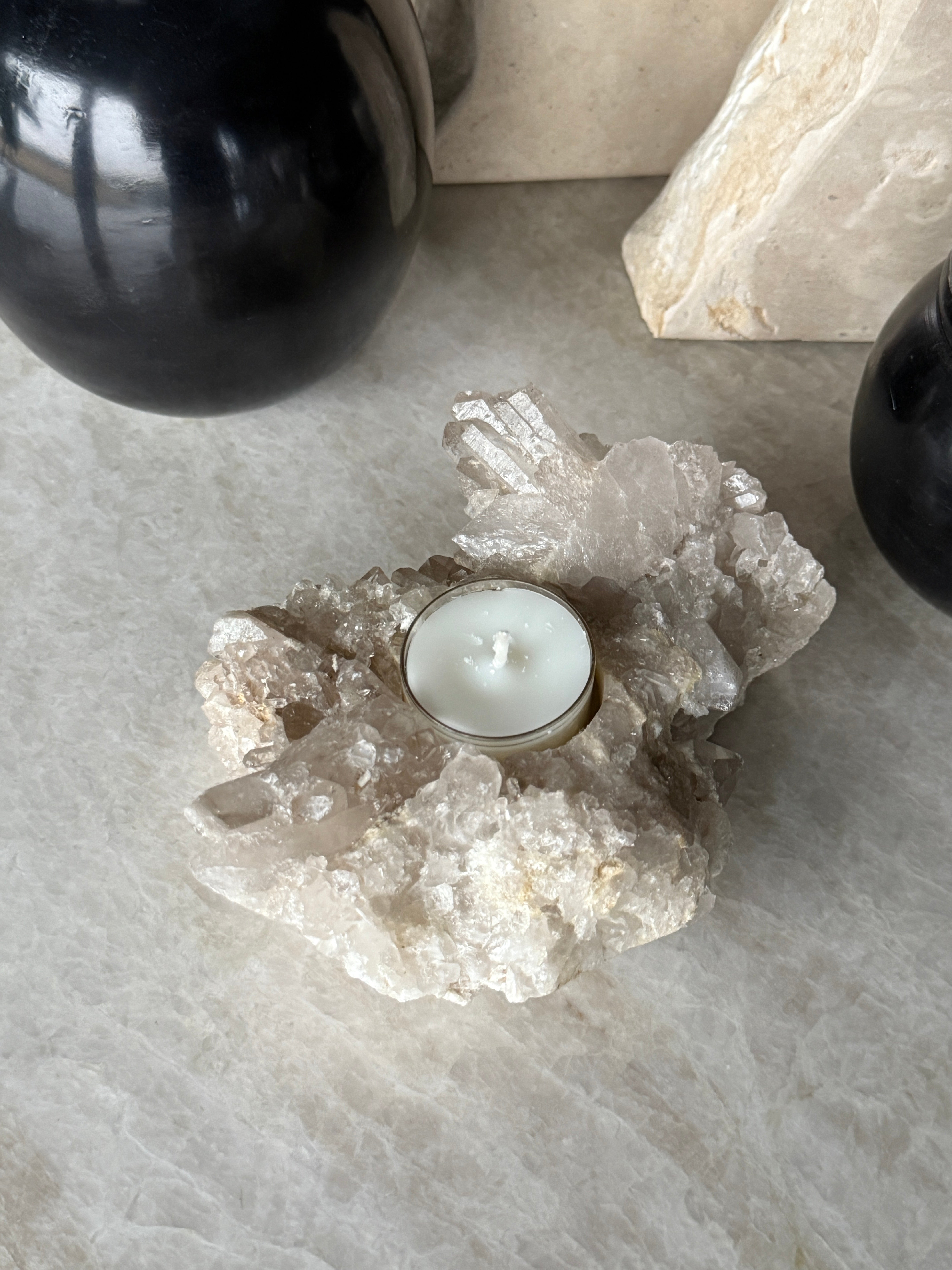 Telysholder i kvarts – et unikt naturstykke som kombinerer rå stein med mykt lys. Hver holder er håndlaget av ekte kvarts, og har sin egen form og struktur. Perfekt som dekorasjon eller som en stemningsfull detalj i hjemmet.