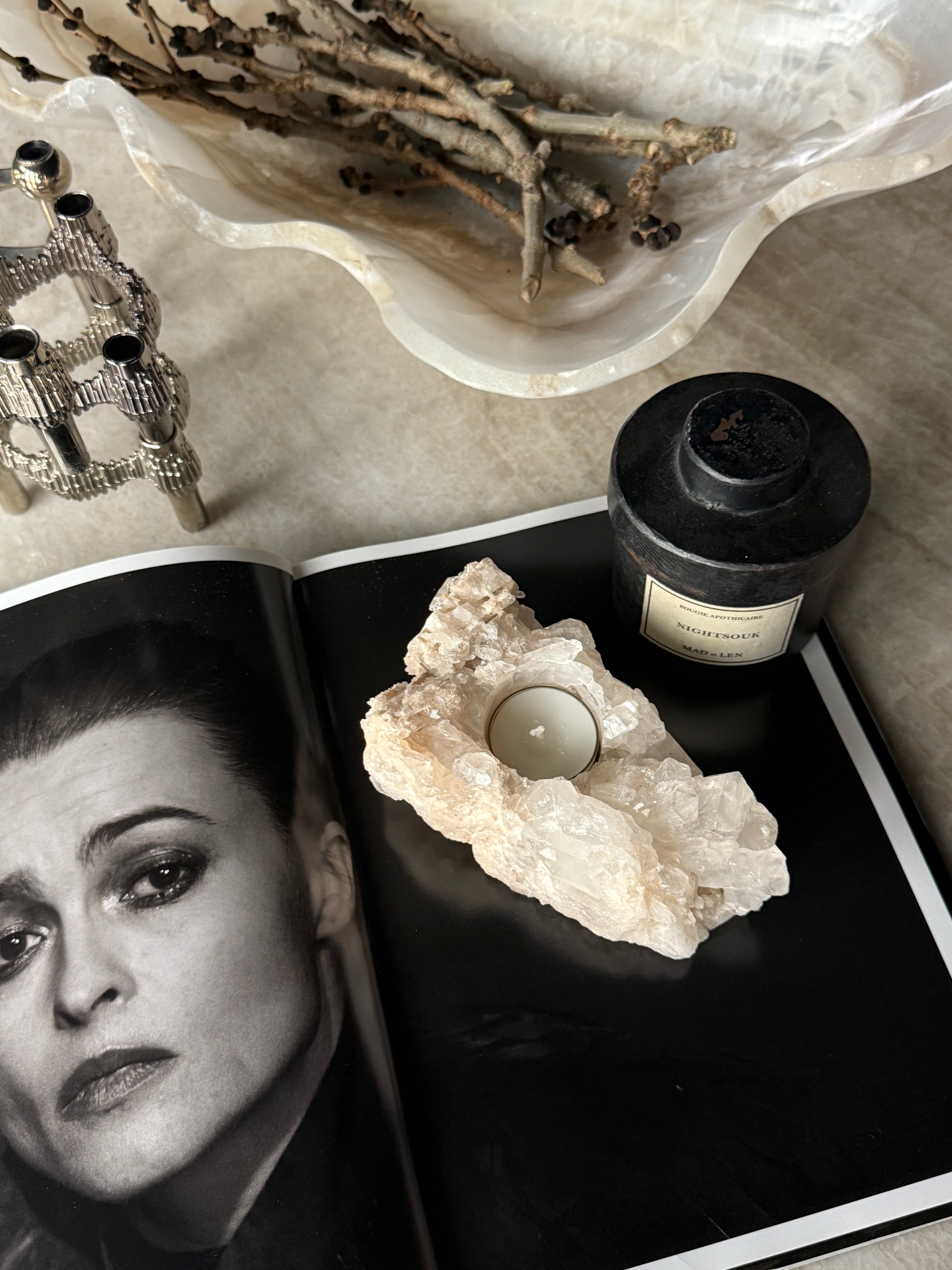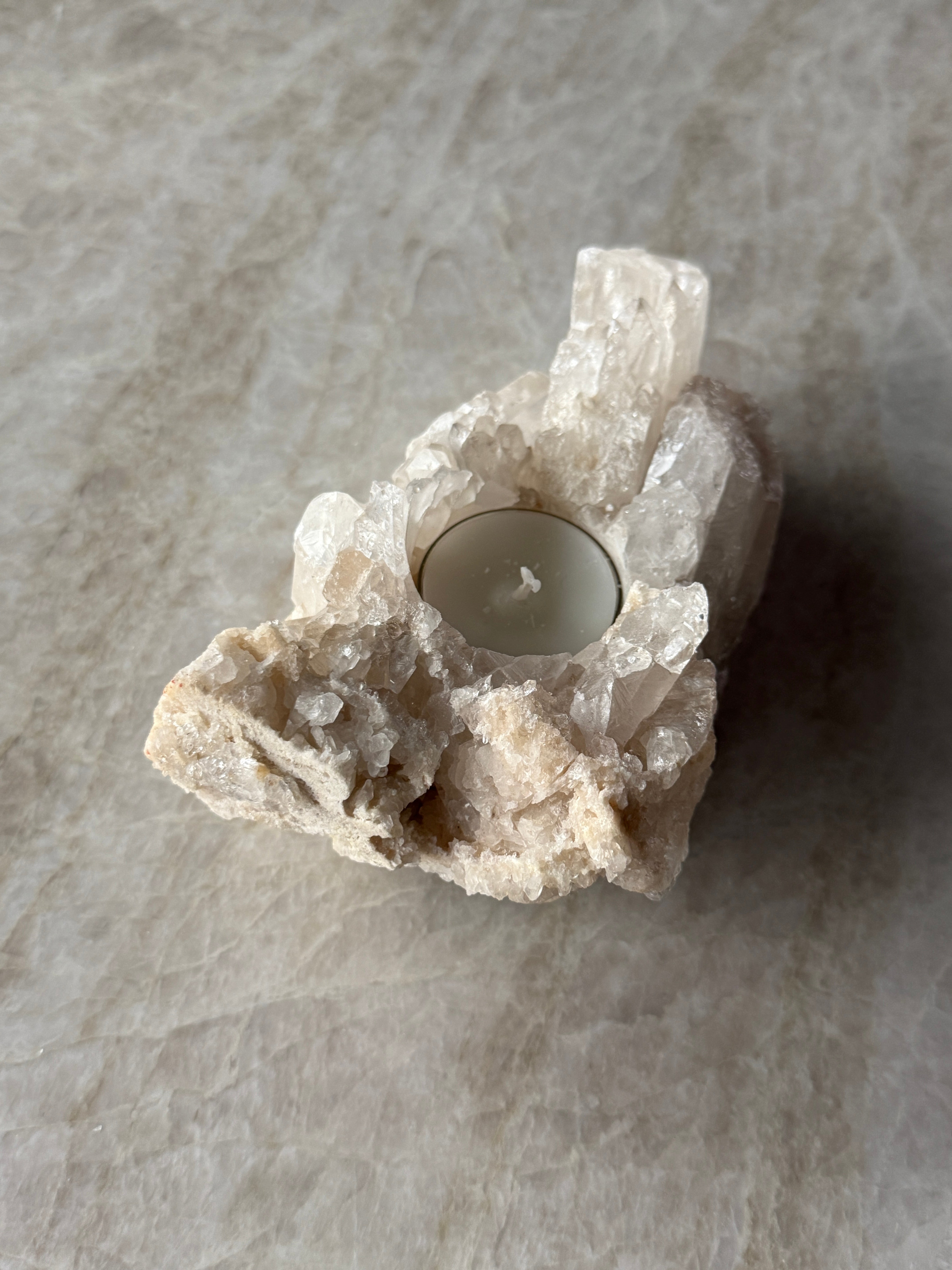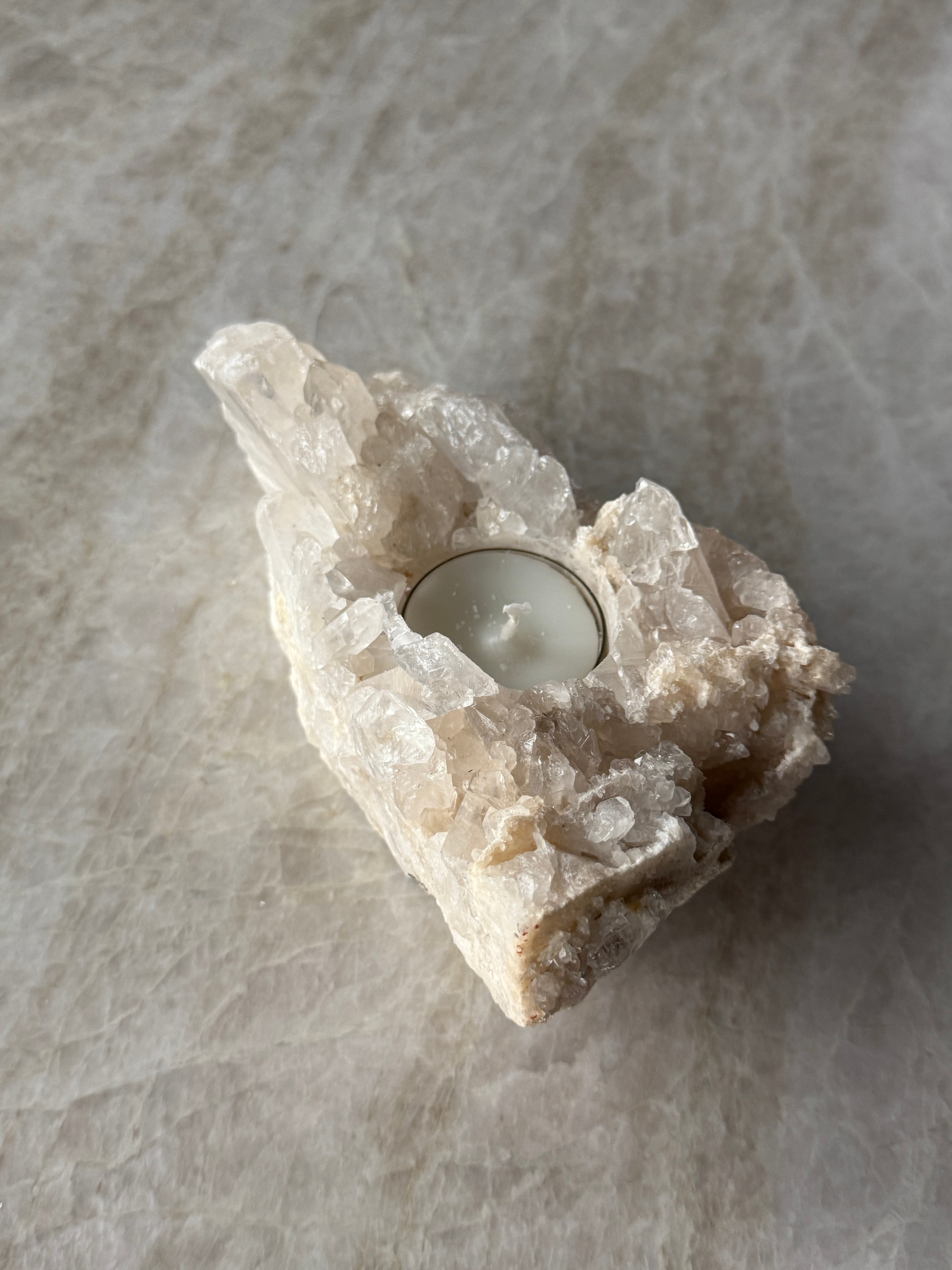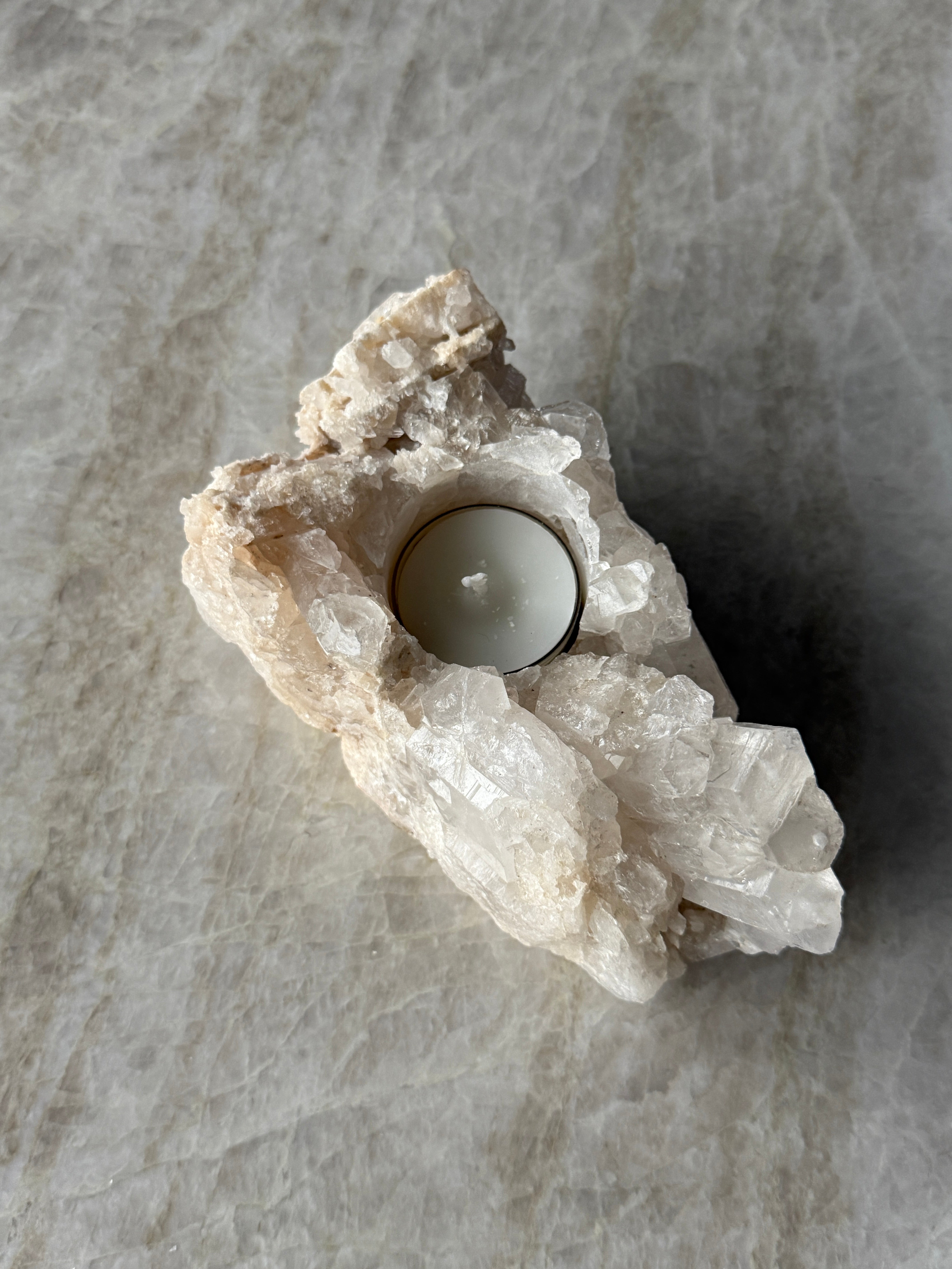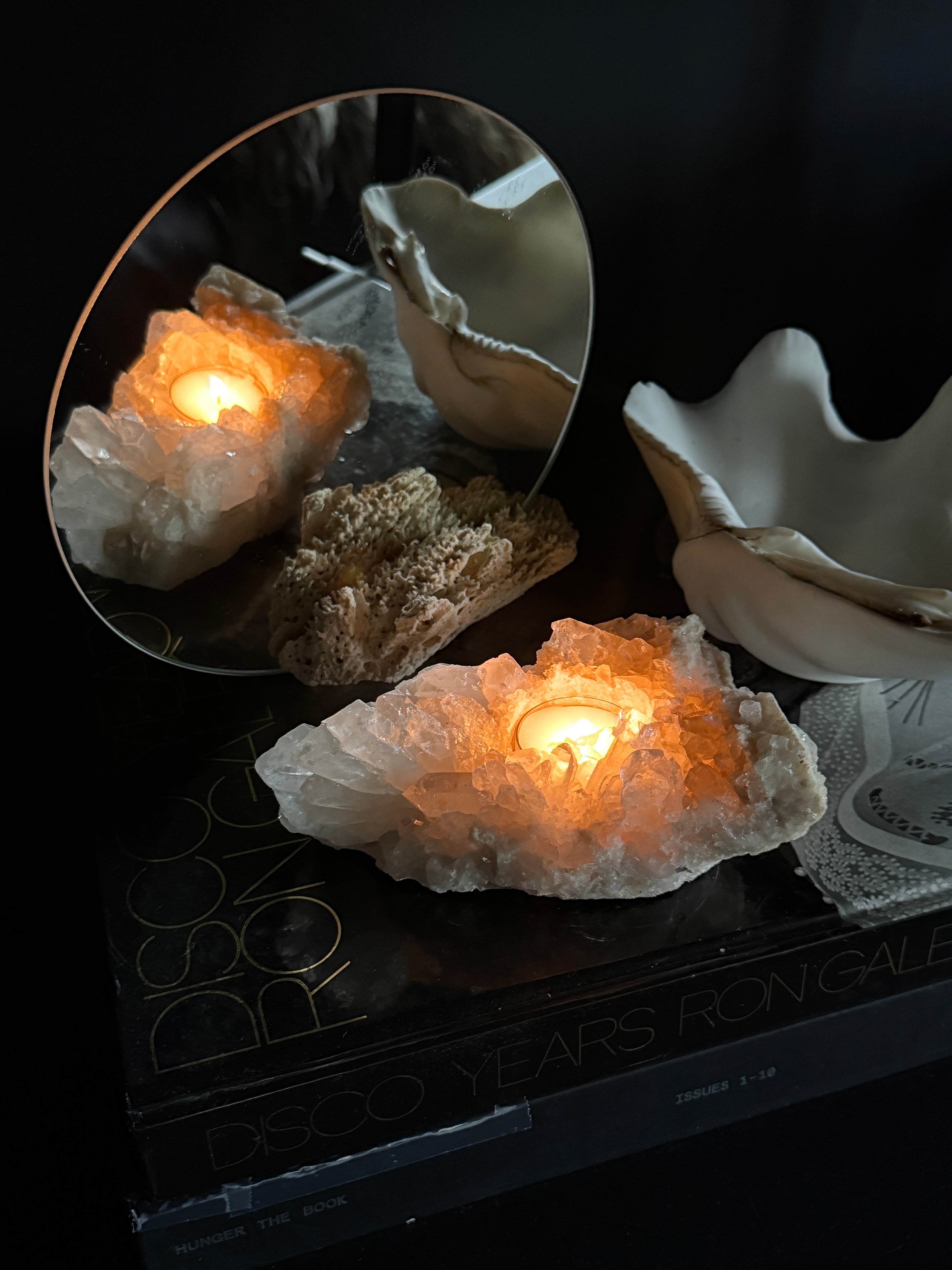 Telysholder i kvarts – et unikt naturstykke som kombinerer rå stein med mykt lys. Hver holder er håndlaget av ekte kvarts, og har sin egen form og struktur. Perfekt som dekorasjon eller som en stemningsfull detalj i hjemmet.