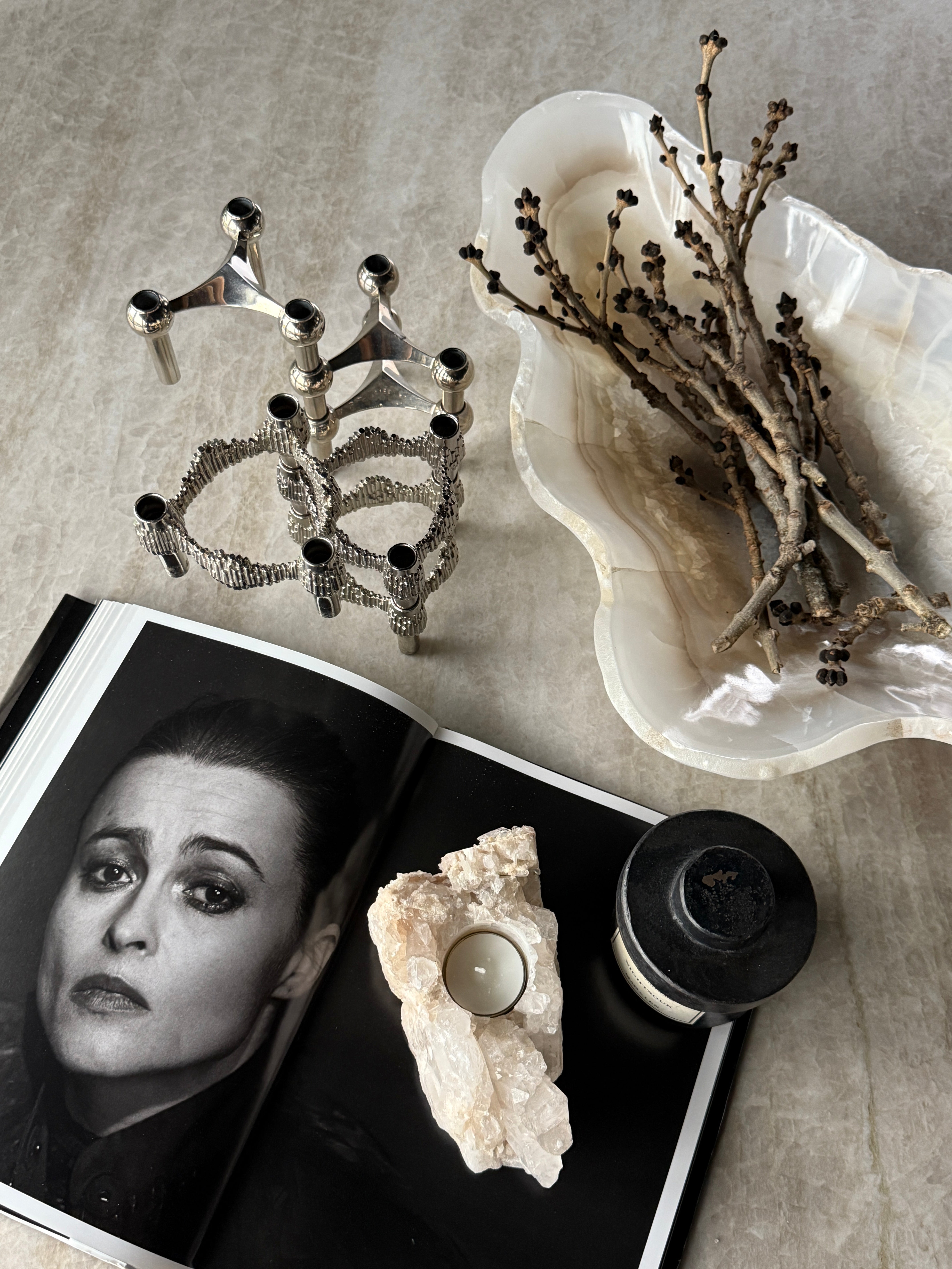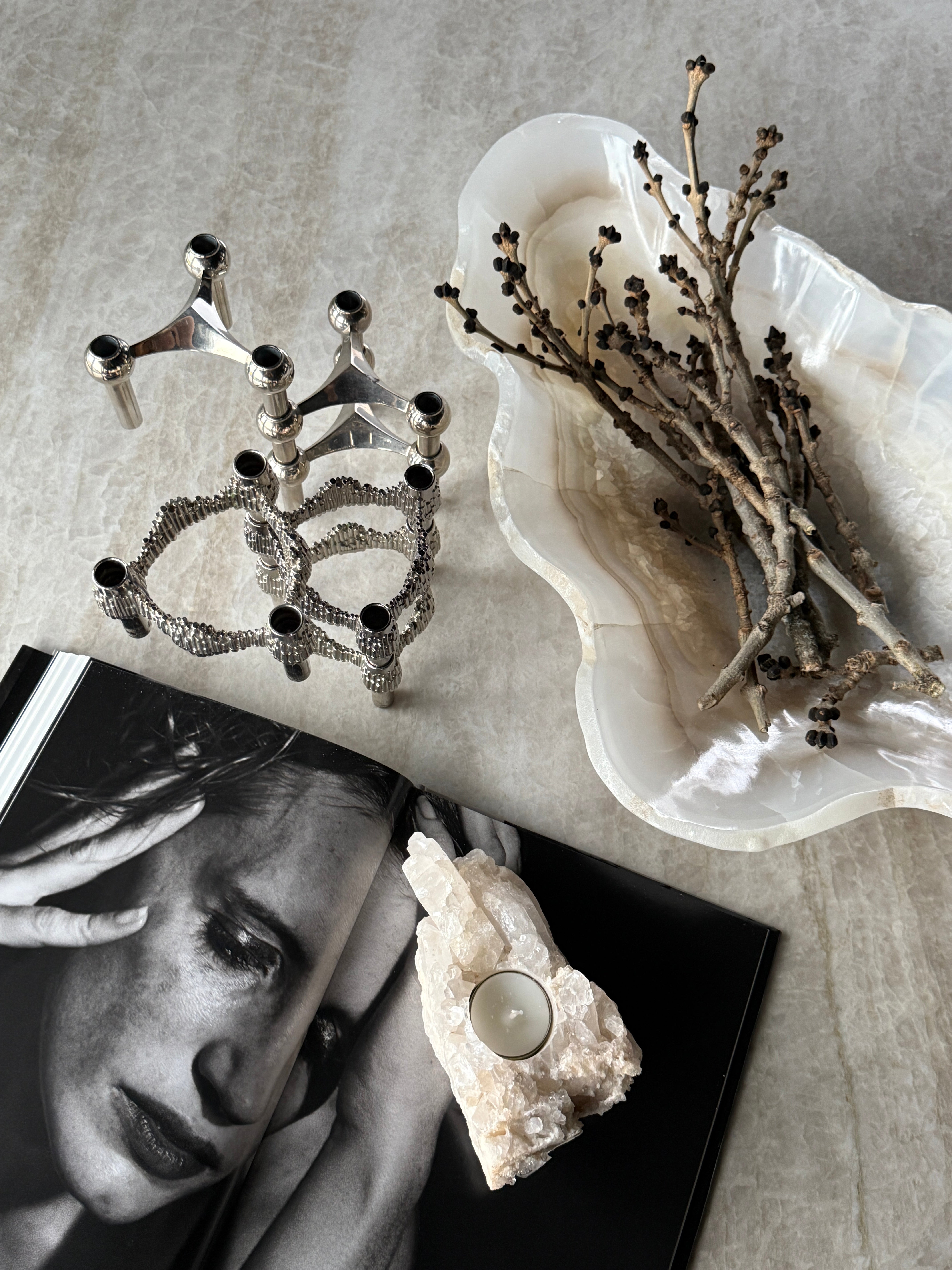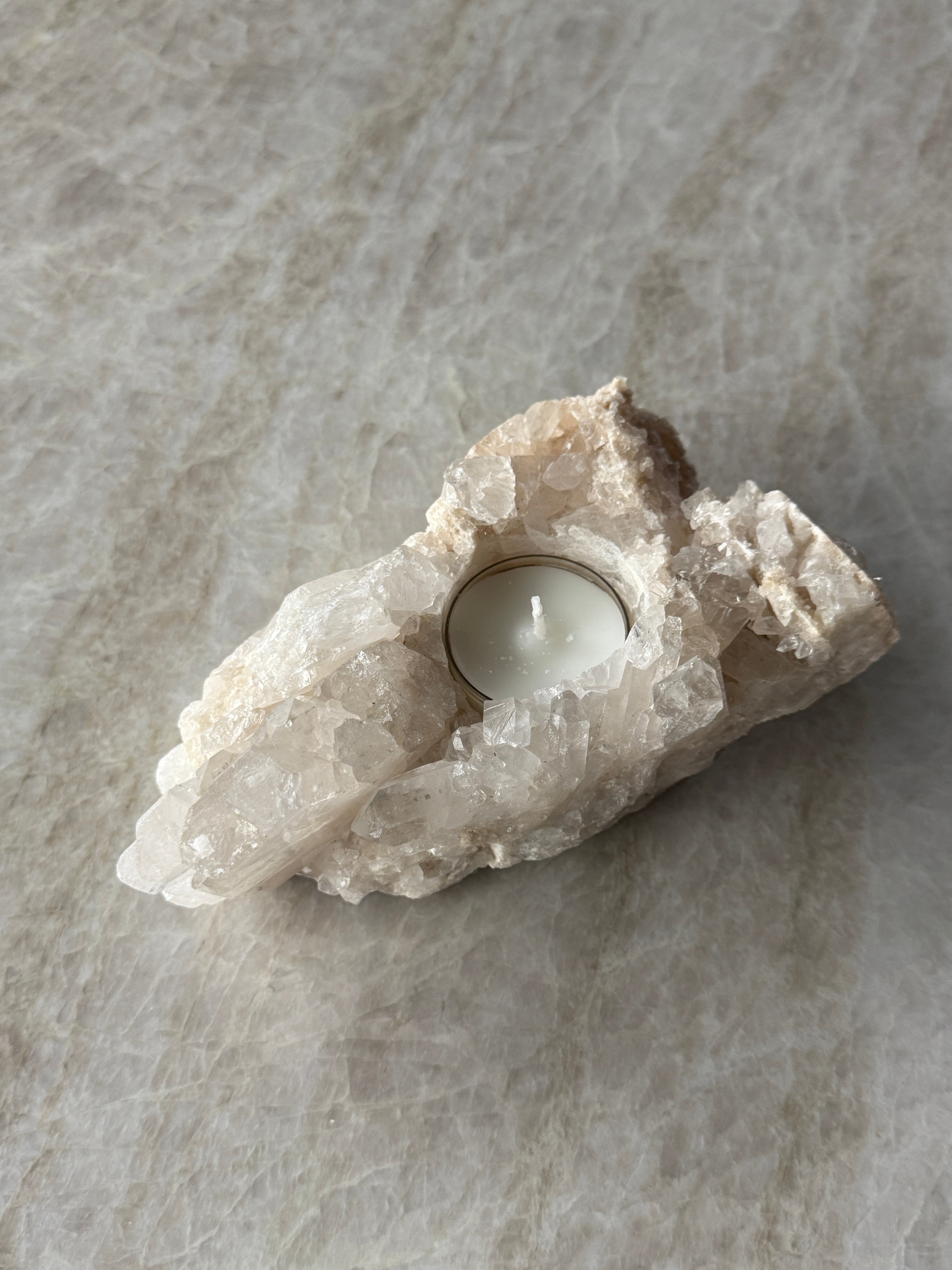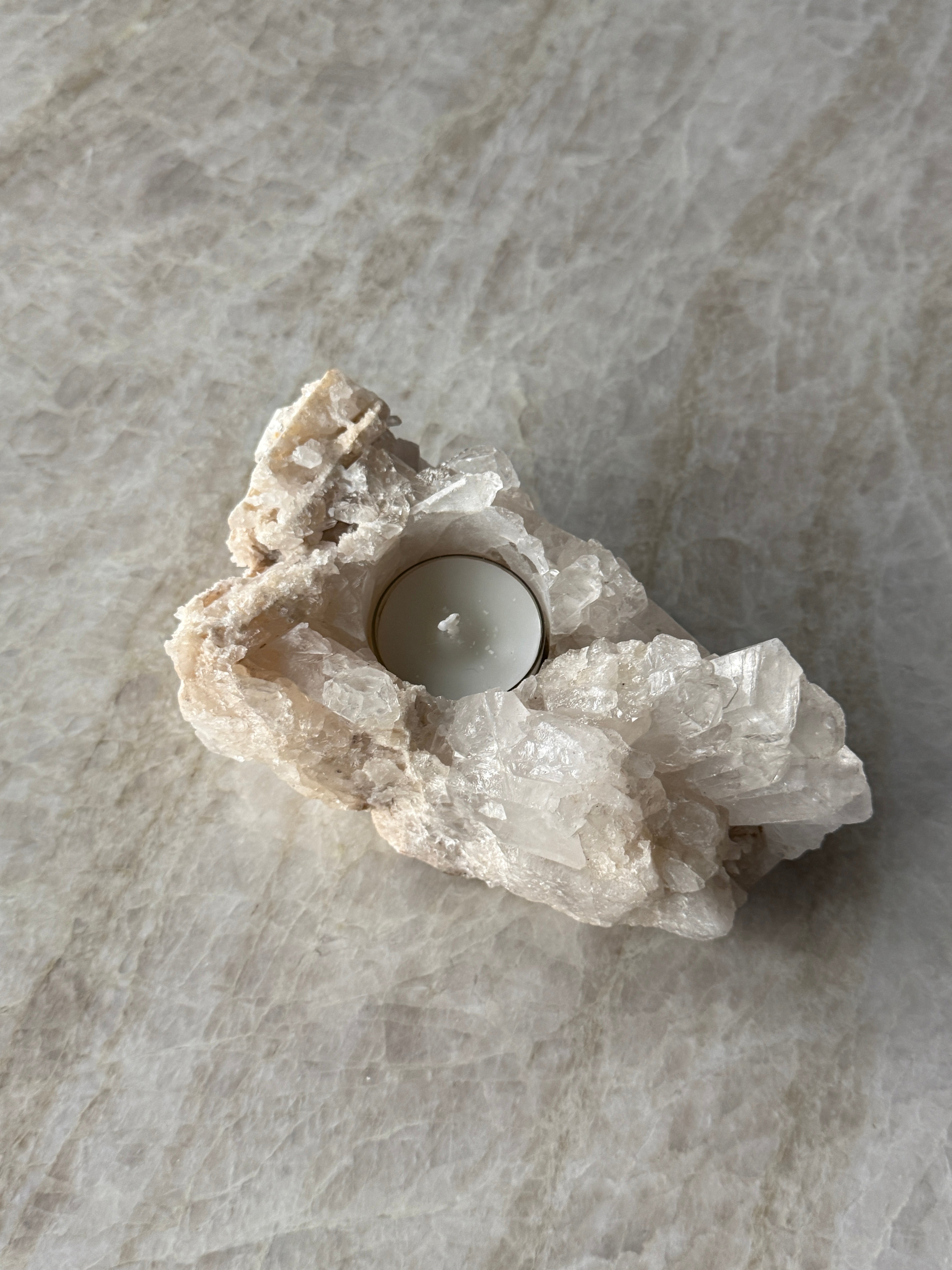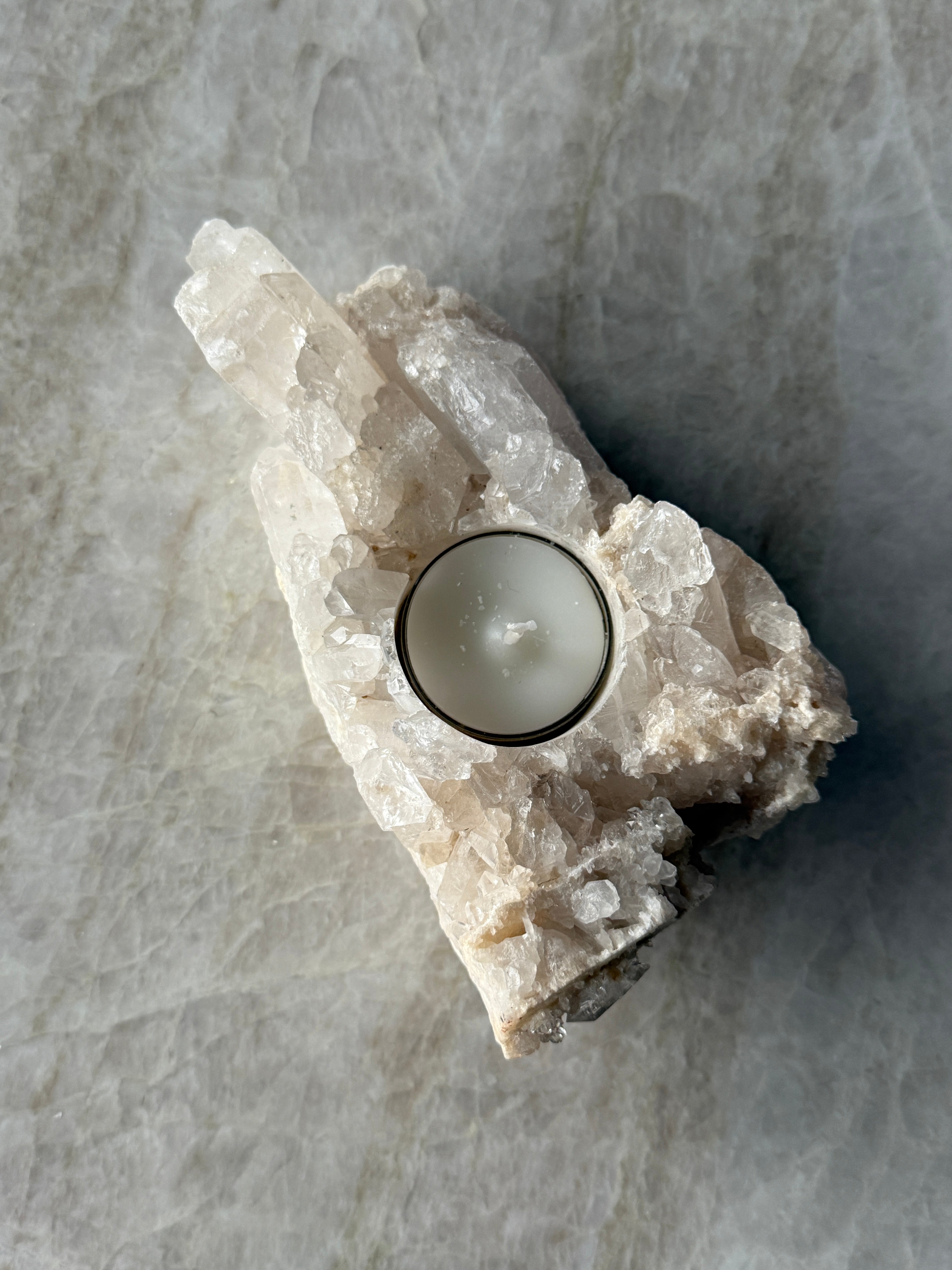 Telysholder i kvarts – et unikt naturstykke som kombinerer rå stein med mykt lys. Hver holder er håndlaget av ekte kvarts, og har sin egen form og struktur. Perfekt som dekorasjon eller som en stemningsfull detalj i hjemmet.