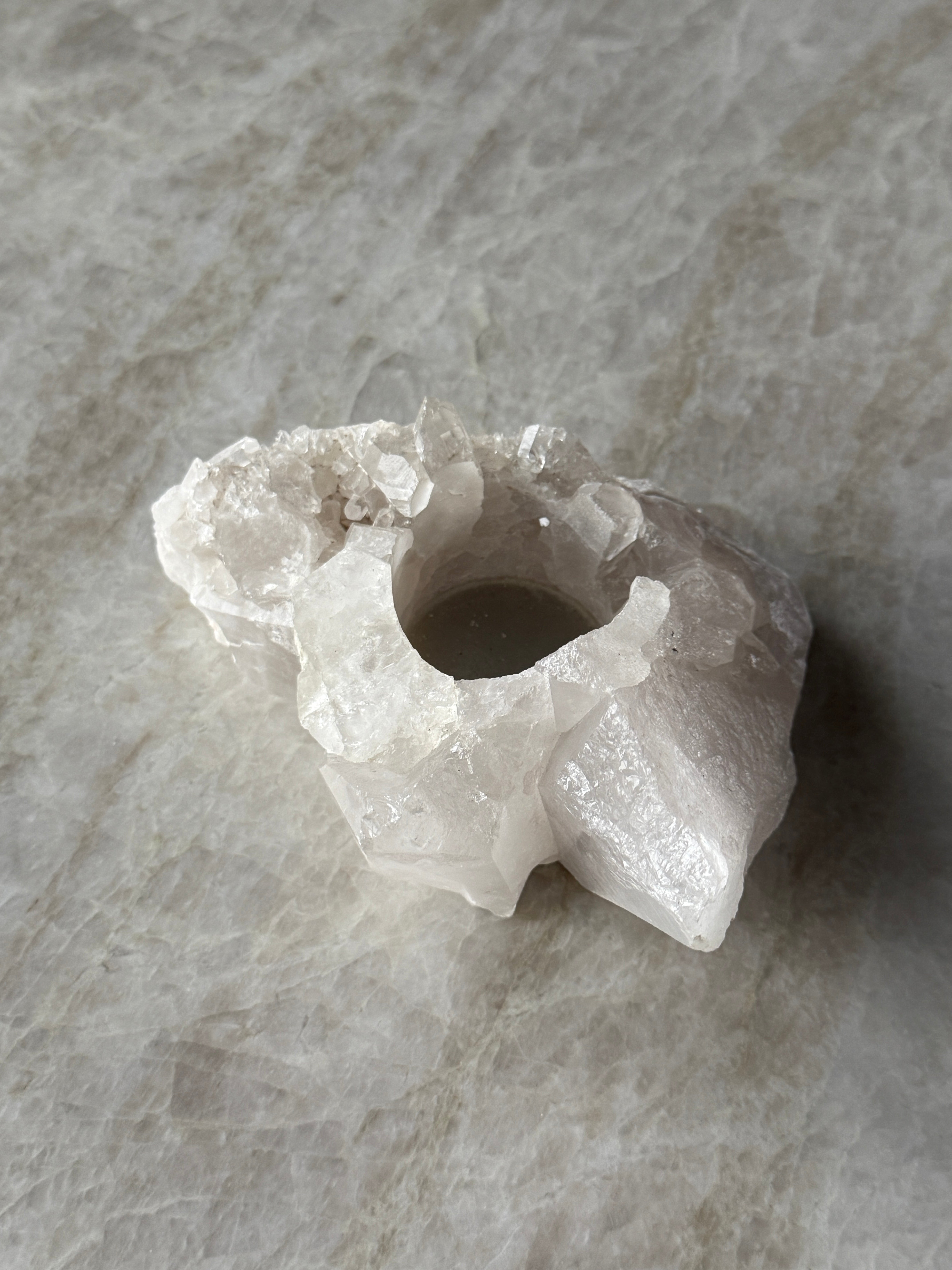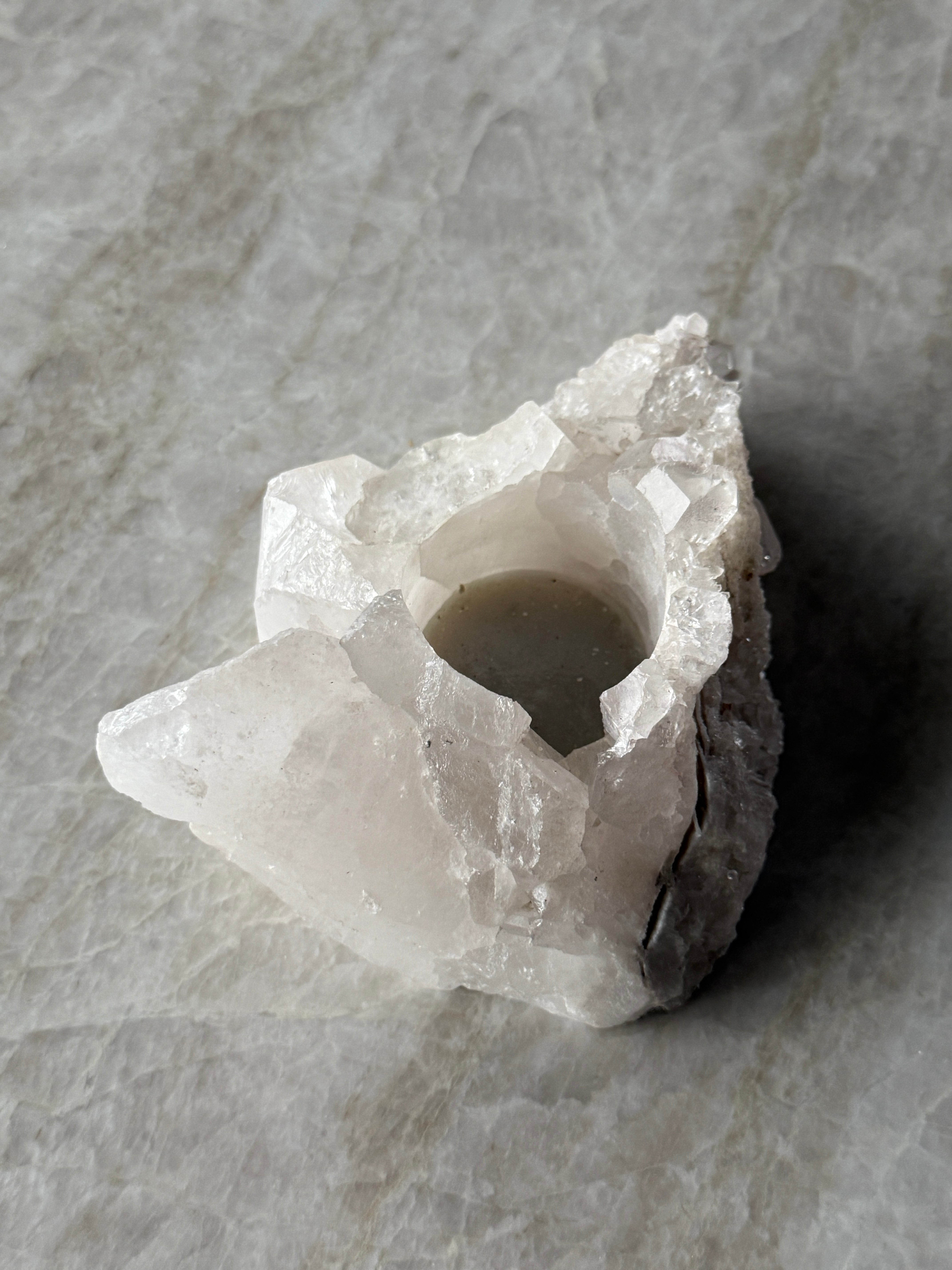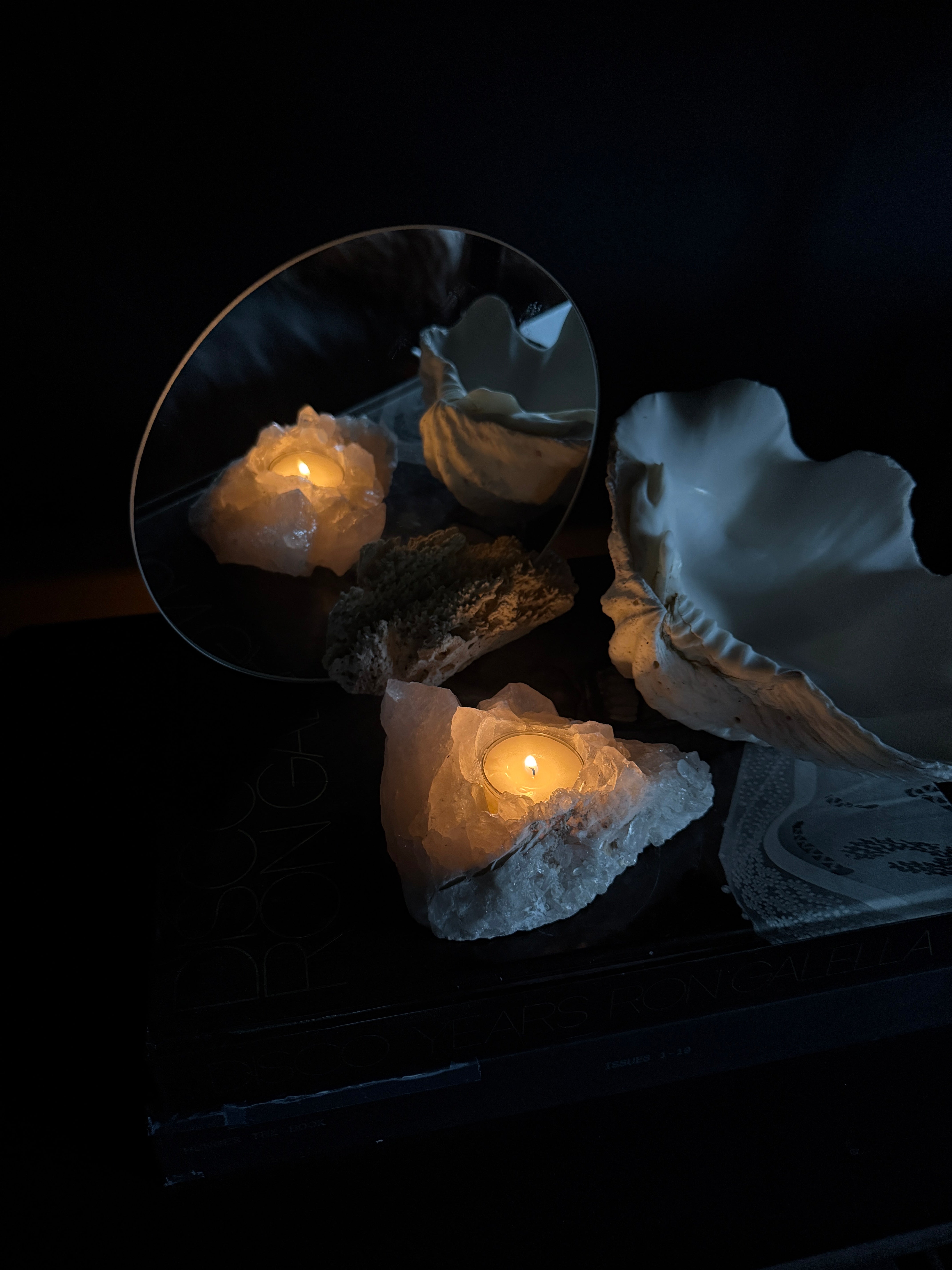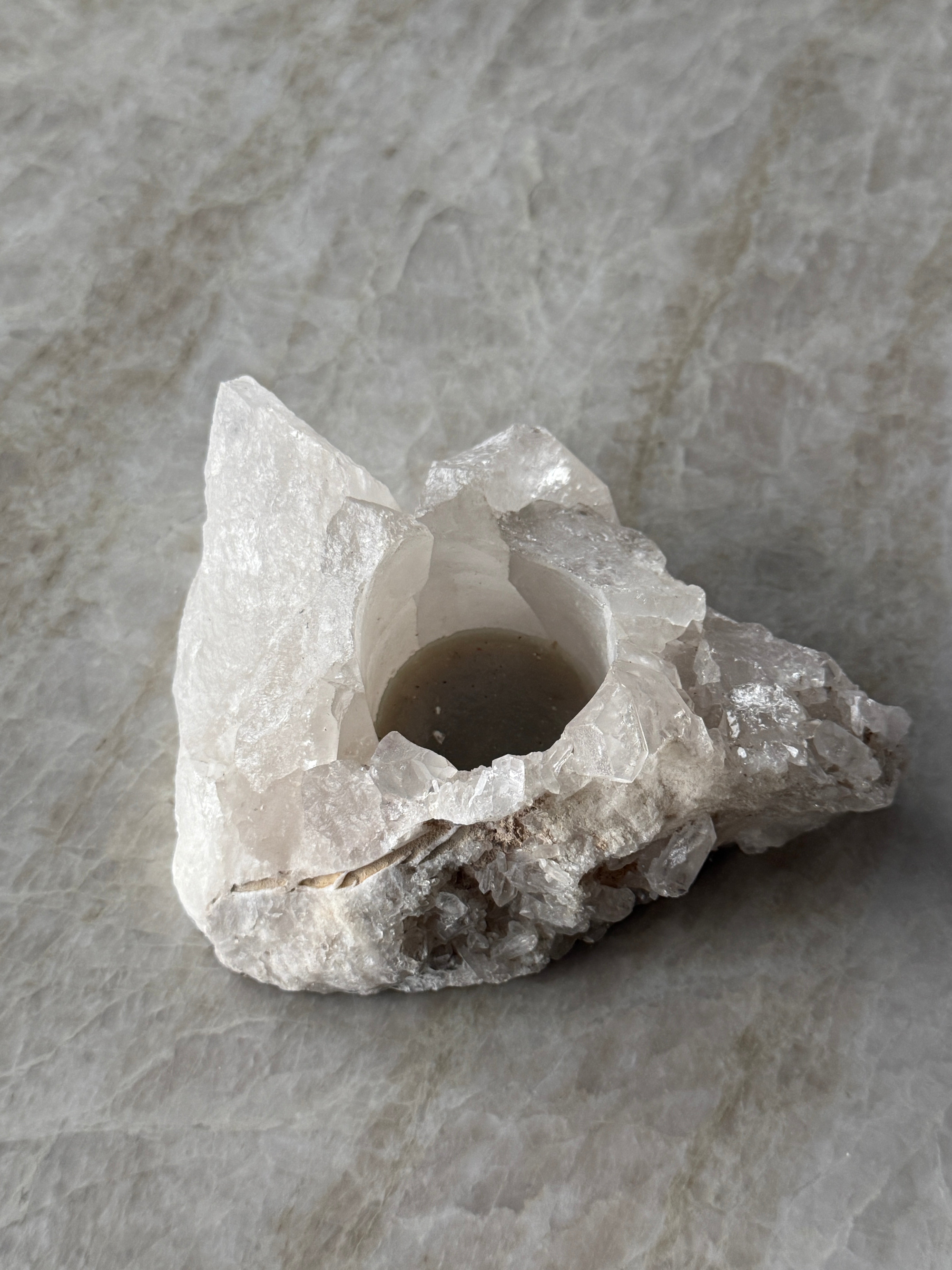 Telysholder i kvarts – et unikt naturstykke som kombinerer rå stein med mykt lys. Hver holder er håndlaget av ekte kvarts, og har sin egen form og struktur. Perfekt som dekorasjon eller som en stemningsfull detalj i hjemmet.