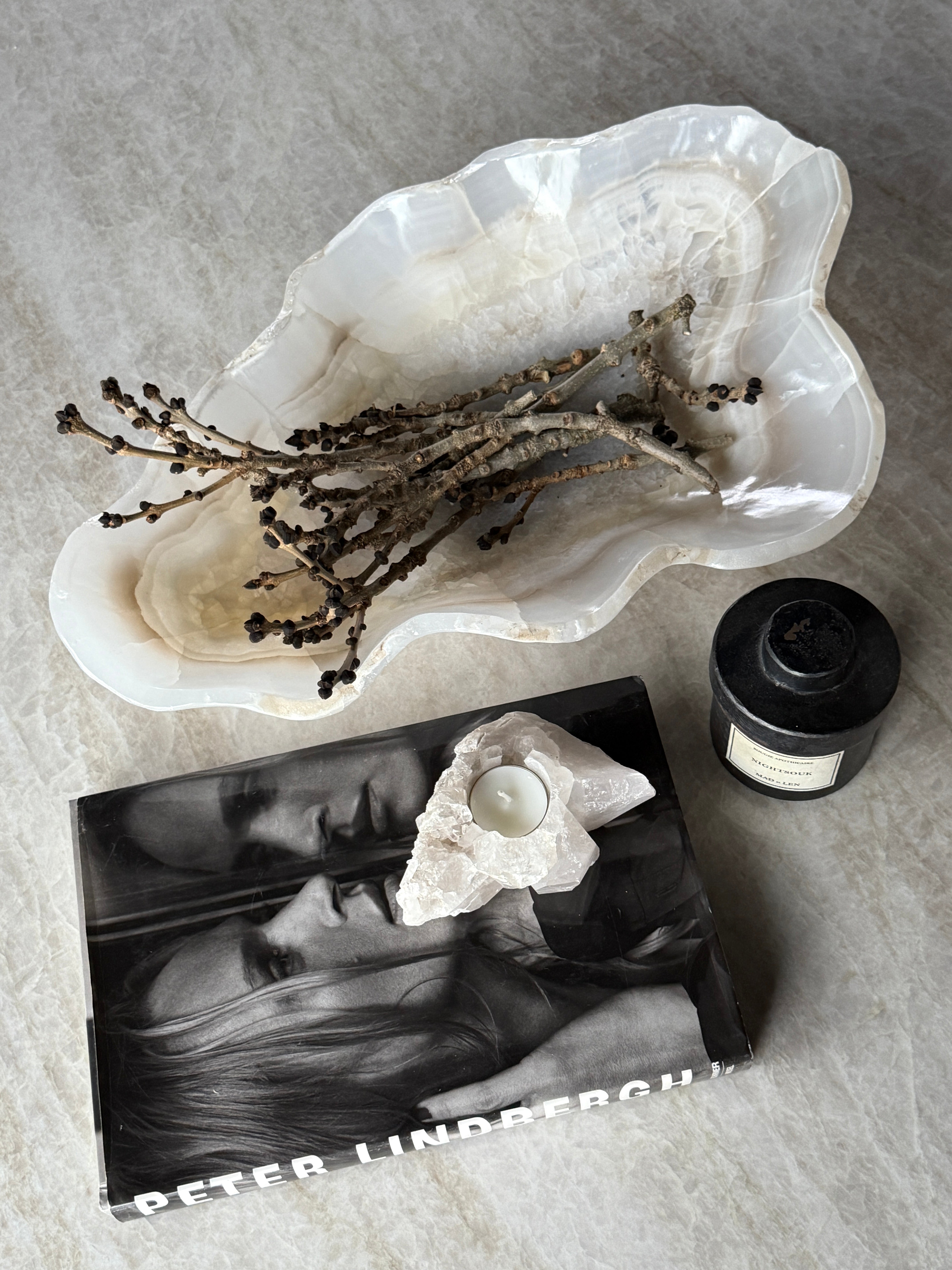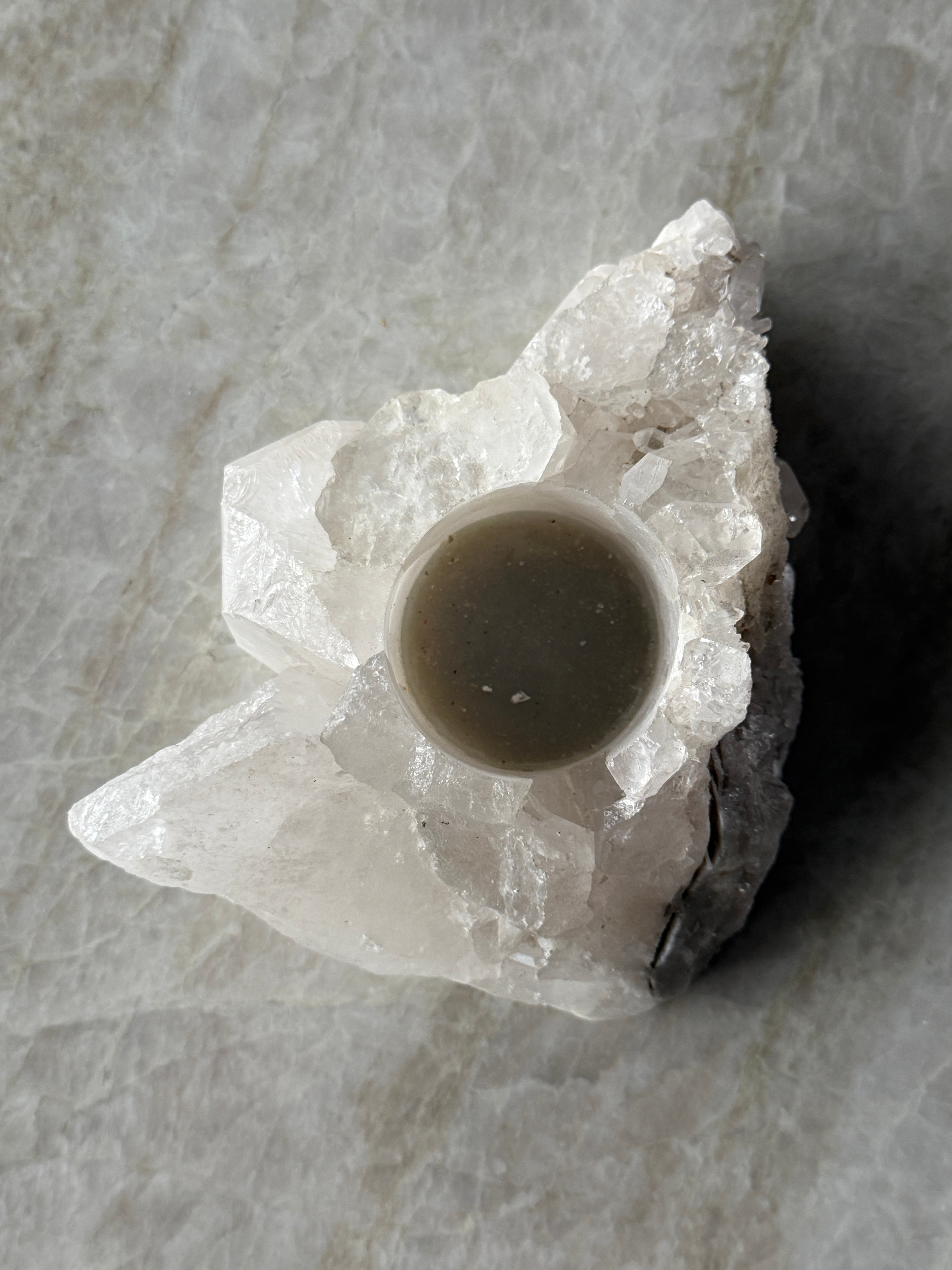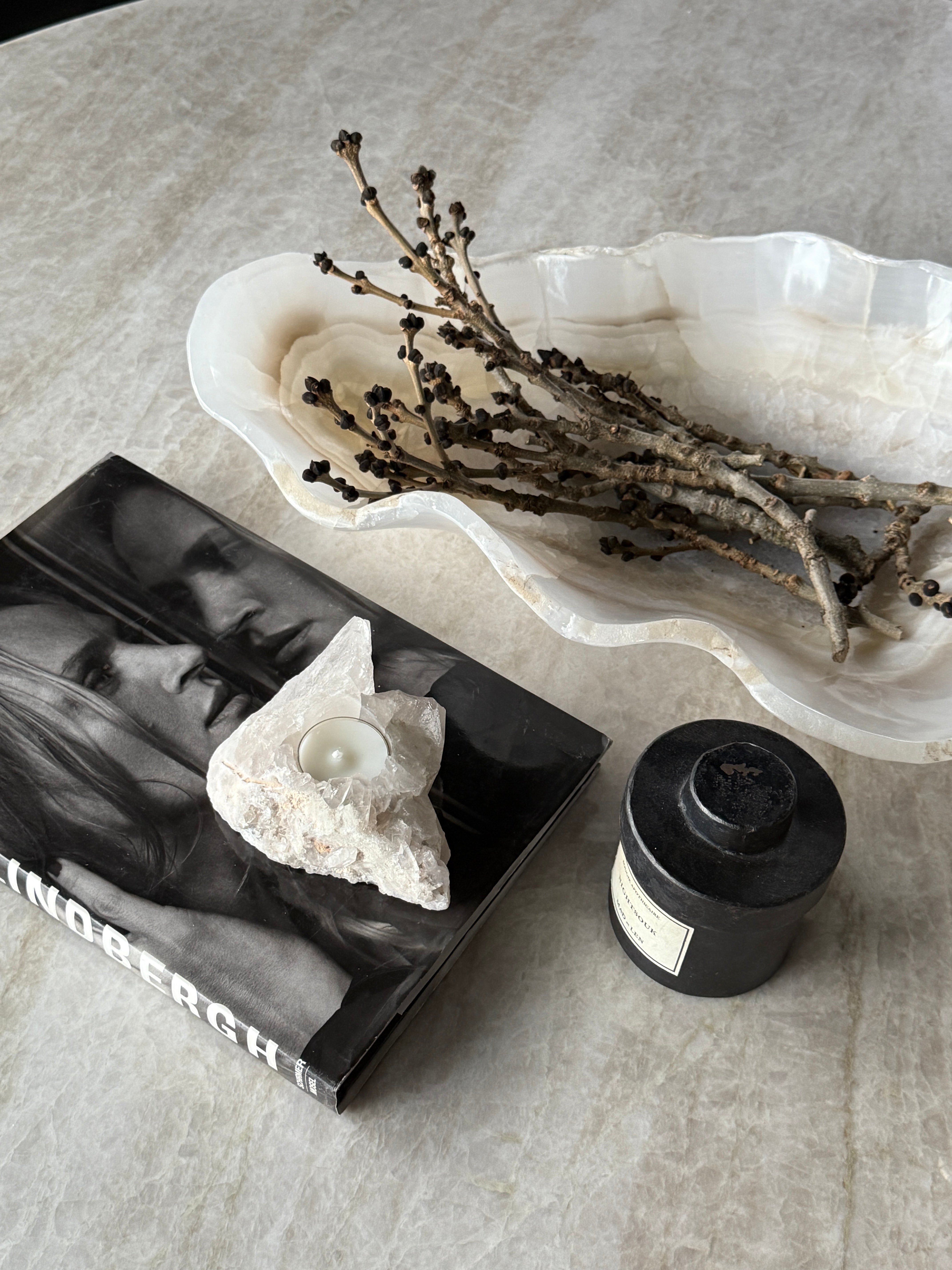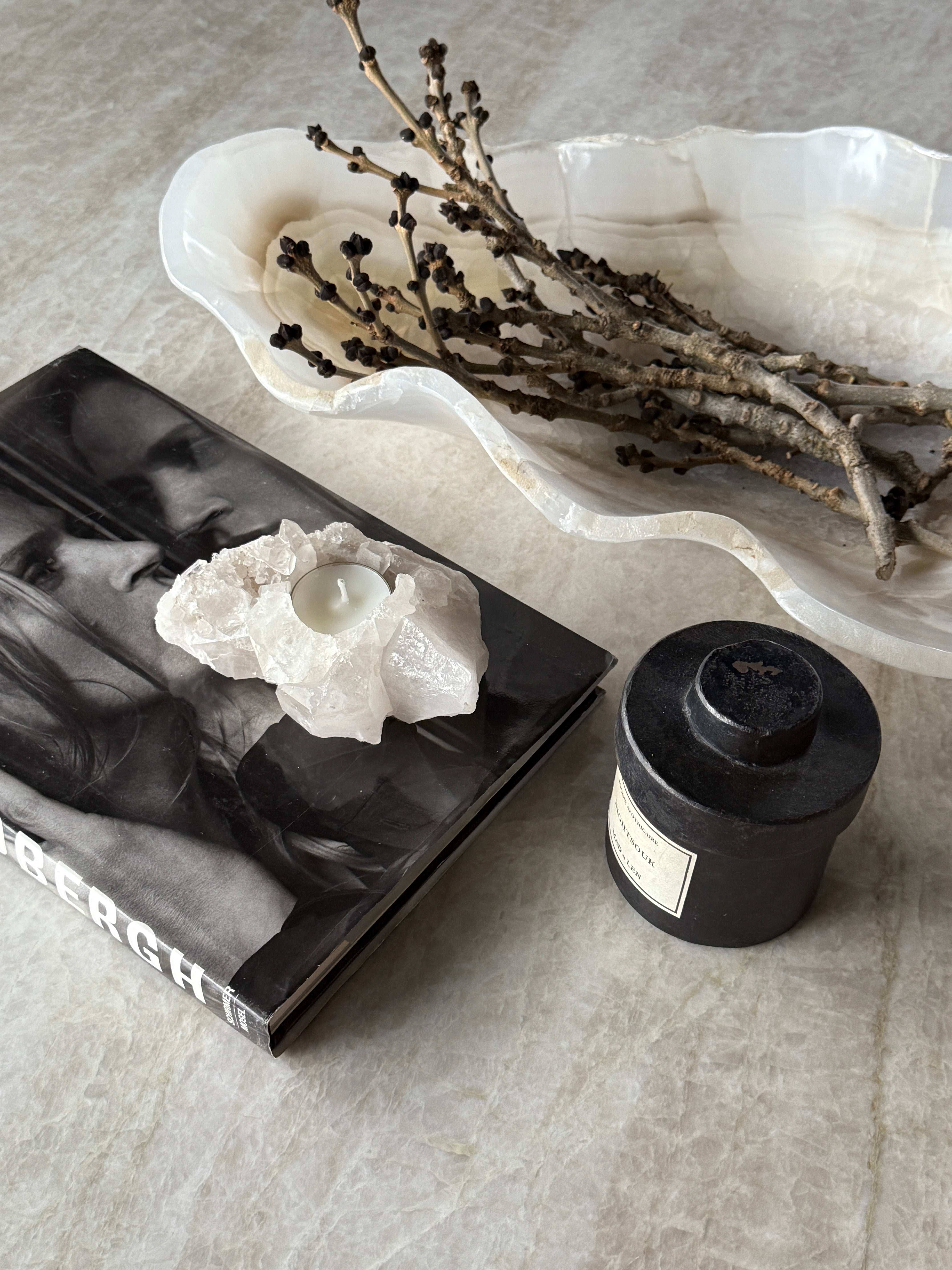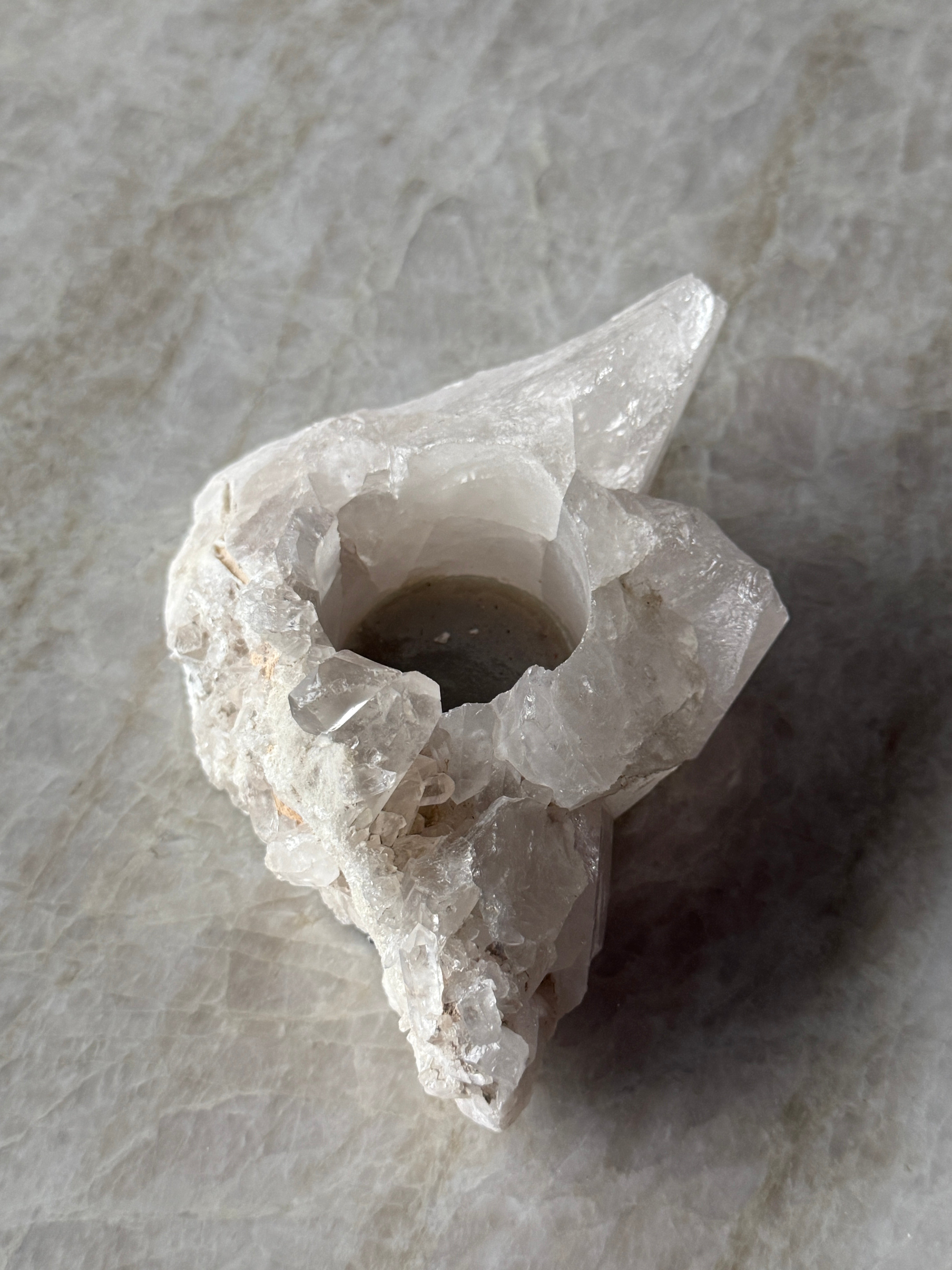 Telysholder i kvarts – et unikt naturstykke som kombinerer rå stein med mykt lys. Hver holder er håndlaget av ekte kvarts, og har sin egen form og struktur. Perfekt som dekorasjon eller som en stemningsfull detalj i hjemmet.