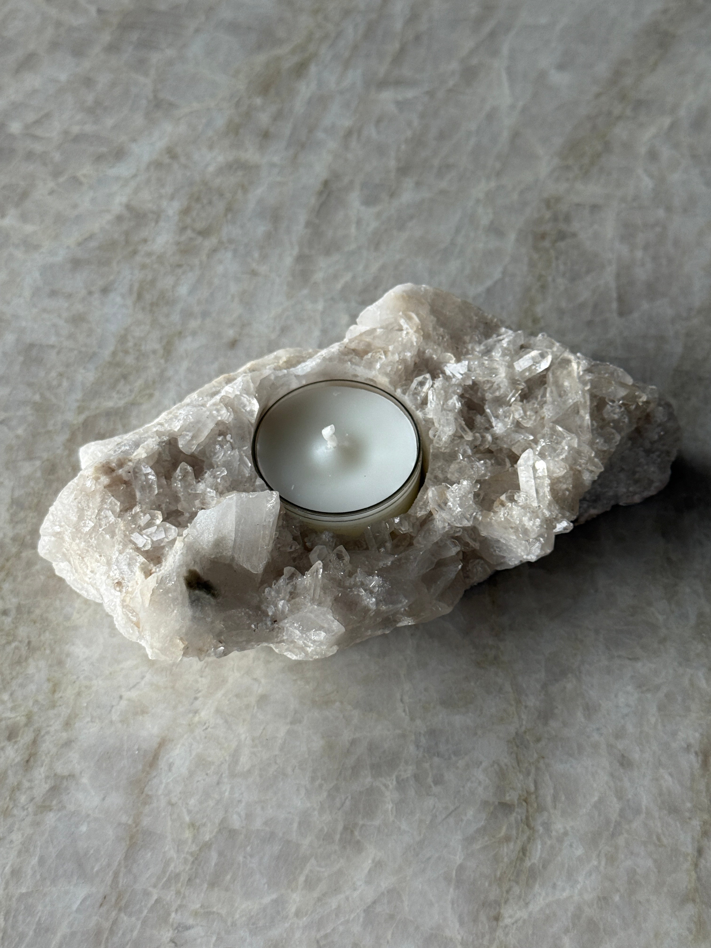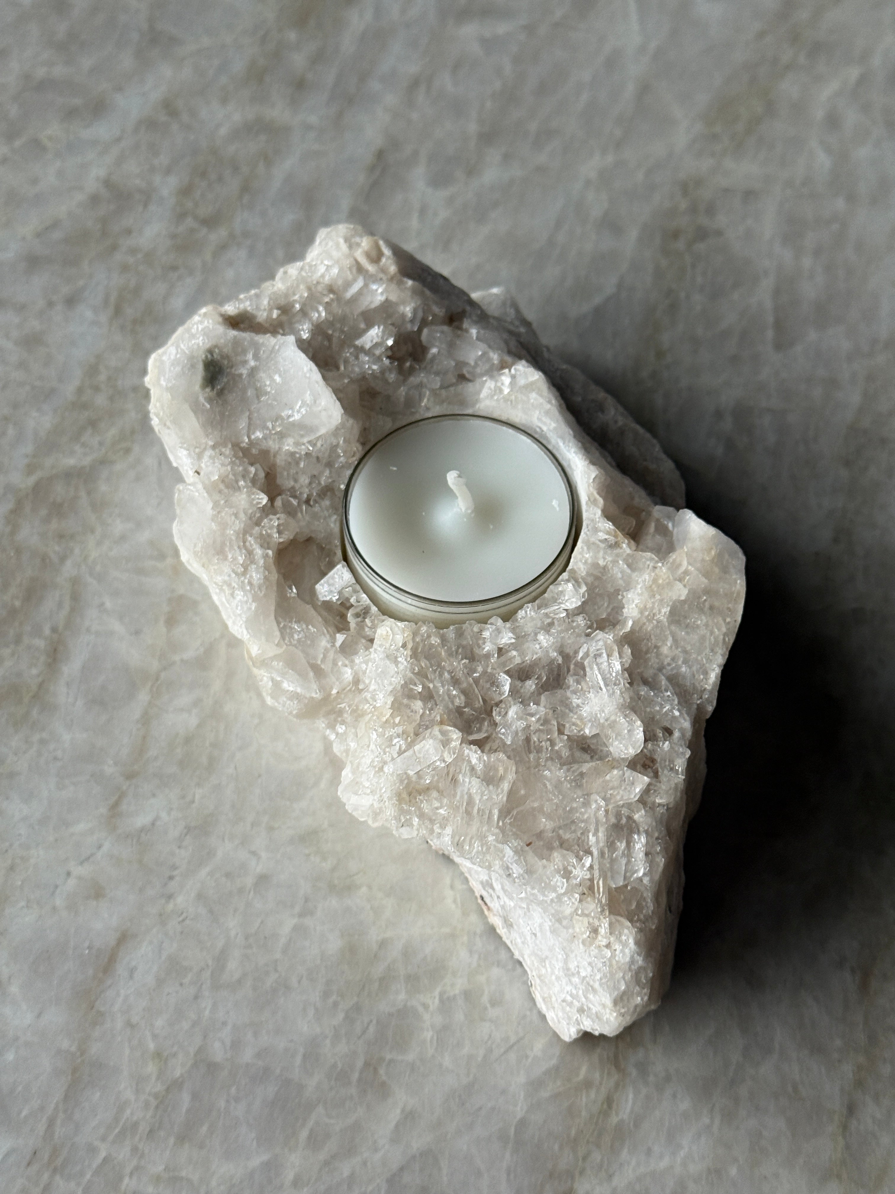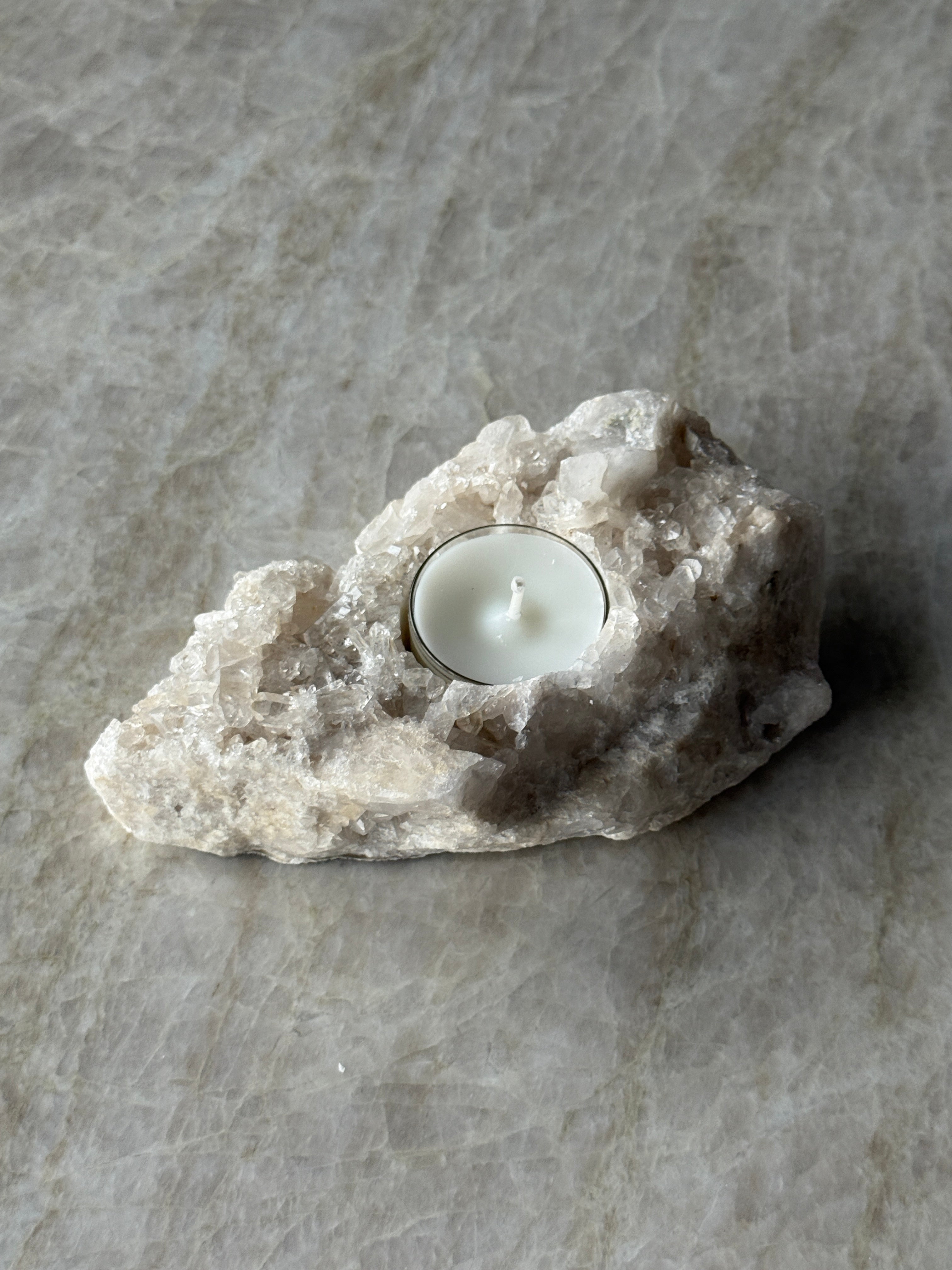 Telysholder i kvarts – et unikt naturstykke som kombinerer rå stein med mykt lys. Hver holder er håndlaget av ekte kvarts, og har sin egen form og struktur. Perfekt som dekorasjon eller som en stemningsfull detalj i hjemmet.