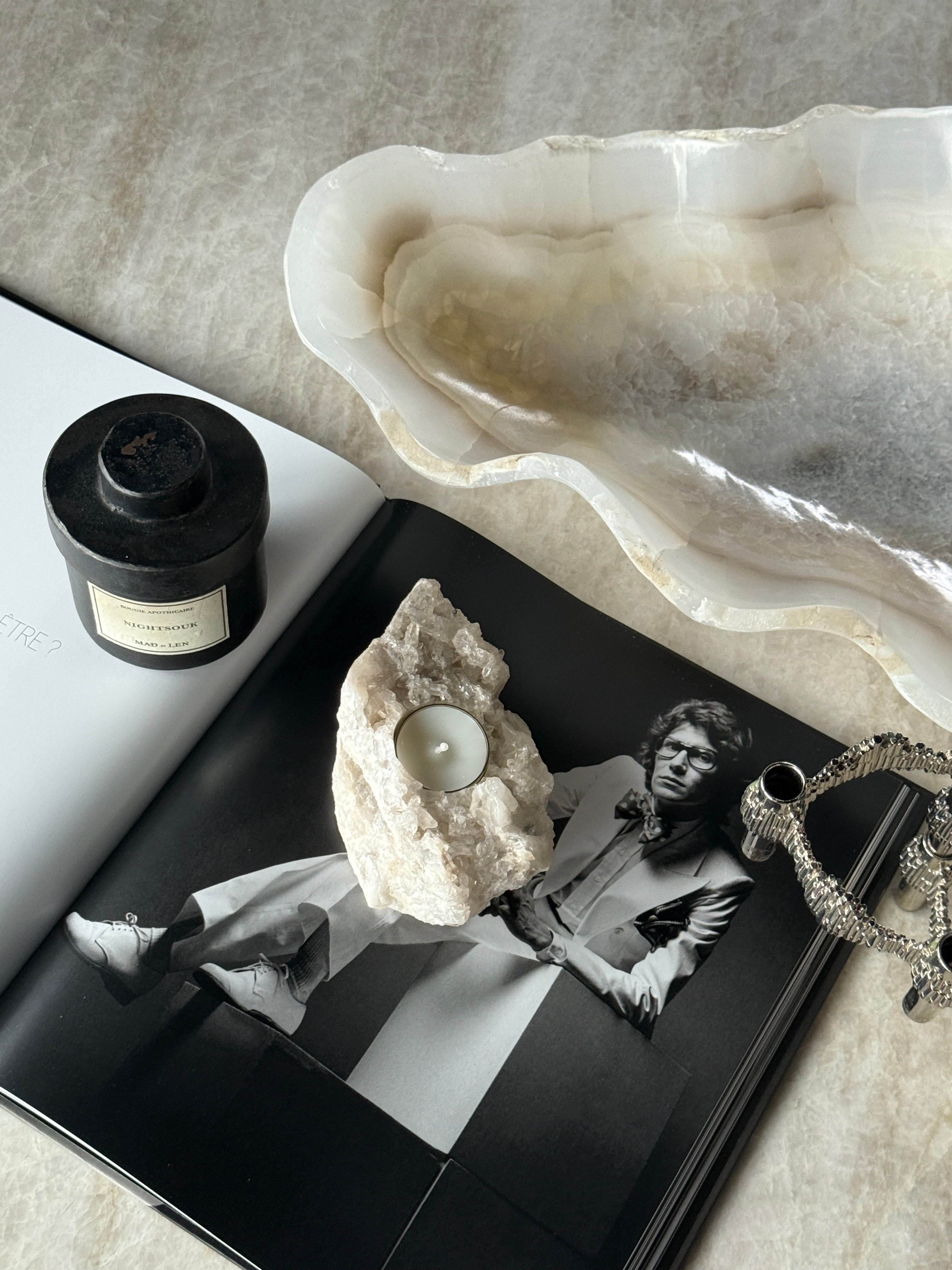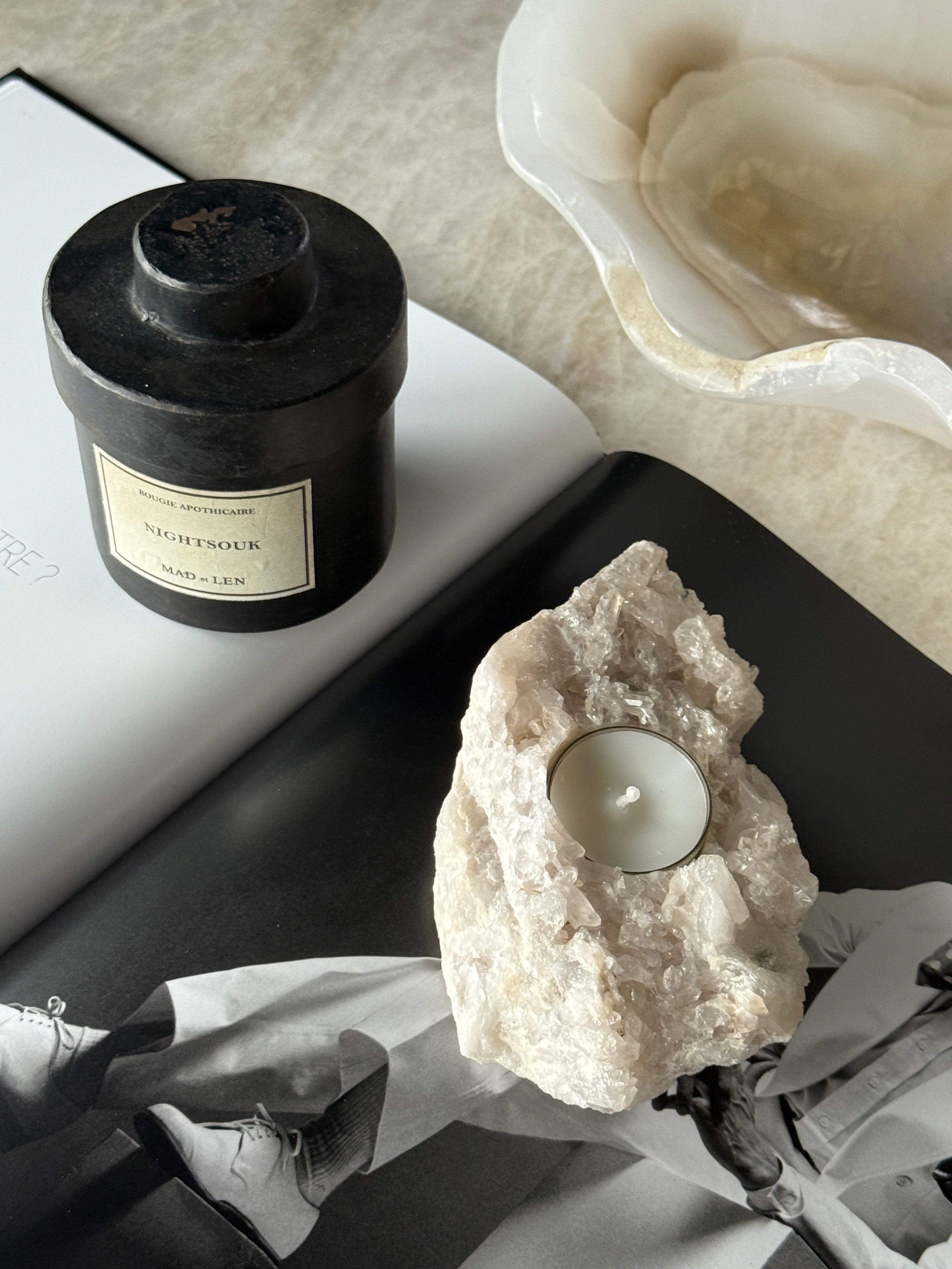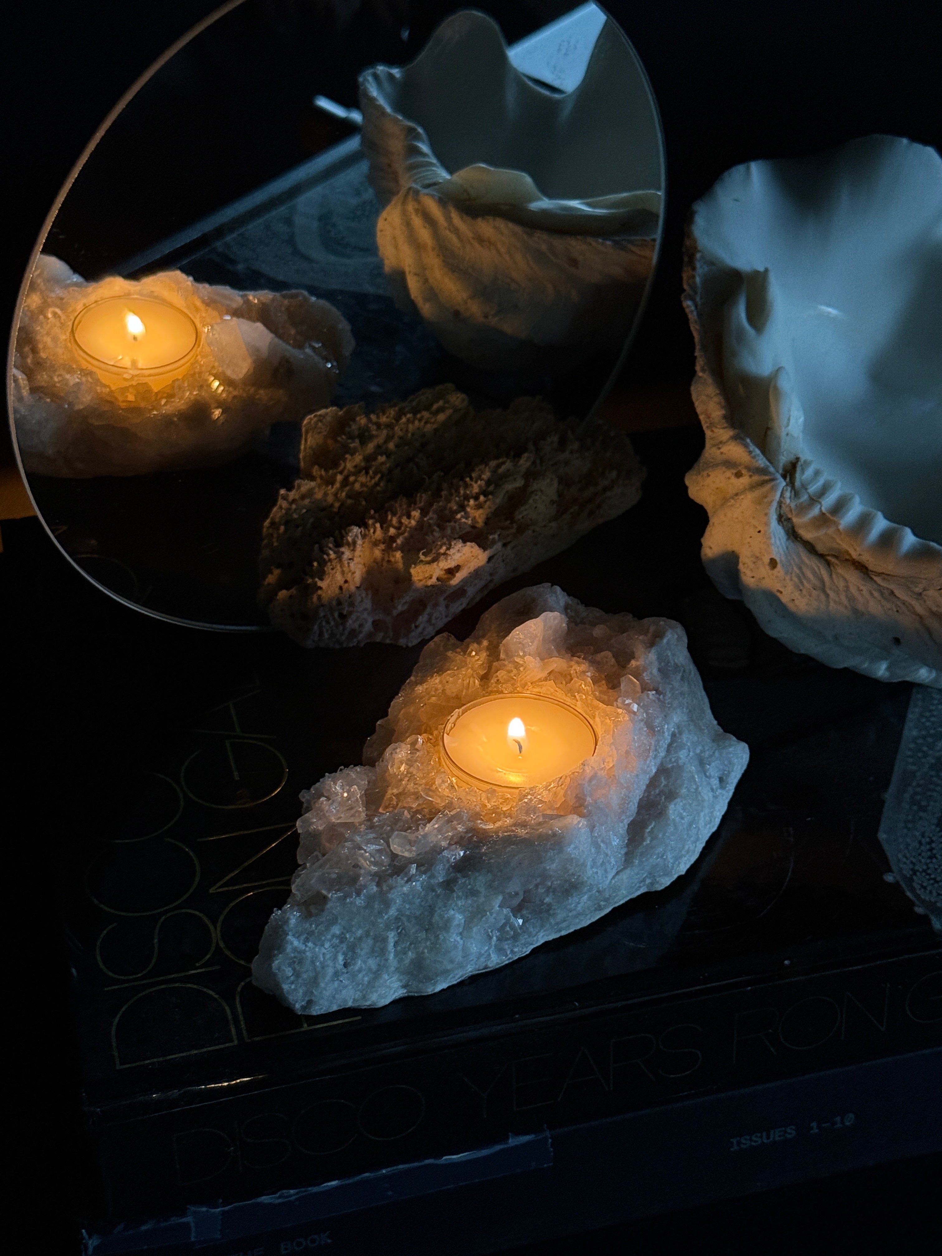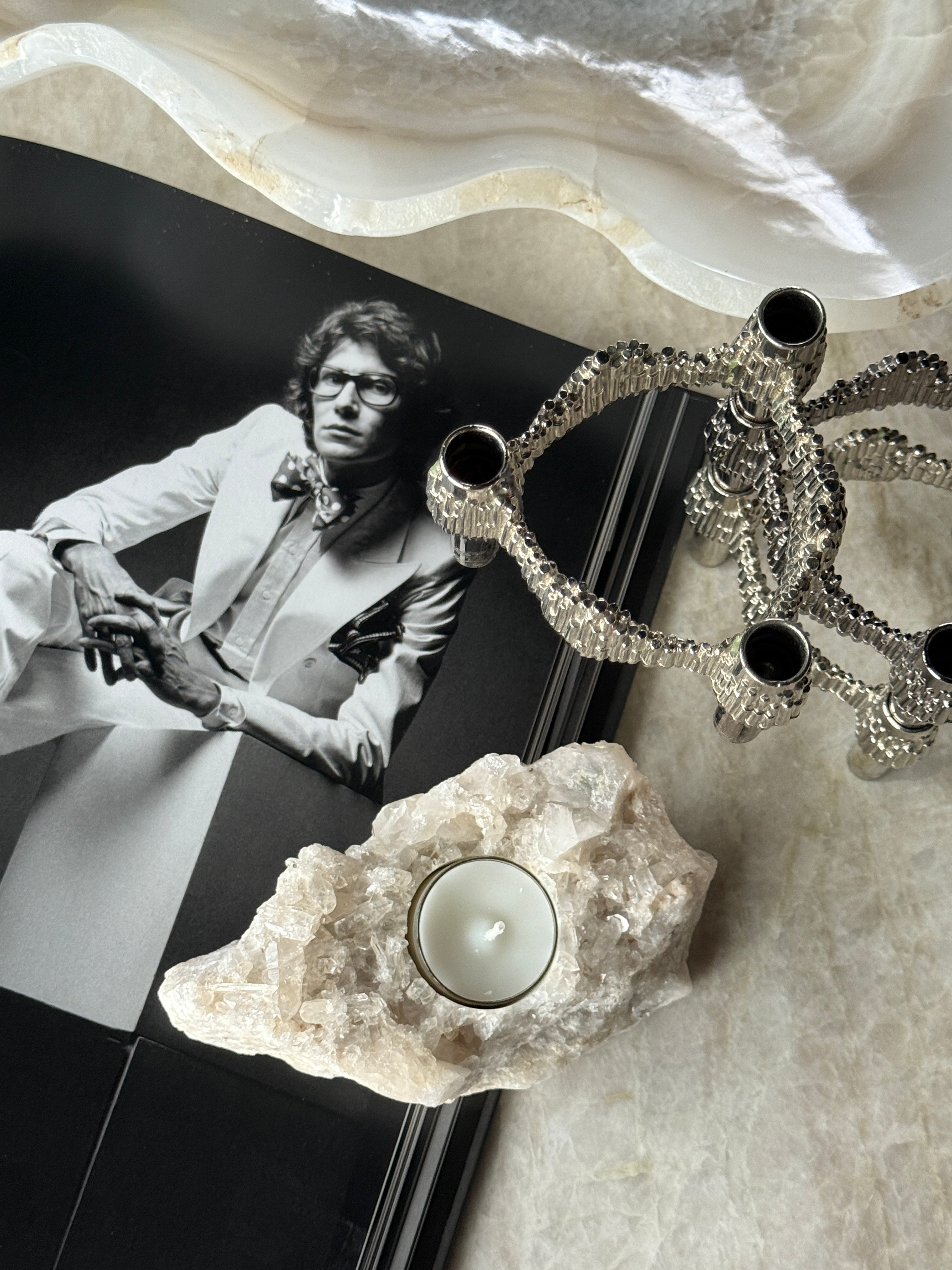 Telysholder i kvarts – et unikt naturstykke som kombinerer rå stein med mykt lys. Hver holder er håndlaget av ekte kvarts, og har sin egen form og struktur. Perfekt som dekorasjon eller som en stemningsfull detalj i hjemmet.