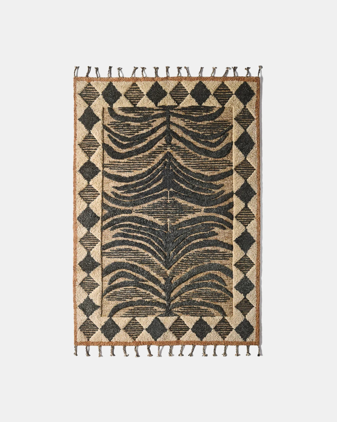 Wildcat gulvteppet i askesvart er et ekte statement-teppe som er et resultat av samarbeidet mellom Dusty Deco og den anerkjente designeren Matthew Williamson. Med sine kontraster i farger og struktur er Wildcat-teppet et iøynefallende møbel som umiddelbart løfter rommet ditt.