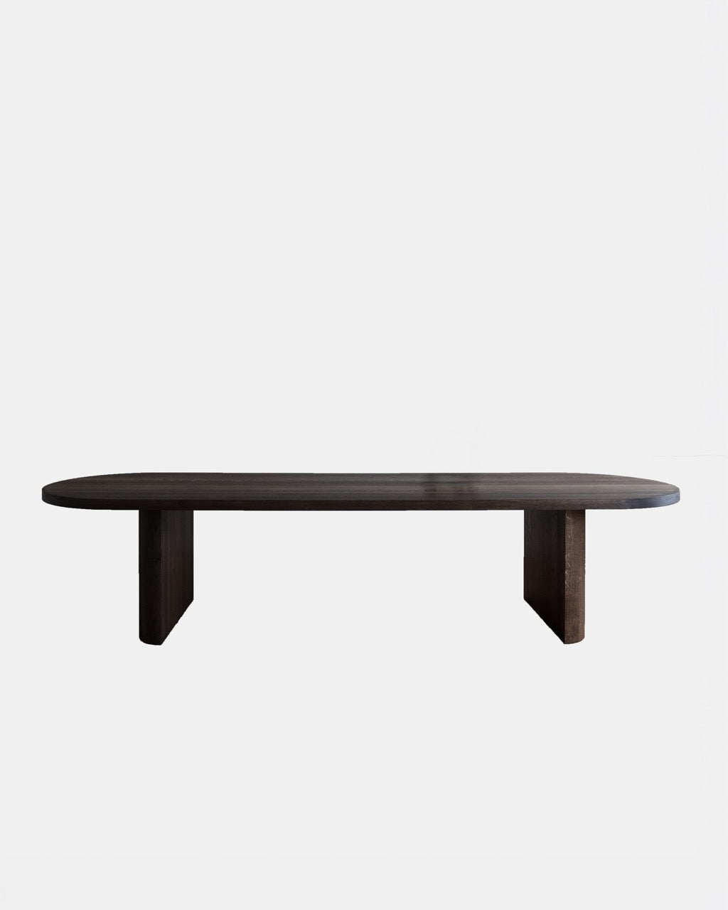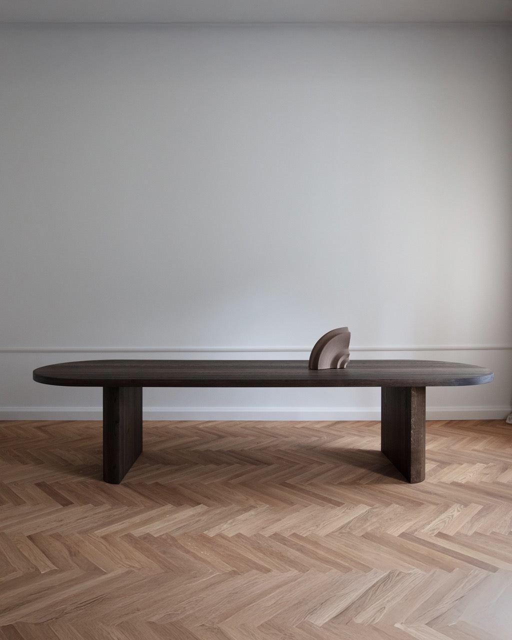 Designet kjennetegnes av myke, organiske linjer og en kraftfull base som gir bordet et distinkt og samtidig harmonisk uttrykk. Den heltre eiken tilfører varme og dybde, mens den oljede overflaten fremhever treets naturlige struktur og gir en behagelig, silkemyk følelse.