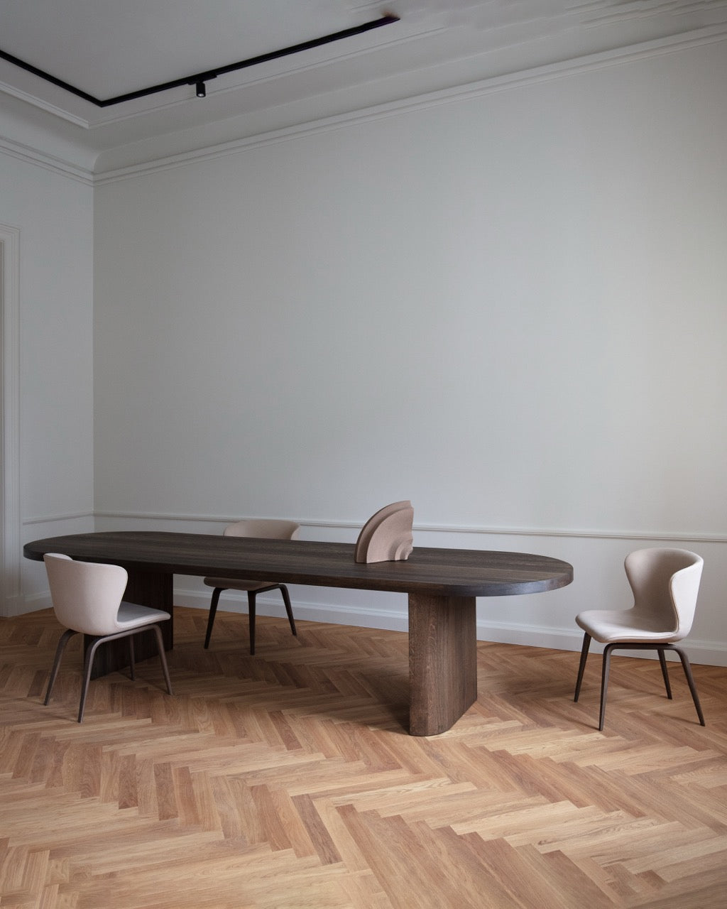 Evoke er et spisebord med et raffinert og moderne uttrykk, designet for å skape en naturlig balanse mellom funksjonalitet og estetikk. Med sitt solide håndverk og skulpturelle formspråk blir bordet et sentralt element i ethvert interiør, enten det brukes som spisebord i hjemmet eller som et stilrent konferansebord i et profesjonelt miljø.