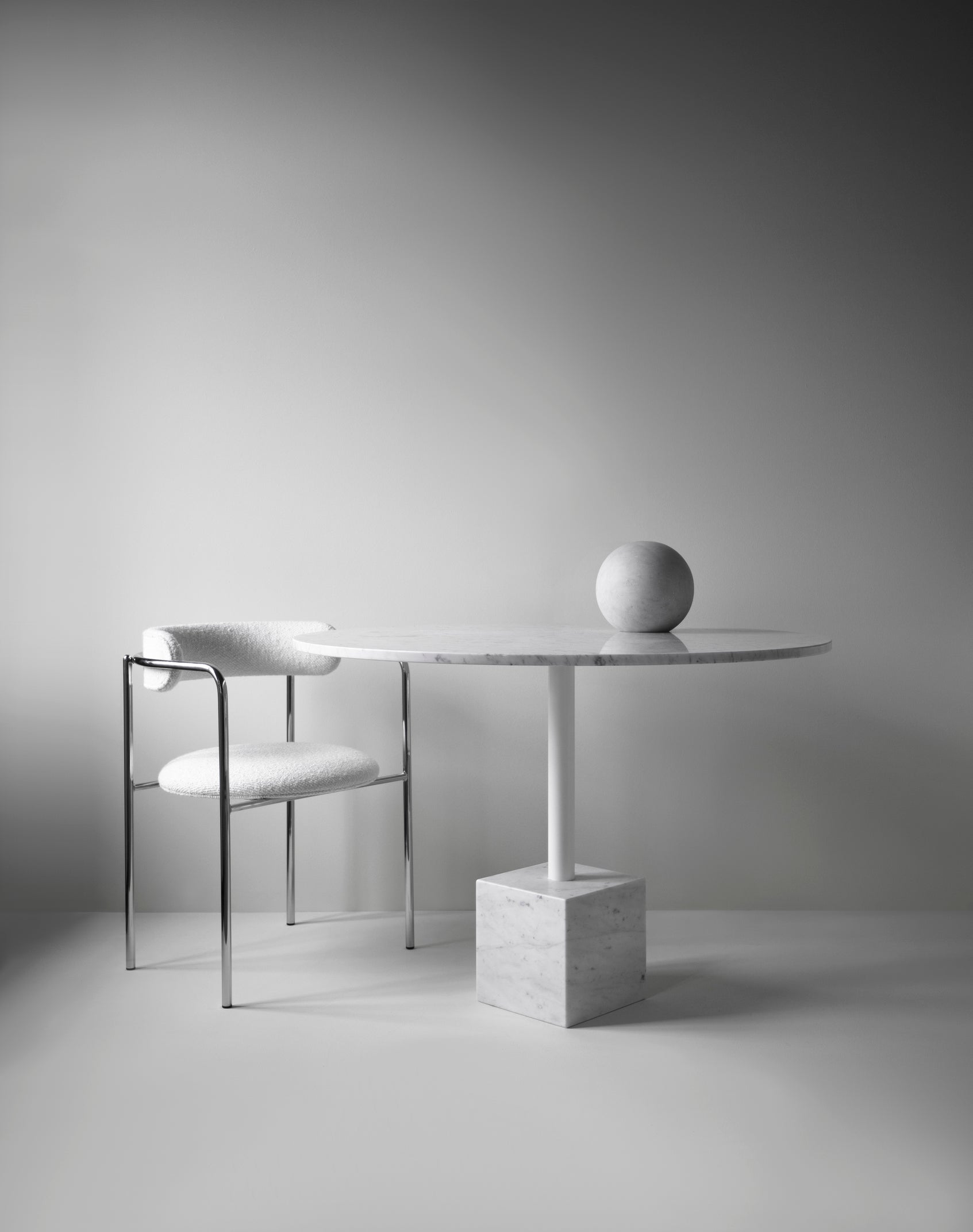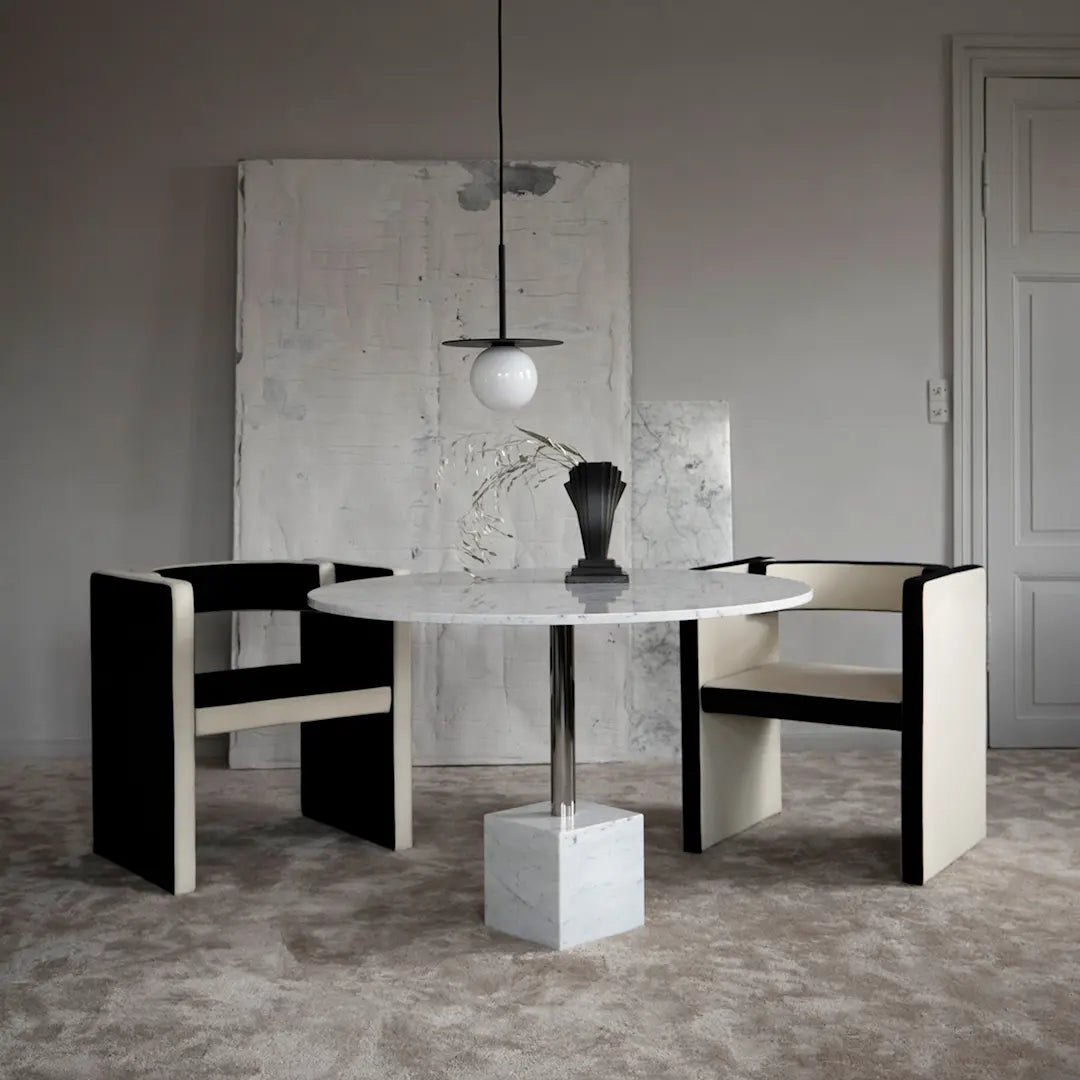 Det luksuriøse spisebordet er laget av europeisk marmor og metall som er i sort/hvitt sort eller hvit med valgfrie overdådige kromdetaljer. Kolleksjonen passer til mange interiører og passer godt i både offentlig og private hjem. Bordene passer for en rekke bygningsarkitekturer, enten de er historisk, midten av århundret eller moderne.