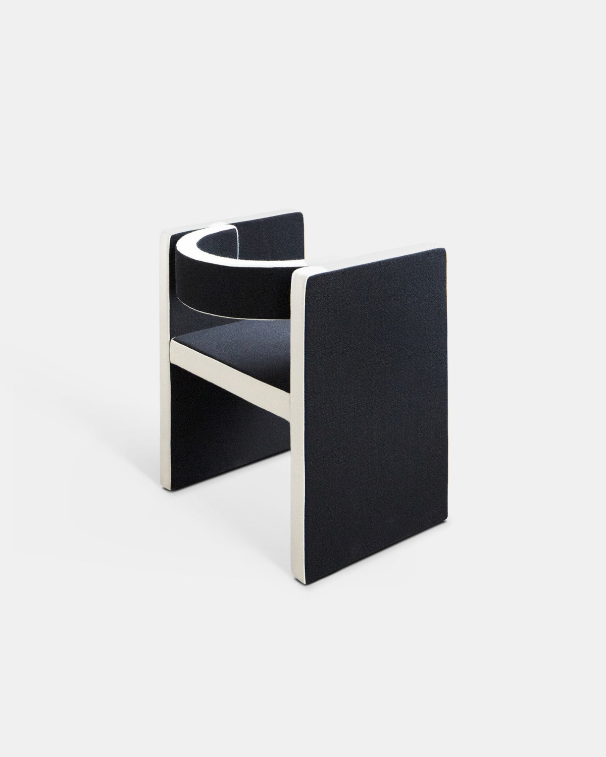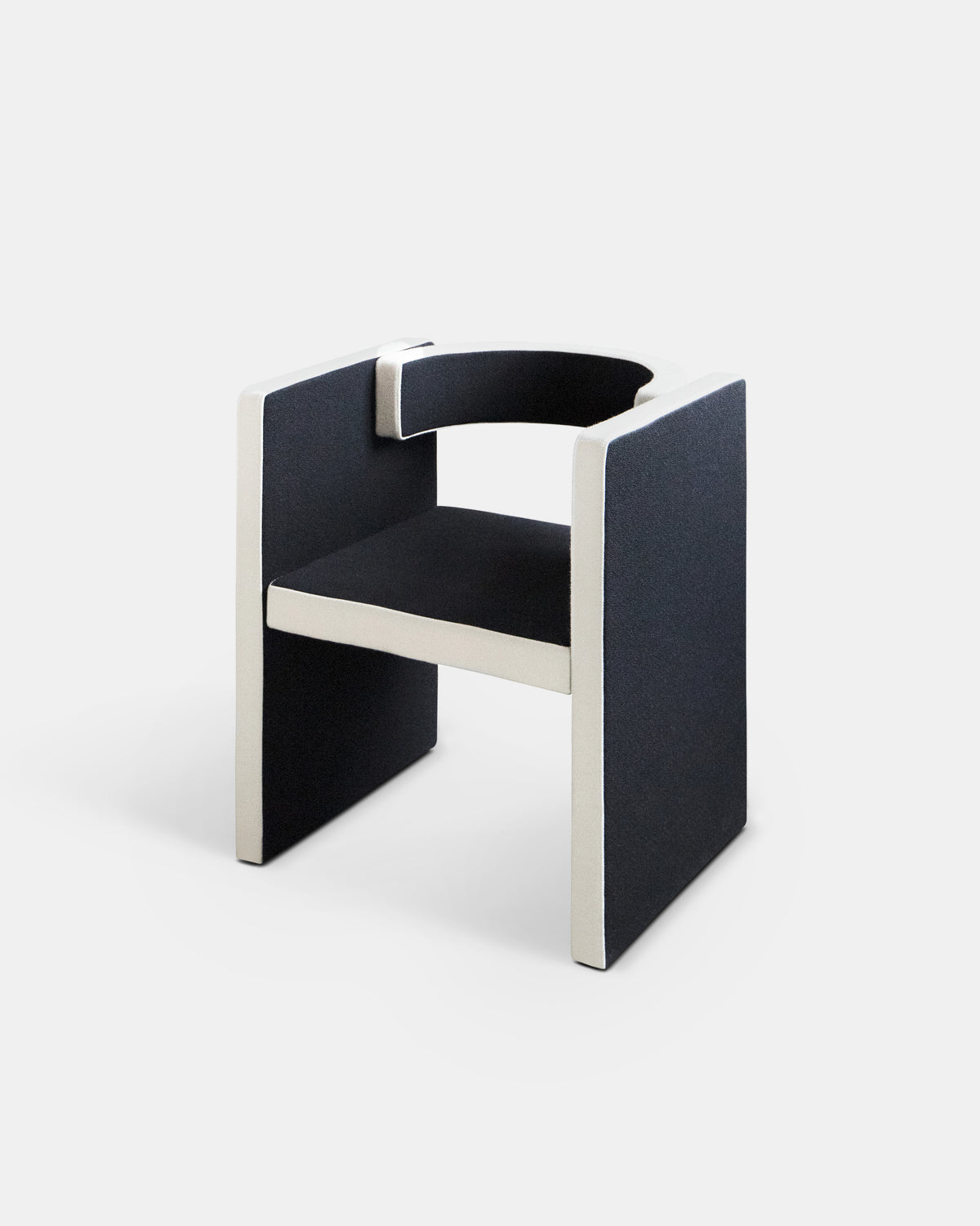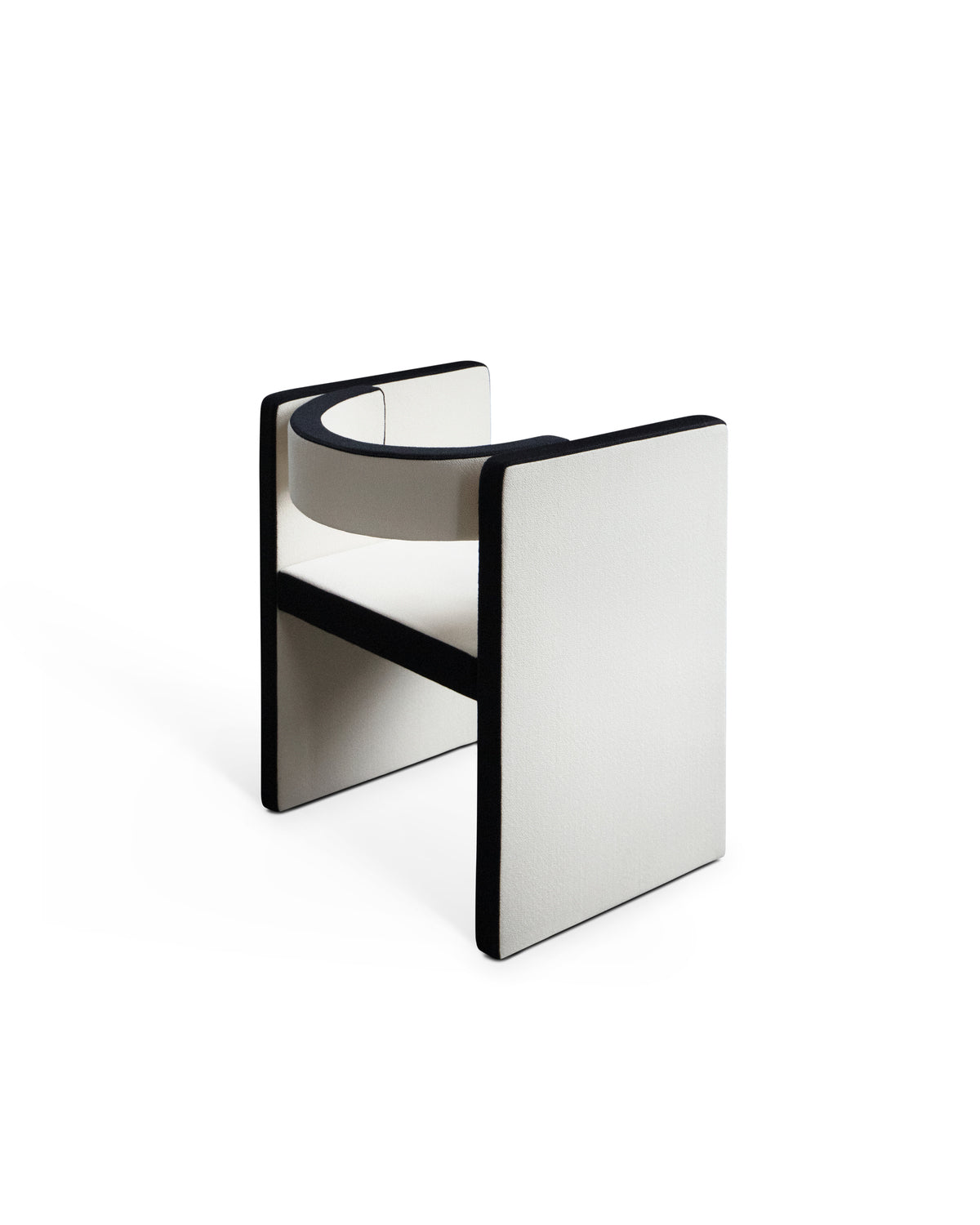 Rette rektangulære elementer slutter seg til den C-formede ryggen og gir setet en særegen og tidsriktig karakter. NOVEL-stolen henter inspirasjon fra moteverdenen. Det er et velkledd møbel som har et veldefinert, «stramt» uttrykk. Den kontrastfylte tofargevarianten fremhever silhuettene og forsterker omrisset. Det er en stol med en selvsikker holdning.