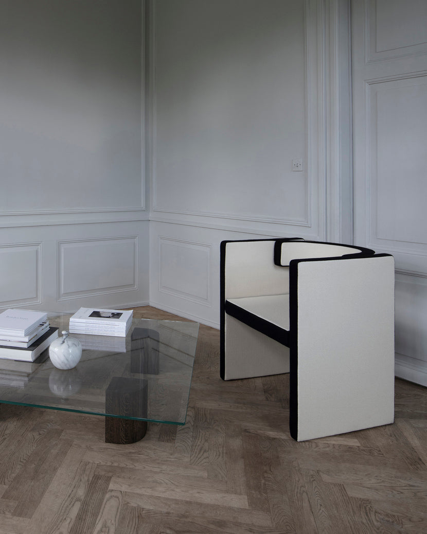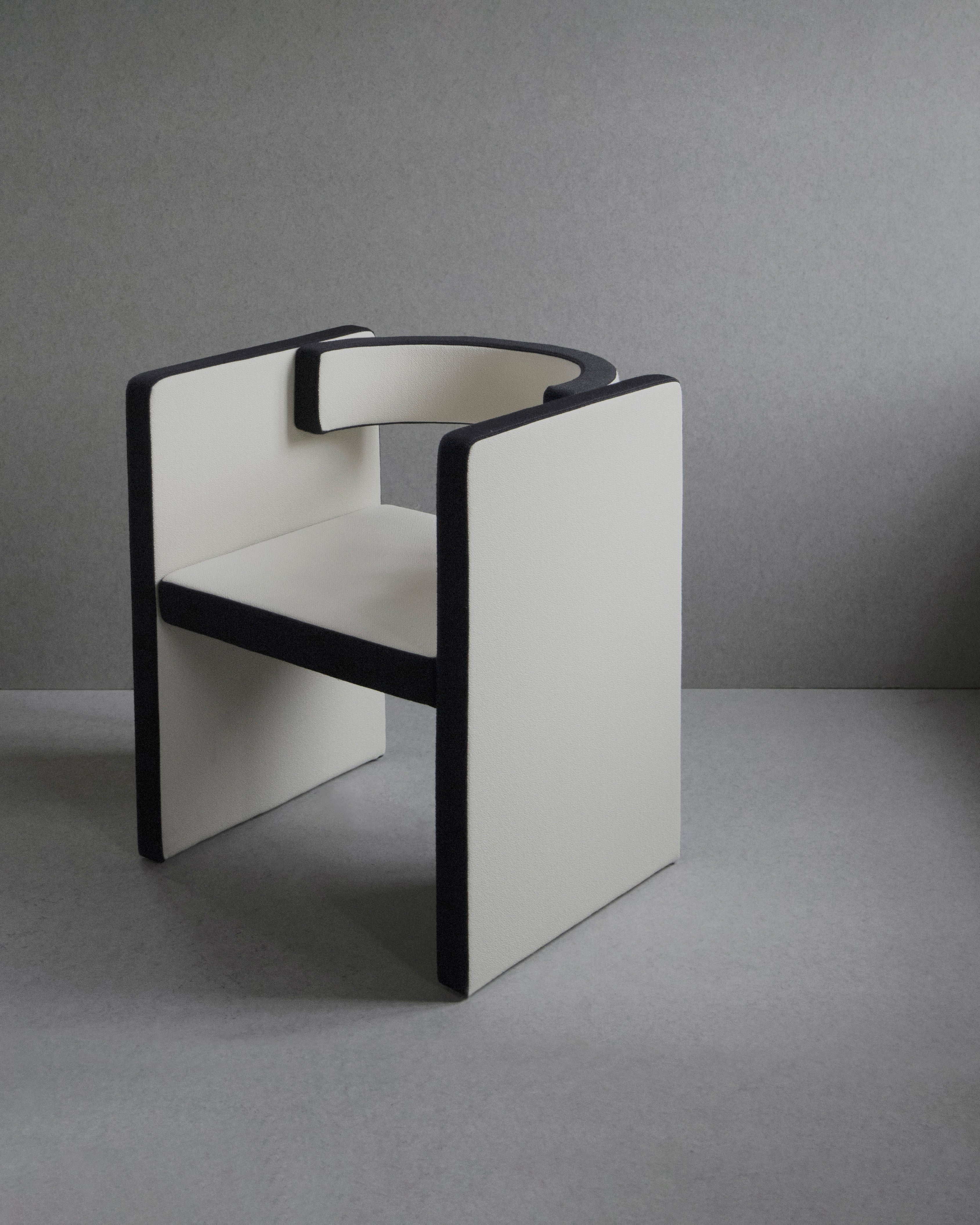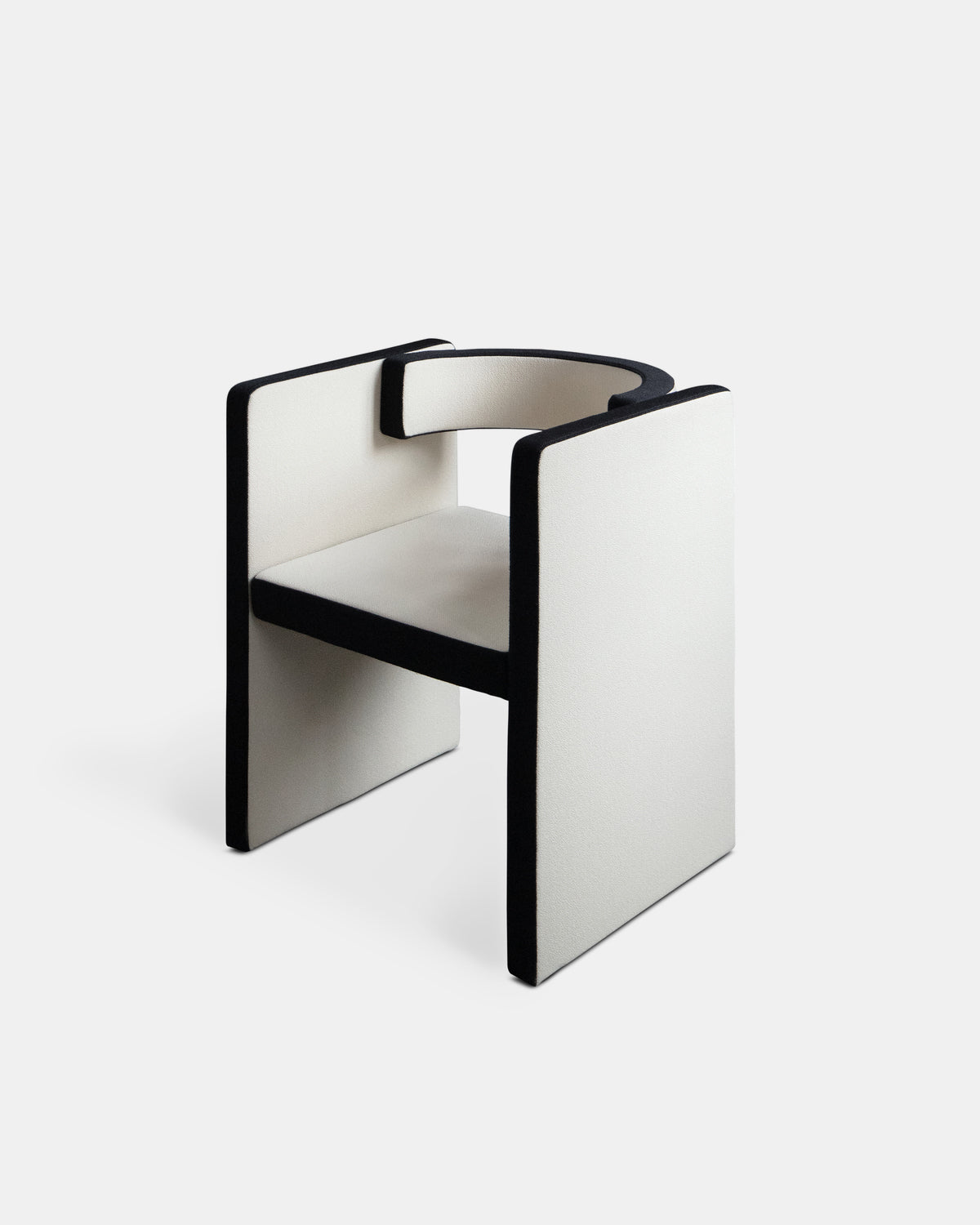 Rette rektangulære elementer slutter seg til den C-formede ryggen og gir setet en særegen og tidsriktig karakter. NOVEL-stolen henter inspirasjon fra moteverdenen. Det er et velkledd møbel som har et veldefinert, «stramt» uttrykk. Den kontrastfylte tofargevarianten fremhever silhuettene og forsterker omrisset. Det er en stol med en selvsikker holdning.