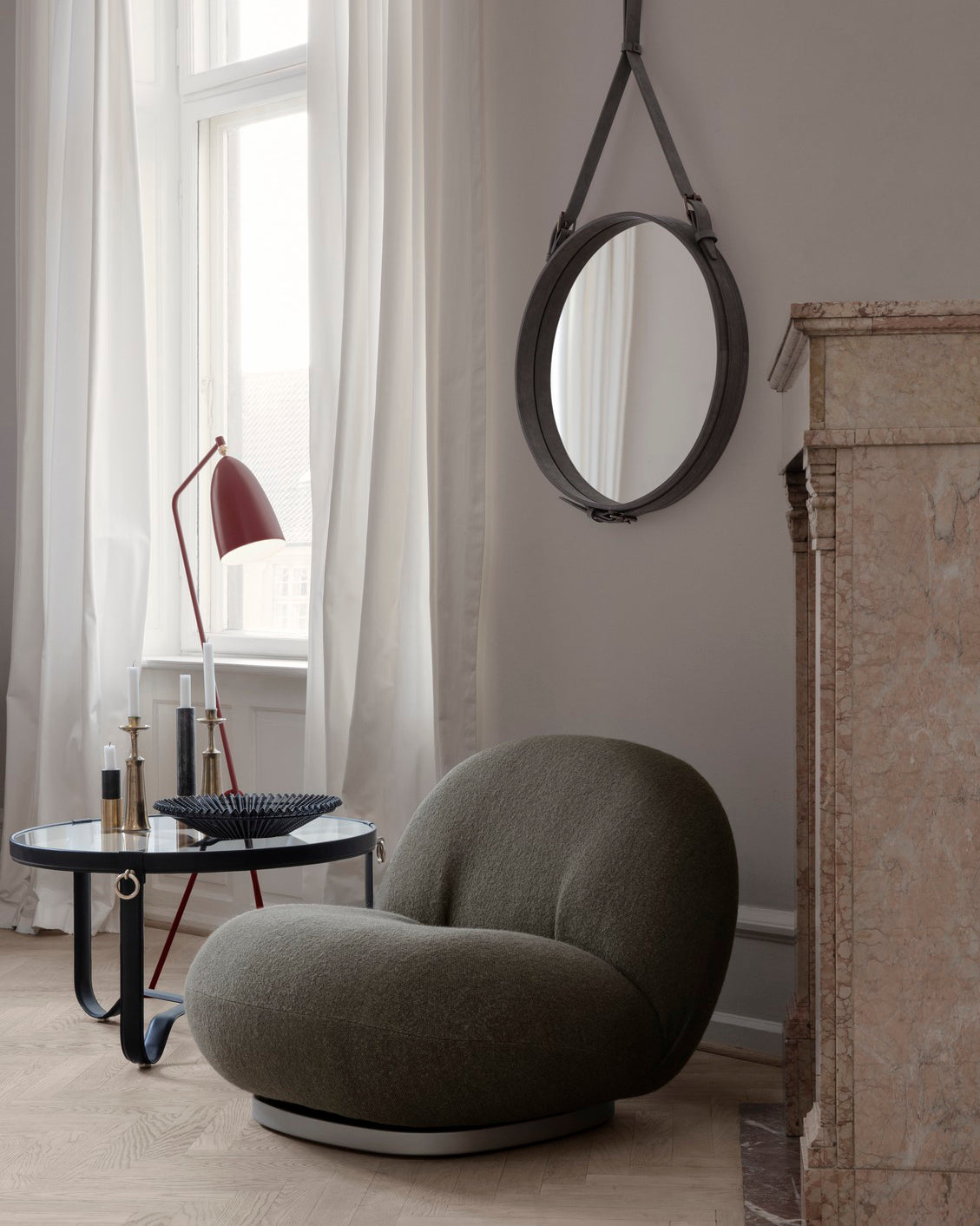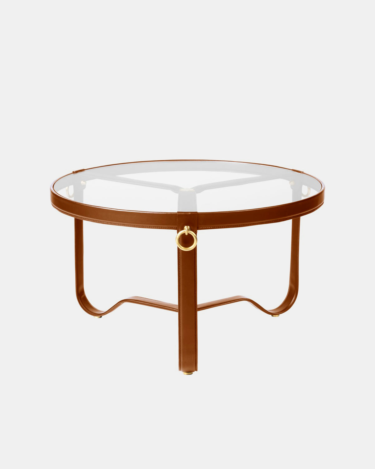 Den sirkulære glassplaten hviler på tre mykt buede metallben som møtes i bordets sentrum. Kanten er trukket i håndbearbeidet skinn og dekorert med tre messingringer, detaljer som gir bordet et raffinert, nesten smykkelignende uttrykk. Ø70-varianten passer perfekt som sofabord i mindre sittegrupper eller som sidebord, der det tilfører rommet karakter uten å dominere.
