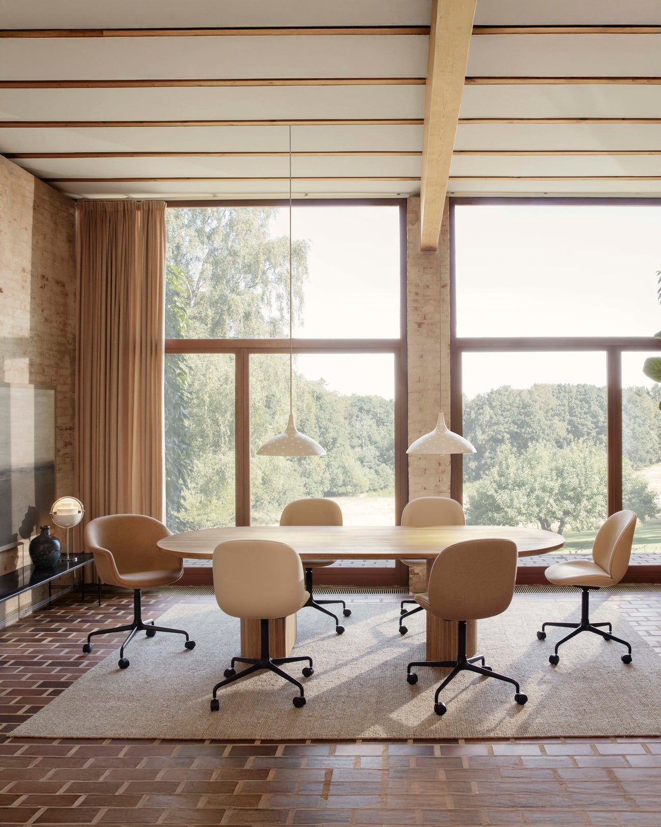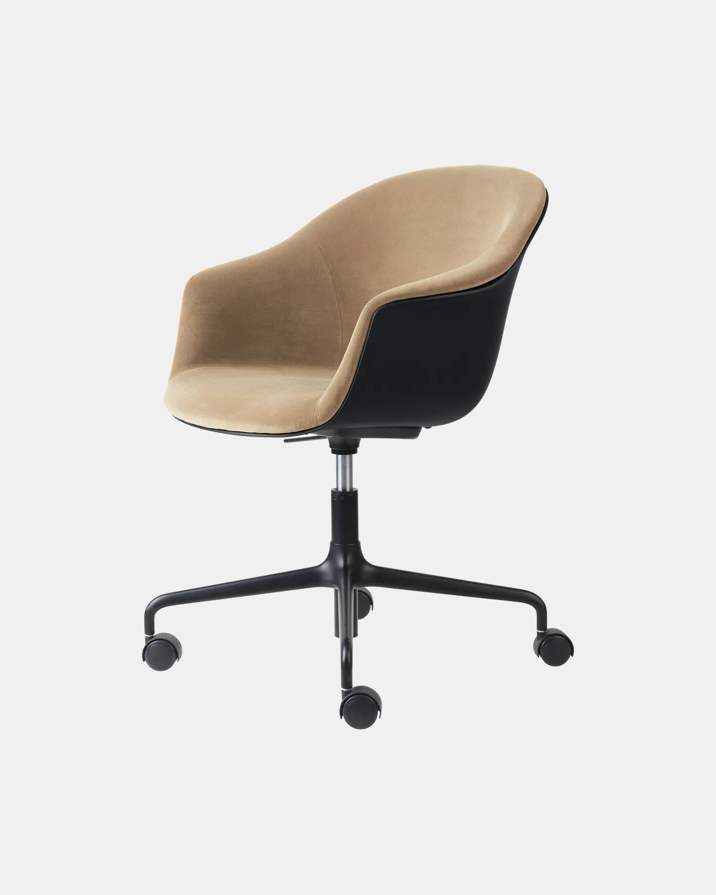 Bat Meeting Chair viderefører den karakteristiske, omsluttende silhuetten fra Bat-serien, nå tilpasset arbeidsplassens behov. Skallet med integrerte armlener favner kroppen på en naturlig måte, inspirert av flaggermusens vingespenn, og kombinerer skandinavisk håndverkstradisjon med italiensk formsensibilitet. Resultatet er en stol som oppleves både presis og komfortabel, med et uttrykk som glir sømløst inn i alt fra hjemmekontor til møterom.