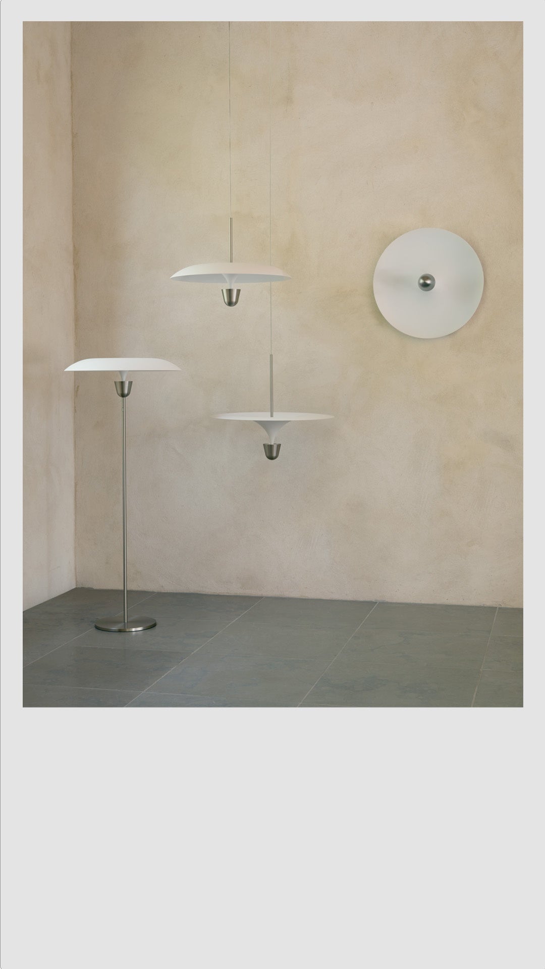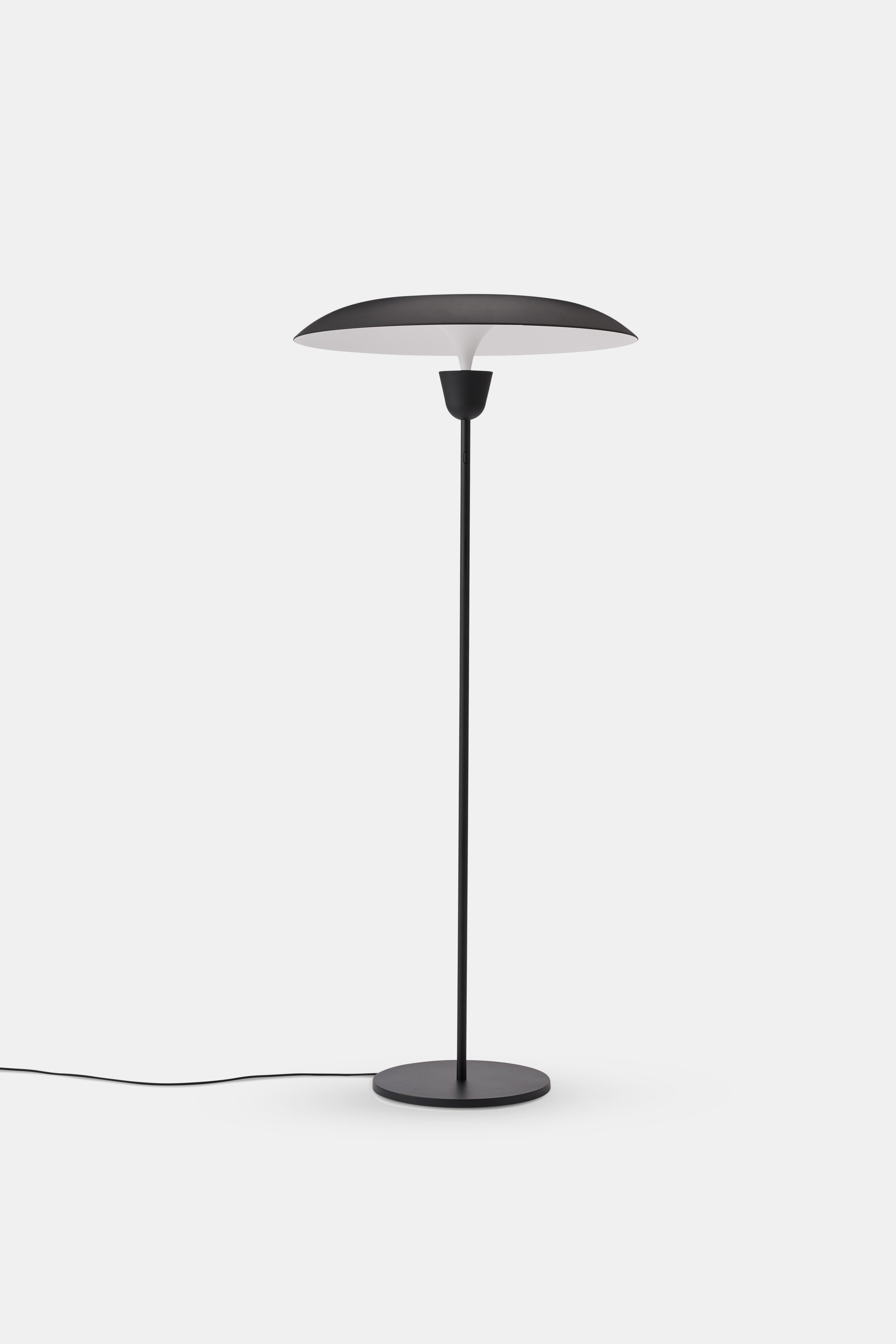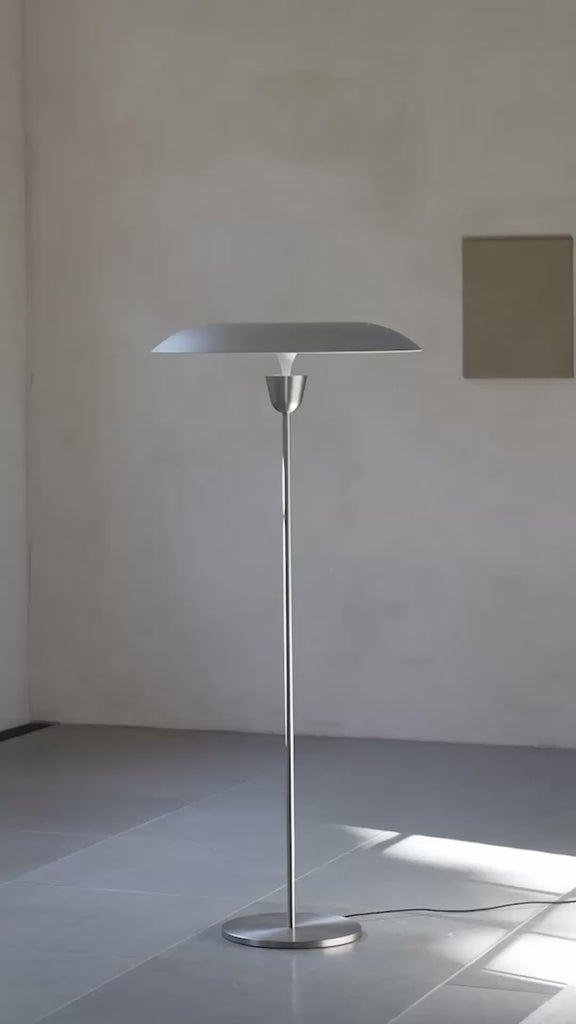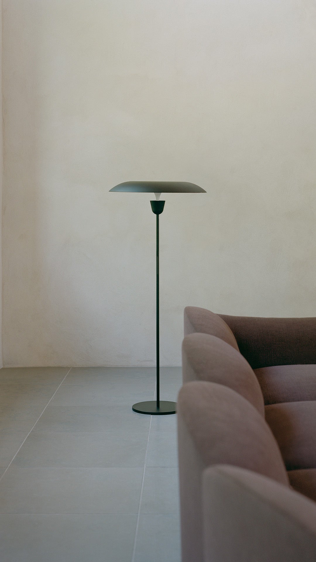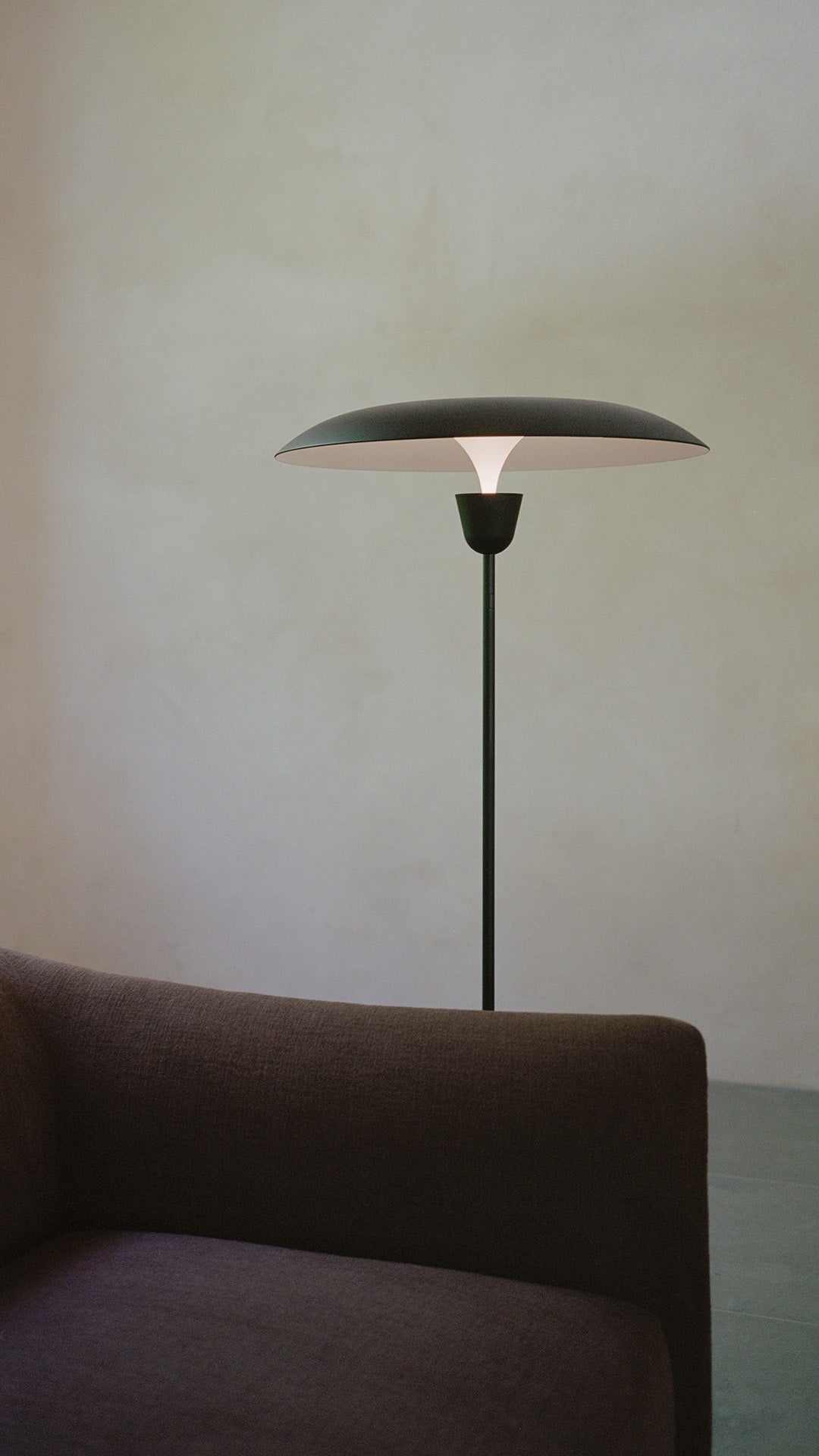 Kantarell gulvlampe bygger på kjente arketyper, men er utformet med en tydelig konturert form og et teknisk presist uttrykk. Reflektoren er formet som en omvendt trakt og fordeler lyset jevnt utover fra lyskilden, som er plassert sentralt og lite synlig. Lampen slås på med et enkelt trykk på en integrert knapp. Driveren er plassert ved støpselet, noe som bidrar til et ryddig og stramt design med fokus på presisjon og funksjon.