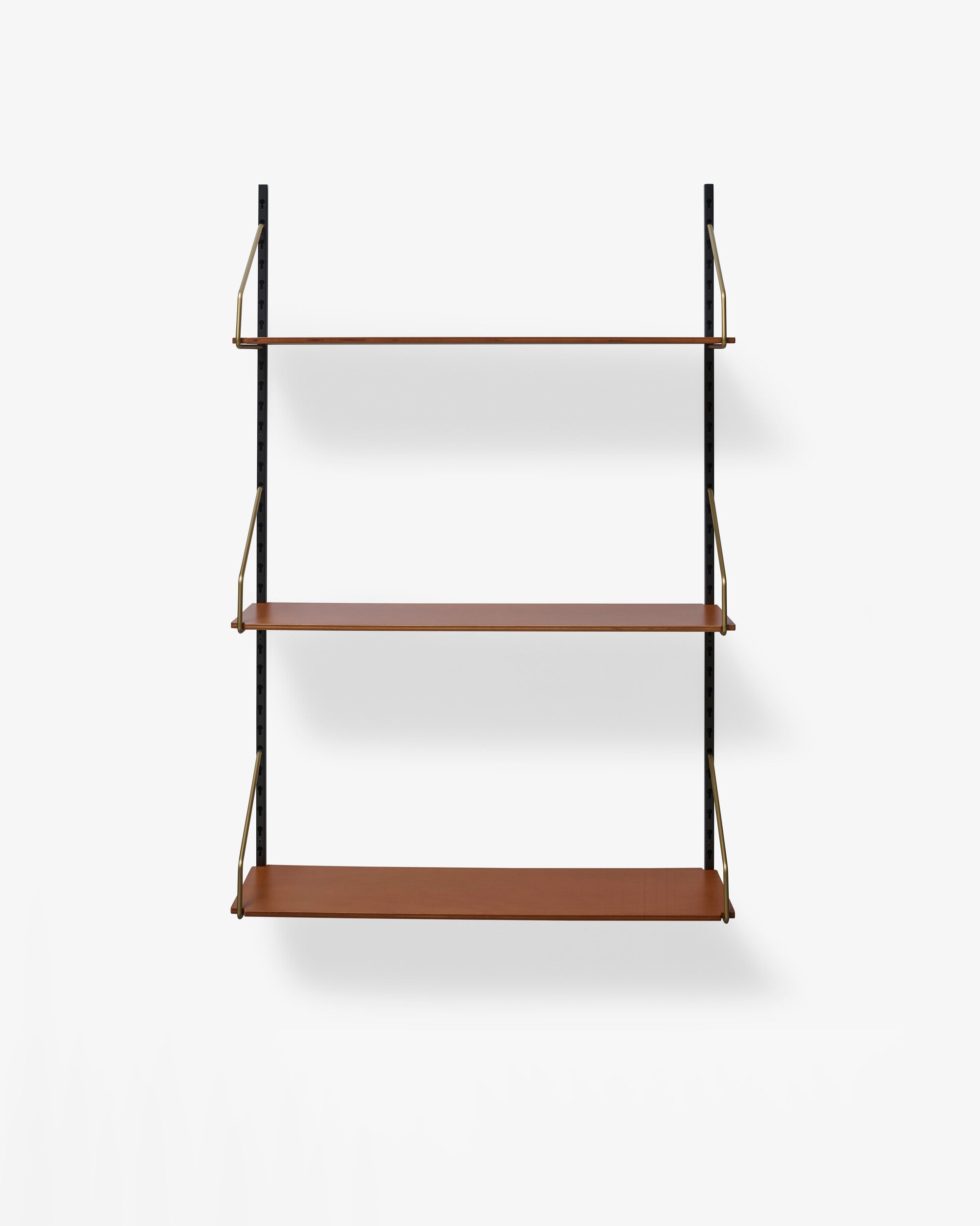 Hyllen består av bronselakkerte stålveggstendere. Hyllestøttene er laget av messinglakkert stål og hyllene i beiset bøkfinert kryssfiner.