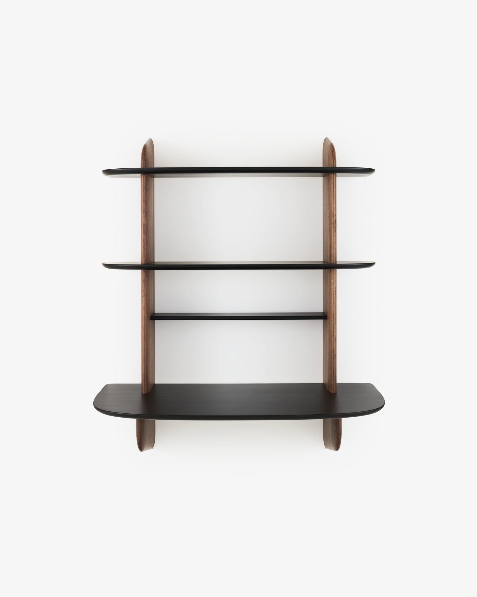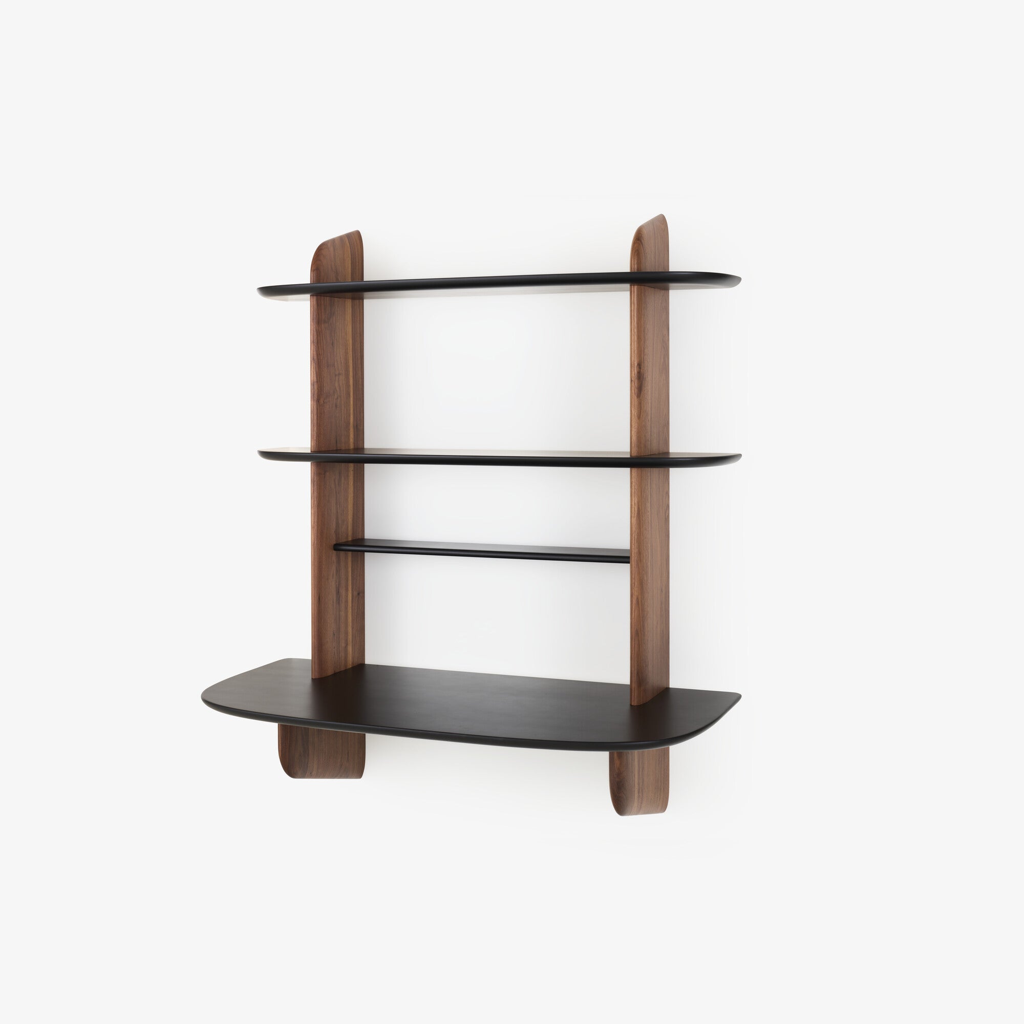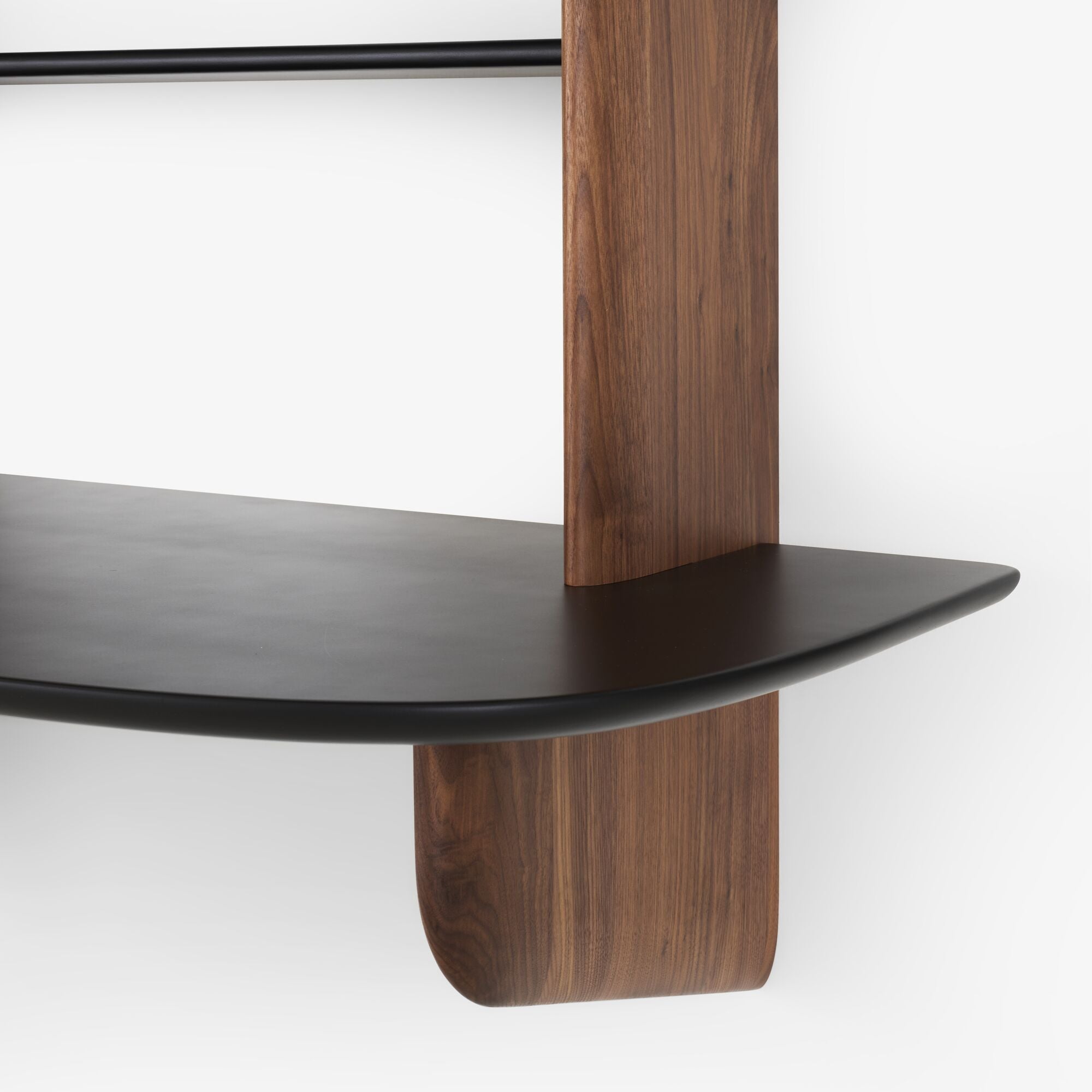 Materialer: Solid amerikansk valnøtt (med naturlig lakk) vertikal støtte og hyller i sateng svart lakkert MDF