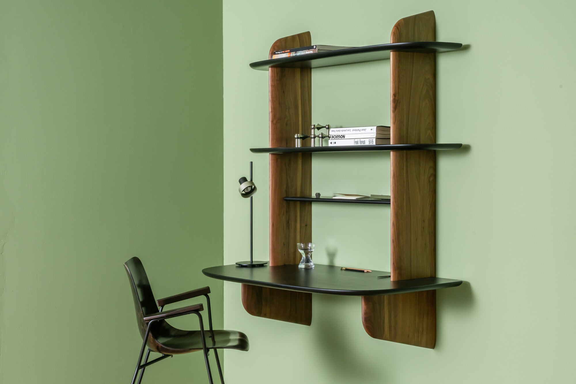 Intervalle veggmontert skrivebord, designet av Guillaume Delvigne for Ligne Roset, er et nytt tillegg til Intervalle-familien, etter konseptet med oppbevaringsløsninger med subtilt buede silhuetter. Denne veggmonterte hyllen har et integrert skrivebord laget av vertikale stendere i massivt tre som støtter lakkerte mdf-hyller.