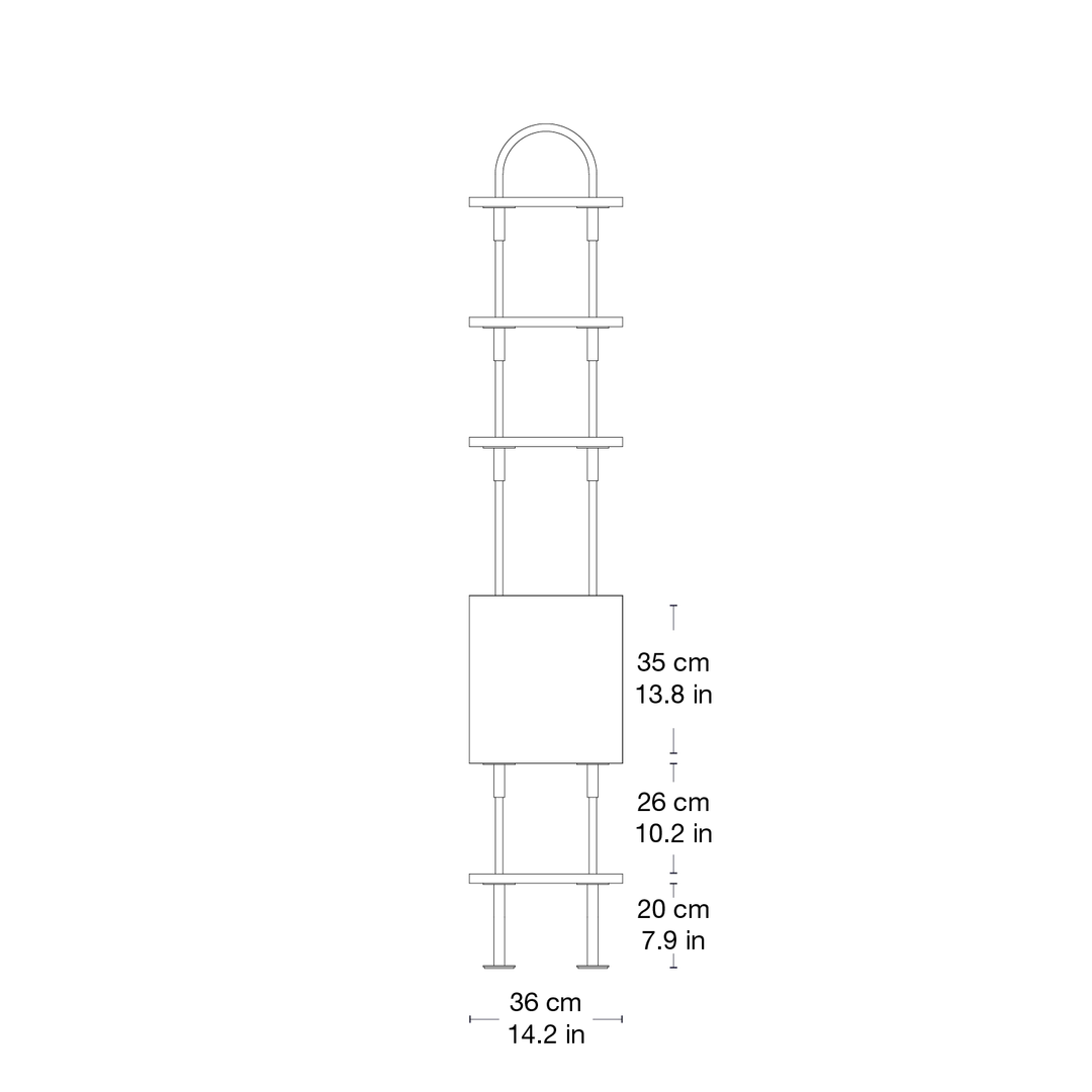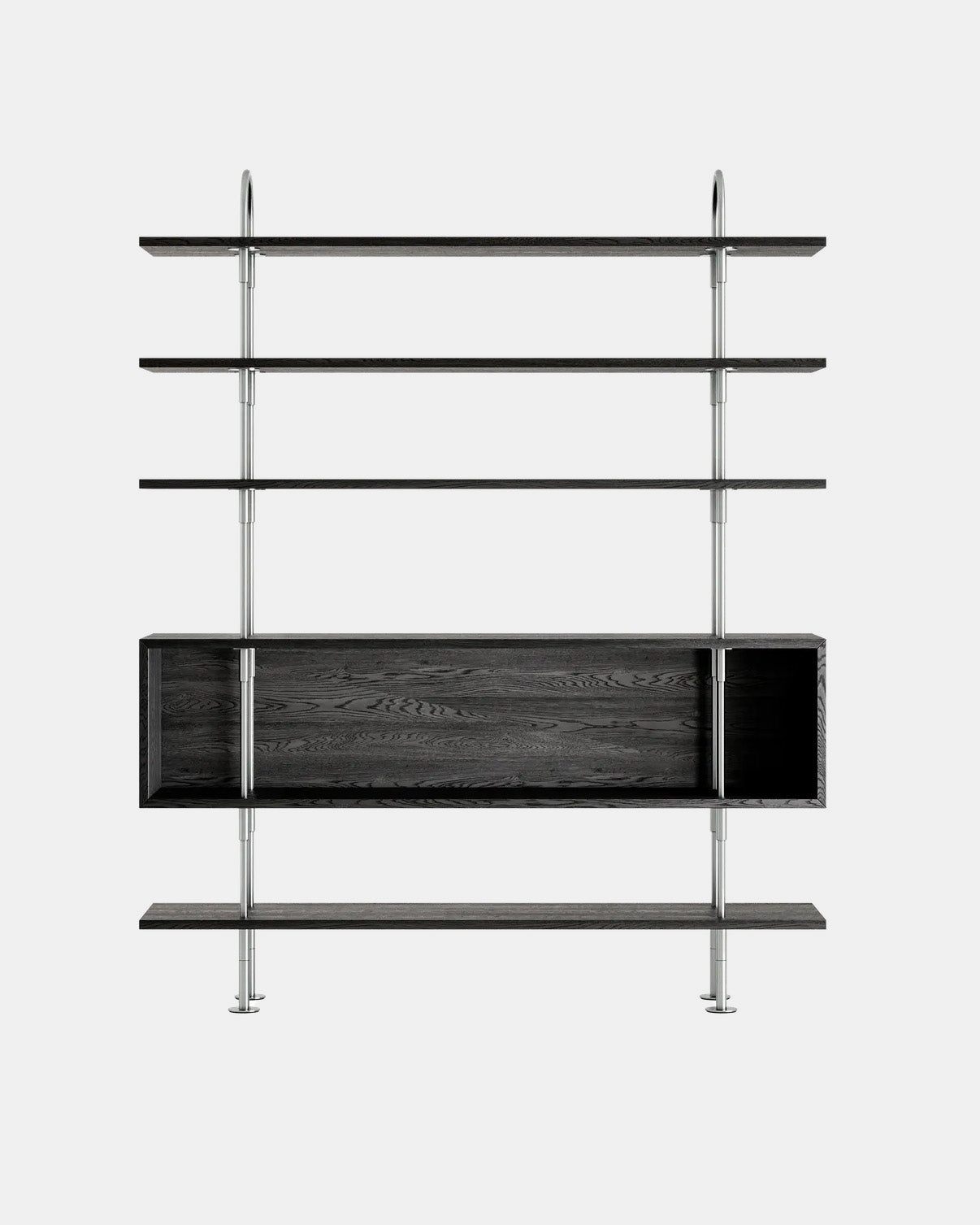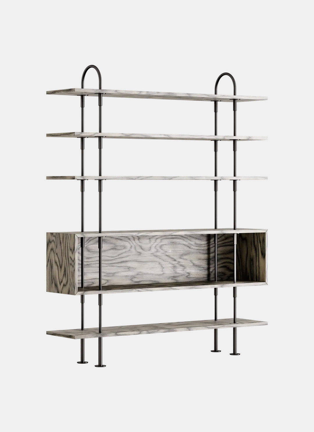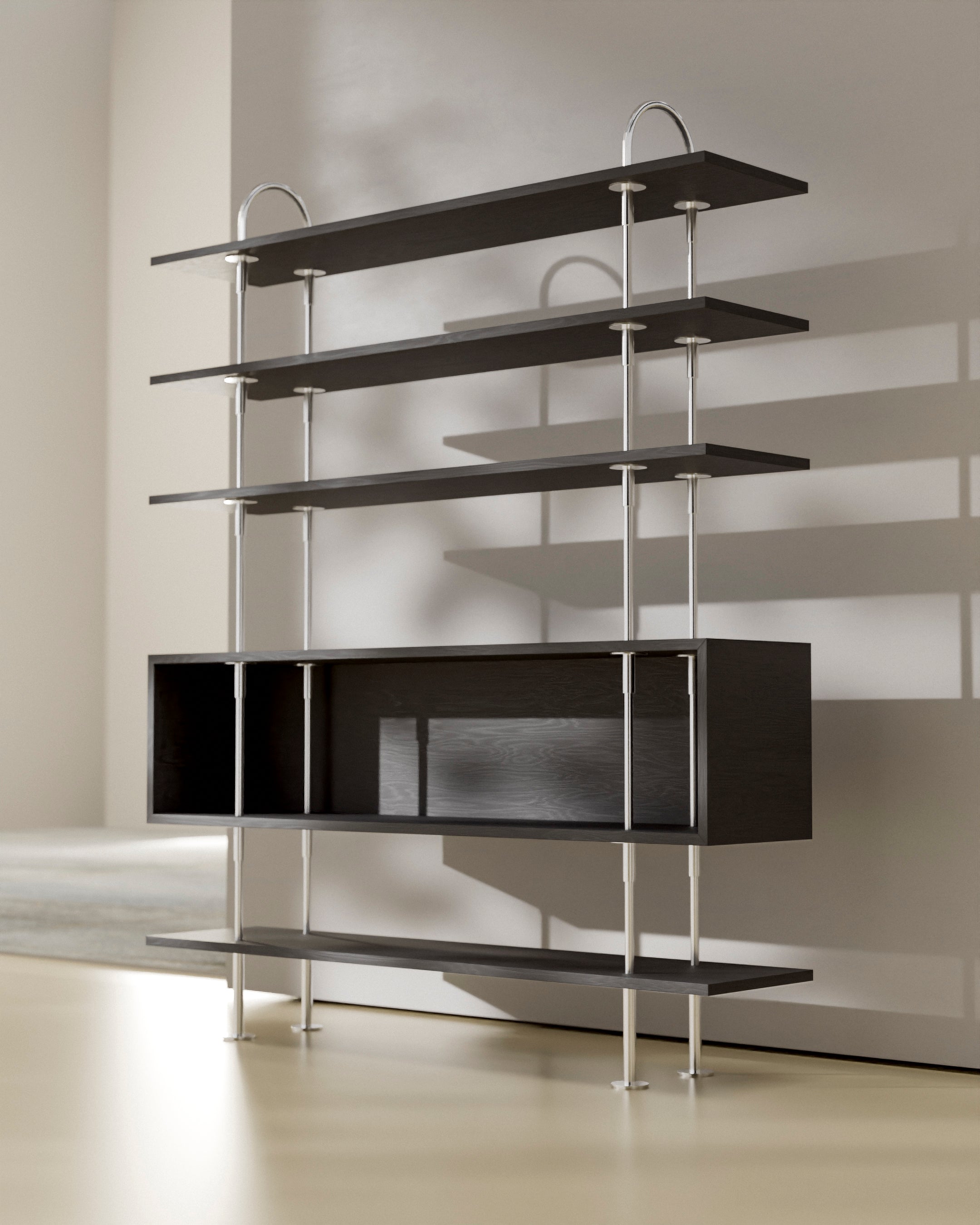Keen kjennetegnes av sin intuitive konstruksjon med vertikale metallstenger, presise braketter og myke buer som avslutning på toppen. De markante føttene løfter hyllen visuelt fra gulvet og gir en letthet som står i fin kontrast til den solide konstruksjonen. Resultatet er et hyllesystem med både karakter og fleksibilitet, like egnet til private hjem som til kontor, hotell og restaurant.