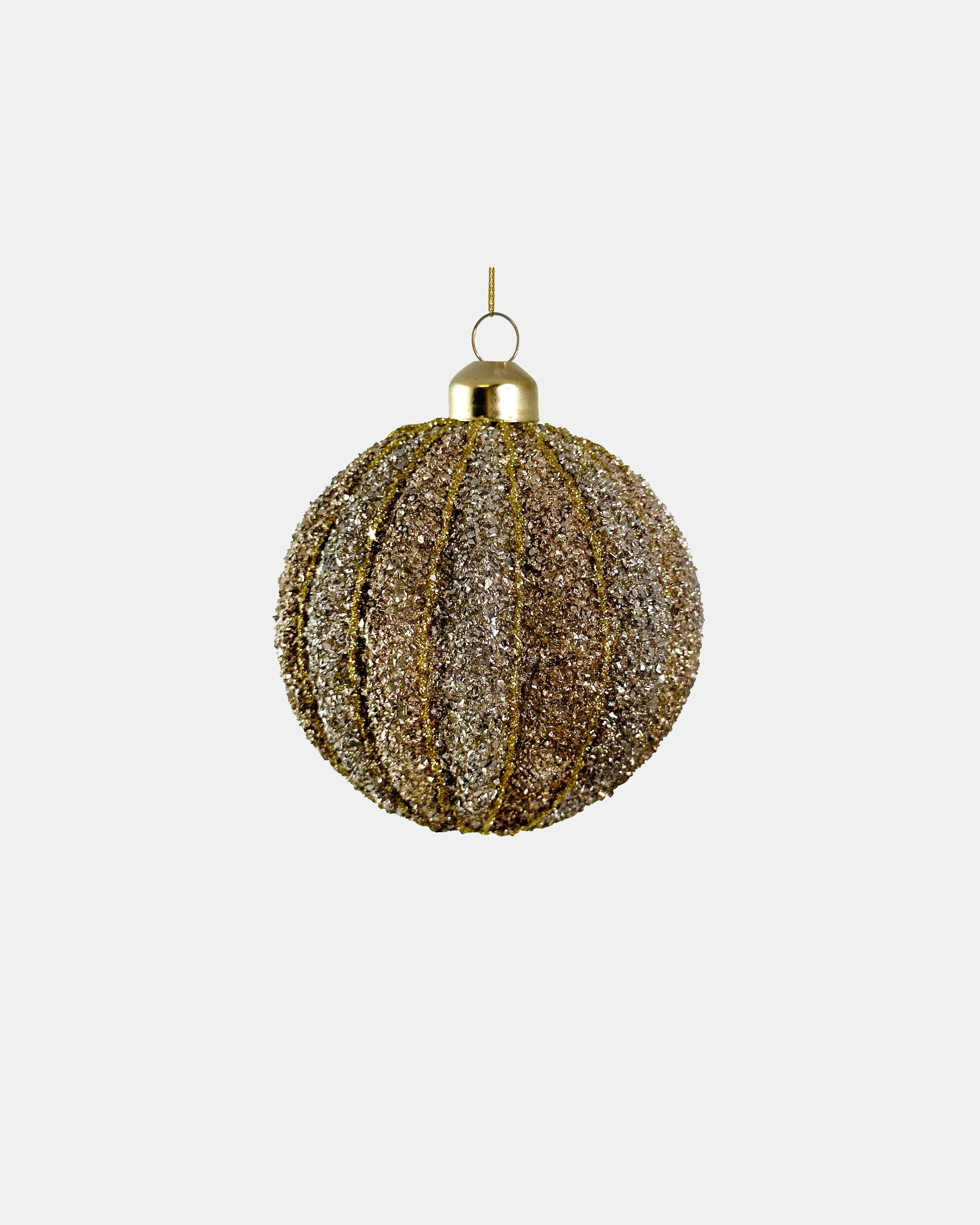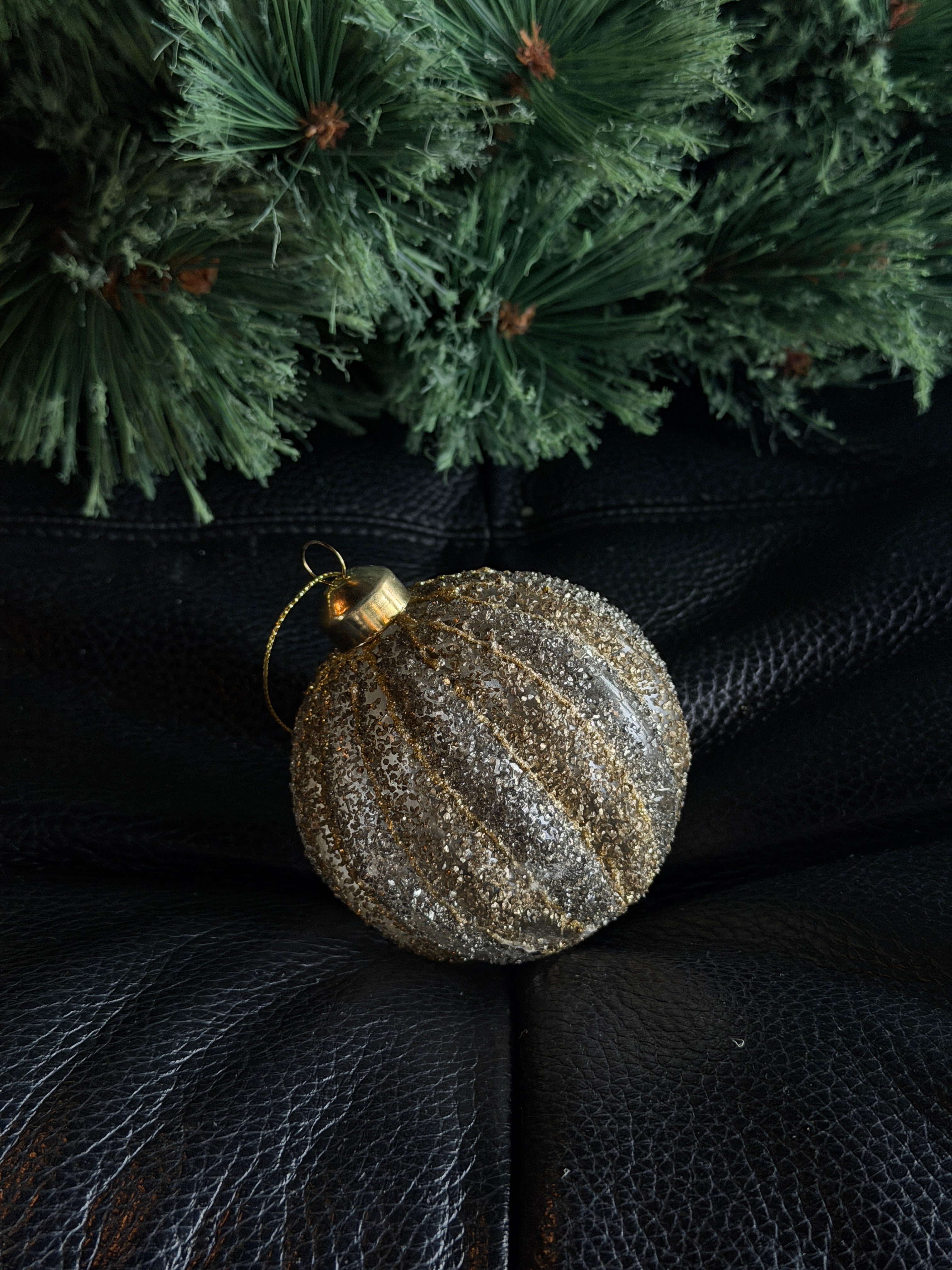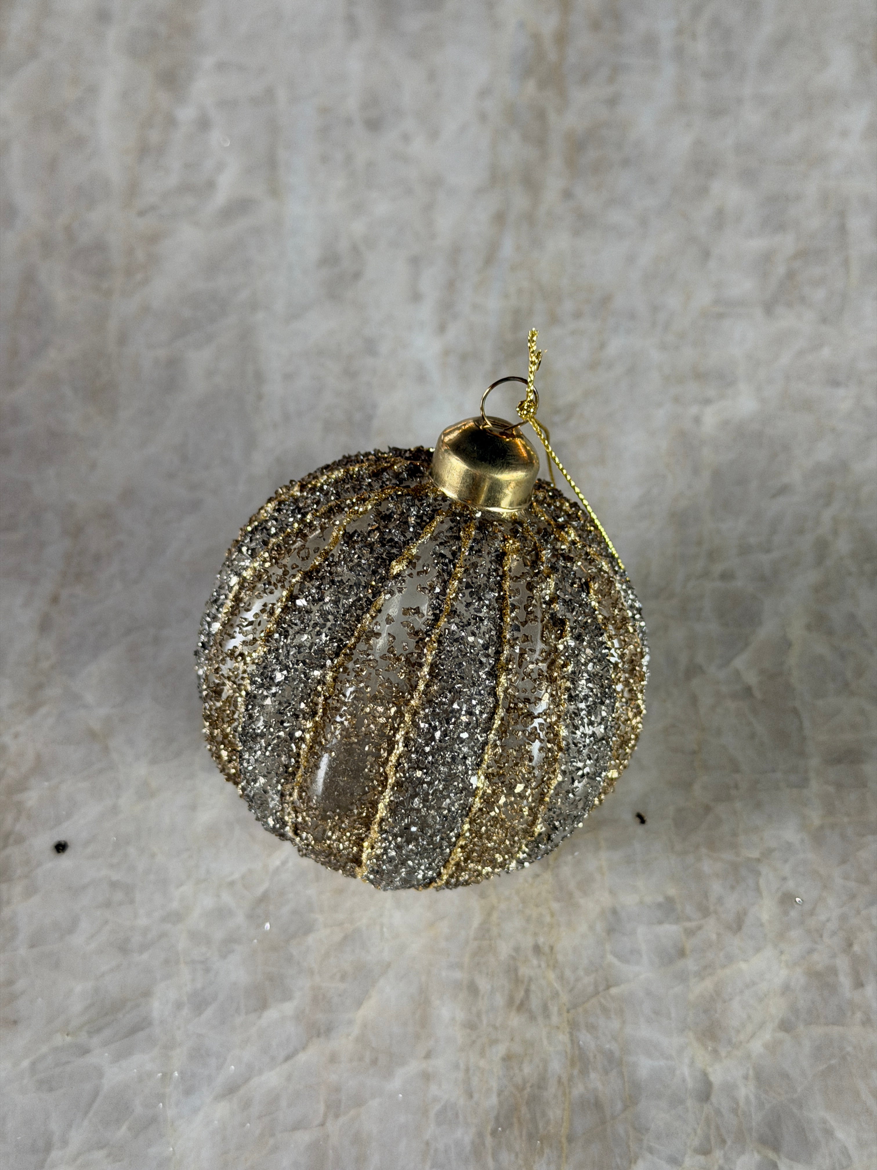 Dekorativ og glitrende julekule i antikk glitrende sølv med gullstriper.