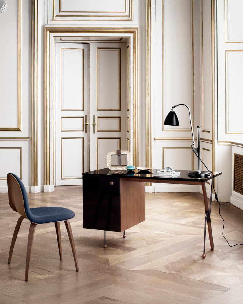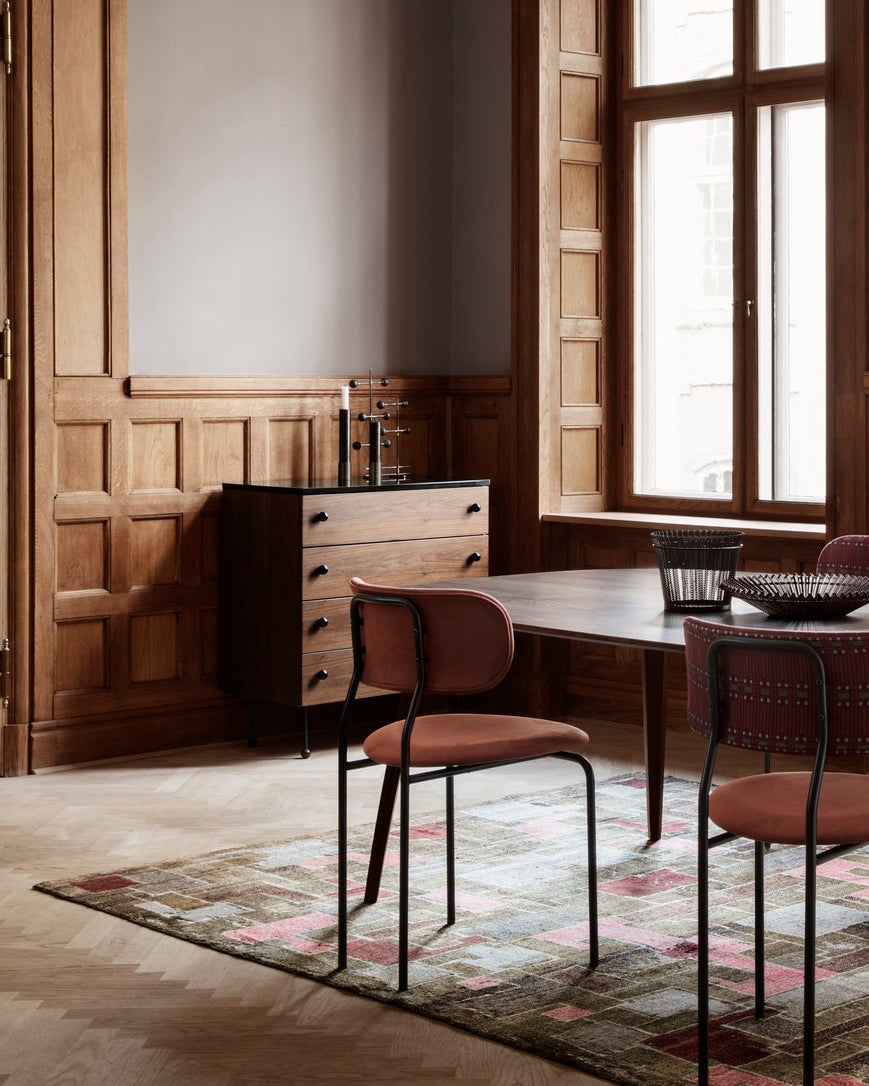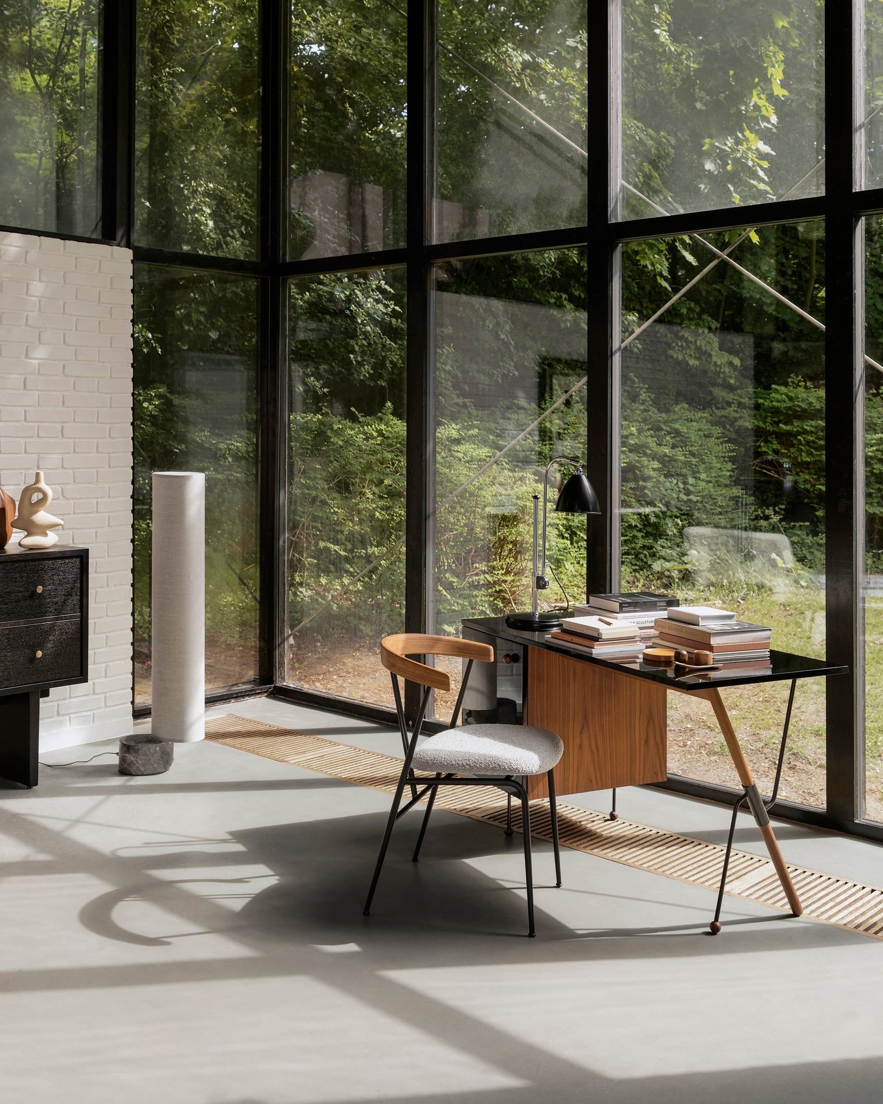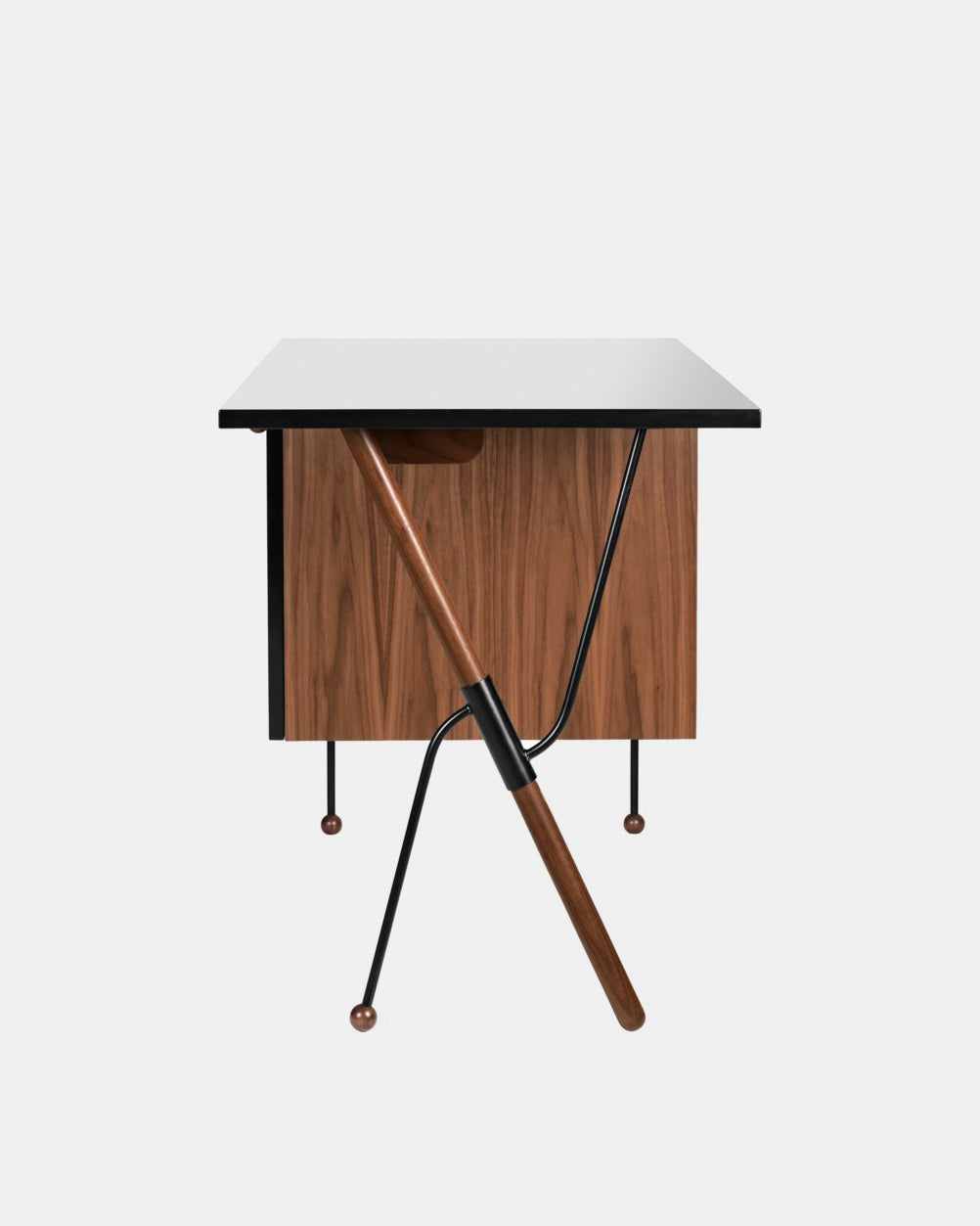 De slanke metallbeina med kuleformede føtter, et karakteristisk trekk ved Grossman, kontrasterer den skarpe rektangulære formen i luksuriøs amerikansk valnøtt og gir møblene et lett og nesten svevende uttrykk.