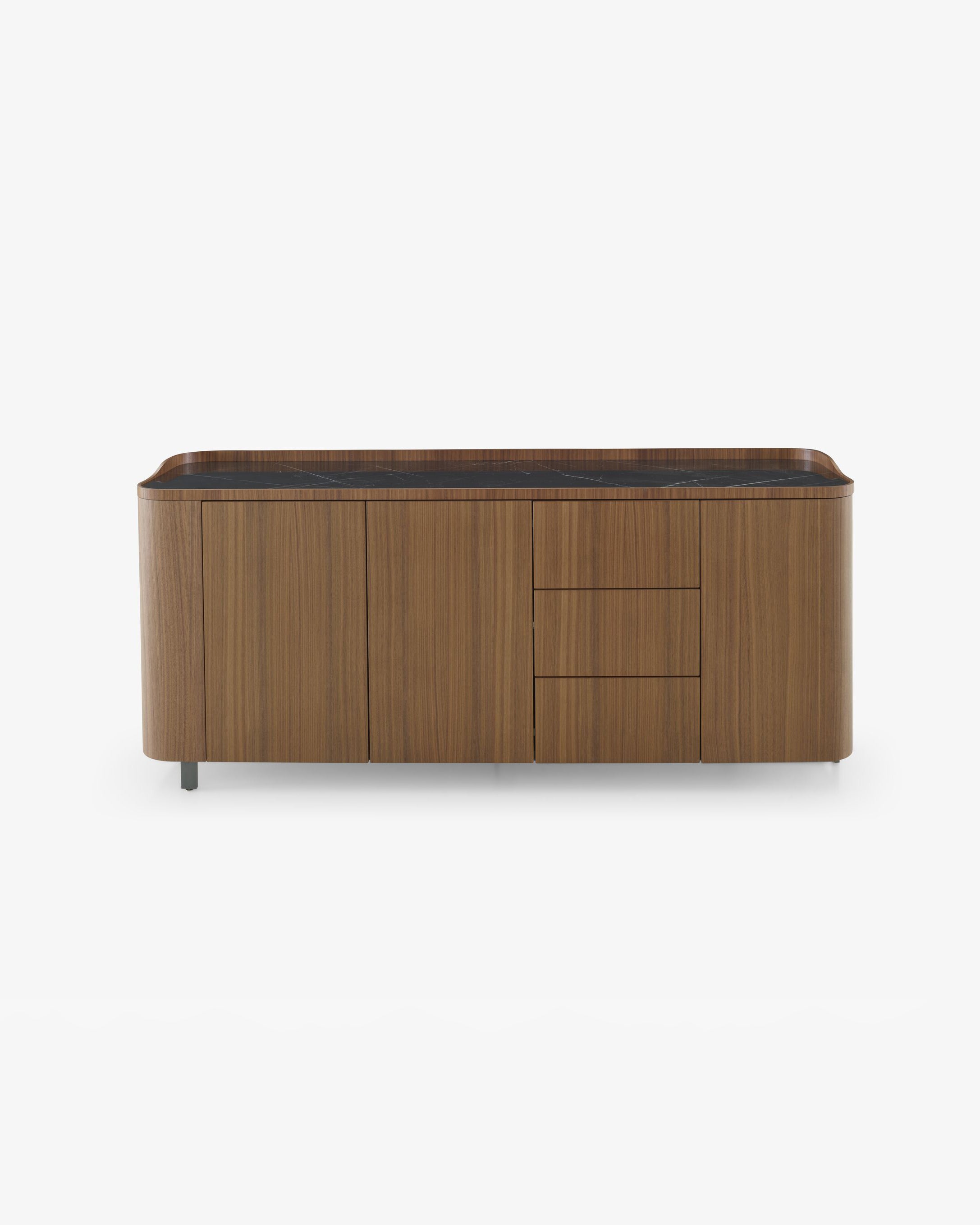 Mørk valnøtt & topp i sort marmoreffekt keramisk plate. Den mørke valnøttfineren, kombinert med den keramiske platen, gir en attraktiv tidløs kvalitet.