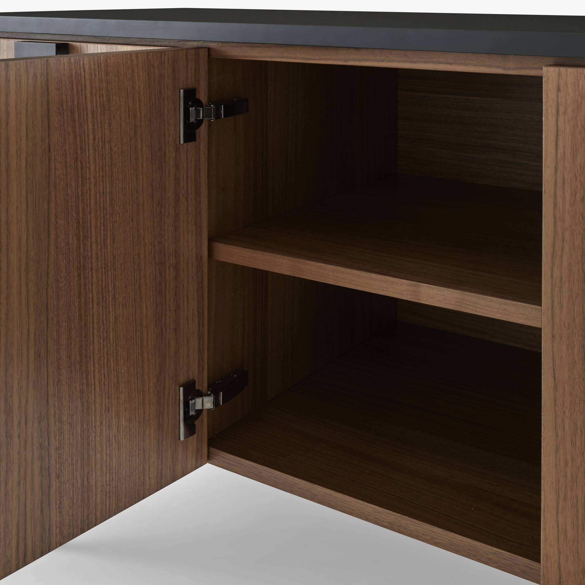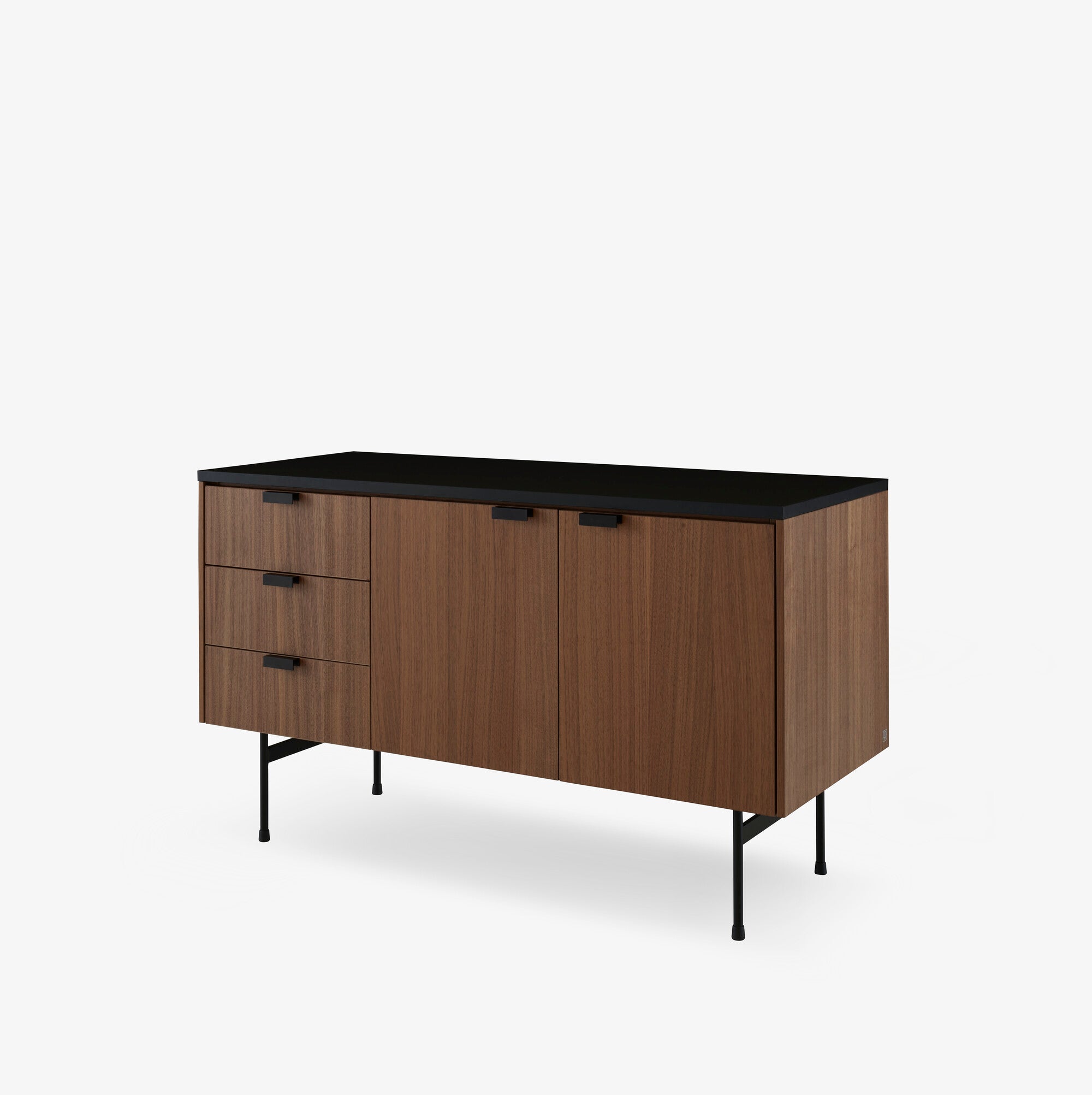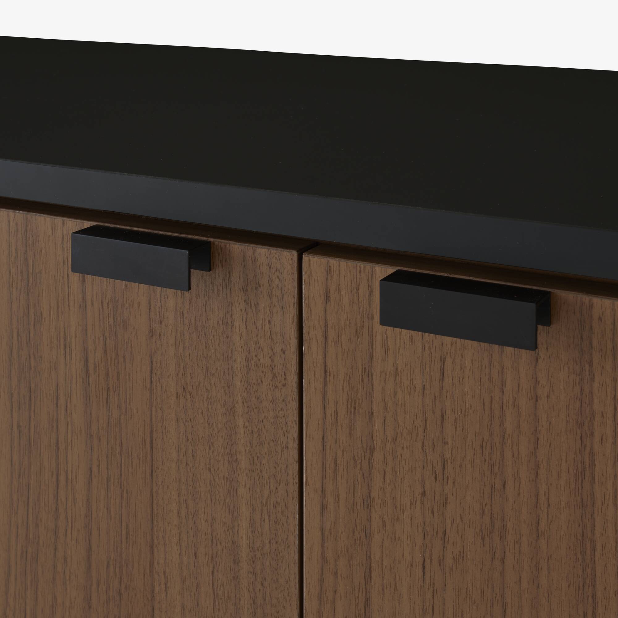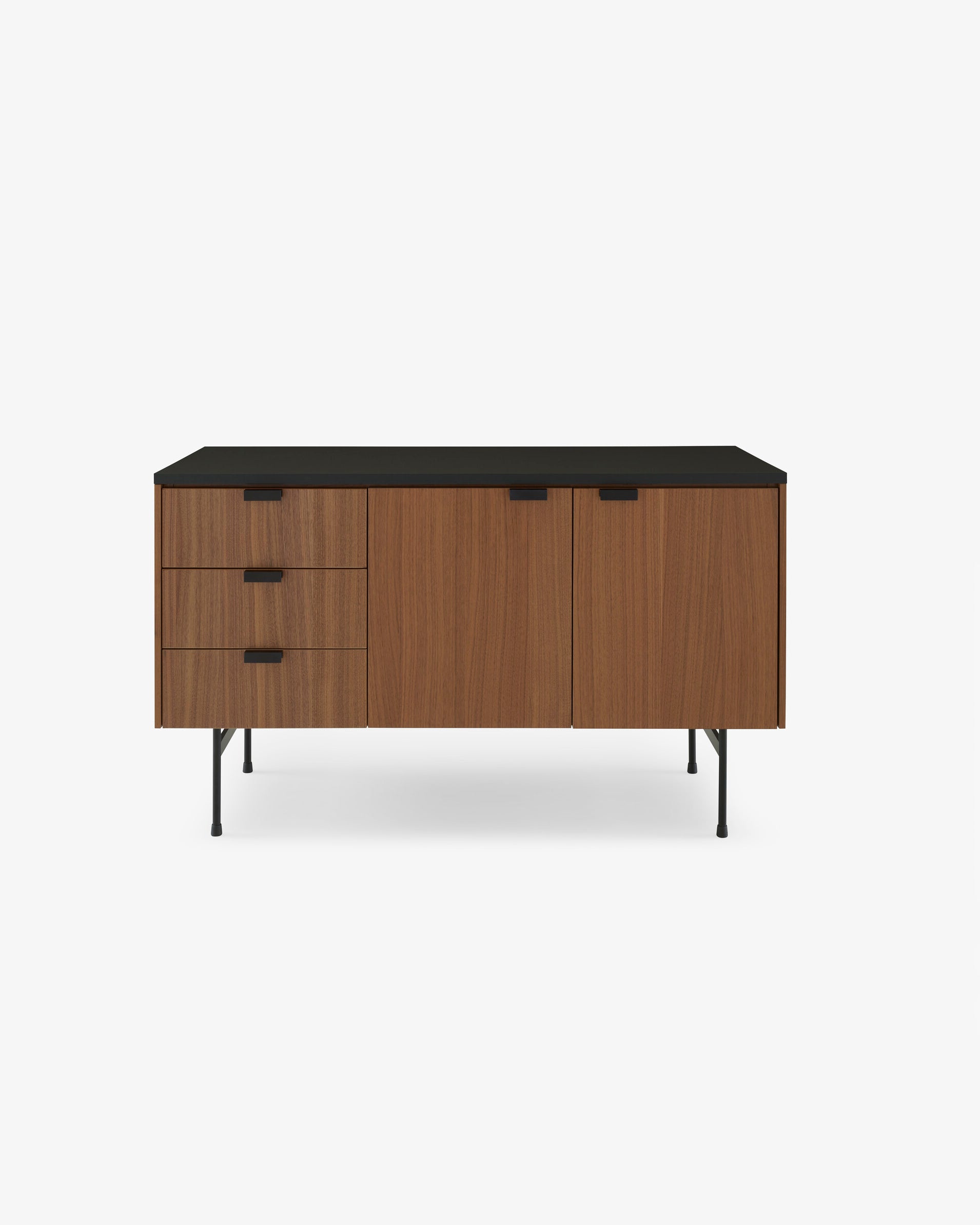 Tanis skjenk er laget av valnøttfiner og er ferdig med en myk ripebestandig laminat topp i svart, med lakkert stålbase og håndtak i matchende sort.
