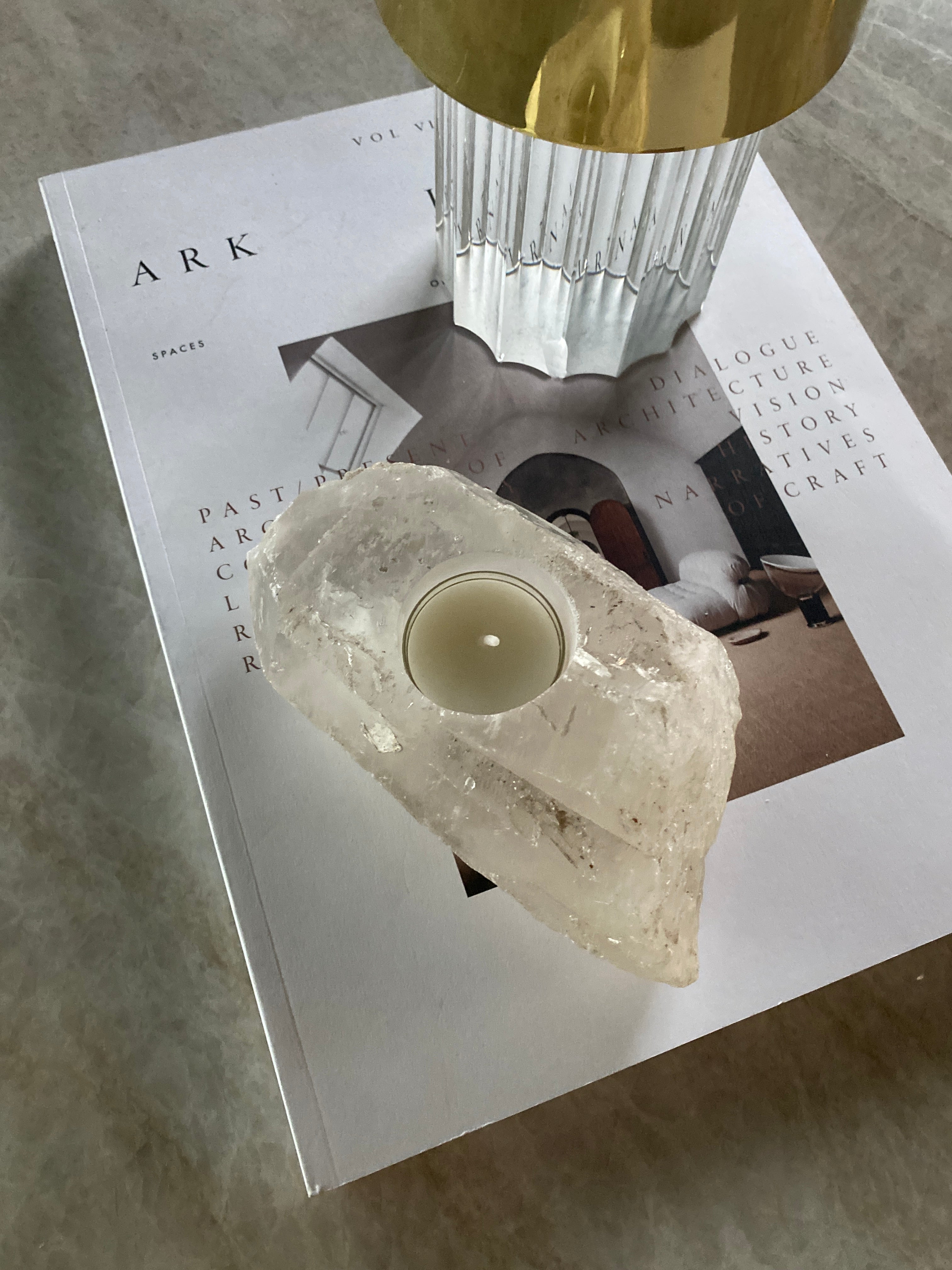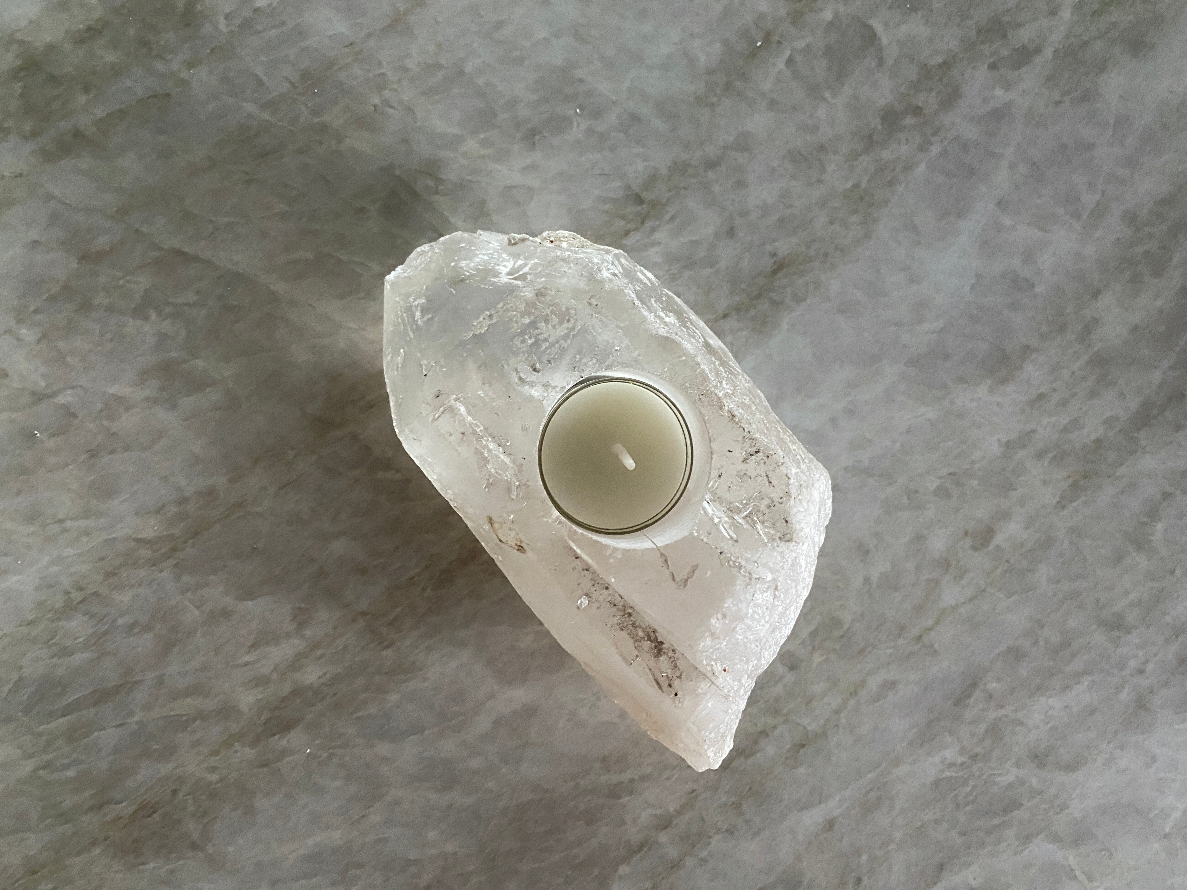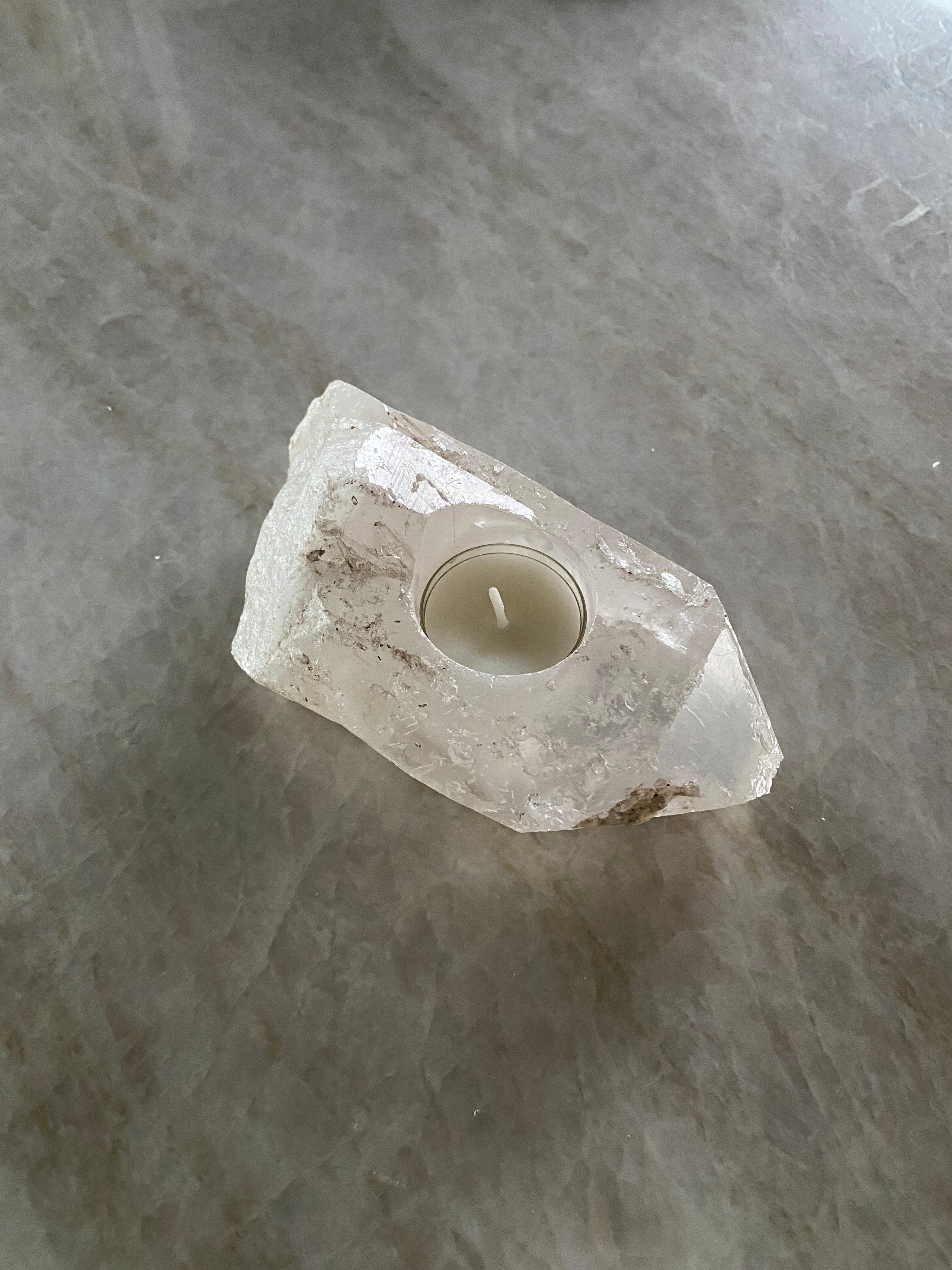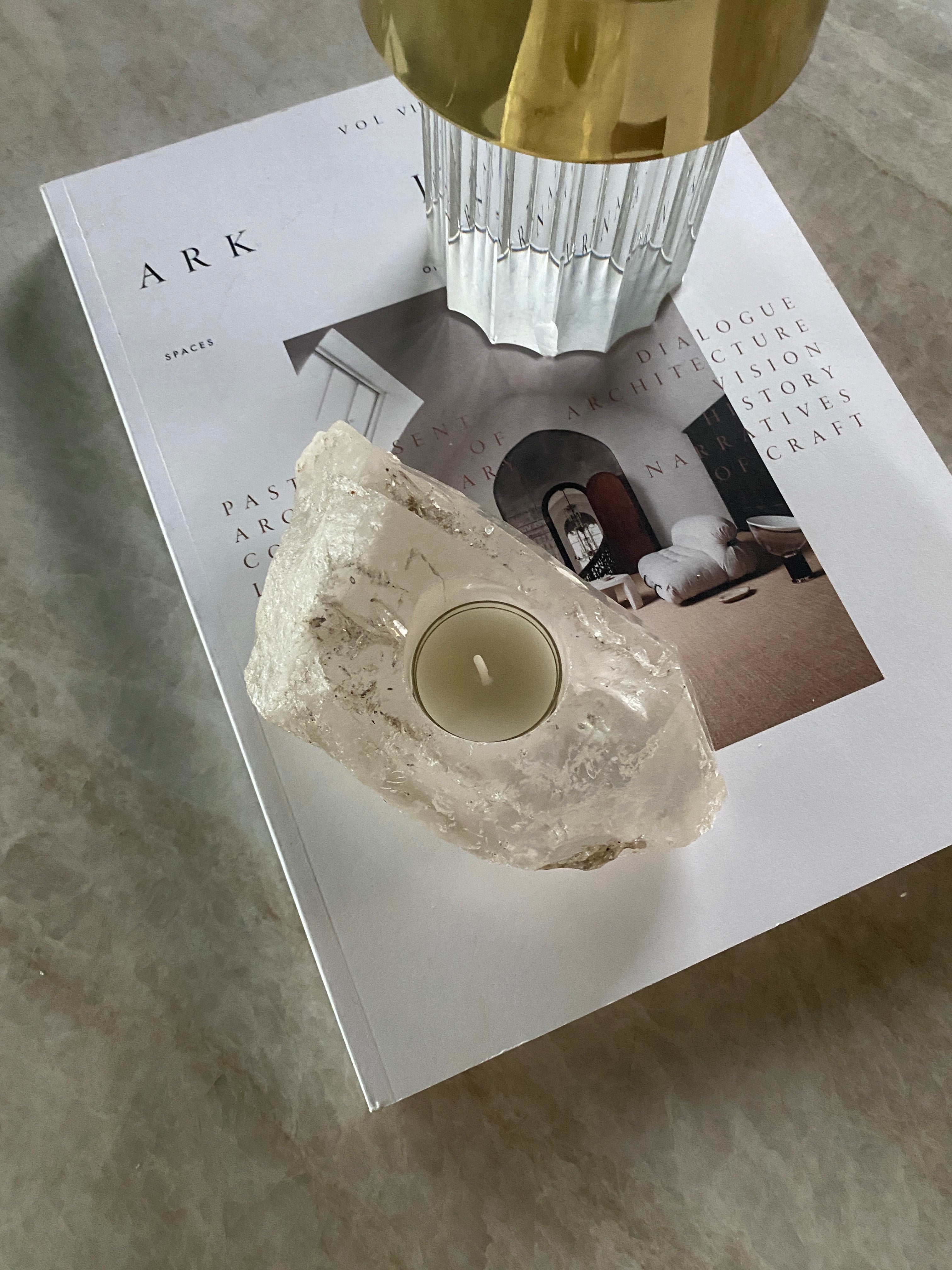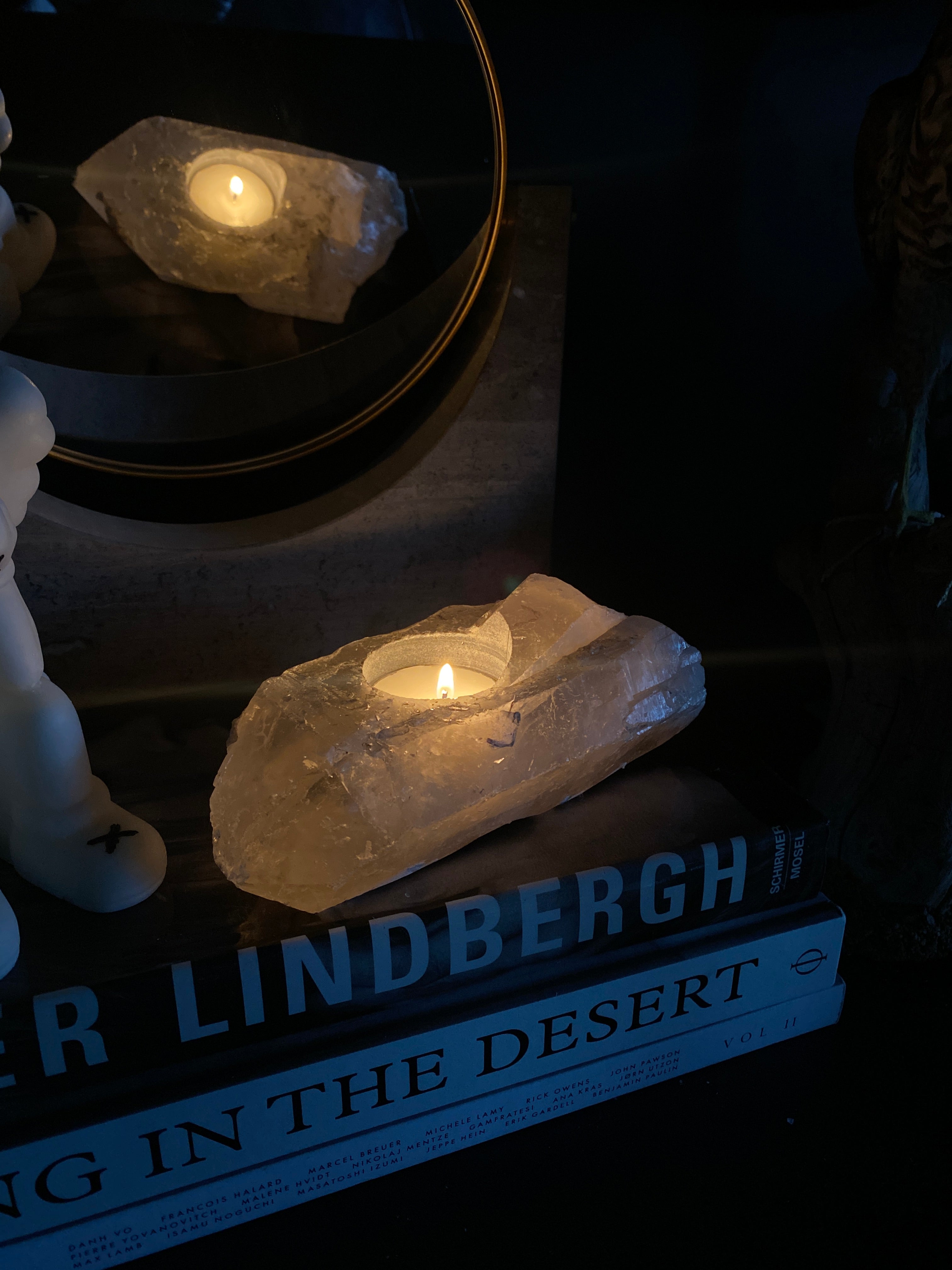 Telysholder i kvarts – et unikt naturstykke som kombinerer rå stein med mykt lys. Hver holder er håndlaget av ekte kvarts, og har sin egen form og struktur. Perfekt som dekorasjon eller som en stemningsfull detalj i hjemmet.