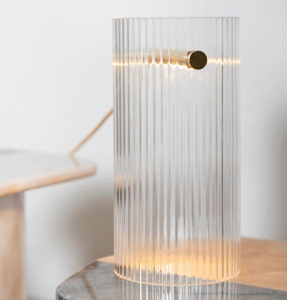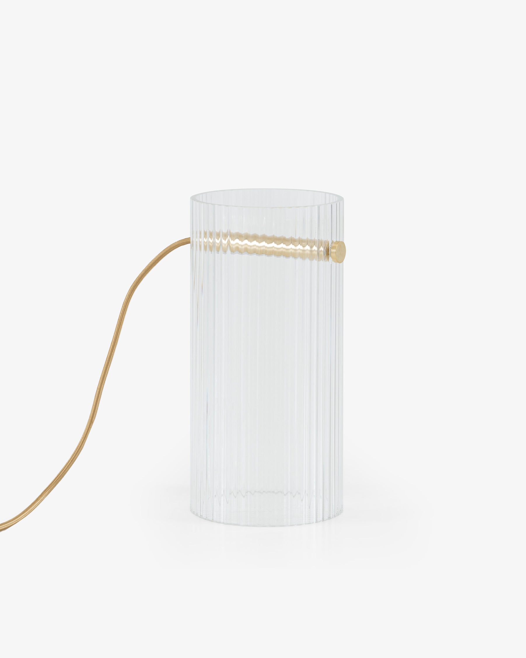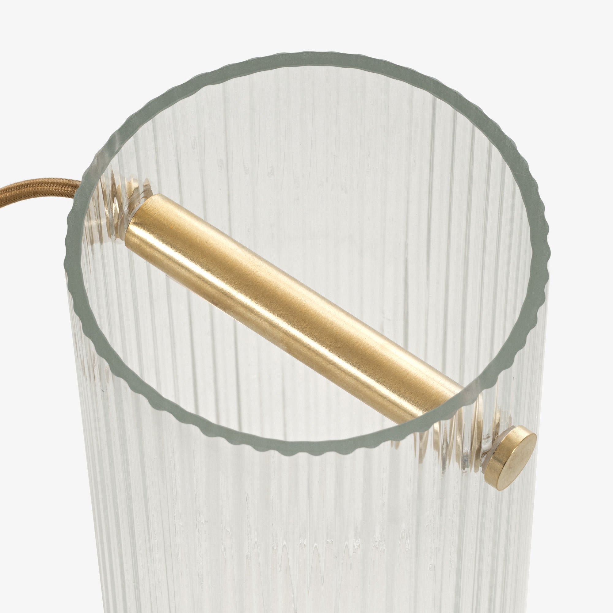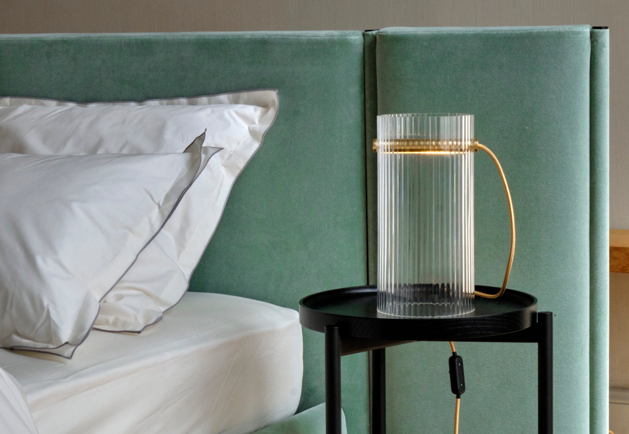 Doric bordlampe følger tradisjonen med venetiansk munnblåst glass, men med en moderne nytolkning. Lyskilden er satt inn i "håndtaket" av børstet messing, og går gjennom glasset på den øvre delen. Downlighten som sendes ut gjennom glasset skaper et vakkert stemningslys for et soverom eller en liten stue.