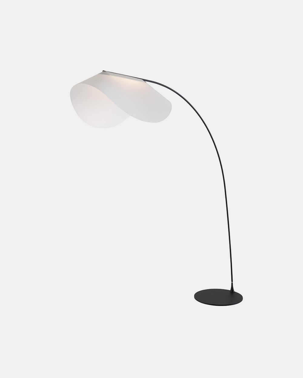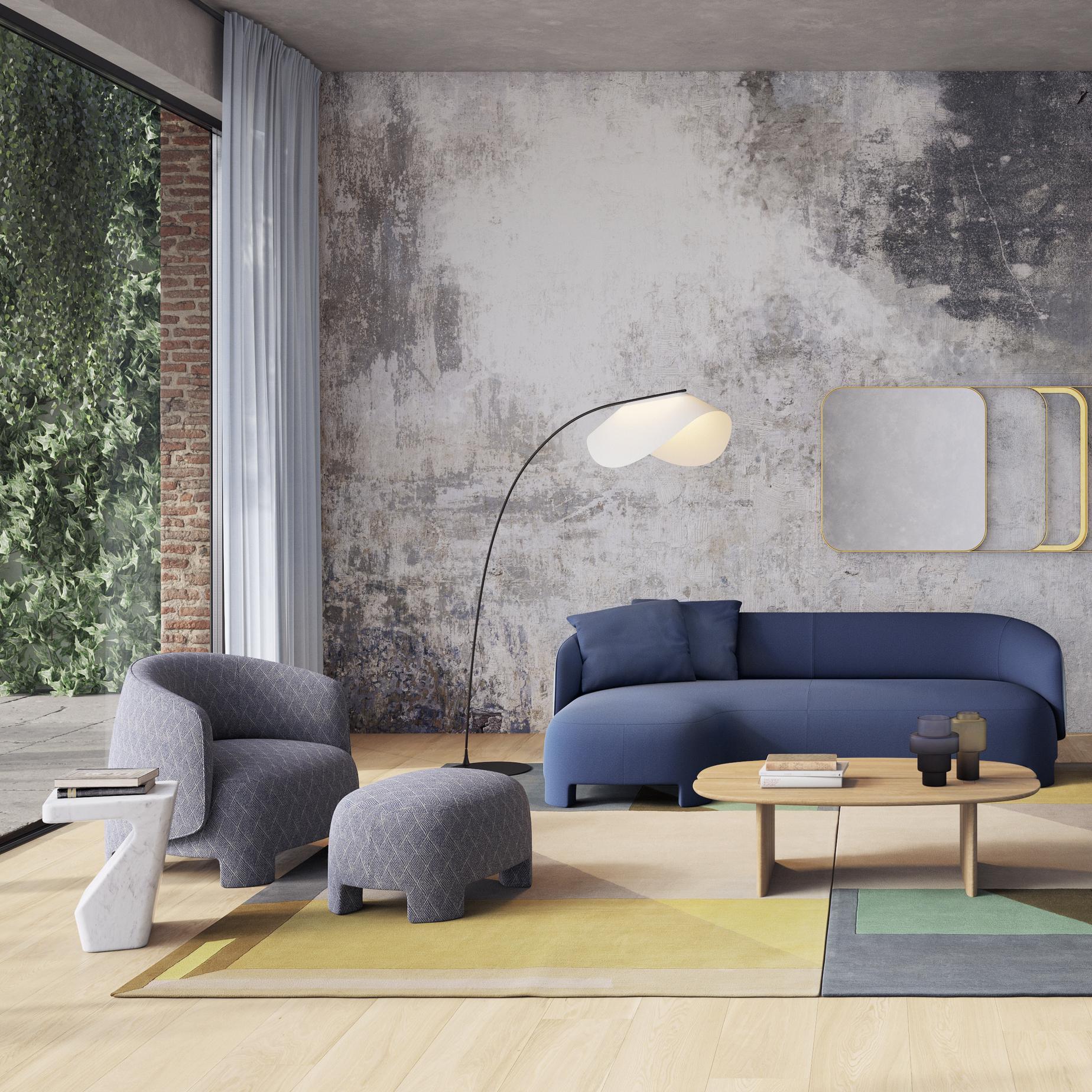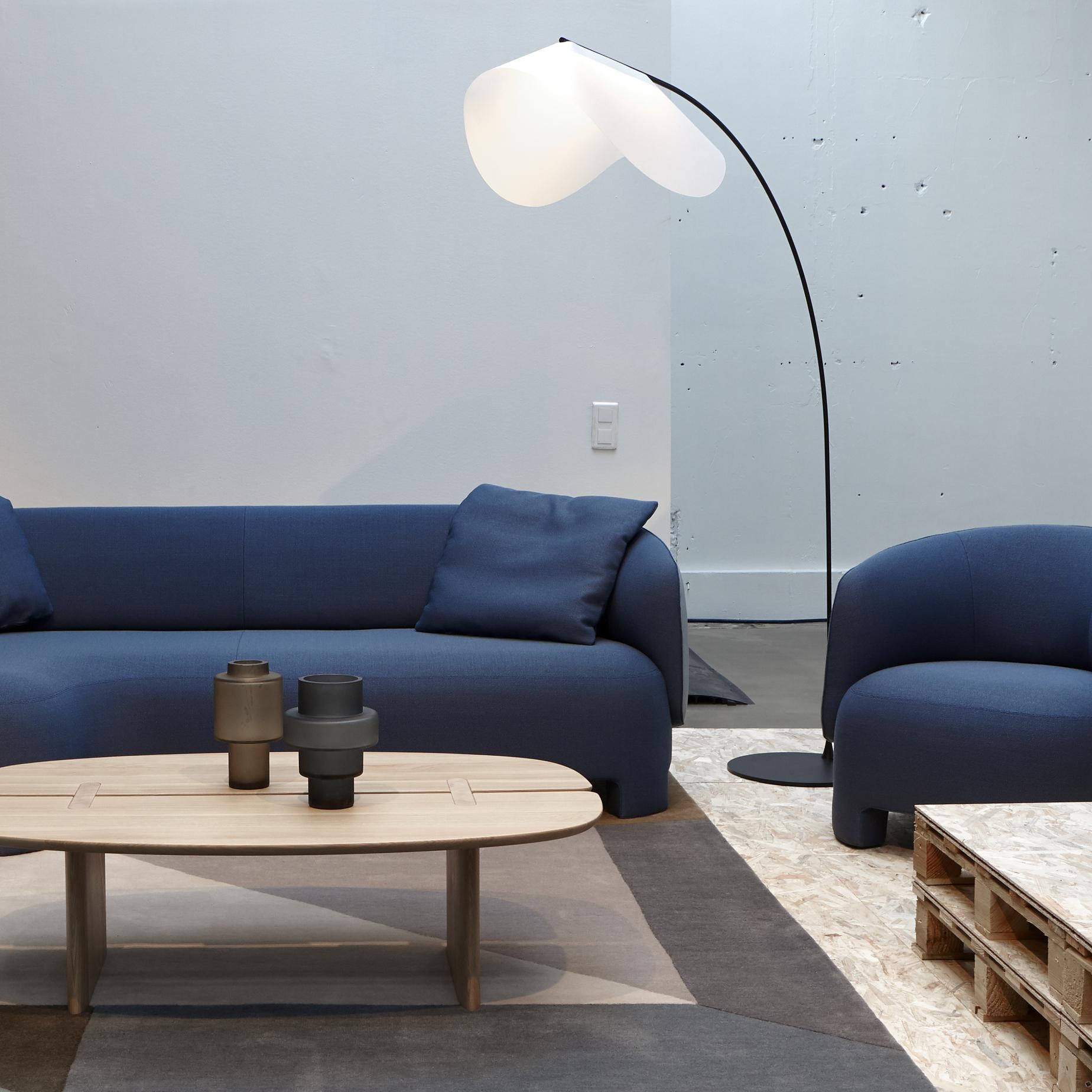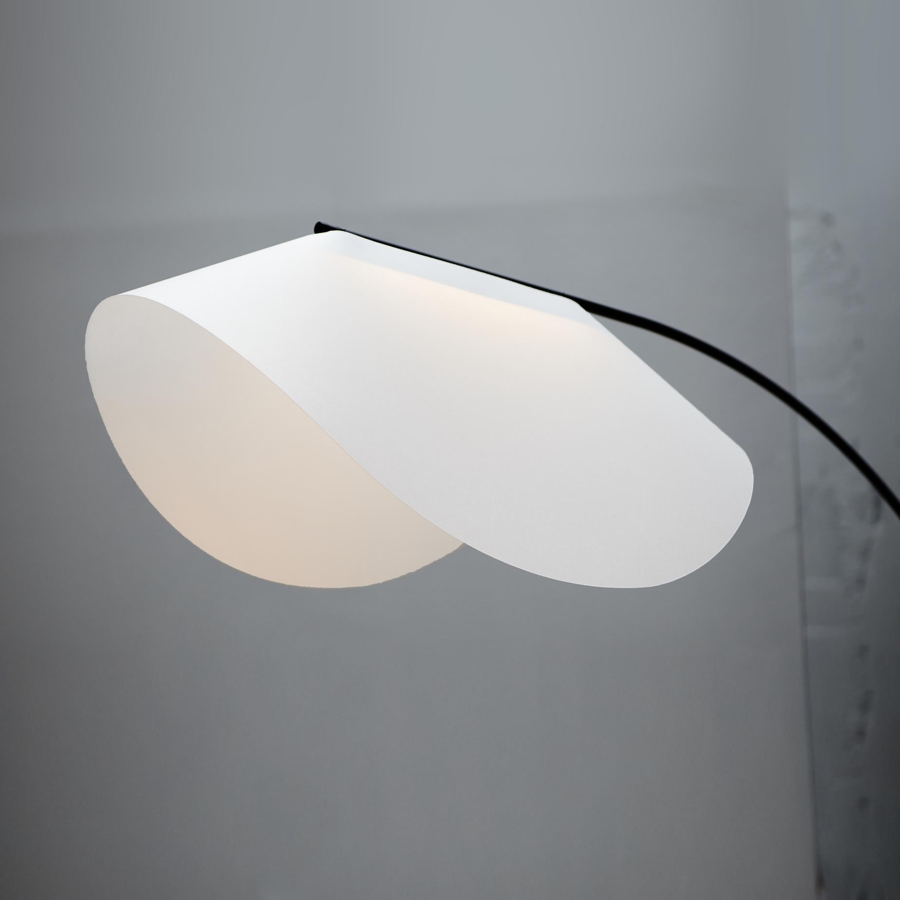 Design har noen ganger en slags gjenopprettende kraft, som denne gulvlampen inspirert av en bambusstokk som bøyer seg under snøvekten - og signaliserer ro.Den myke vinkelen på metallrøret gjenspeiles i skyggen, som sprer beroligende LED-lys.