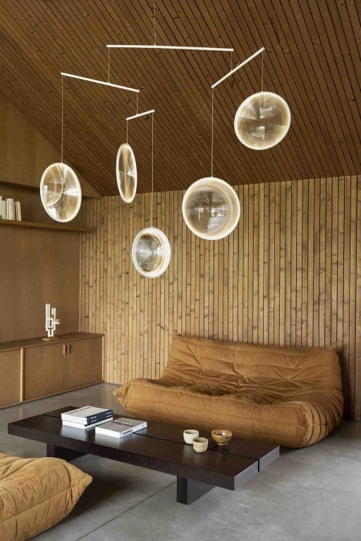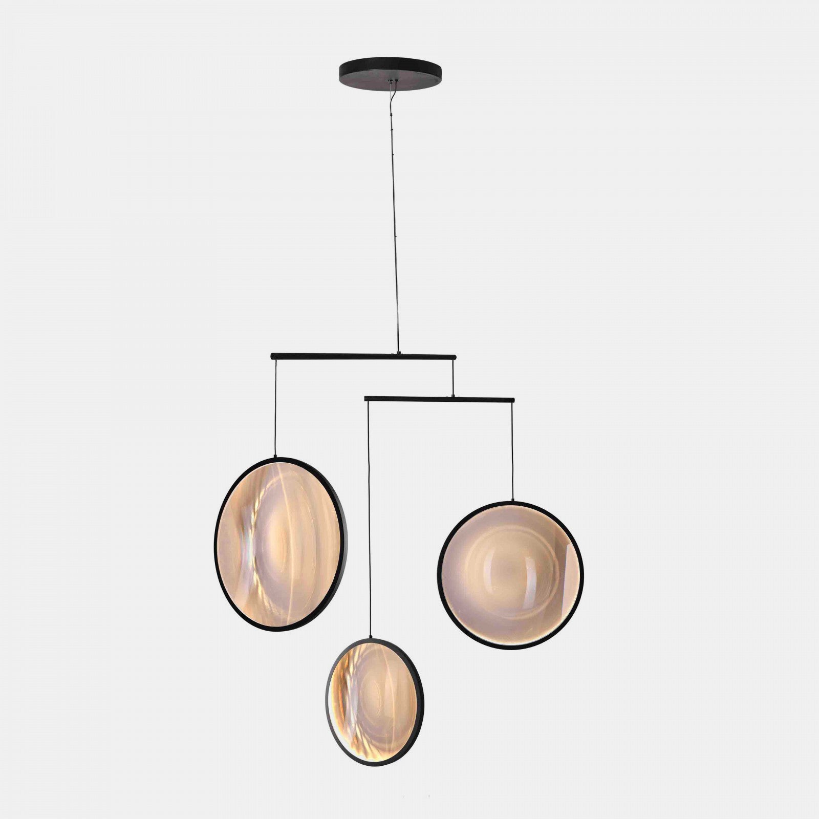 Focus taklampe fra DCW er en lampe som består av tre eller fem lysende skiver i PMMA (akrylglass) med innebygd LED og et varmhvitt lys.