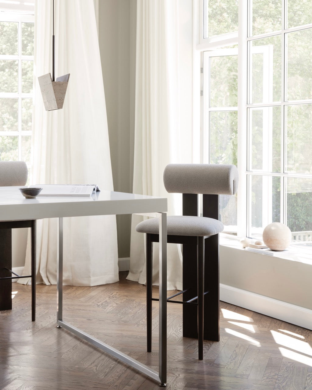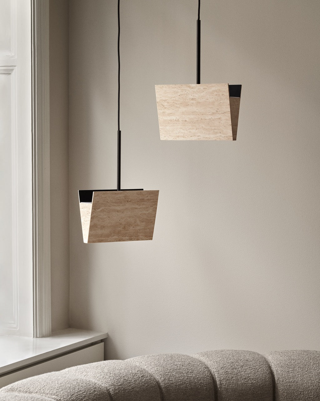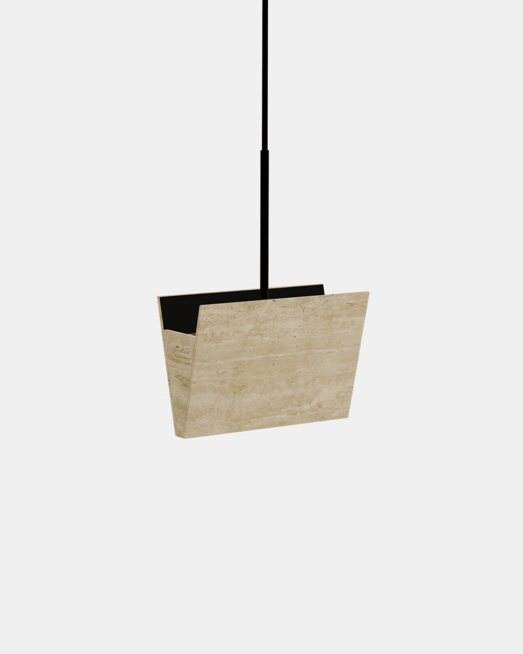 Taklampen er konstruert av tynne travertinplater som nesten gir følelsen av brettet papir. En smal åpning nederst sørger for myk, direkte belysning nedover, mens hovedlyset sprer seg oppover og fyller rommet med en behagelig glød. Gallery Pendant kan henges alene for et minimalistisk uttrykk, eller grupperes i ulike høyder for å skape en skulpturell installasjon.