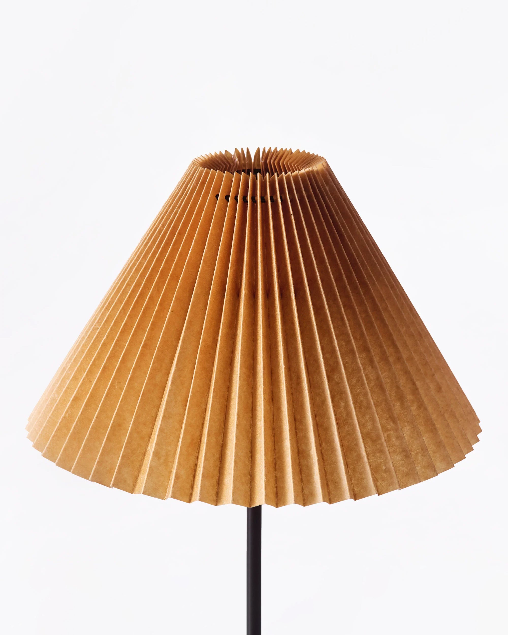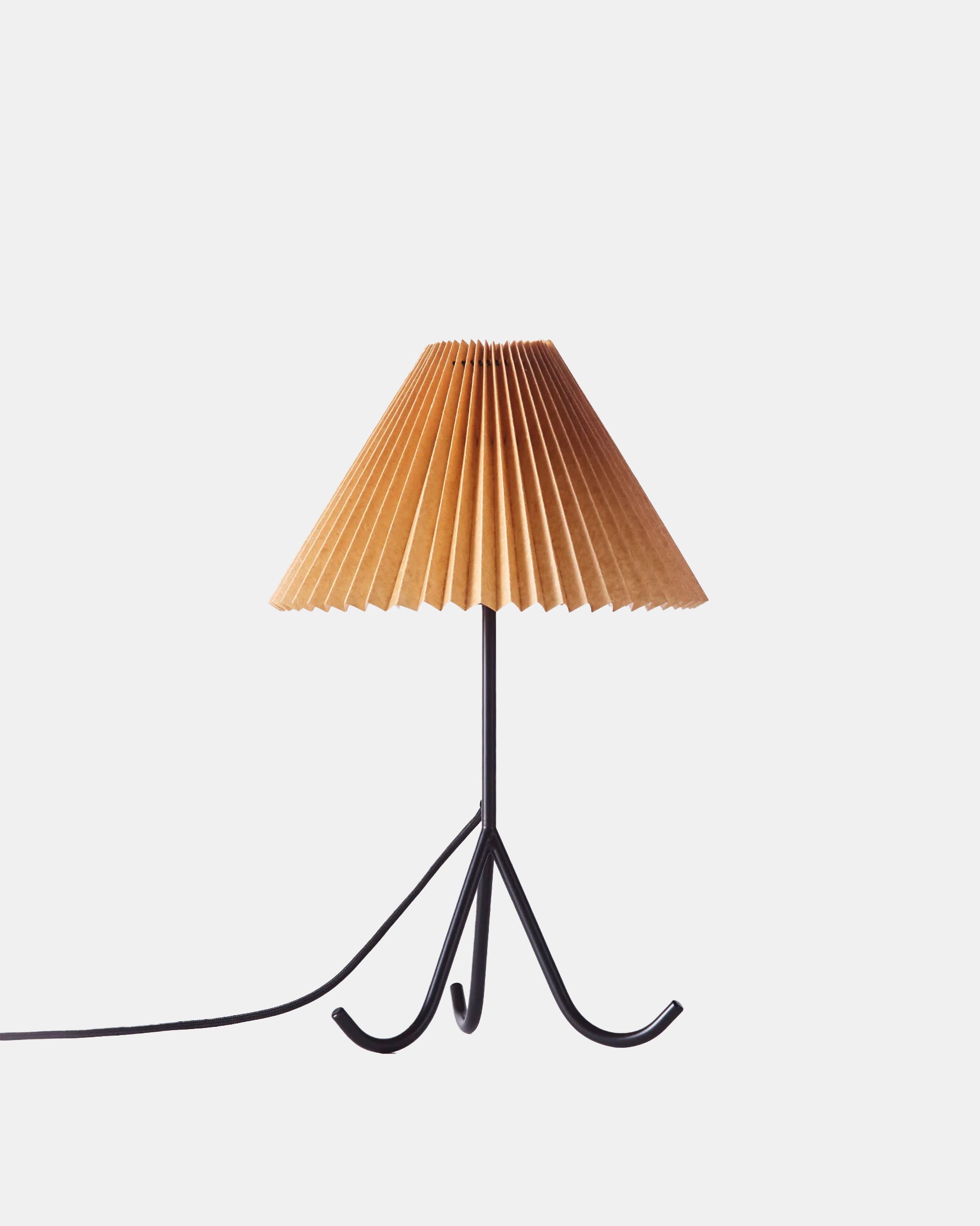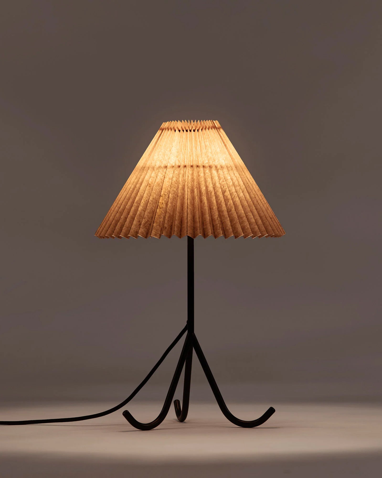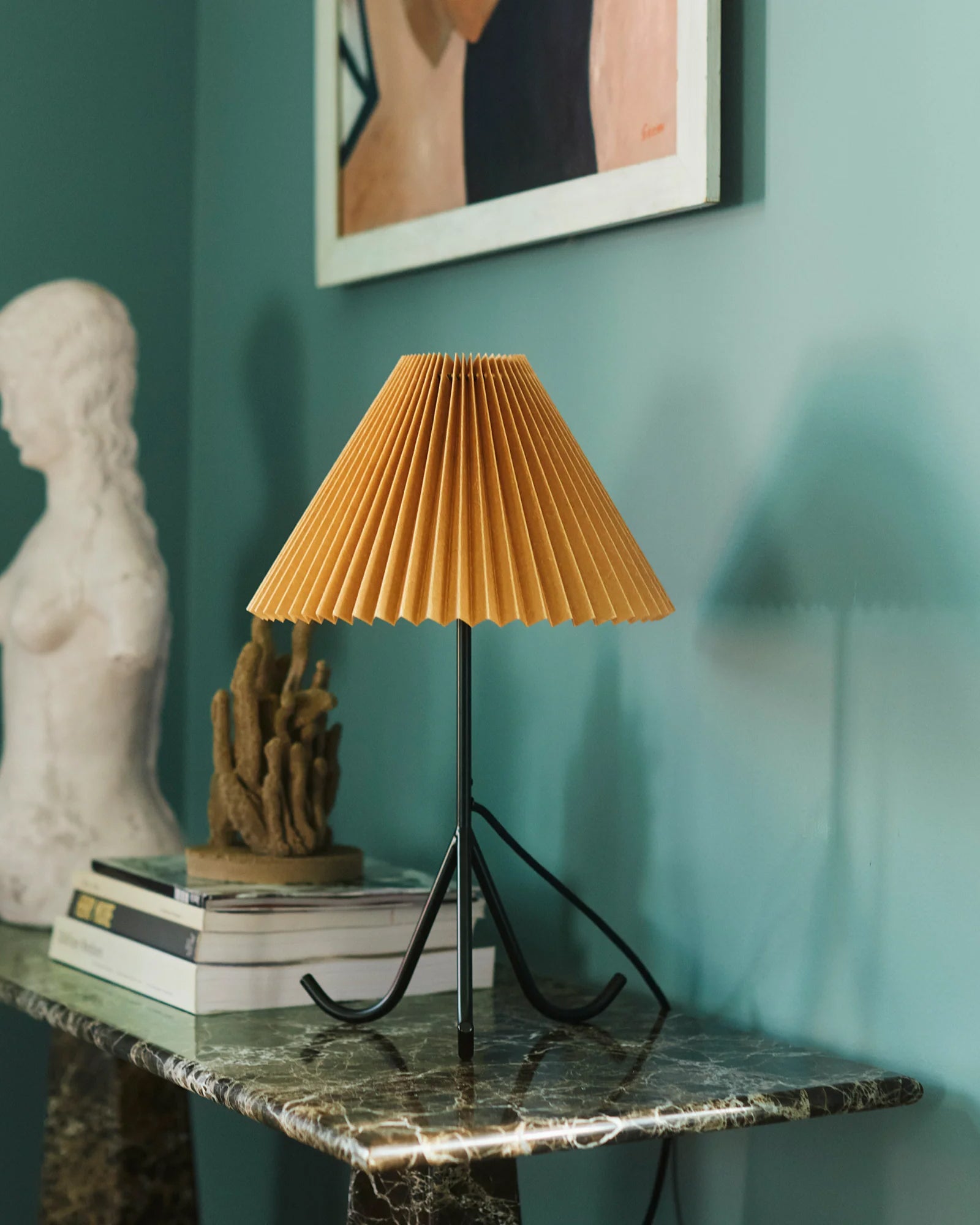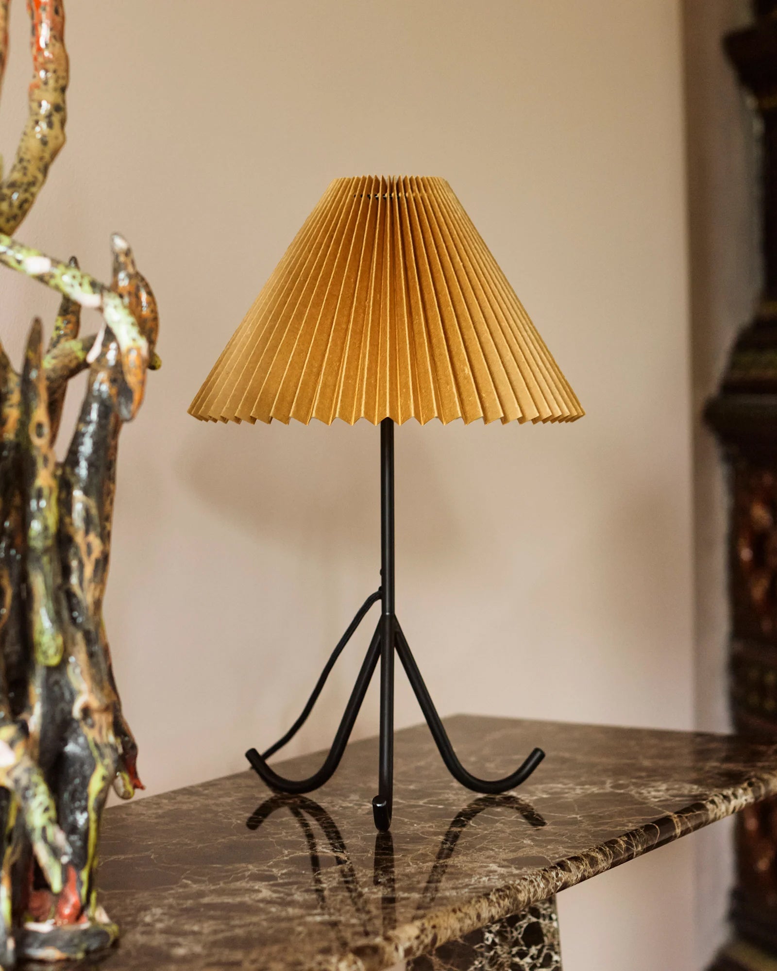 Geraldine bordlampe er en elegant og karakterfull lampe med en distinkt plissert skjerm i en livlig sennepsgul farge. Den stilrene basen består av tre slanke, svarte ben i matt metall, som gir lampen et moderne og sofistikert uttrykk. Den plisserte tekstilskjermen i vokset papir tilfører både tekstur og et varmt, innbydende lys til rommet.