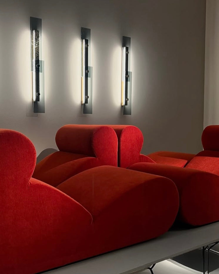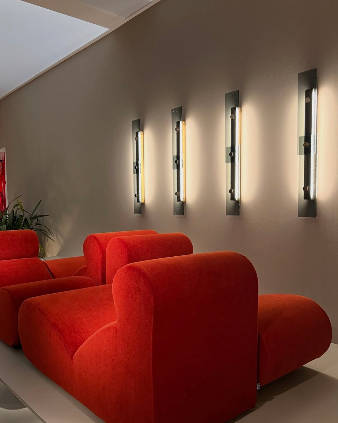 Lampen leker med transparens og geometriske former, og kan monteres både vertikalt og horisontalt. Den fungerer like godt alene som i par, og tilfører et subtilt og moderne preg til ethvert rom.