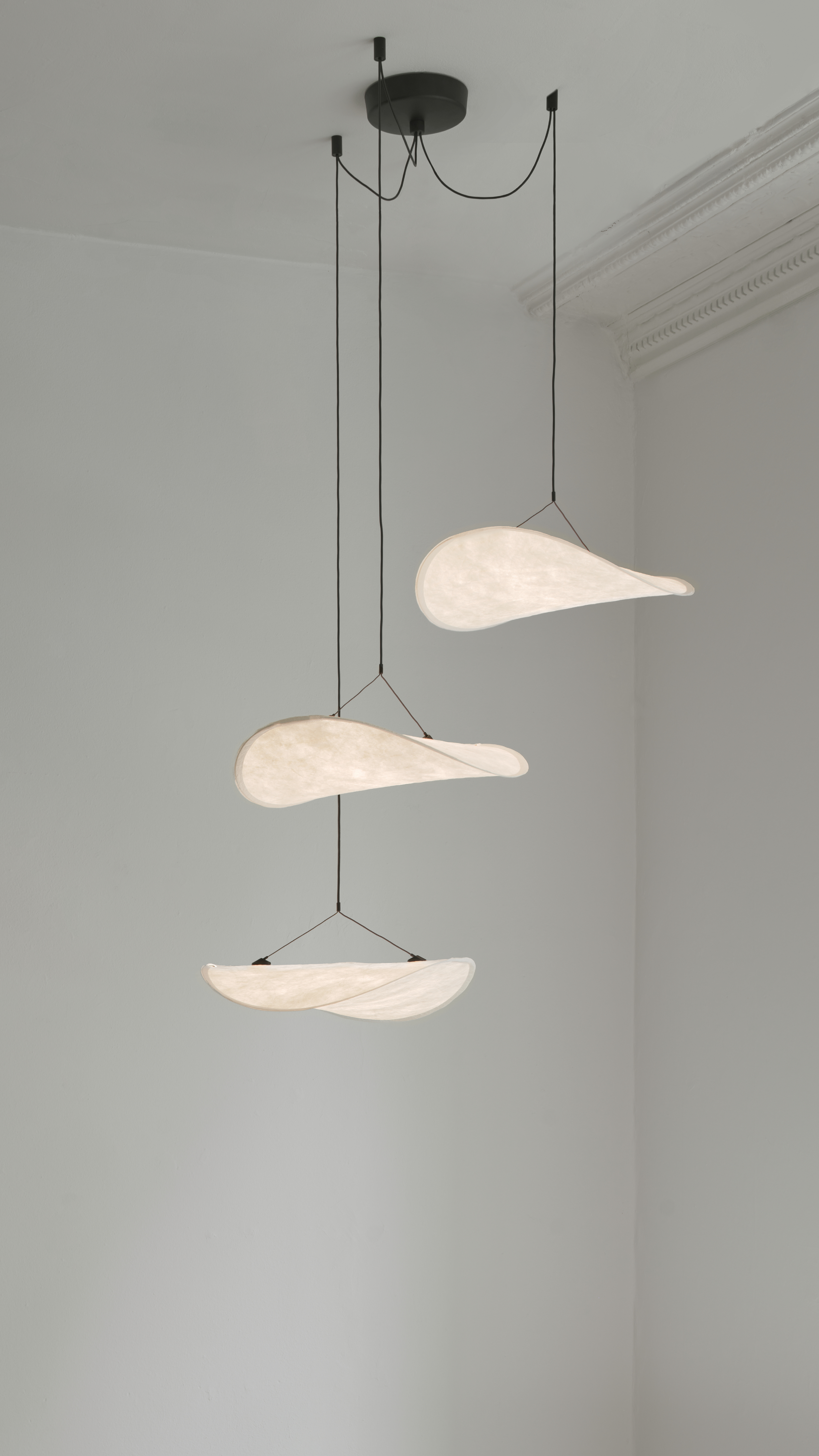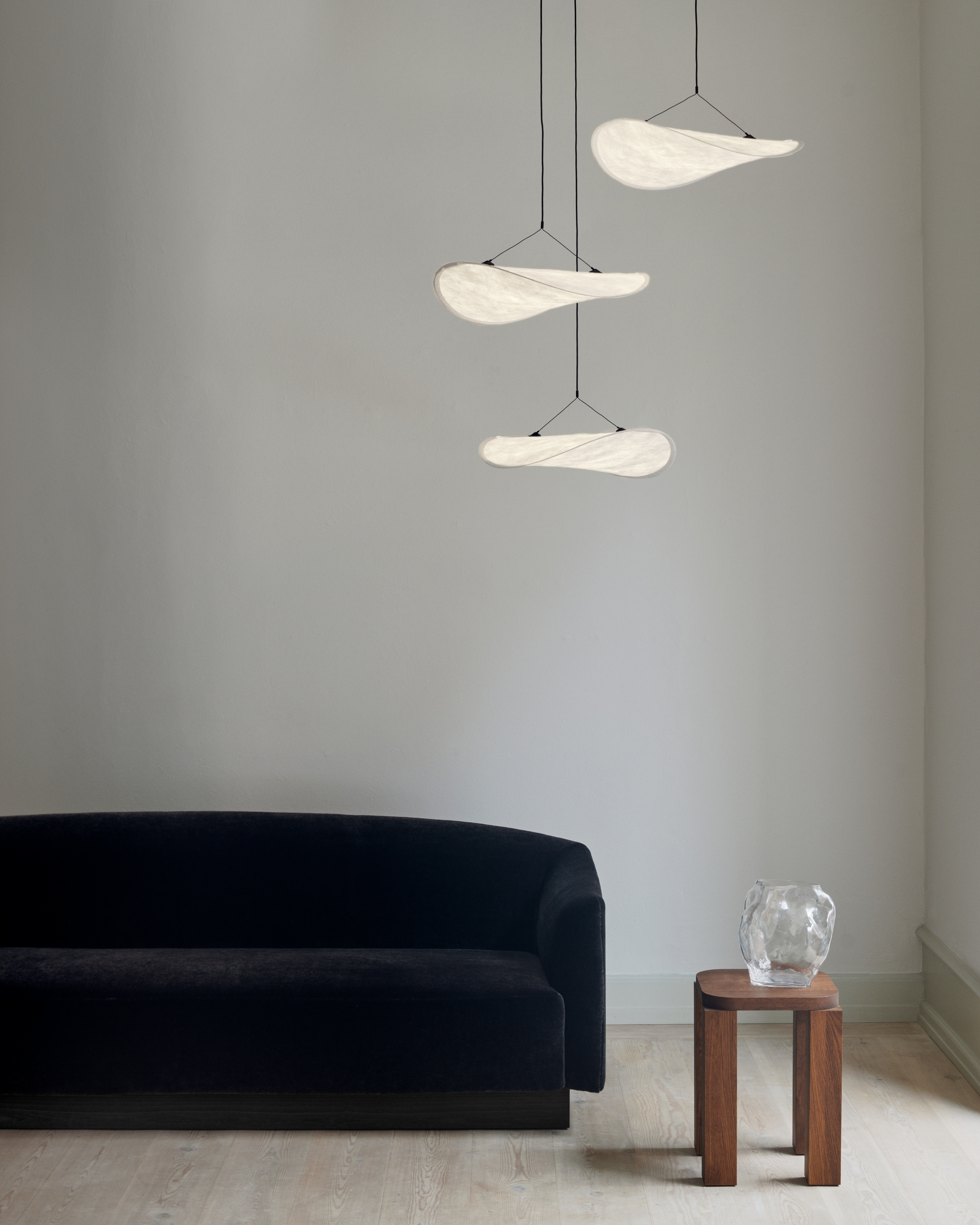 Tensel-pendelene er en moderne tilnærming til belysning og gir inntrykket av myke skyer som har fløyet inn. Lampen består av tre skjermer laget av materialet Tyvek, som er både slitesterkt og mykt – samtidig som det er 100 % resirkulerbart.